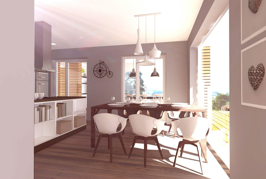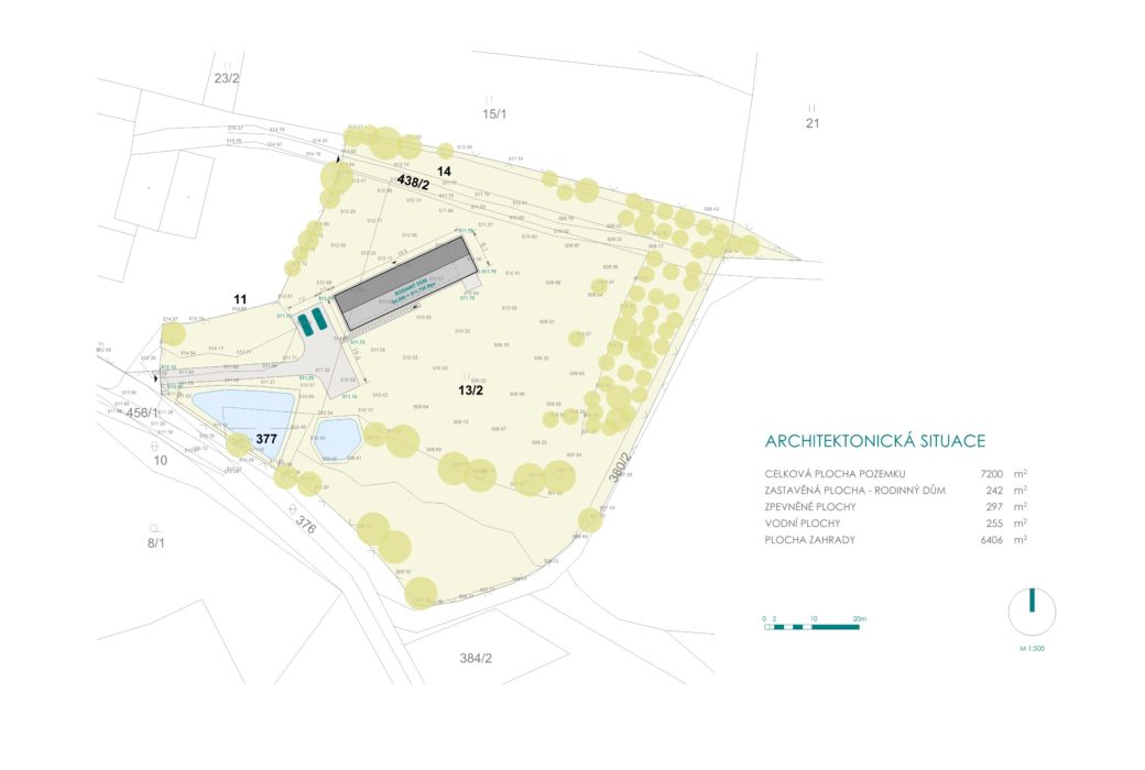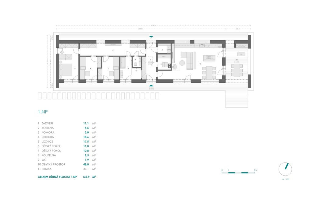 Dům je totiž osazen rovnoběžně s vrstevnicemi mírně svažitého pozemku. Dispozice domu je provozně rozdělena vstupní chodbou přístupnou z obou stran objektu na západní a východní křídlo. Západní křídlo obsahuje spací a klidovou část s ložnicí, dva dětské pokoje s obytnou chodbou, koupelnu a wc. Východní křídlo obsahuje hlavní obytný prostor s kuchyní a jídelnou a z chodby navazující technické zázemí domu. Z prostoru kuchyně a jídelny lze komfortně vyjít na krytou terasu s letní kuchyní, grilem a sezením, které je možno využít i na otevřené části terasy při slunných dnech a kochat se tak dechberoucím výhledem na okolní krajinu.