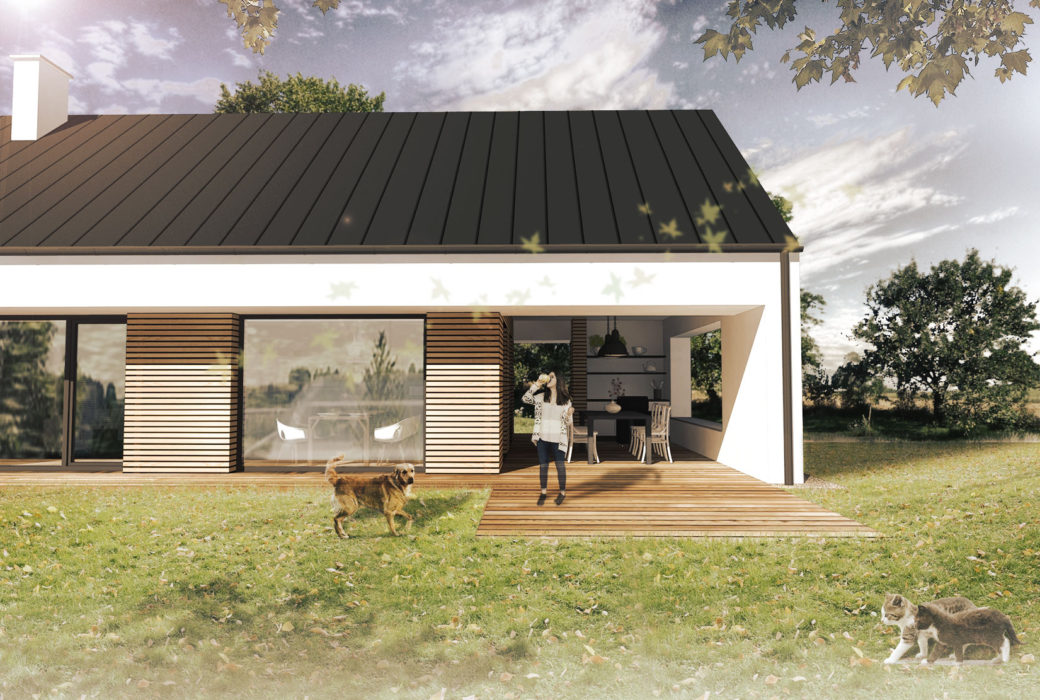Zastřešení objektu je navrženo velice jednoduše pomocí dřevěných sbíjených vazníků, které svojí konstrukcí vytvářejí kryté zápraží na obou stranách domu. Zápraží je obloženo fasádním horizontálním obkladem s přiznanými mezerami ze sibiřského modřínu. Jako střešní krytina je navržen ocelový lakovaný falcovaný plech, který dotváří moderní vzhled domu. I přesto že je dům skutečně dlouhý jak jezevčík, v krajině bude působit velmi nenápadně.