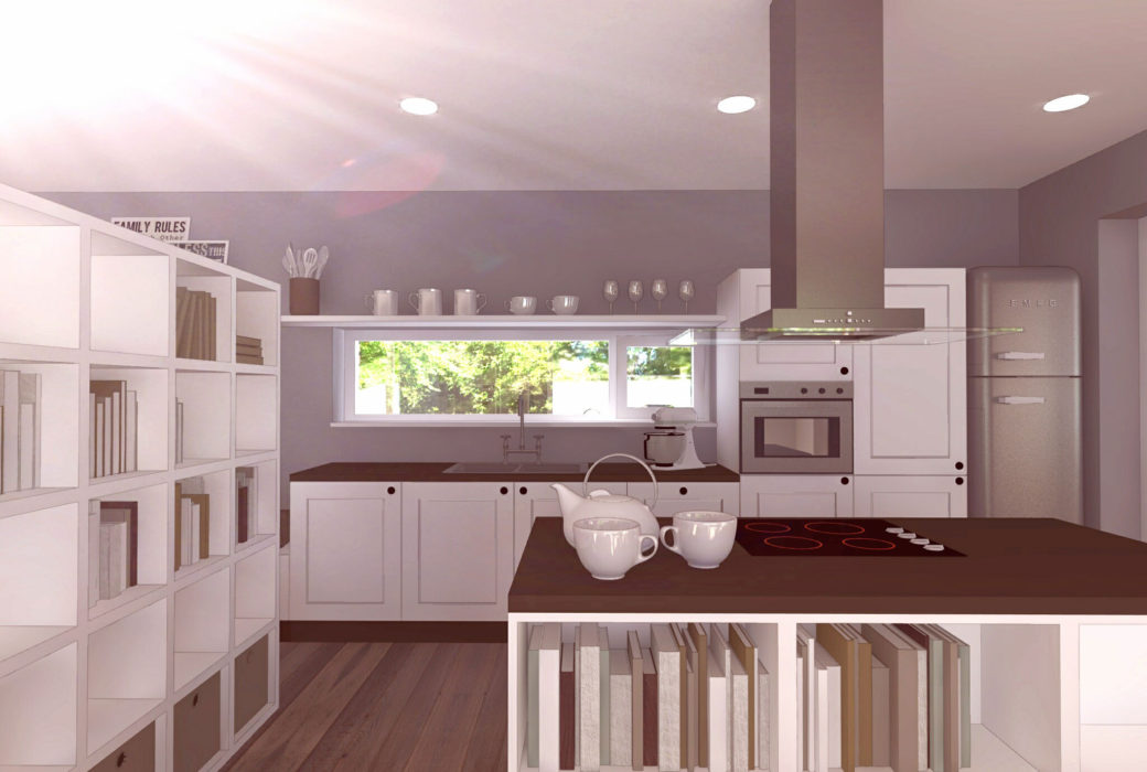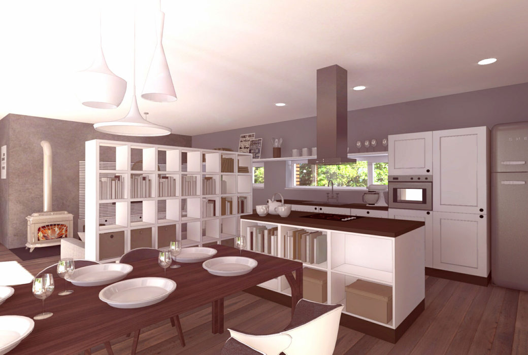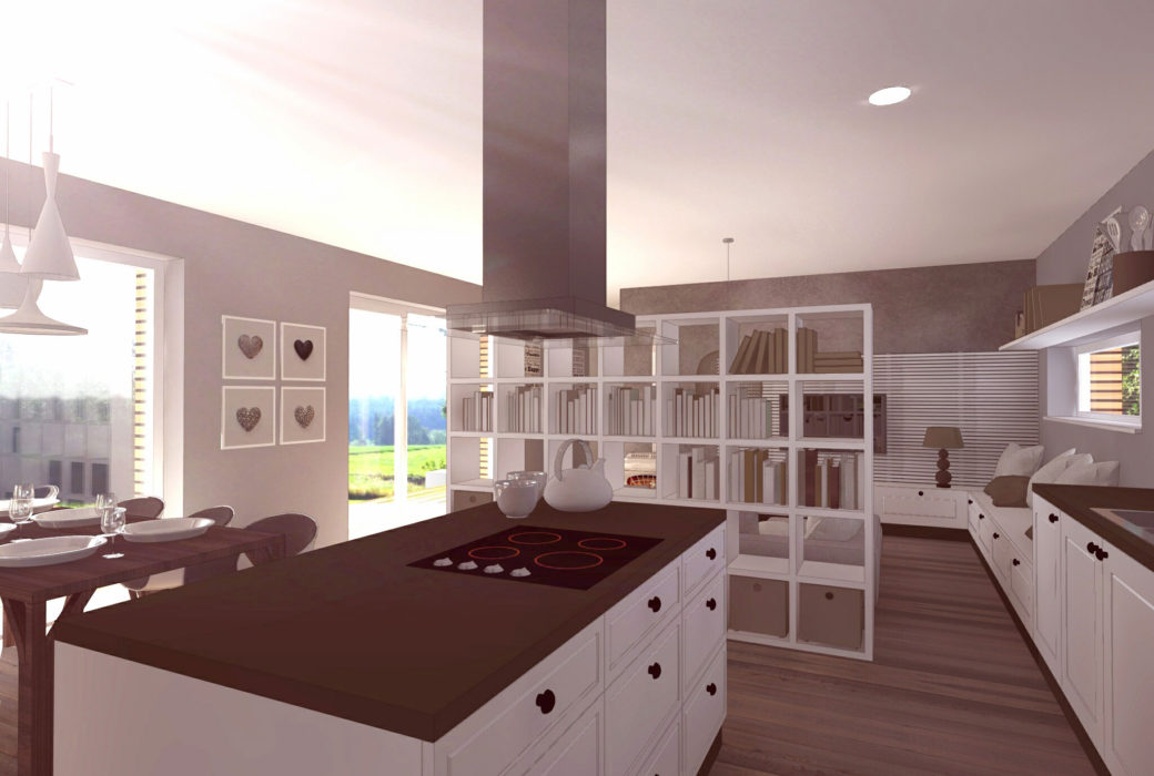 Orientovali jsme totiž všechny obytné místnosti na jihovýchodní stranu a zázemí s komunikačními prostory jsme umístili k severozápadní straně. Vznikl tak dlouhý, konstrukčně jednoduchý dům, ze kterého si každý obyvatel, každá návštěva vychutná krásný výhled ať už z hlavního obytného prostoru s kuchyní, tak i z dětských pokojů, ložnice a koupelny. Díky natočení domu na pozemku směrem na jihovýchod jsme kromě krásného výhledu a vhodné orientace ke světovým stranám dosáhli také minimálních terénních úprav.