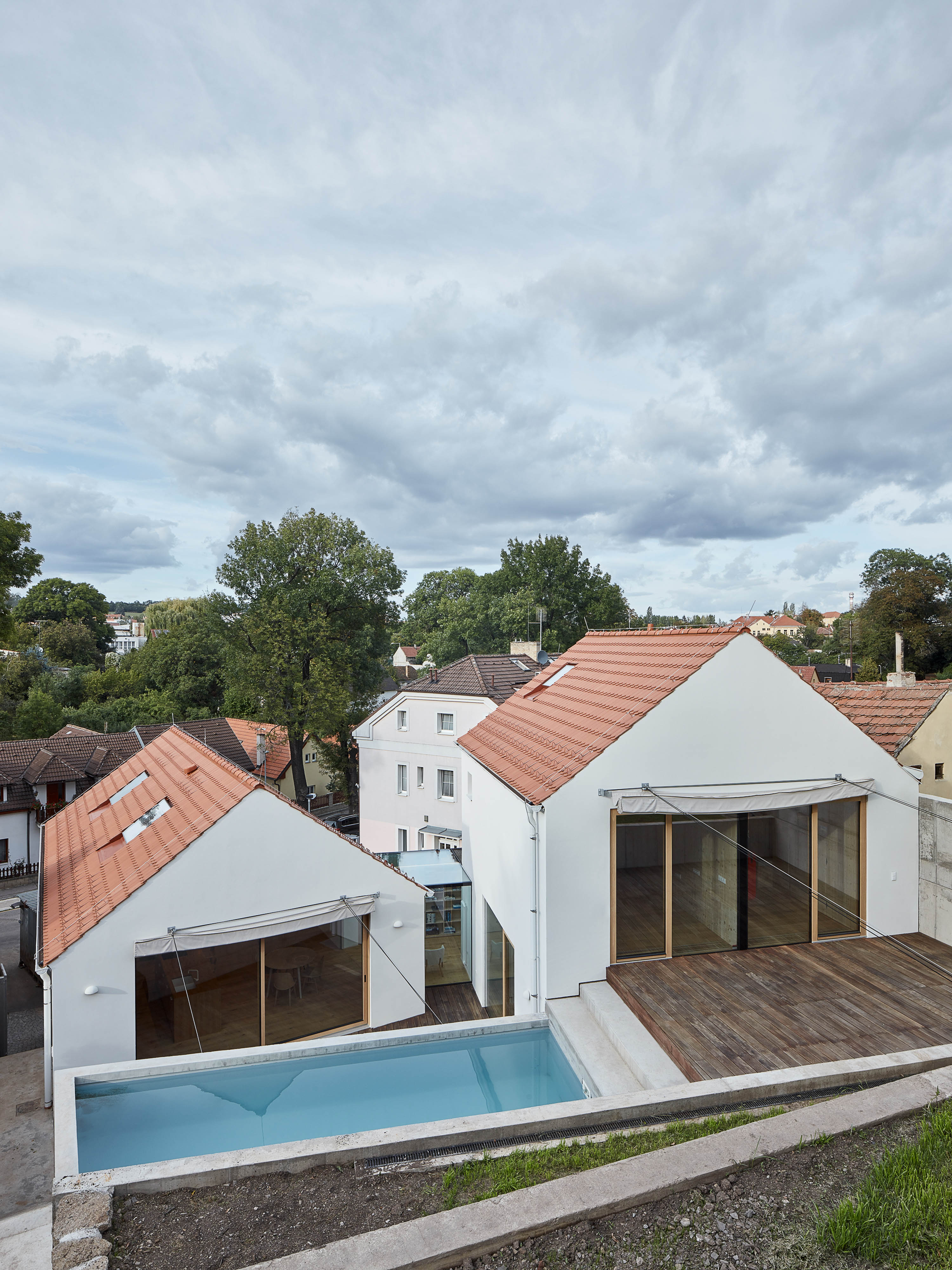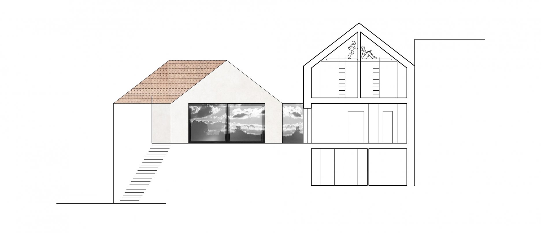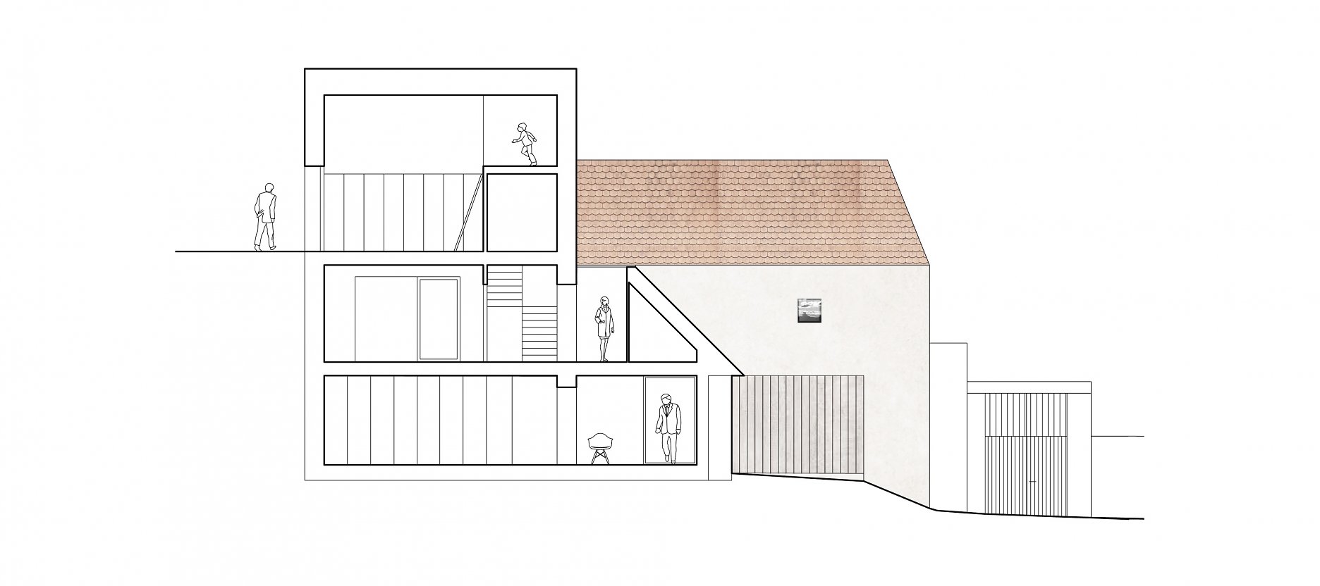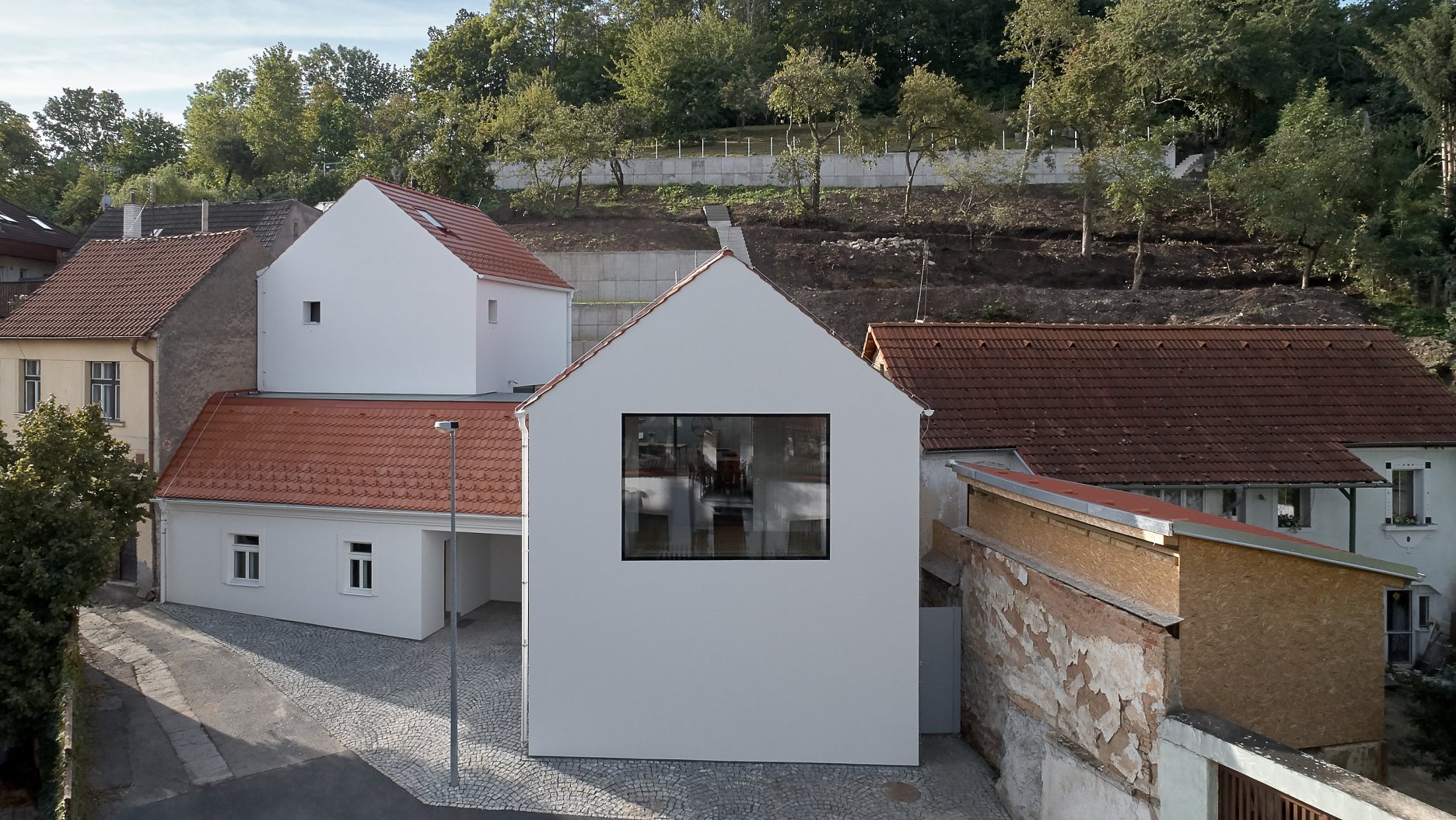 Úzká ulice s částečně dochovaným ospalým charakterem starých Jinonic se v jednom místě rozevírá v plácek se studní. V jeho čele stál opuštěný dům, hmotový slepenec, jehož pozdější neuvážené přístavby převyšovaly původní přízemní objekt. Soubor těchto drobných stavení, vyskládaných ve svažité zahradě, se nacházel ve velmi zanedbaném, neobývatelném stavu. V návrhu ponecháváme pouze nejstarší kamennou část orientovanou do ulice. Skrze ní je možné vystoupat do hlavního obytného podlaží, rozprostírajícího se ve dvou nových hmotách. Nejvyšší část věnujeme dětem. Všechny obytné prostory, včetně dětských podkrovních pokojů, mají přímou návaznost na prosluněnou svažitou zahradu, od ulice odcloněnou vlastním domem. Starou a novou část spojuje z vnějšku v celek jednotná barevnost štukové omítky i režná keramická taška na střeše. O stáří jednotlivých částí domu napoví zejména detail; s původním tvaroslovím lehce kontrastuje současné minimalistické pojetí.