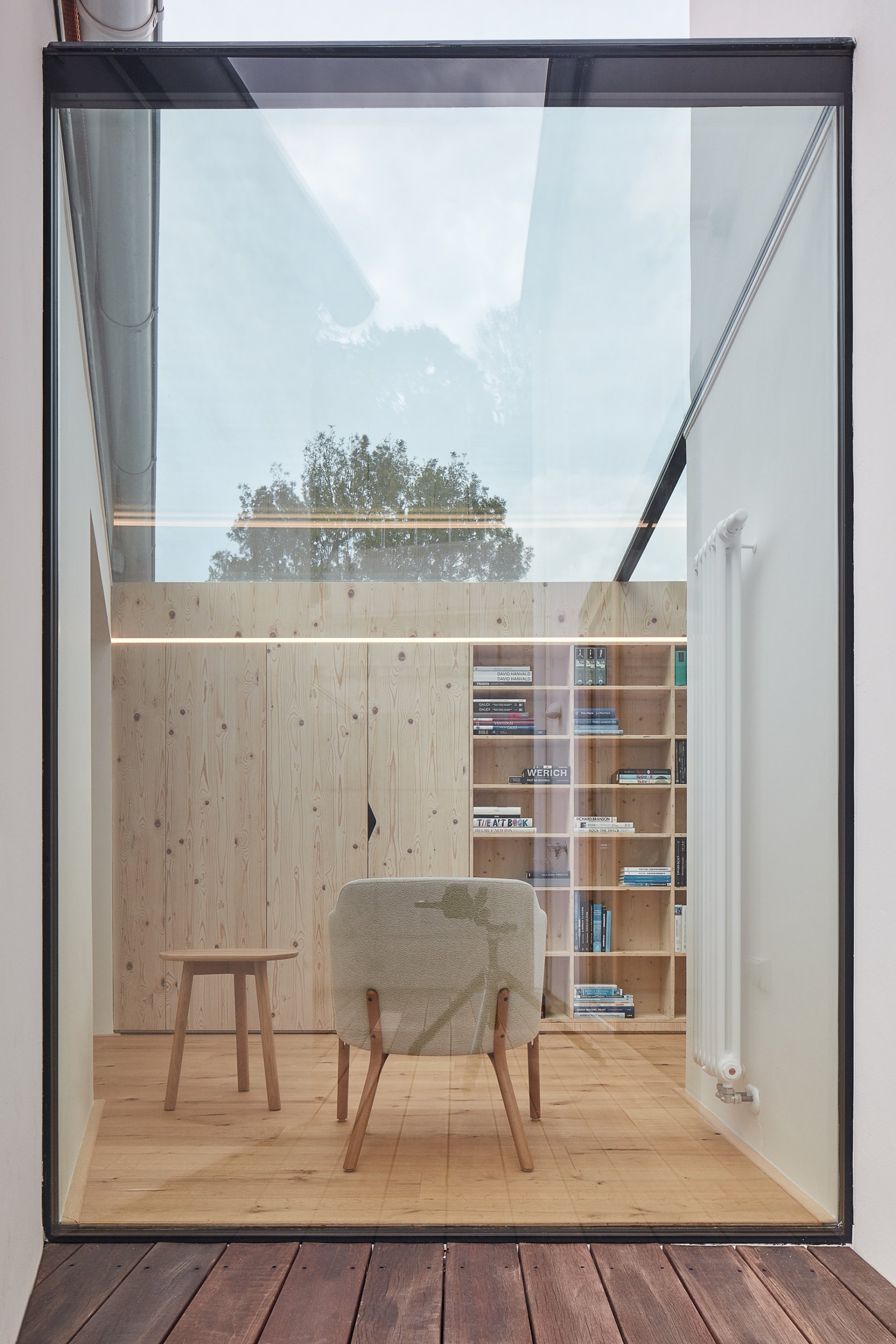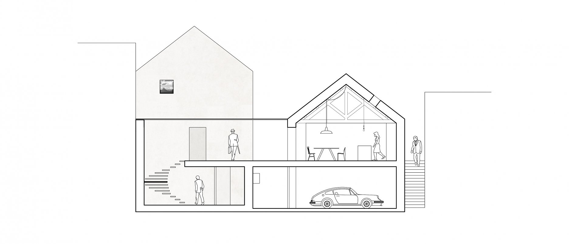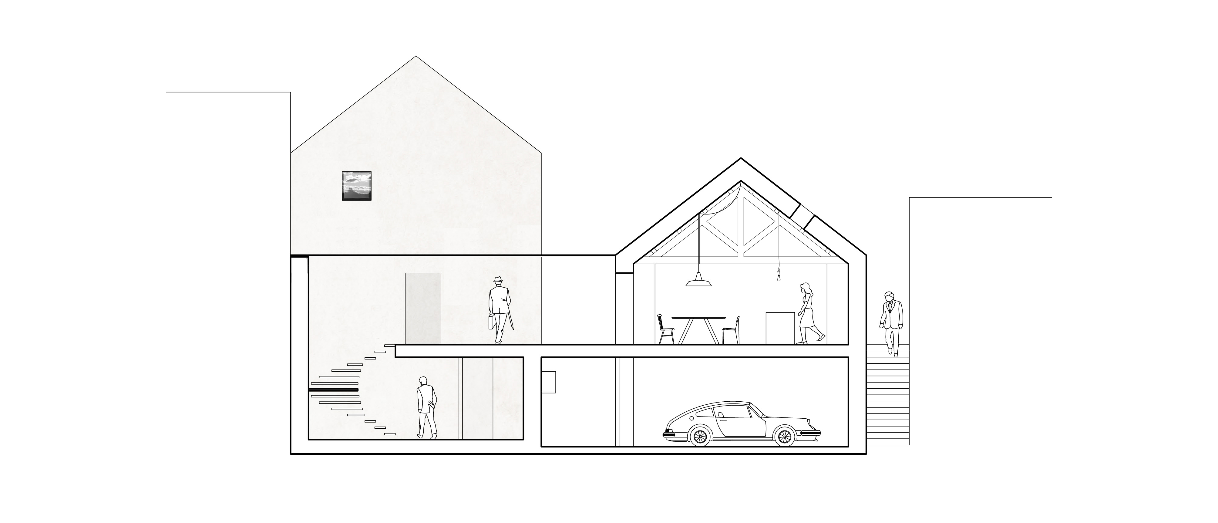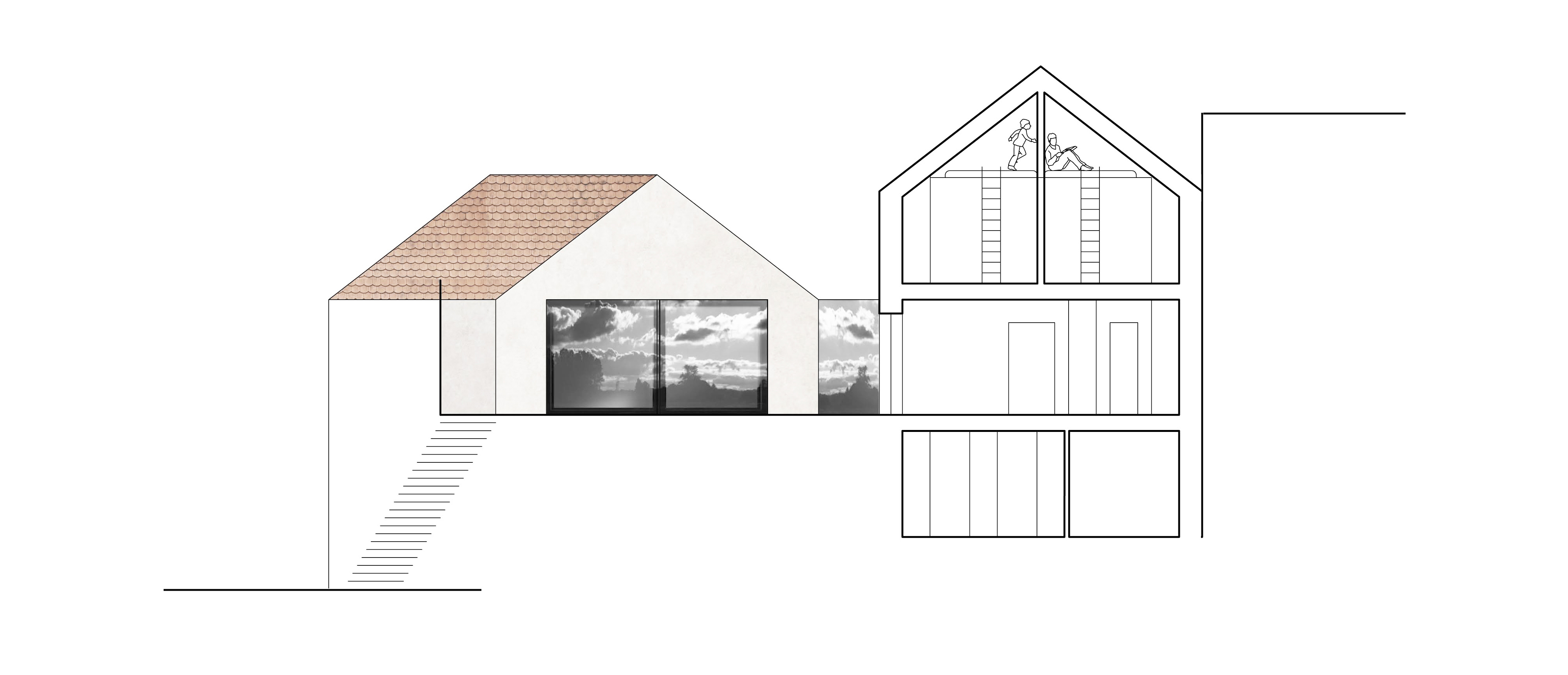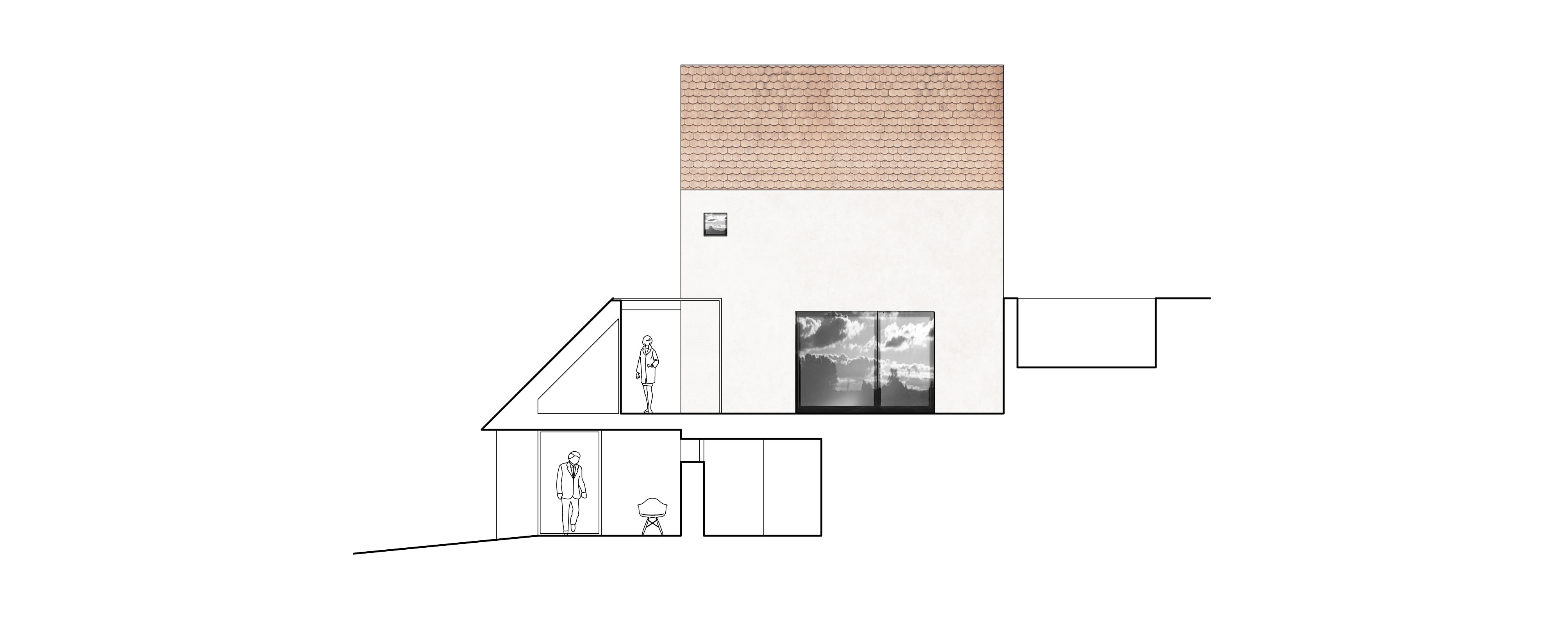 Úzká ulice s částečně dochovaným ospalým charakterem starých Jinonic se v jednom místě rozevírá v plácek se studní. V jeho čele stál opuštěný dům, hmotový slepenec, jehož pozdější neuvážené přístavby převyšovaly původní přízemní objekt. Soubor těchto drobných stavení, vyskládaných ve svažité zahradě, se nacházel ve velmi zanedbaném, neobývatelném stavu. V návrhu ponecháváme pouze nejstarší kamennou část orientovanou do ulice. Skrze ní je možné vystoupat do hlavního obytného podlaží, rozprostírajícího se ve dvou nových hmotách. Nejvyšší část věnujeme dětem. Všechny obytné prostory, včetně dětských podkrovních pokojů, mají přímou návaznost na prosluněnou svažitou zahradu, od ulice odcloněnou vlastním domem. Starou a novou část spojuje z vnějšku v celek jednotná barevnost štukové omítky i režná keramická taška na střeše. O stáří jednotlivých částí domu napoví zejména detail; s původním tvaroslovím lehce kontrastuje současné minimalistické pojetí.