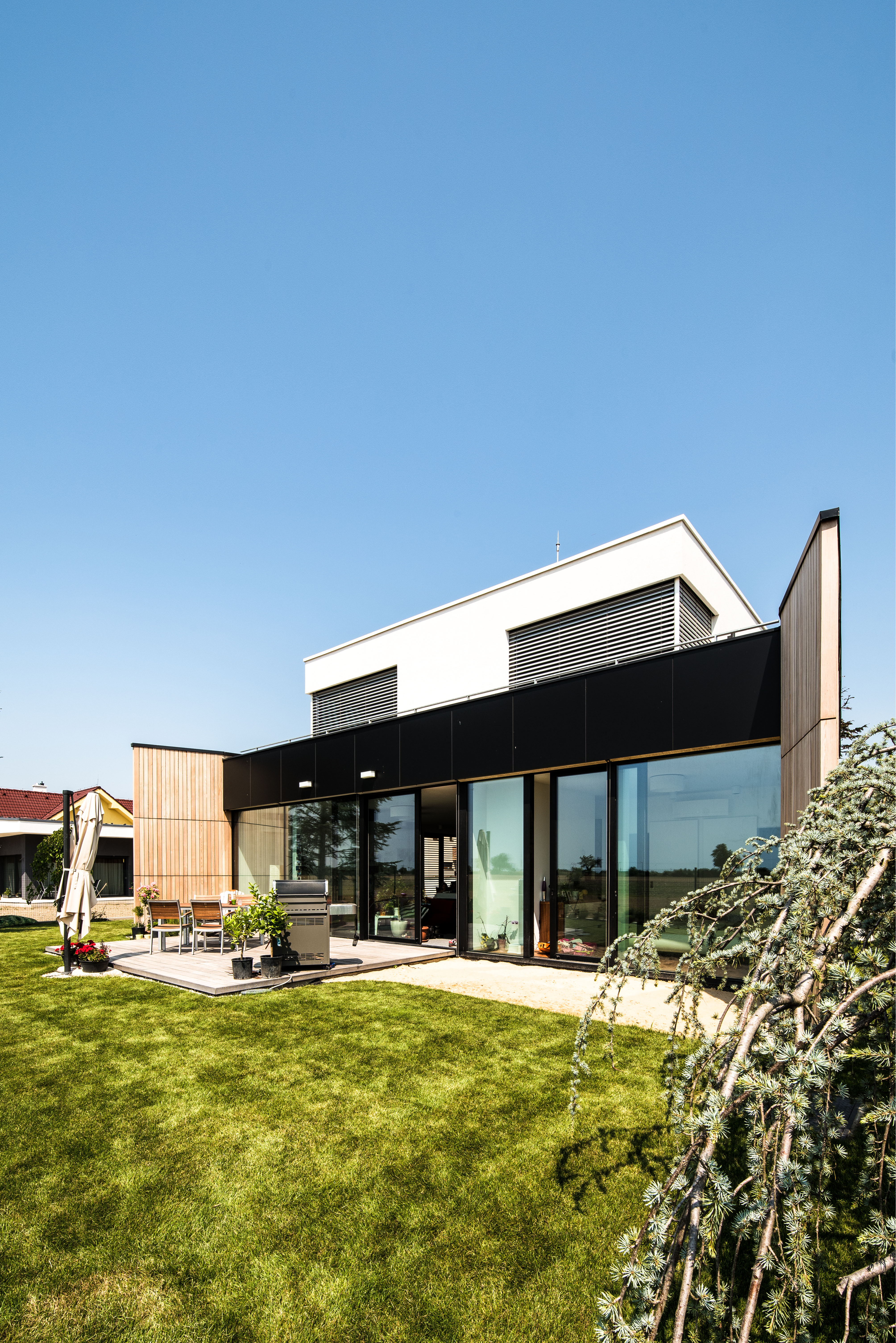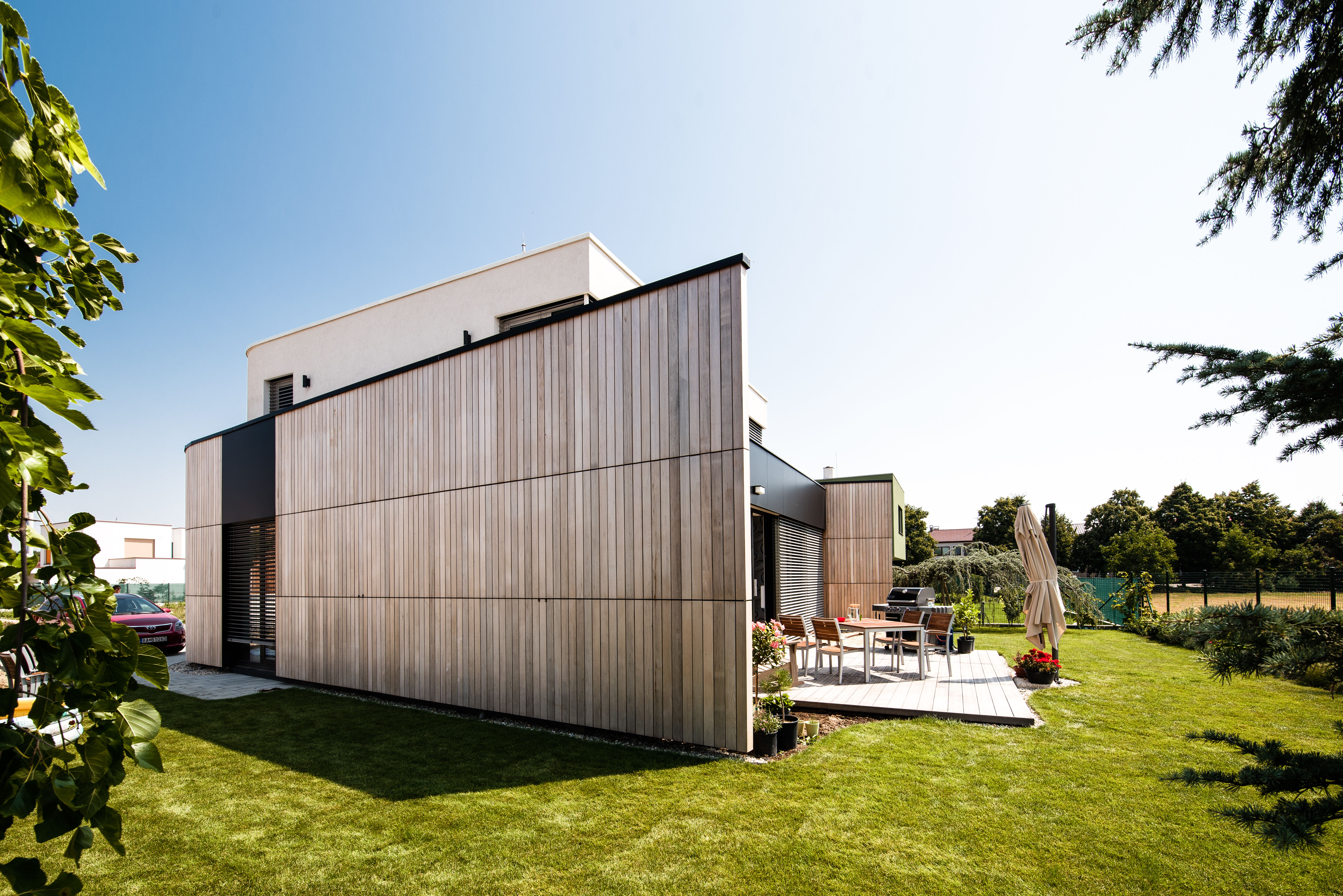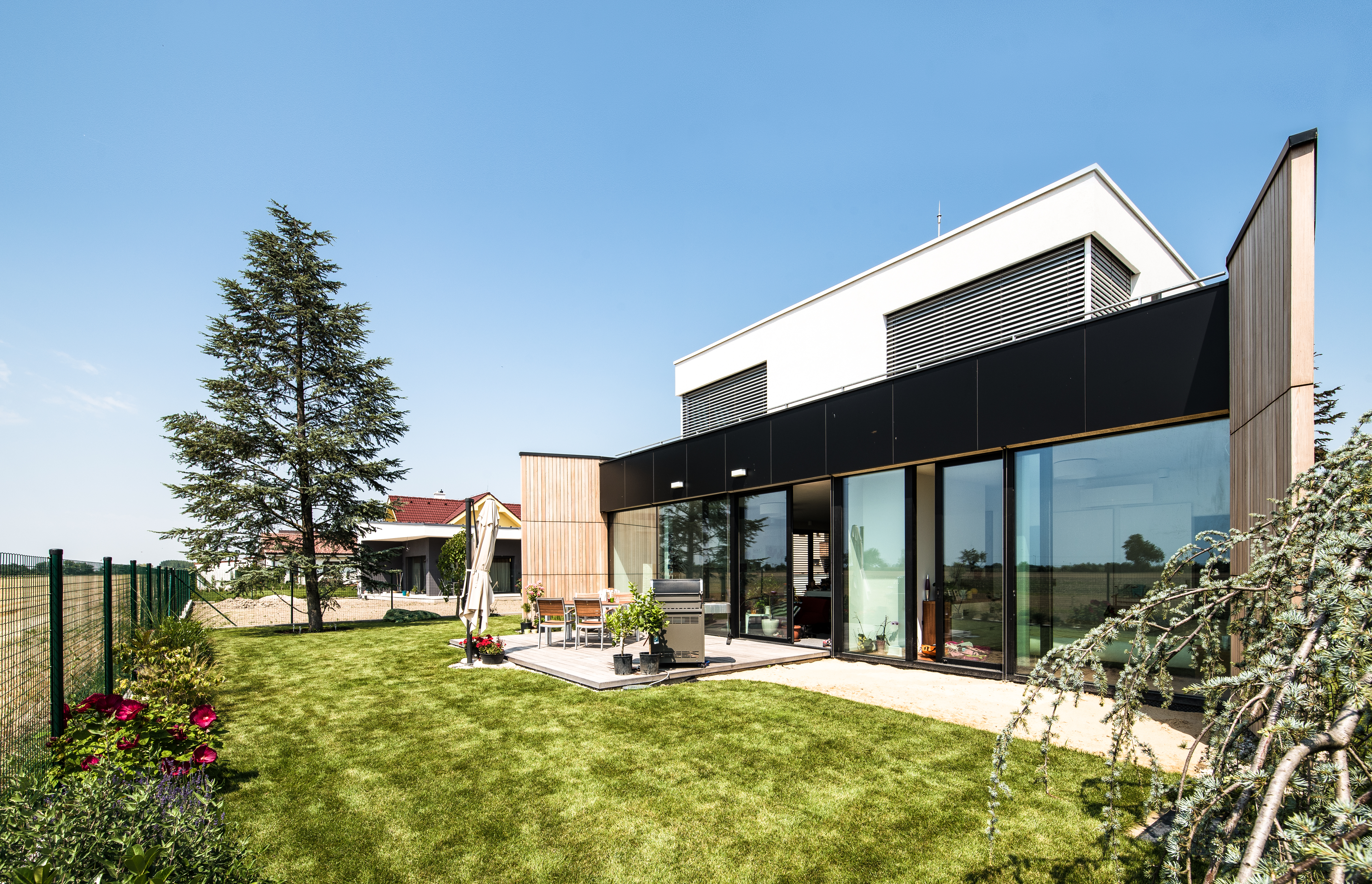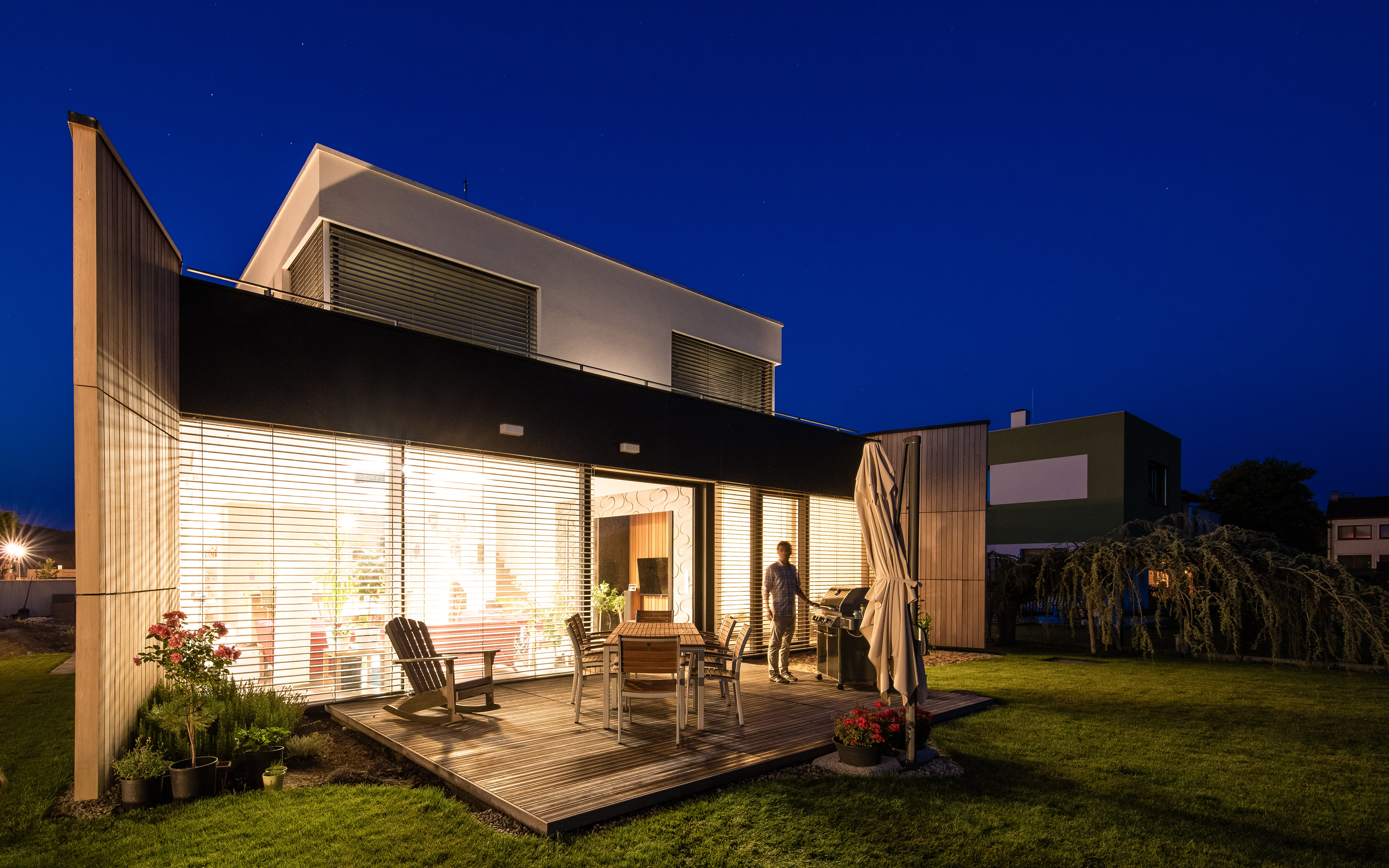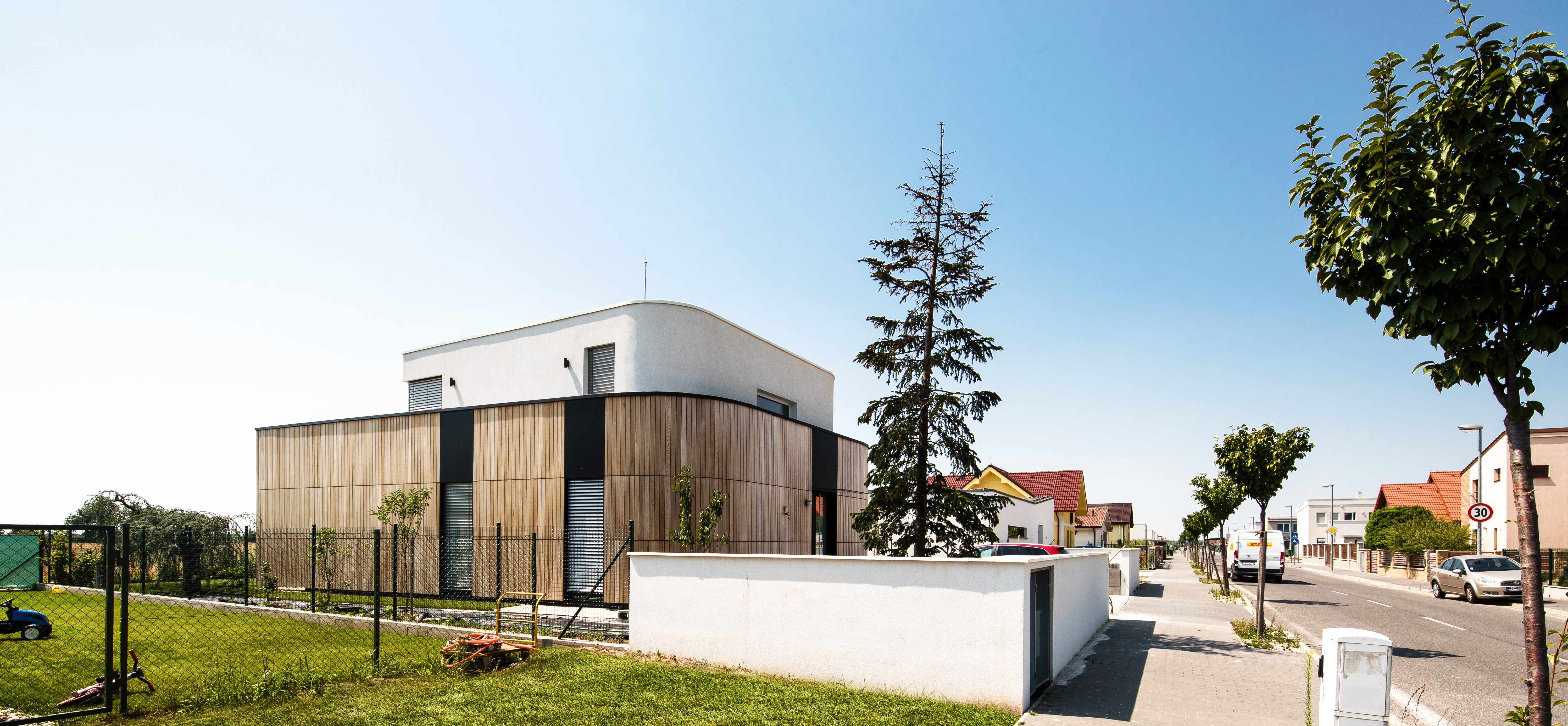 Príjemné bývanie na okraji Bratislavy. Dom chráni súkromie svojich obyvateľov a otvára sa do záhrady orientovanej na juhozápad.