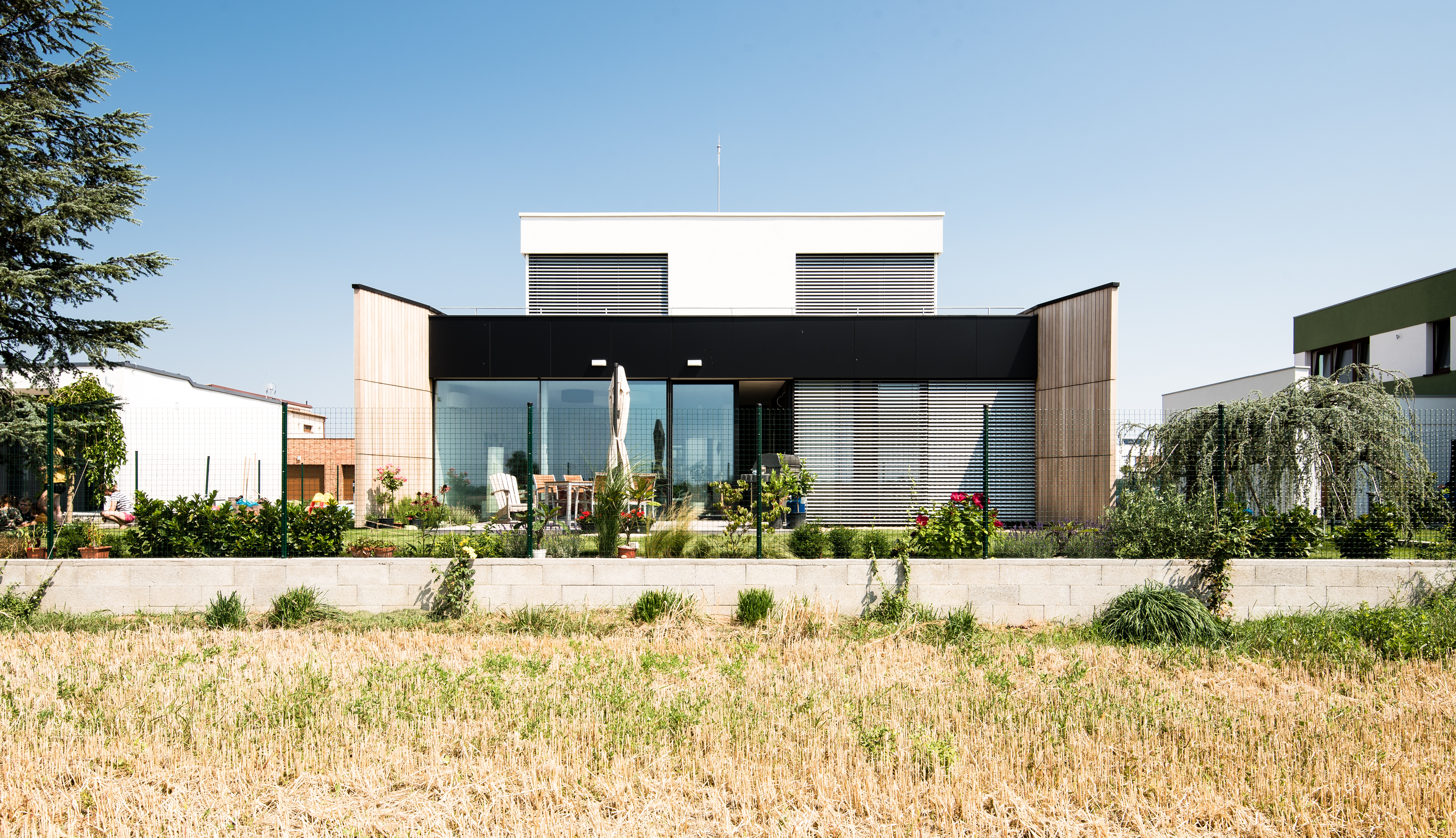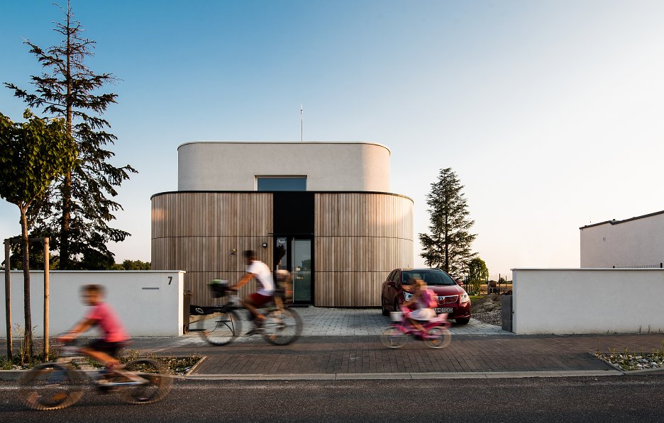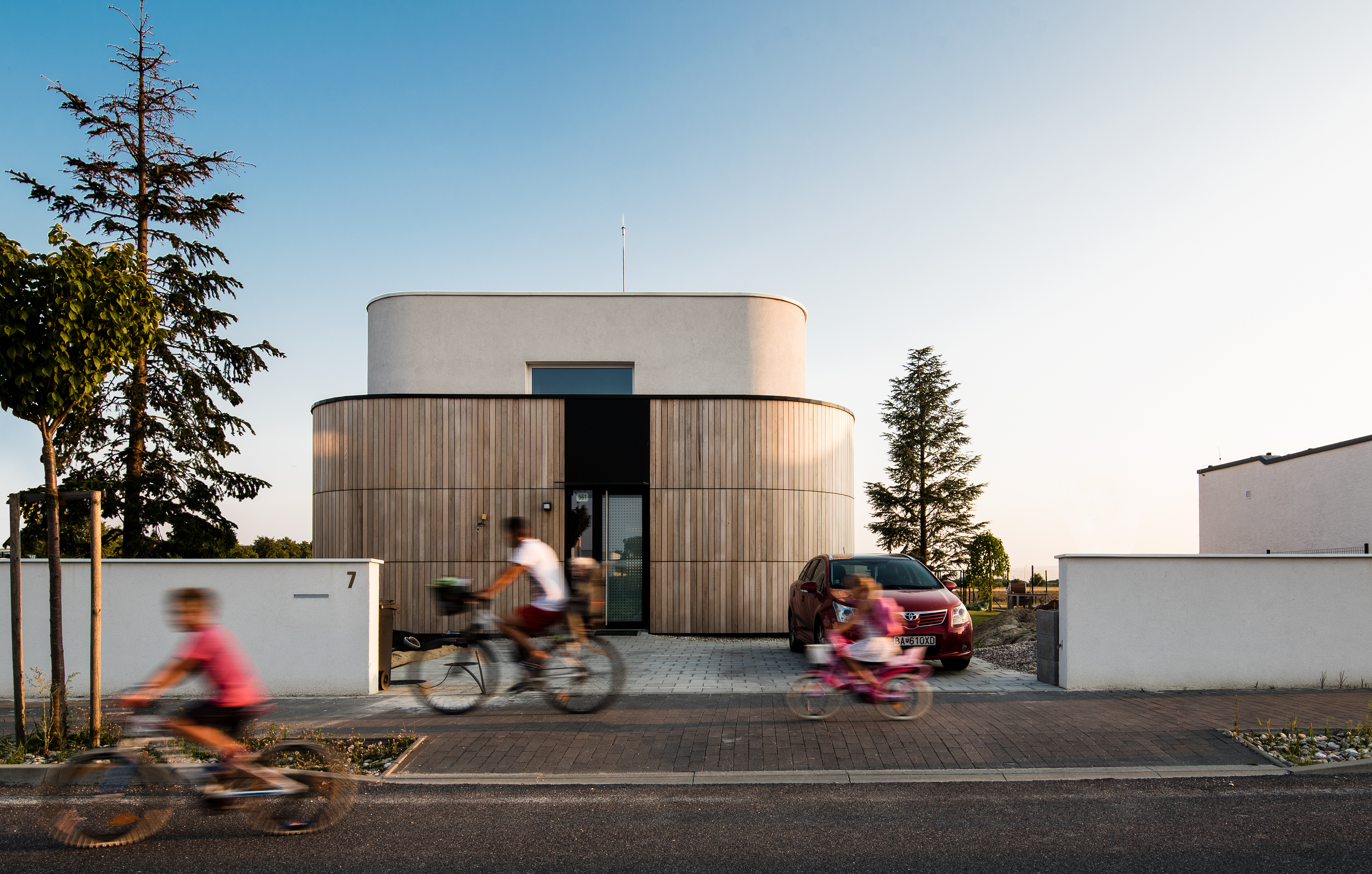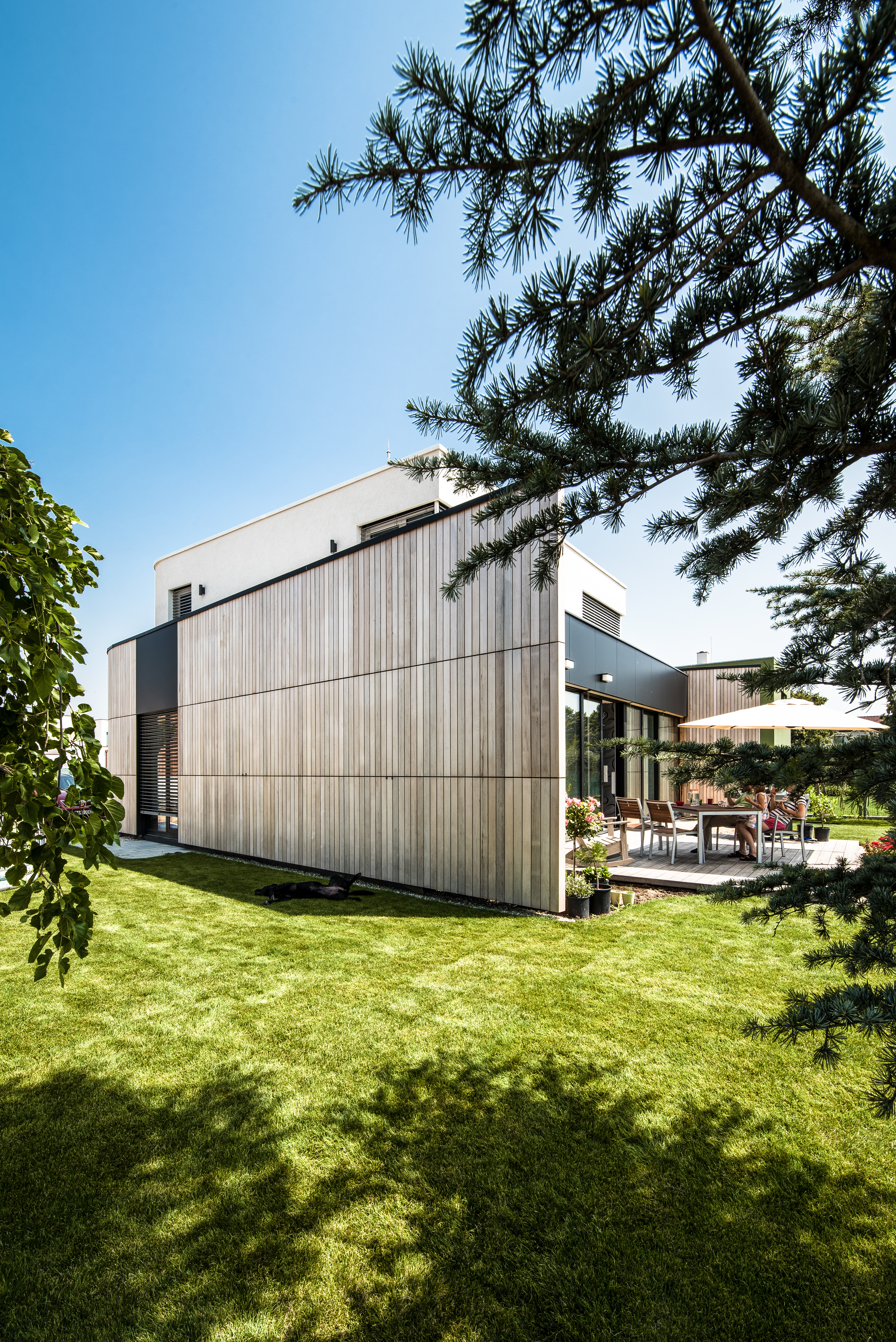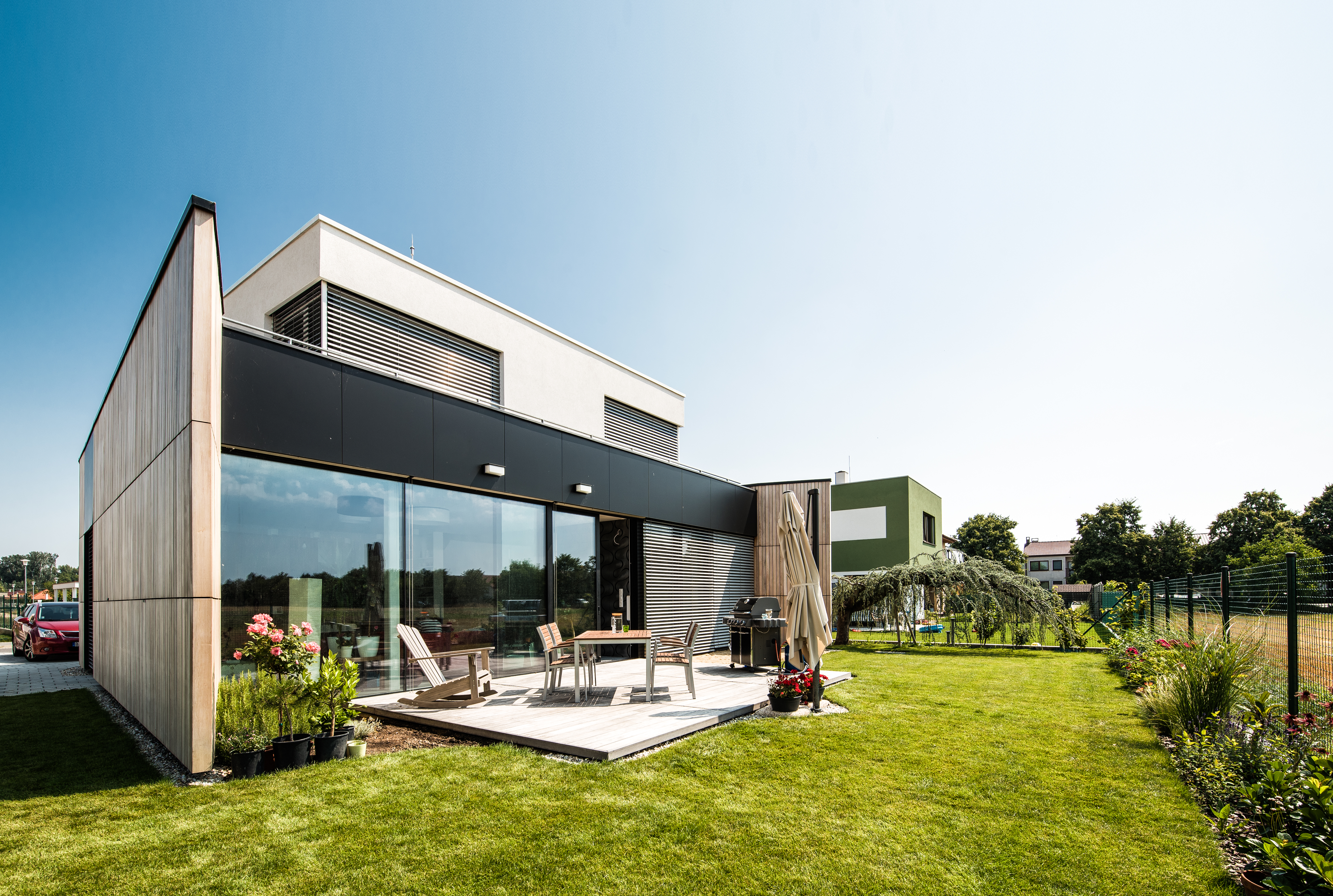 Príjemné bývanie na okraji Bratislavy. Dom chráni súkromie svojich obyvateľov a otvára sa do záhrady orientovanej na juhozápad.