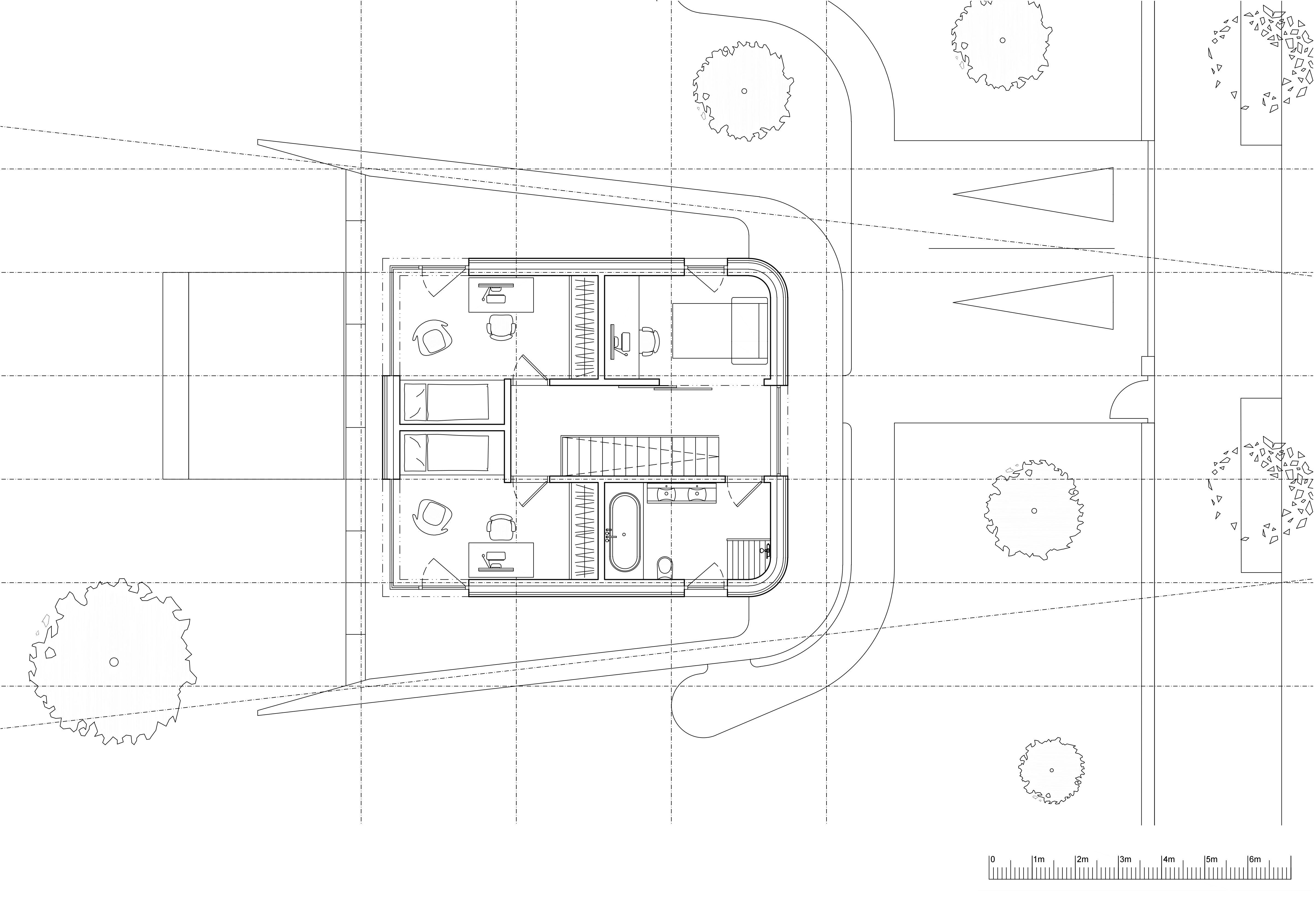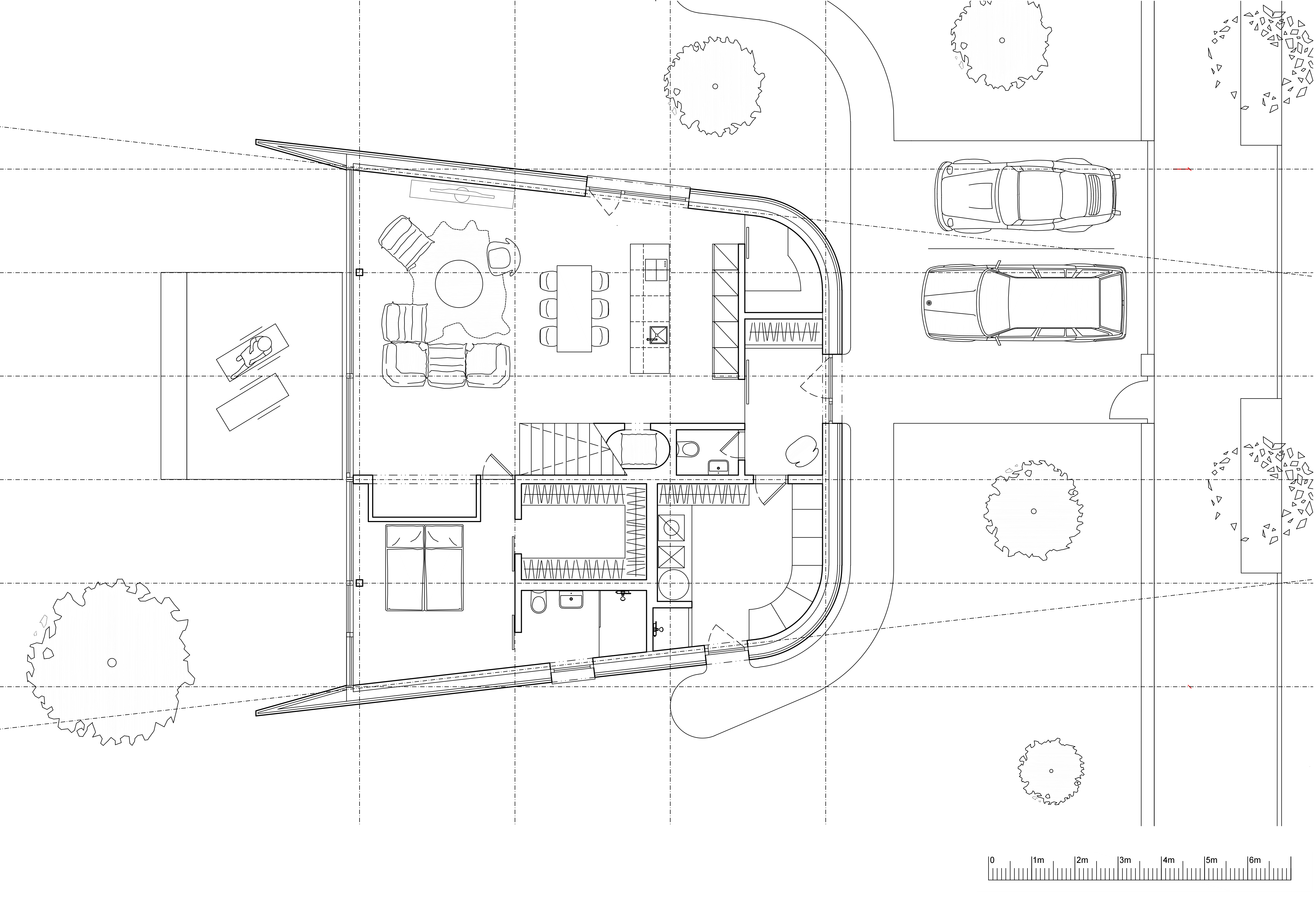 Autorským zámerom bolo hmotovo sa zaradiť do zástavby s jedinečným materiálovým a tvarovým spracovaním. Hlavným cieľom bolo vytvoriť architektúru a interiérové vybavenie ako jedno dielo. Inšpirácia pre architektonické riešenie je hľadanie citácií jednoduchých tvarov (línii) s ich uplatnením. Architektonicky dom vychádza z pôdorysného tvaru obdĺžnika s atypicky vyosenými bočnými stenami ktoré sú citlivo na rohoch zaoblené.