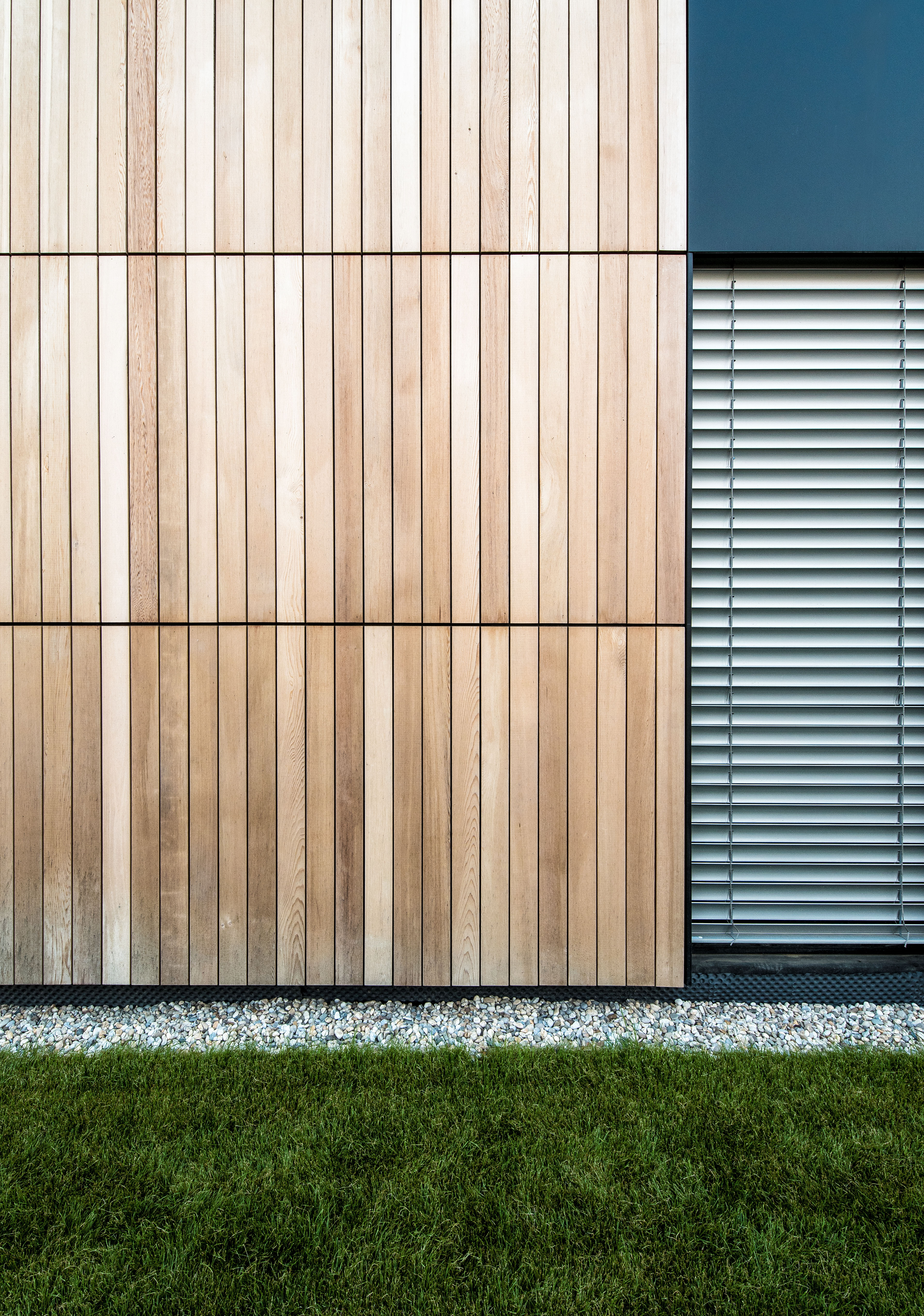 V architektonickom stvárnení je fasáda domu tvorená obvodovými stenami s obkladom z drevených vertikálnych hranolov a strešnou nadstavbou s fasádou s bielej omietky. Interiér je riešený ako otvorený priestor s maximálnym kontaktom s exteriérom cez presklenú stenu s posuvnými oknami s presadenými tieniacimi prvkami (exteriérovými žalúziami) Nosná časť konštrukcie domu tvorí monolitický železobetónový konštrukčný systém.