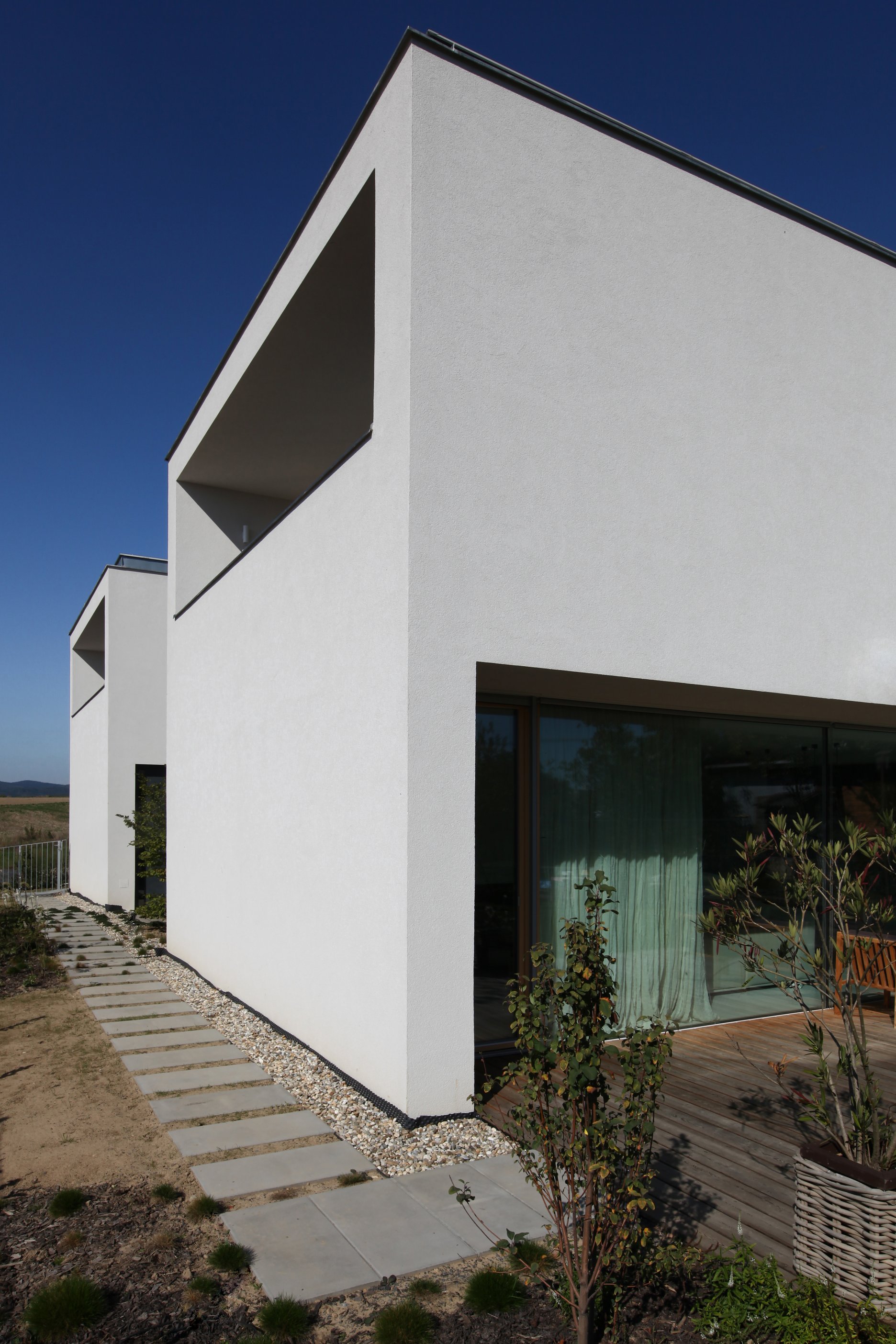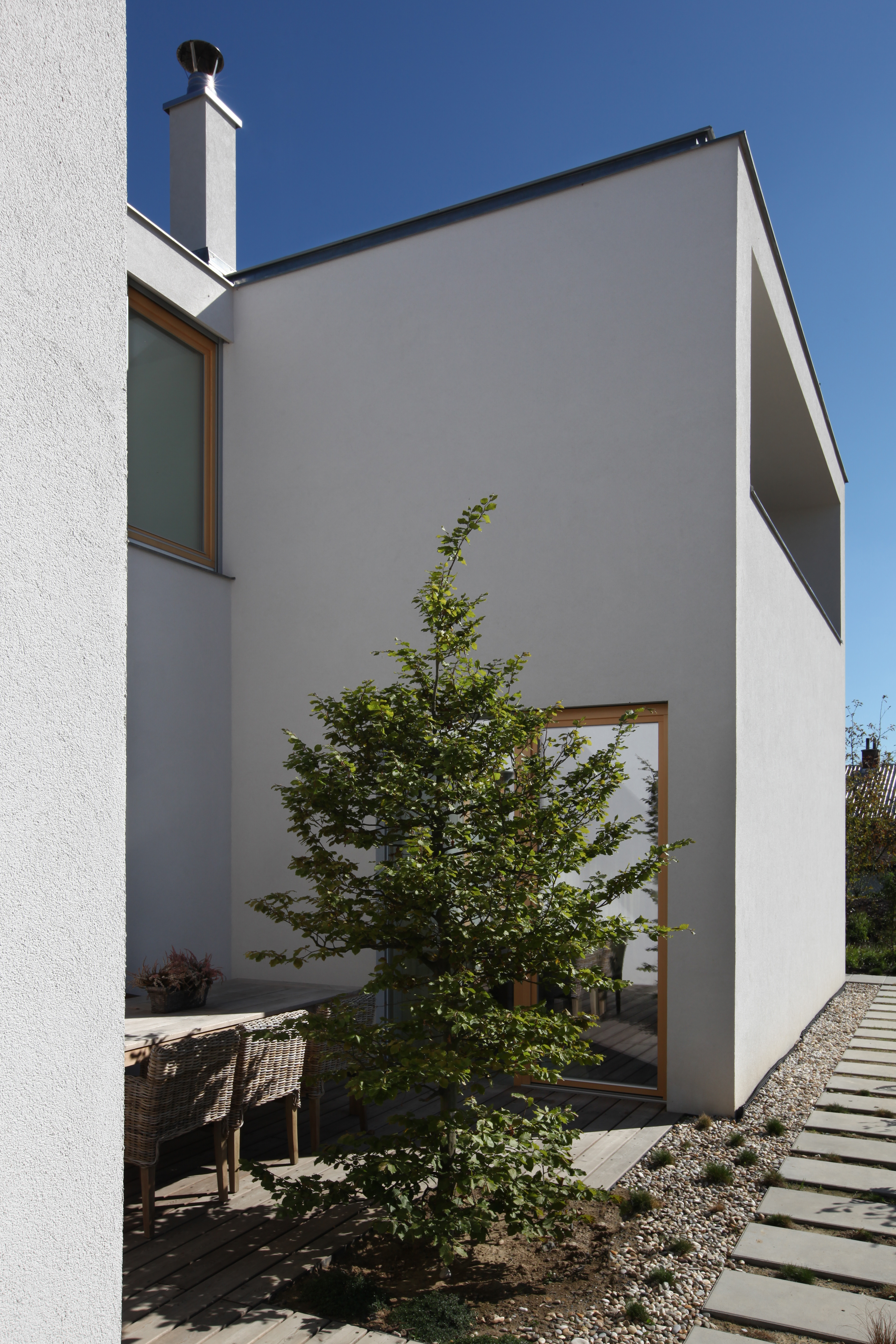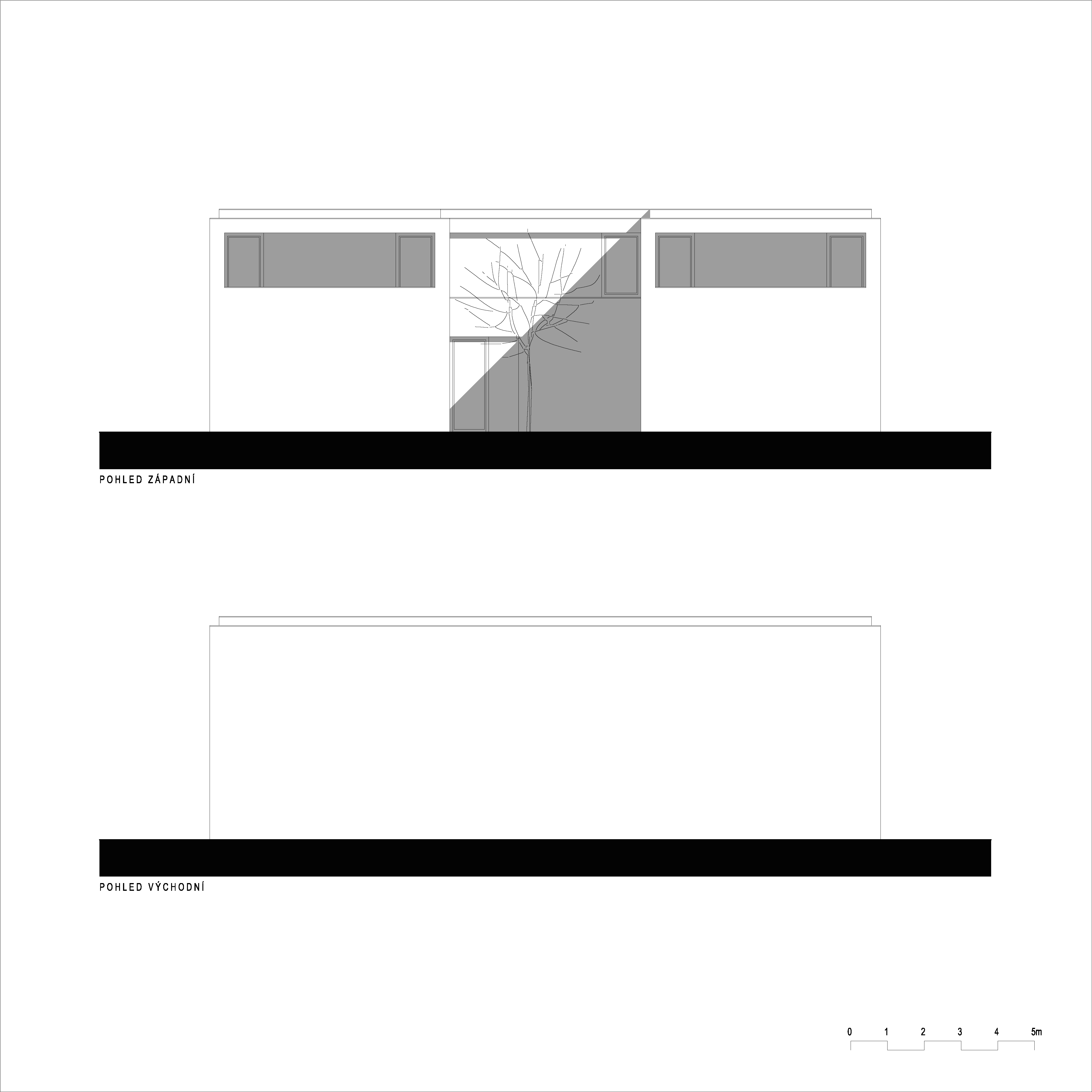 Návrh domu vychází z malé šířky parcely bez výraznějších výhledů do krajiny z plochy zahrady. Navržené řešení sestává z úzkého dvoupodlažního objemu s atriem vloženým v jeho těžišti.