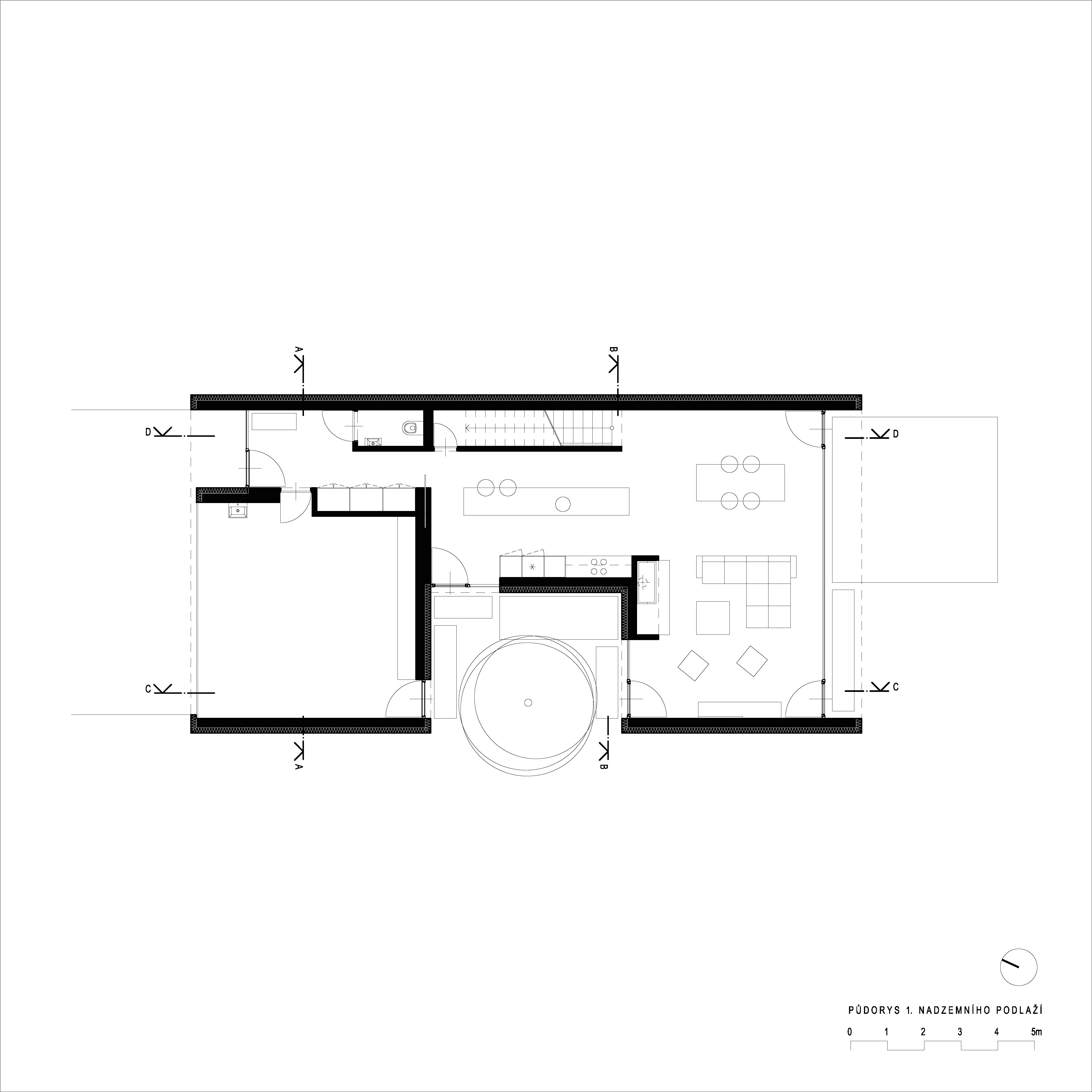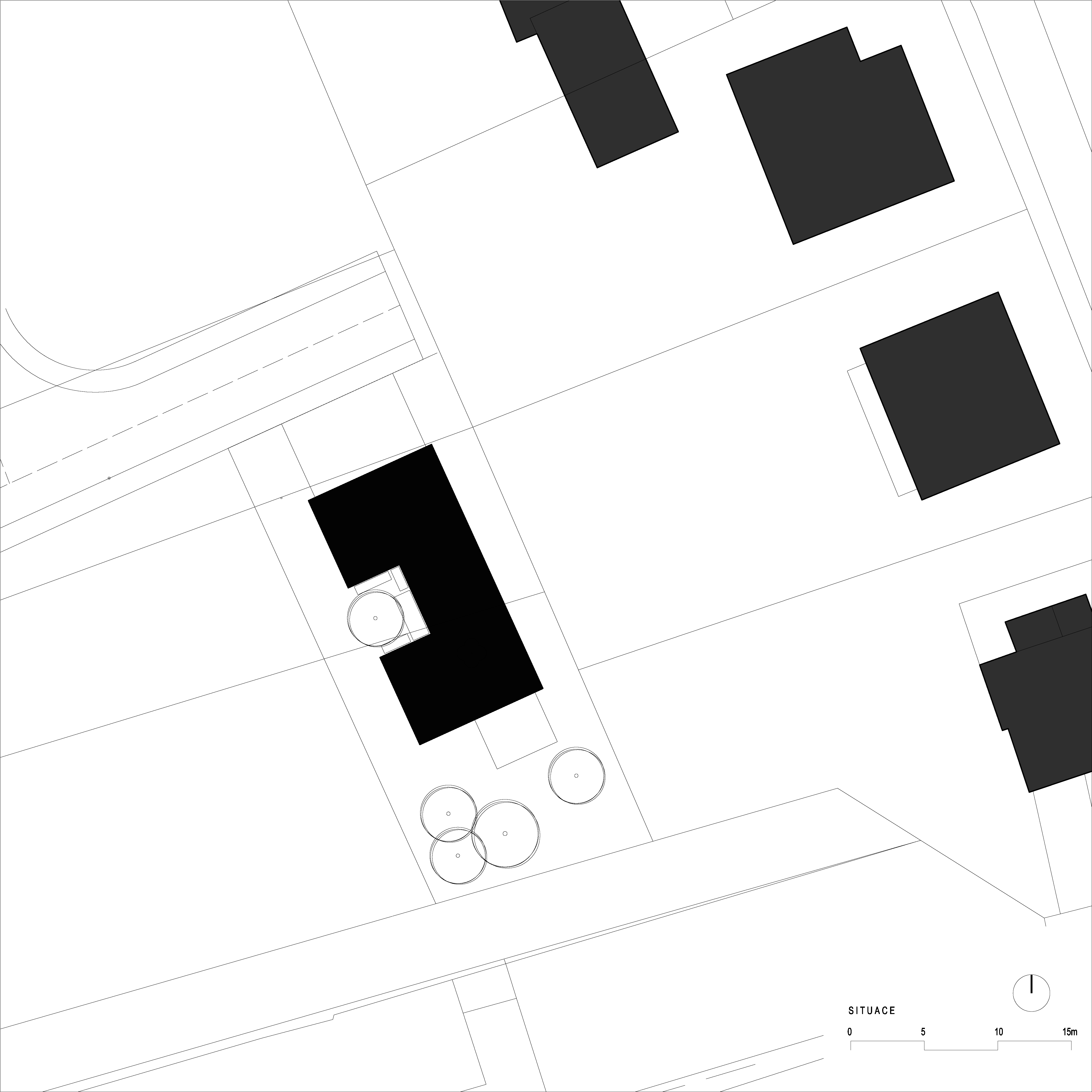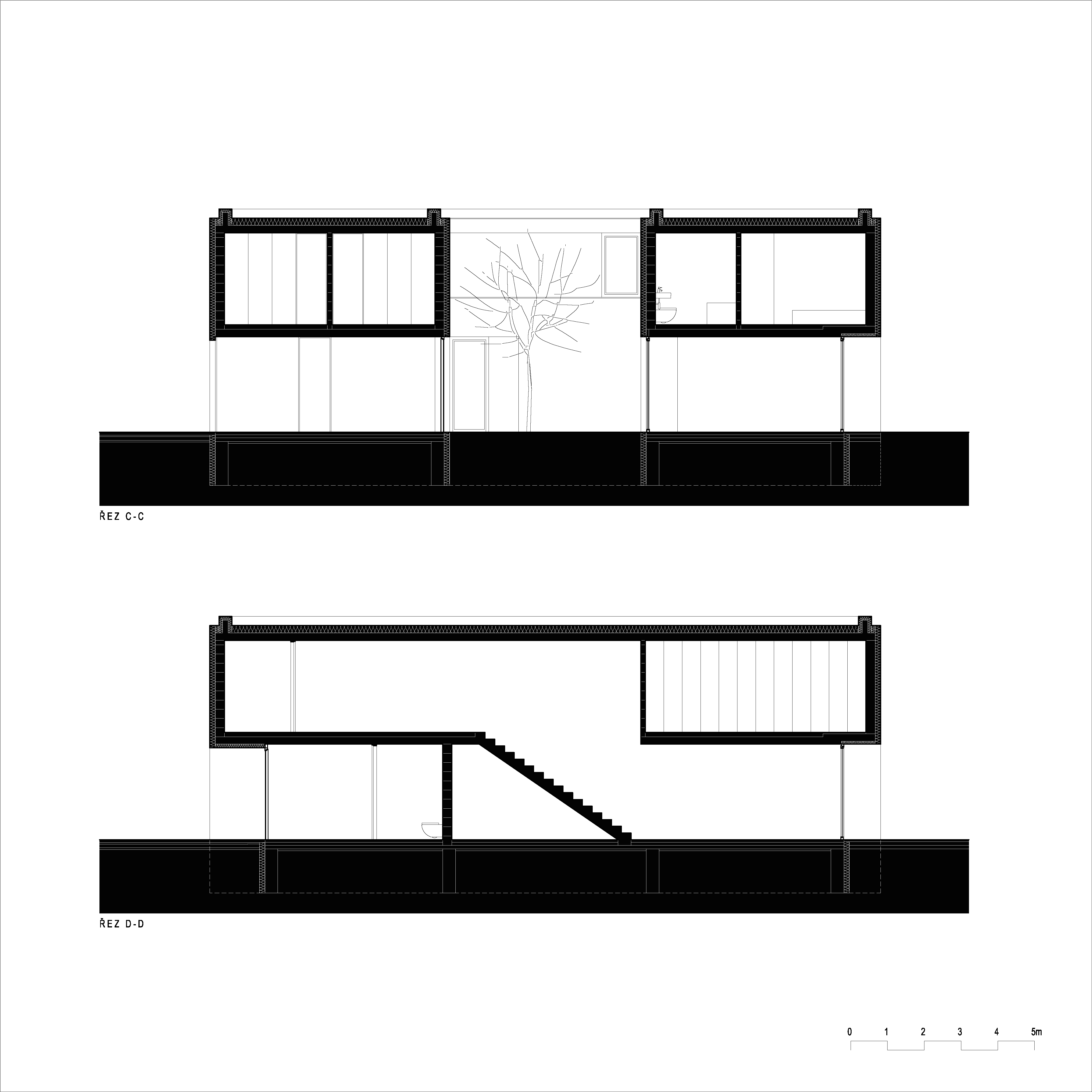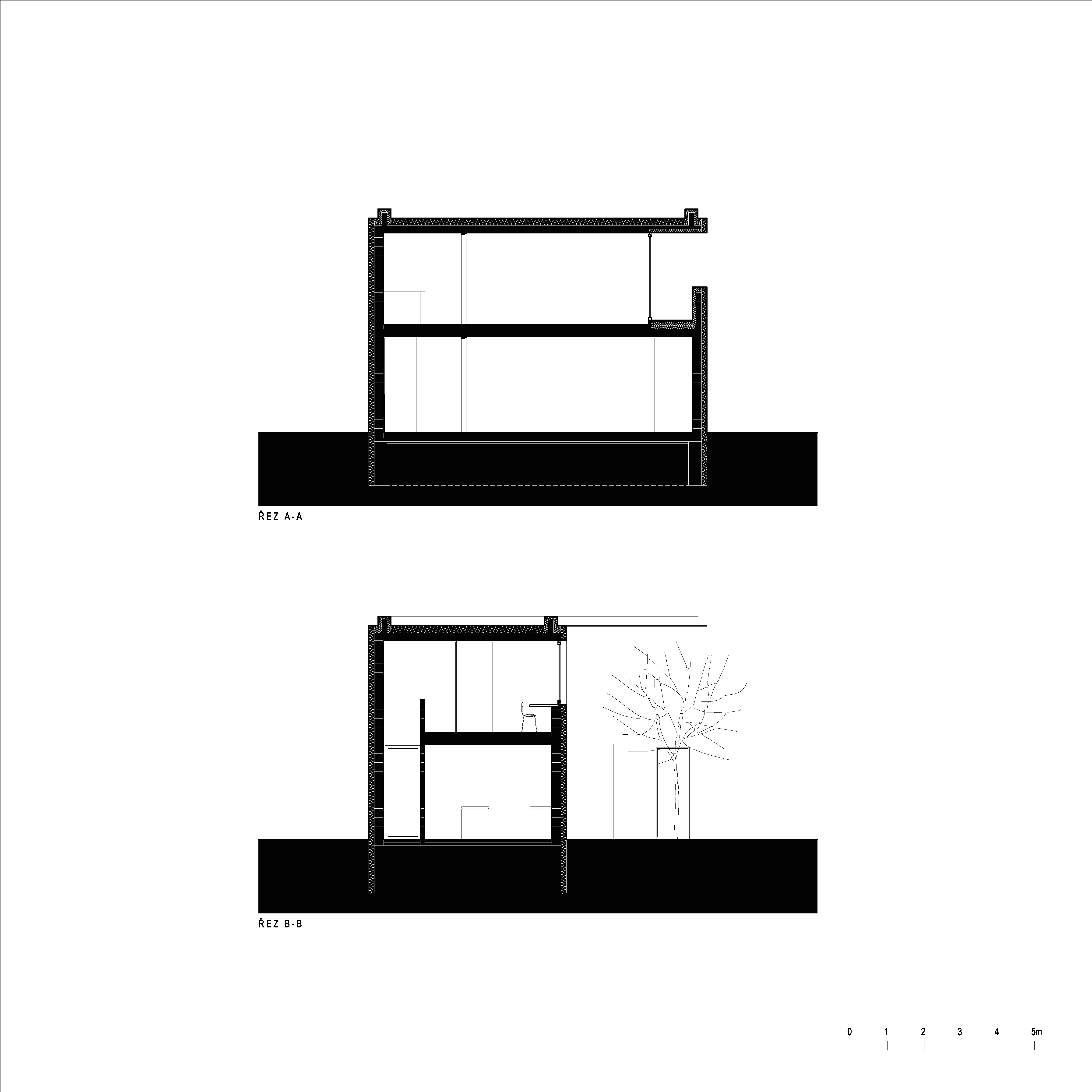 Návrh domu vychází z malé šířky parcely bez výraznějších výhledů do krajiny z plochy zahrady. Navržené řešení sestává z úzkého dvoupodlažního objemu s atriem vloženým v jeho těžišti.