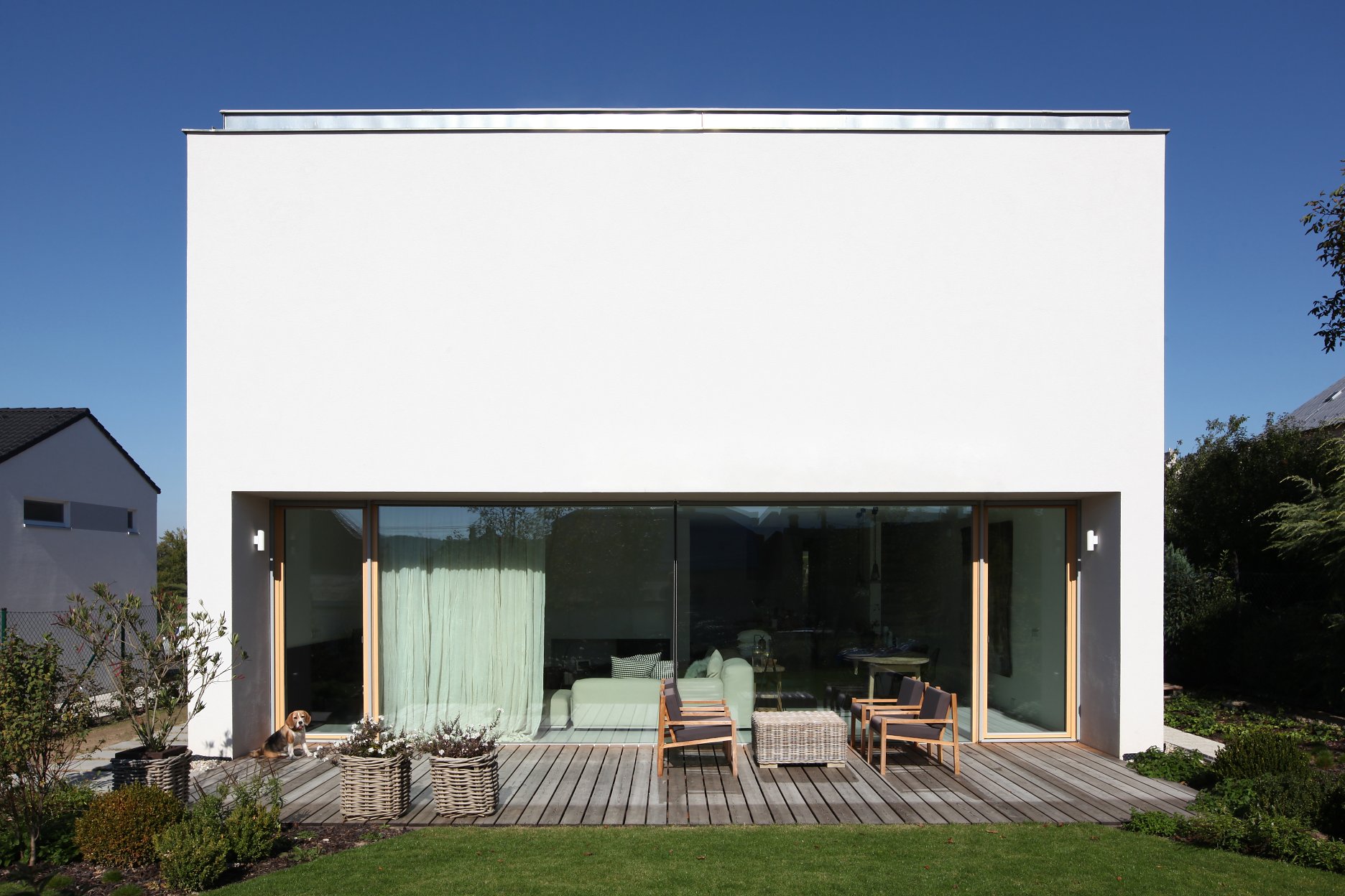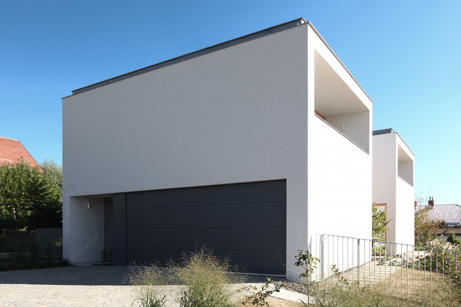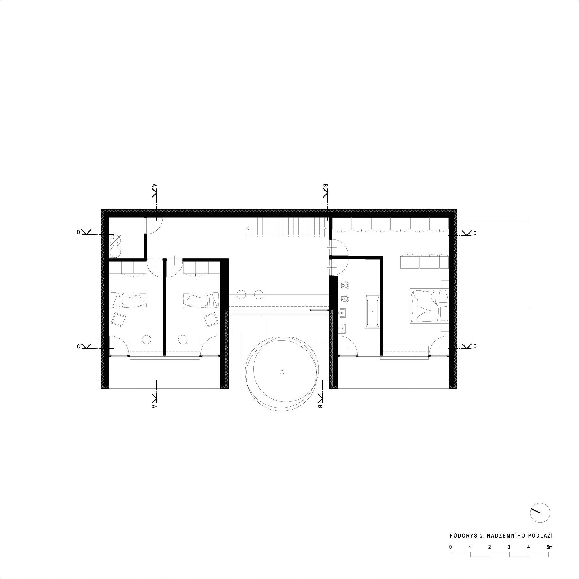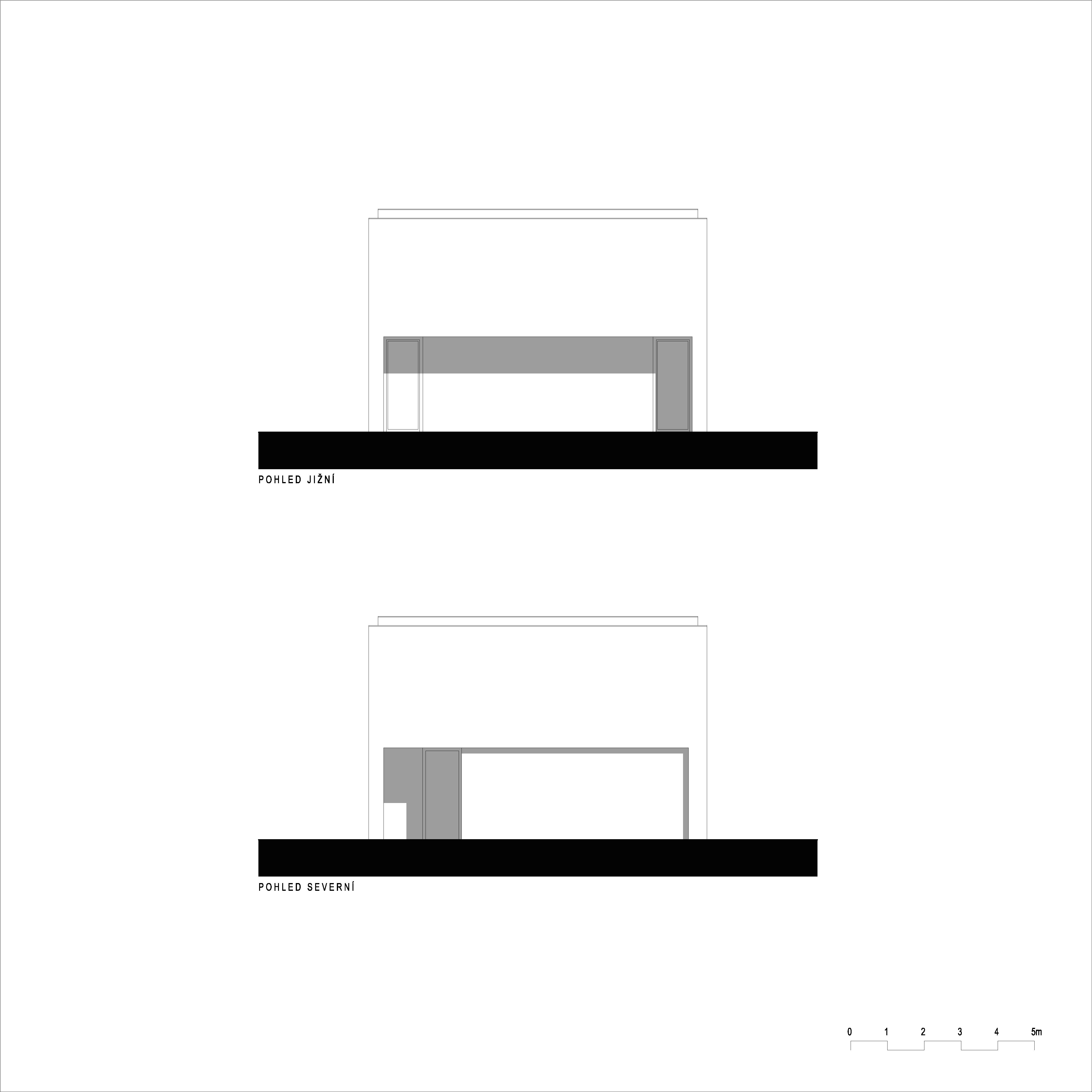 Návrh domu vychází z malé šířky parcely bez výraznějších výhledů do krajiny z plochy zahrady. Navržené řešení sestává z úzkého dvoupodlažního objemu s atriem vloženým v jeho těžišti.