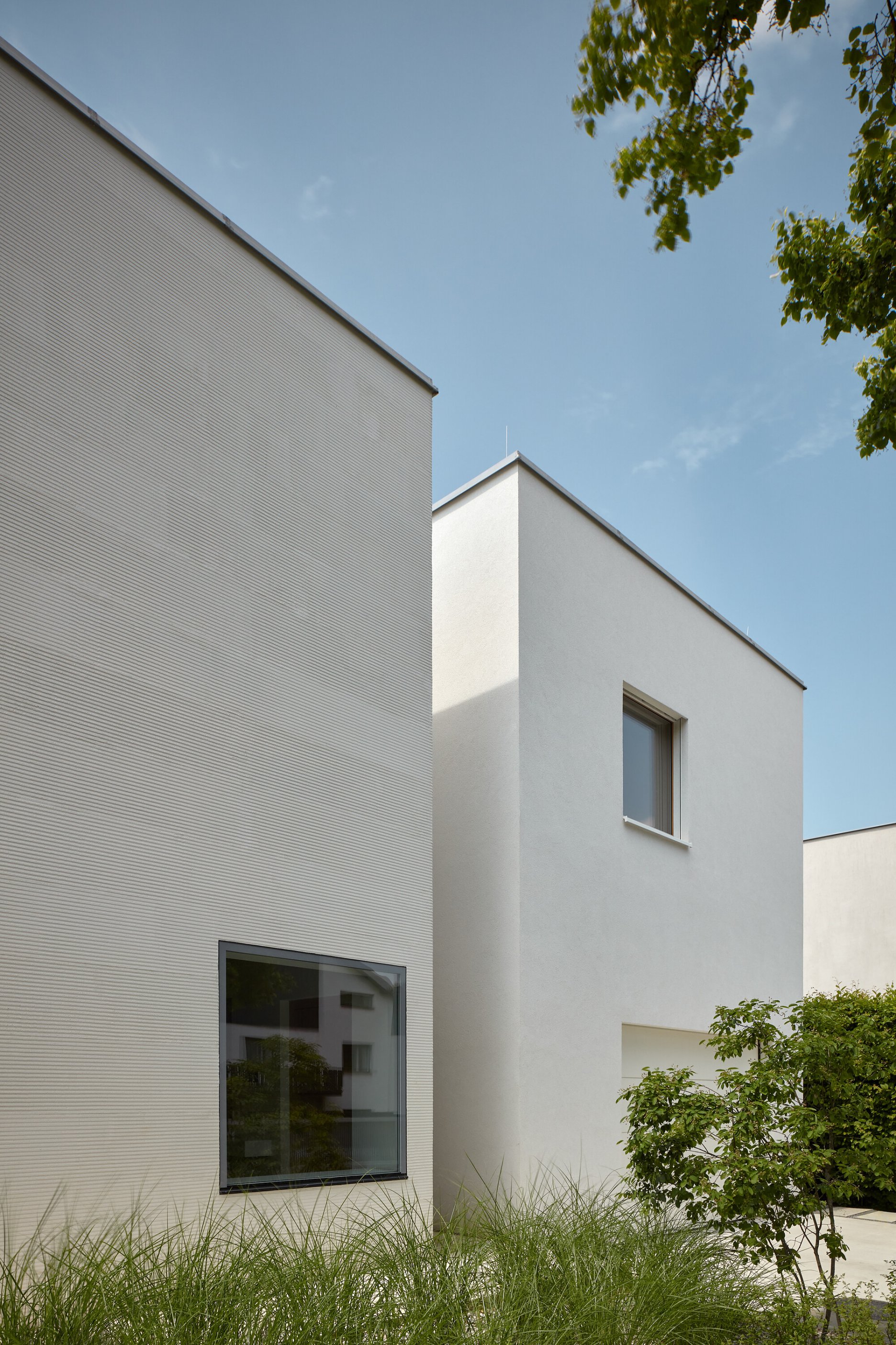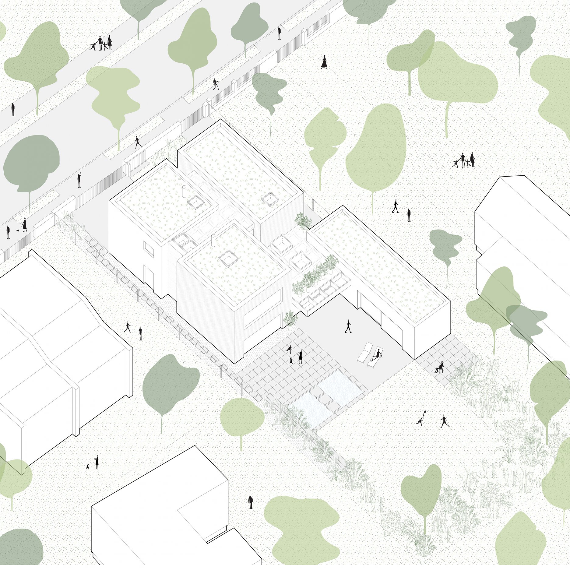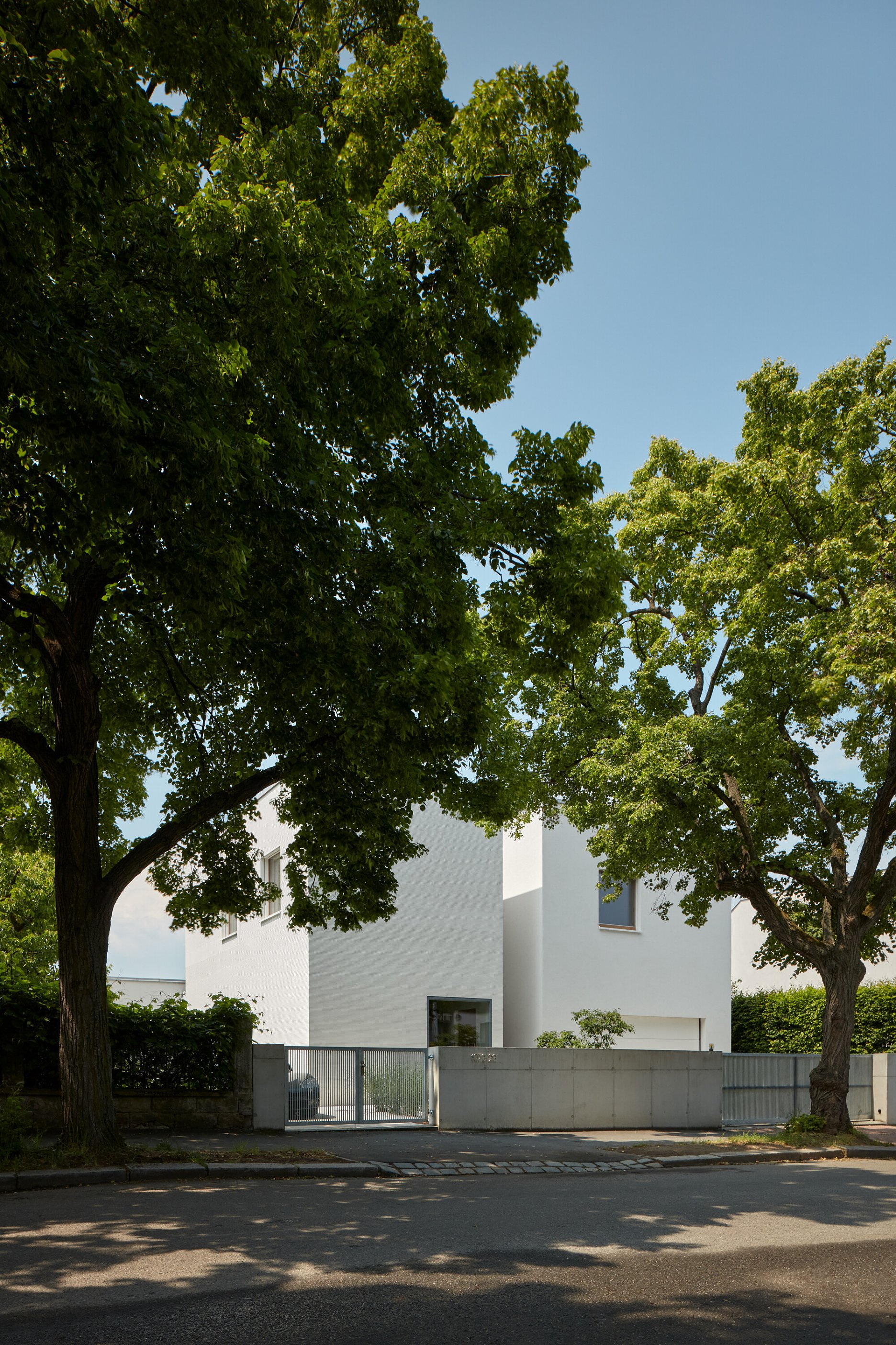 Dom v pokojnej zóne pražskej časti Lhotka je prevádzkovo aj objemovo rozdelený do štyroch blokov, ktoré svojou mierkou korešpondujú so stavbami v okolí. Z ulice definujú výraz dominantné dvojpodlažné bloky, ktoré prepája centrálny drevený trakt s chodbou a jedálňou do kompaktného celku. Čitateľnosť architektonického konceptu podporuje monochromatické farebné riešenie a tradičná materialita.