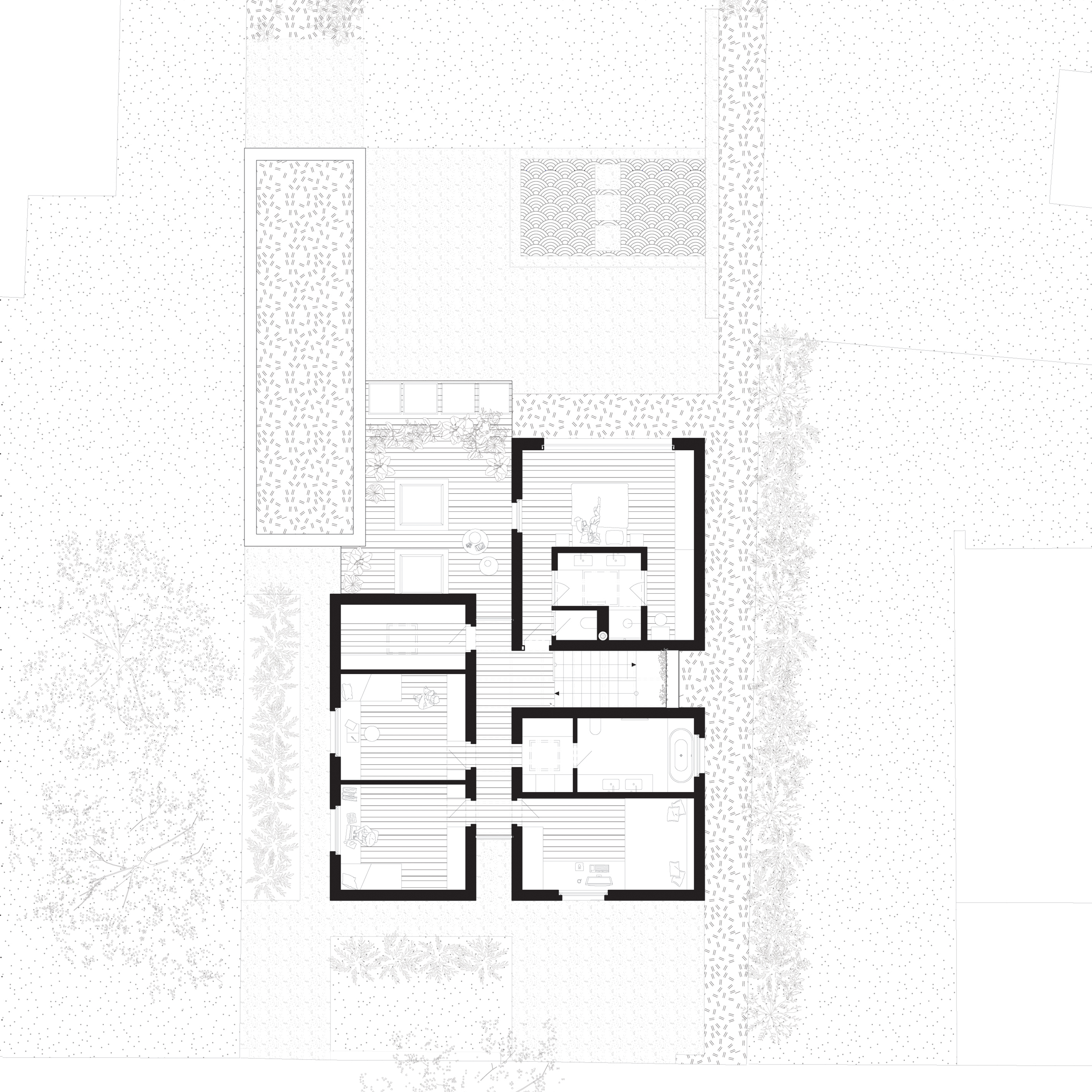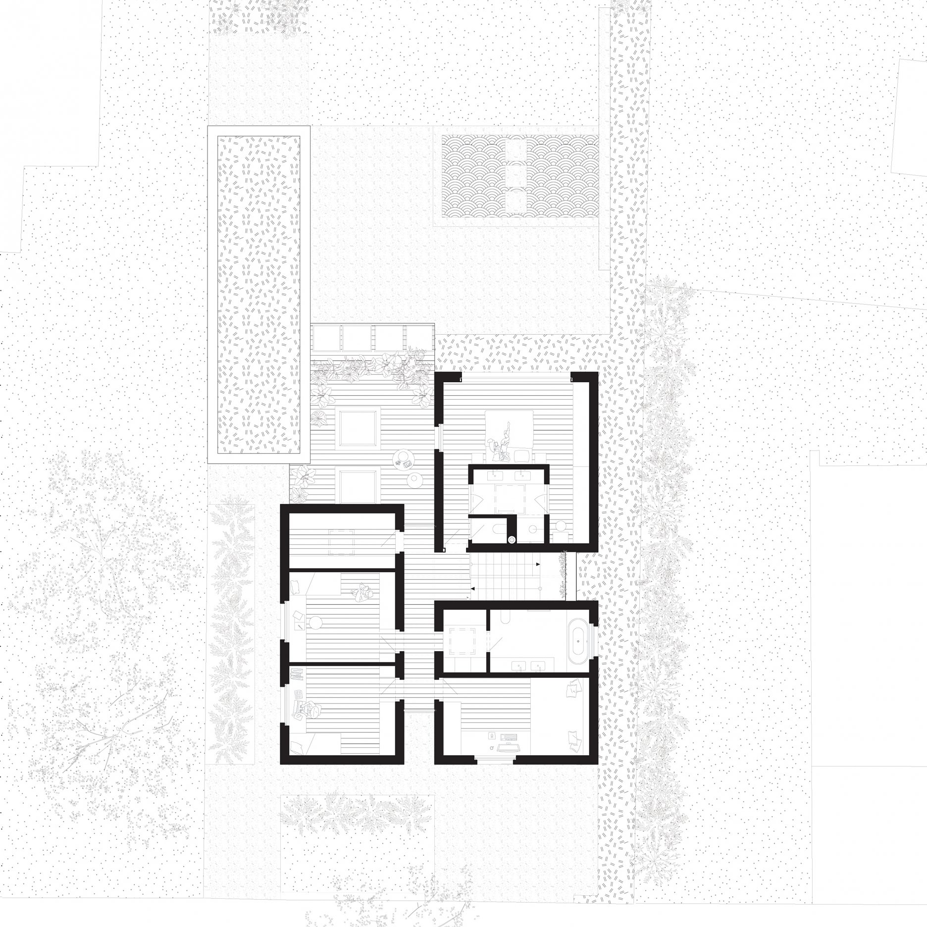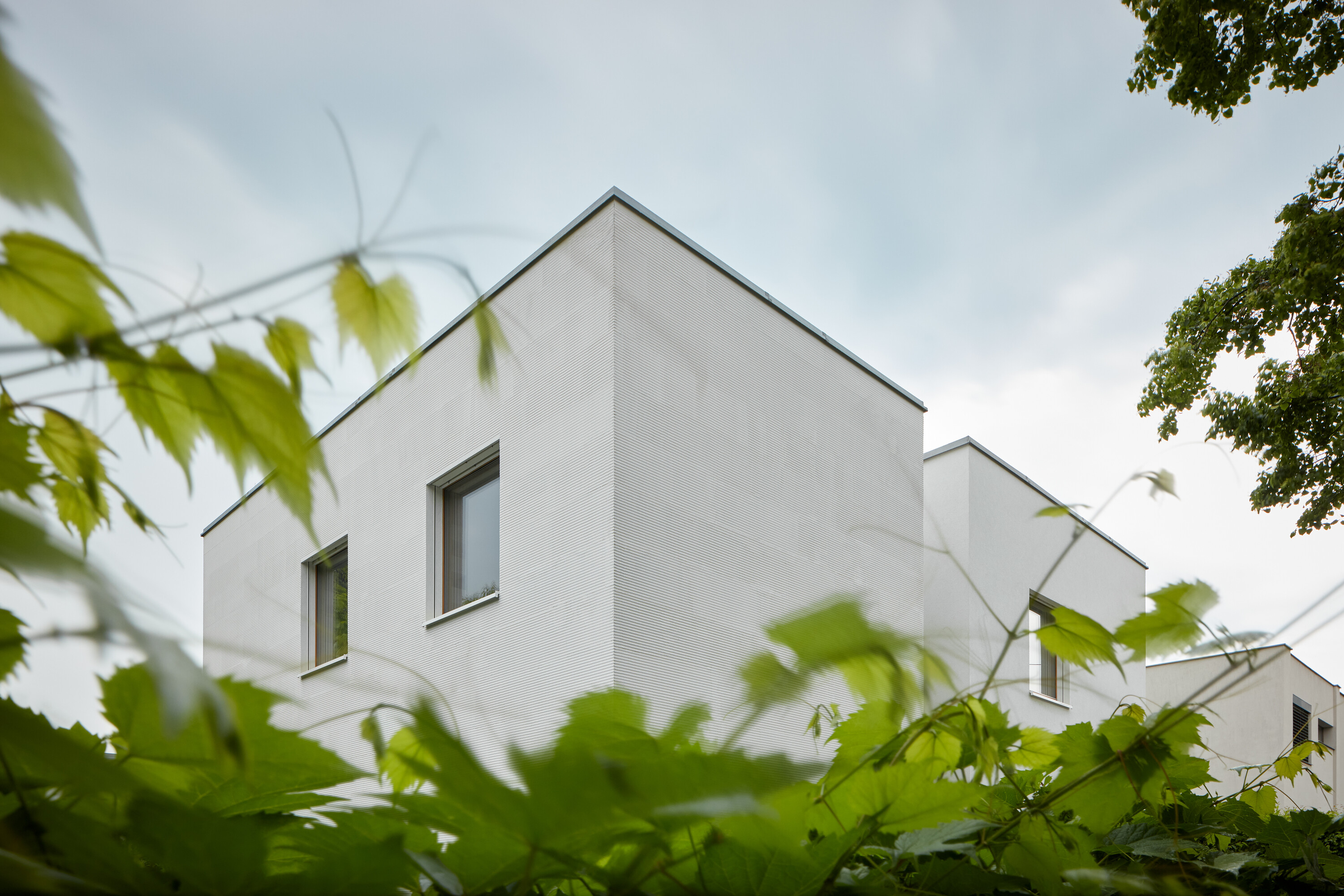Dom v pokojnej zóne pražskej časti Lhotka je prevádzkovo aj objemovo rozdelený do štyroch blokov, ktoré svojou mierkou korešpondujú so stavbami v okolí. Z ulice definujú výraz dominantné dvojpodlažné bloky, ktoré prepája centrálny drevený trakt s chodbou a jedálňou do kompaktného celku. Čitateľnosť architektonického konceptu podporuje monochromatické farebné riešenie a tradičná materialita.