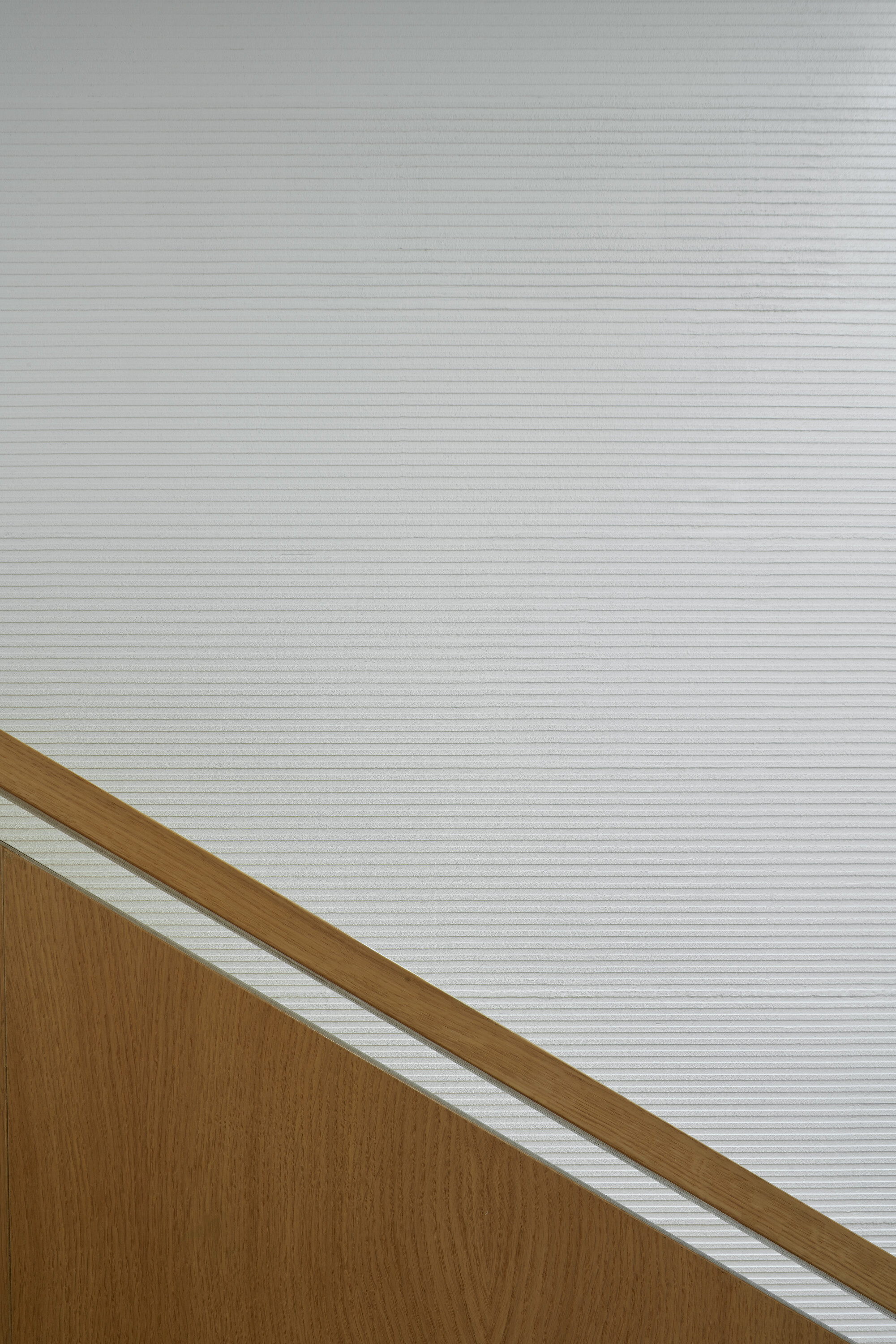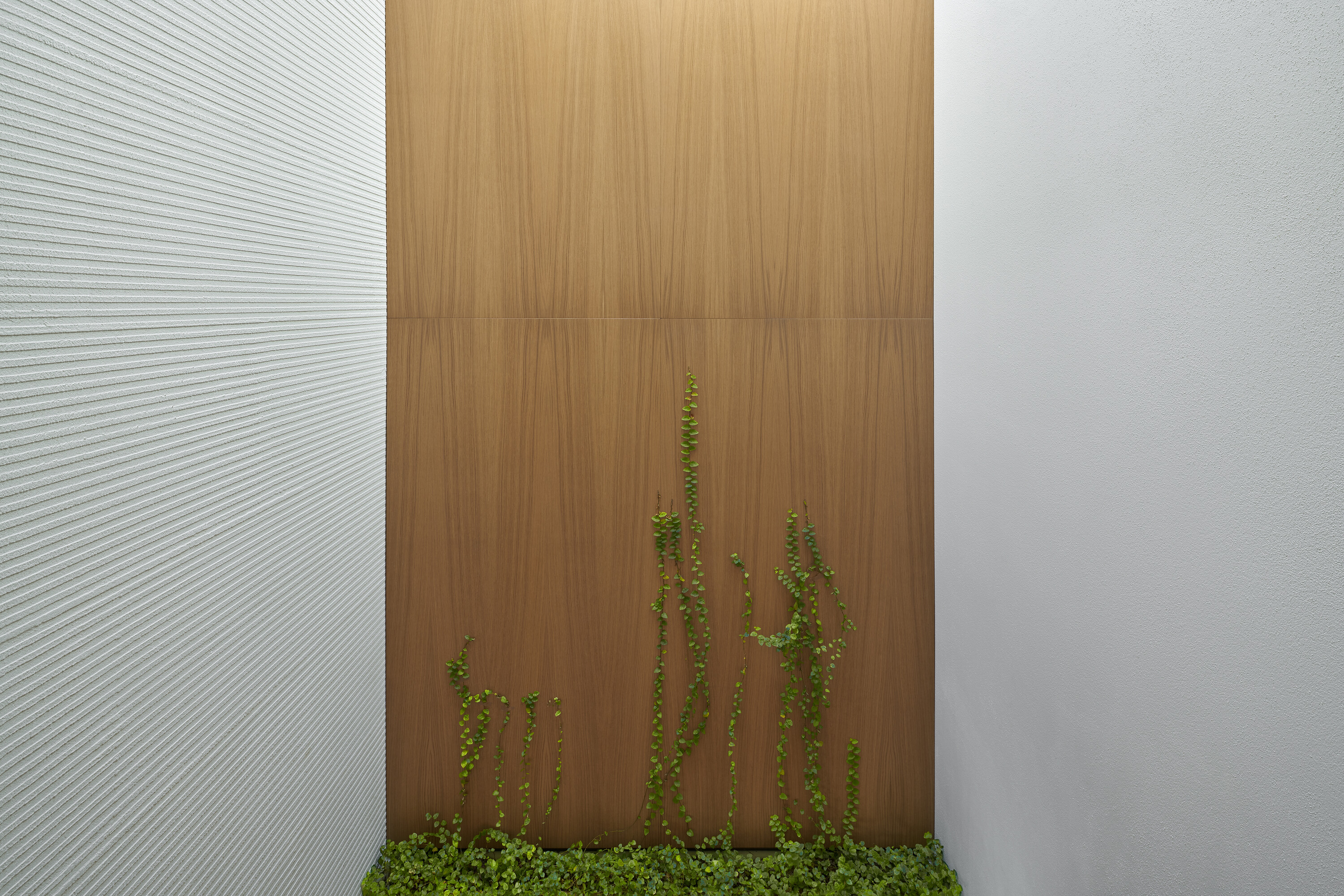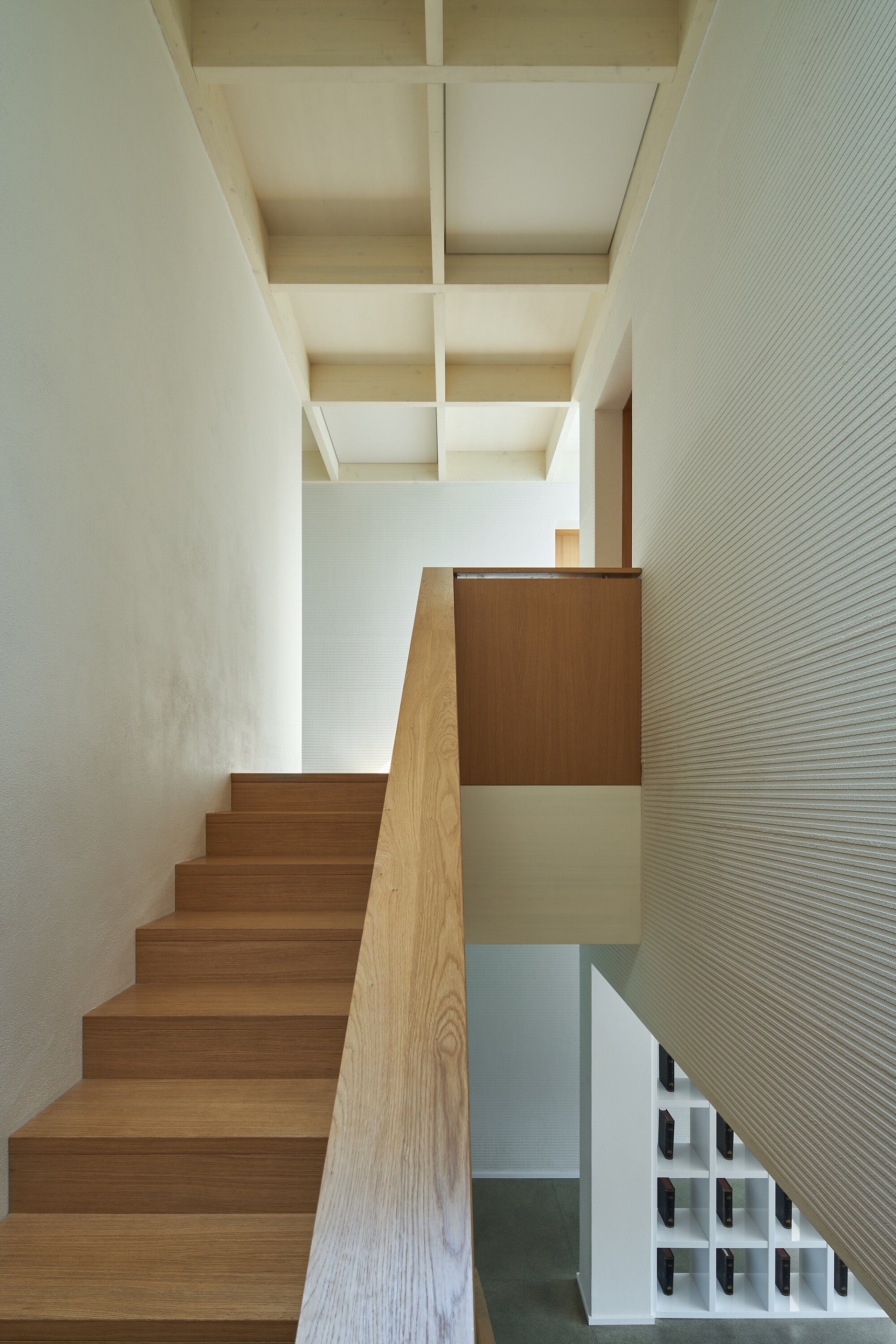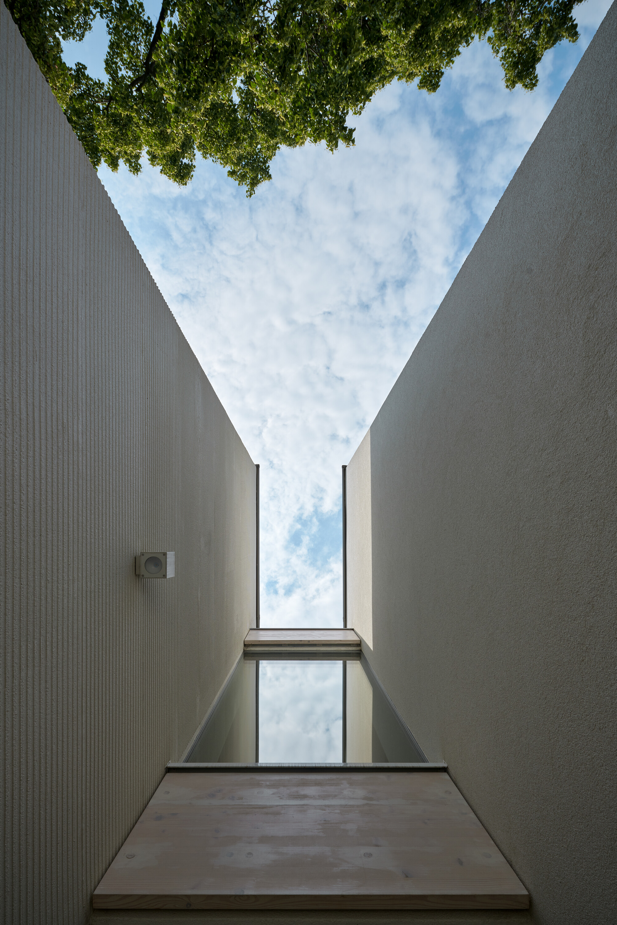 Povrchová úprava stien prechádza aj do exteriéru, kde monochromatické plochy dopĺňa kresba prírodného dreva. Autorské nábytkové solitéry zjednocujú a definujú jednotlivé funkčné zóny domu. Pohľad na strop v centrálnom trakte prezrádza konštrukciu drevostavby.