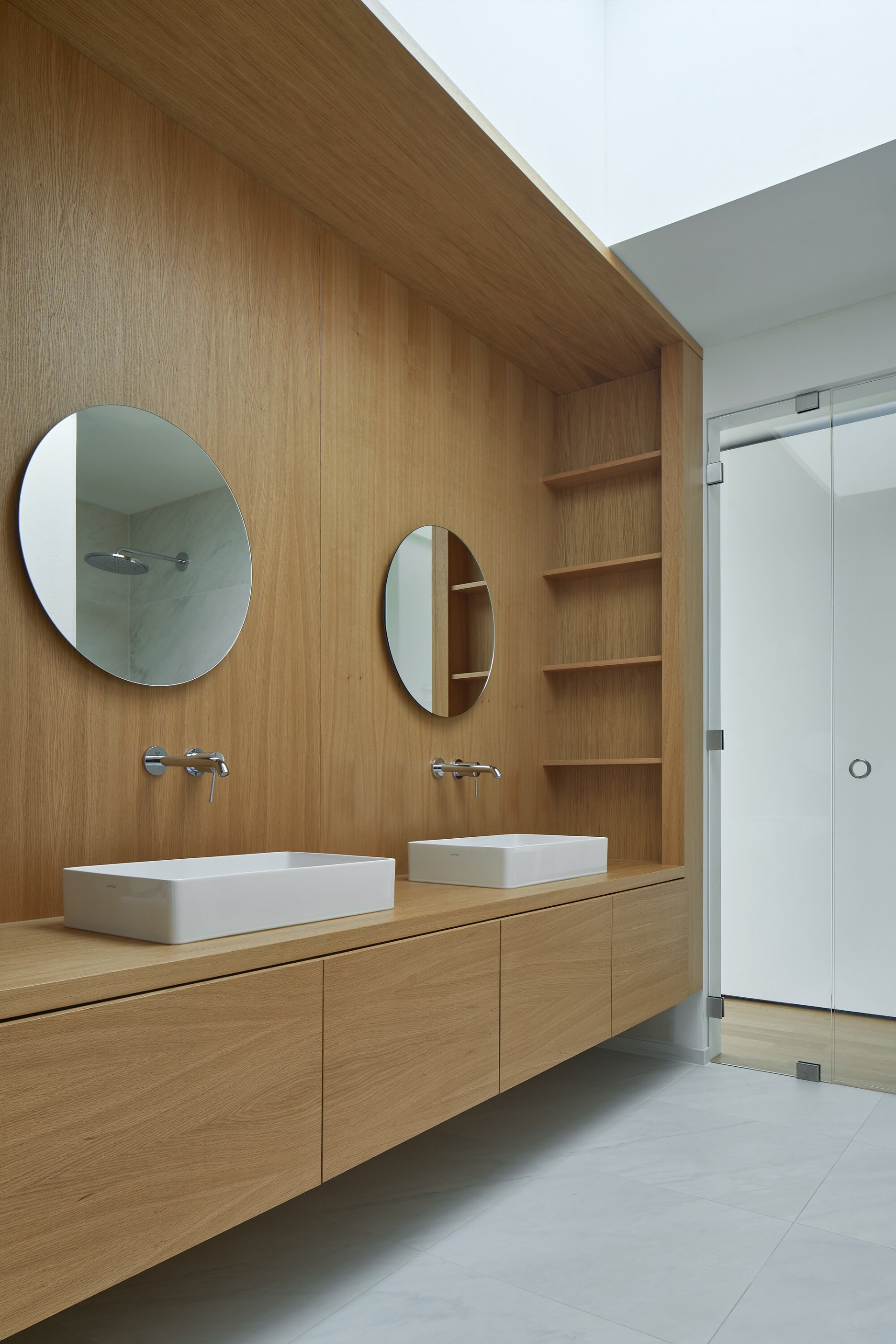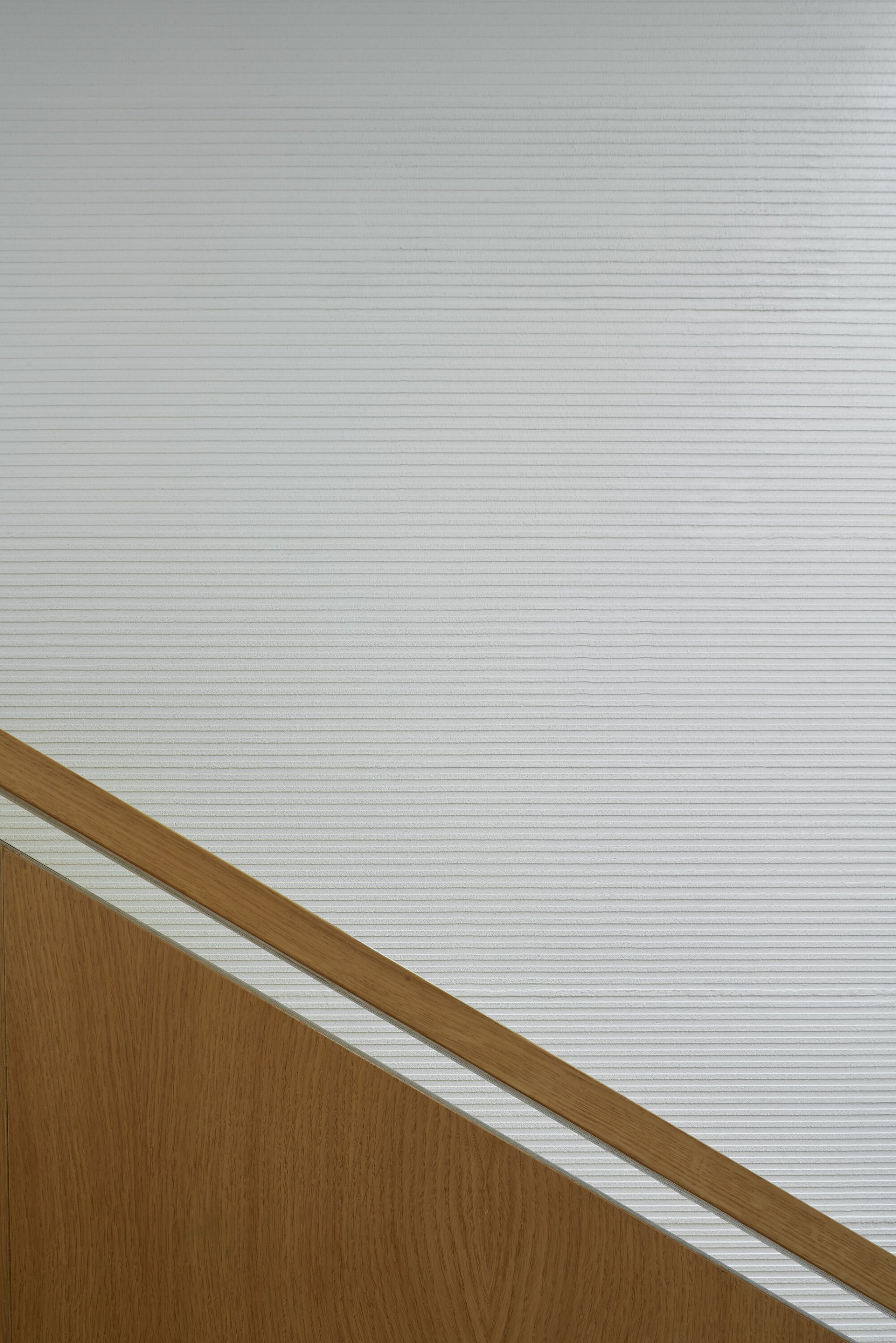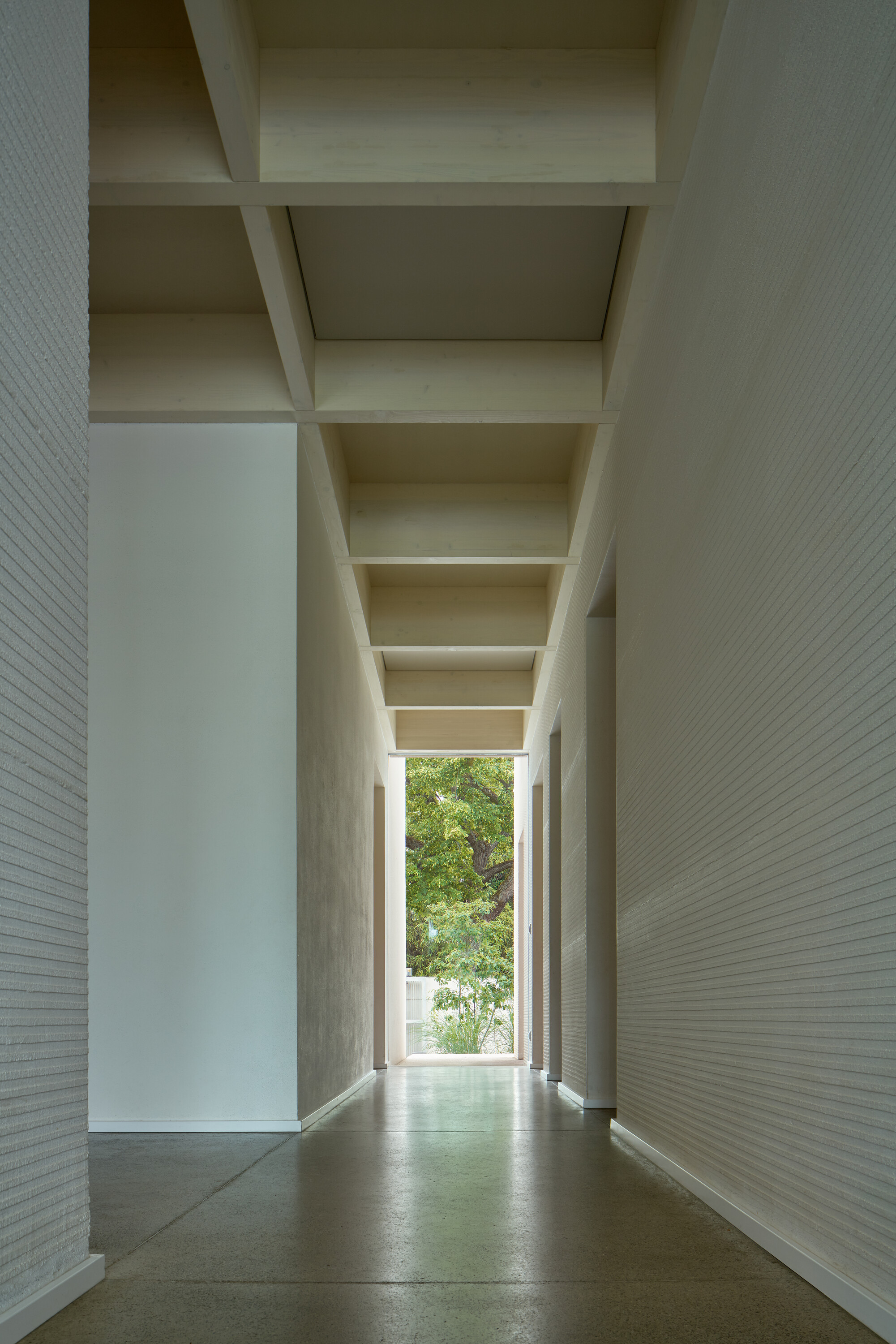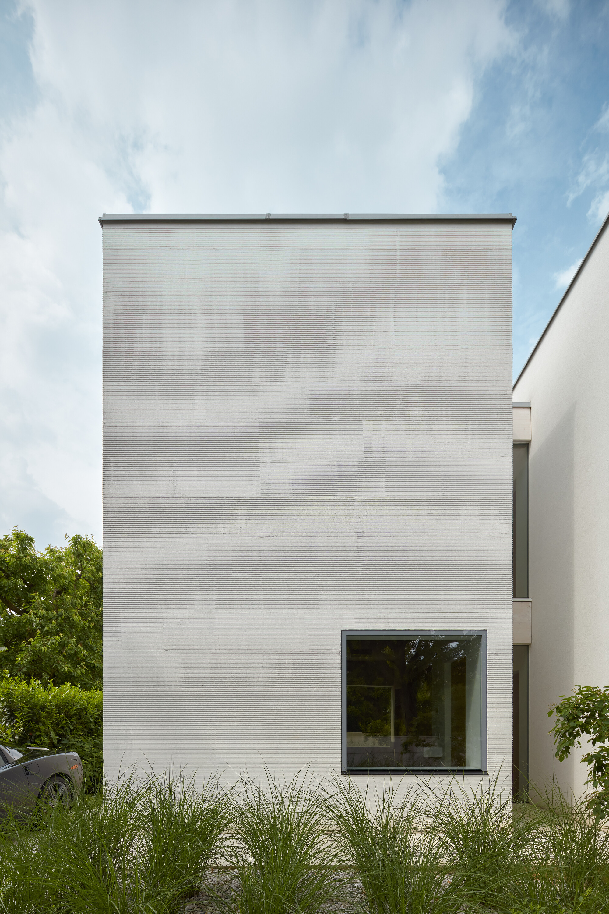 Povrchová úprava stien prechádza aj do exteriéru, kde monochromatické plochy dopĺňa kresba prírodného dreva. Autorské nábytkové solitéry zjednocujú a definujú jednotlivé funkčné zóny domu. Pohľad na strop v centrálnom trakte prezrádza konštrukciu drevostavby.