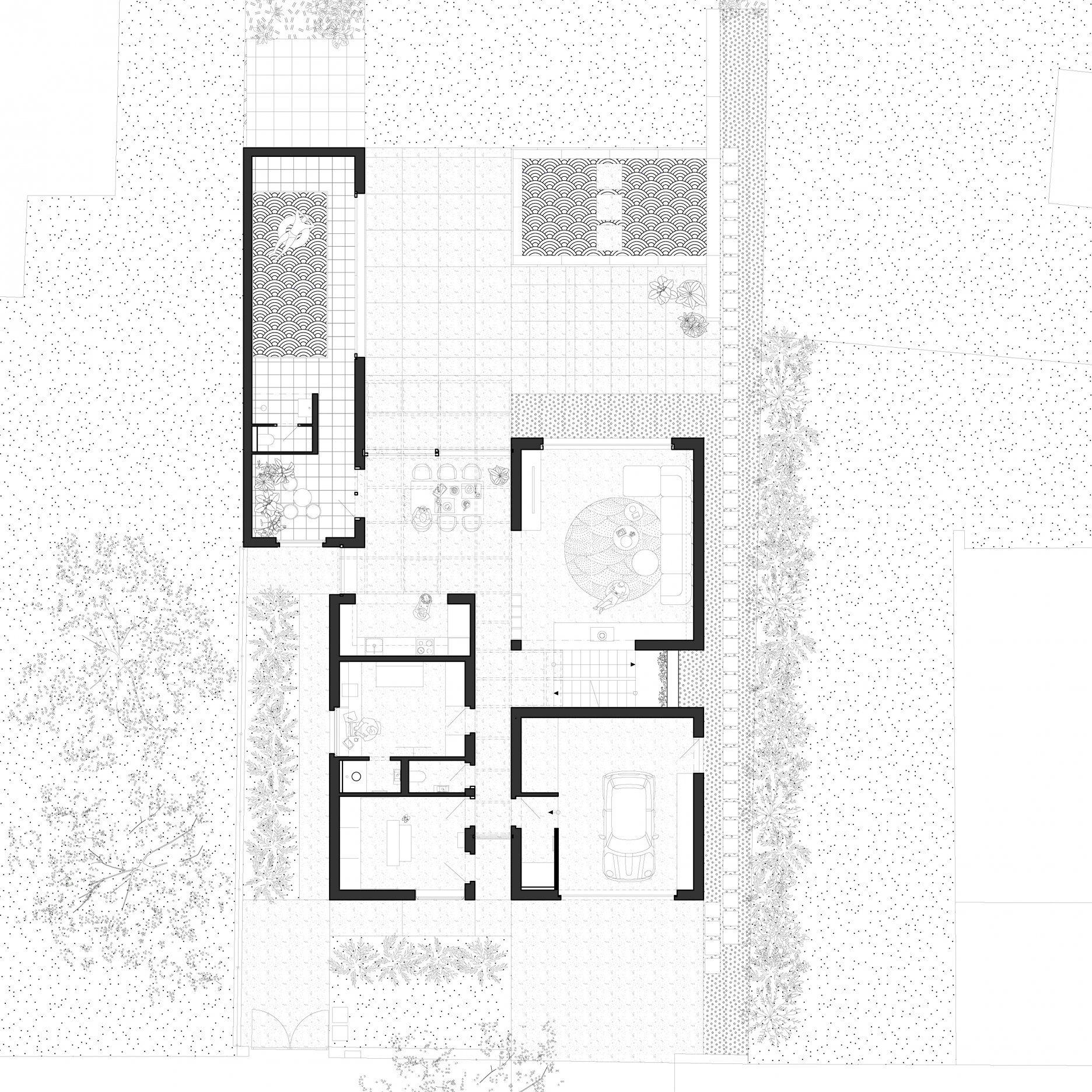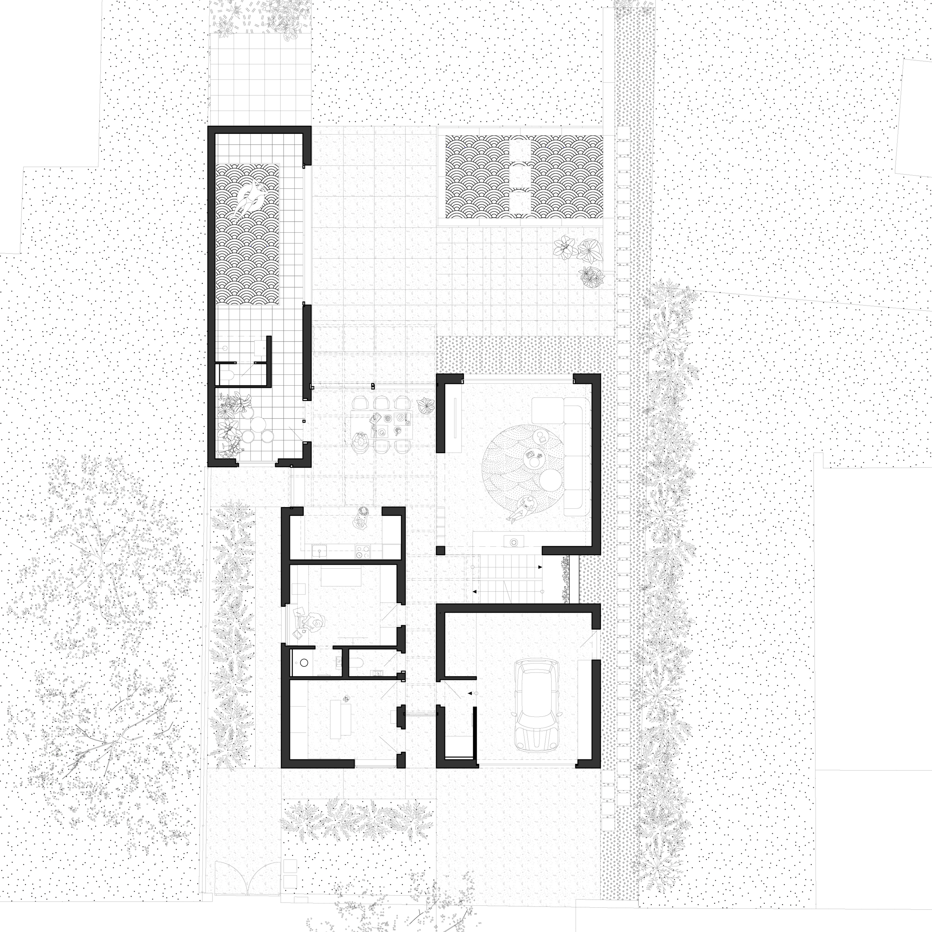 Zo vstupnej haly, alebo garáže prechádzame do chodby, ktorá objekt rozdeľuje na spomínané štyri zóny. Za obslužnou časťou, smerujúcou do ulice, je umiestnená pracovňa s výhľadom na zeleň. V zadnej časti, orientovanej do záhrady, navrhli architekti kuchyňu, s priamou väzbou na terasu a zimnú záhradu s bazénom. Obývacia izba, v severozápadnej časti domu, je vizuálne prepojená s kuchyňou.