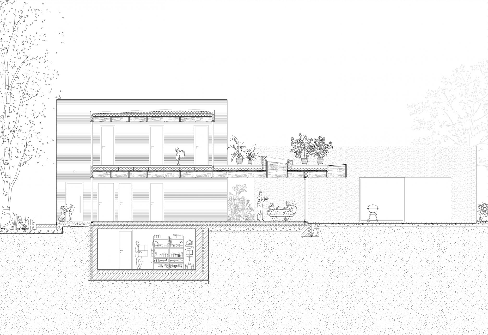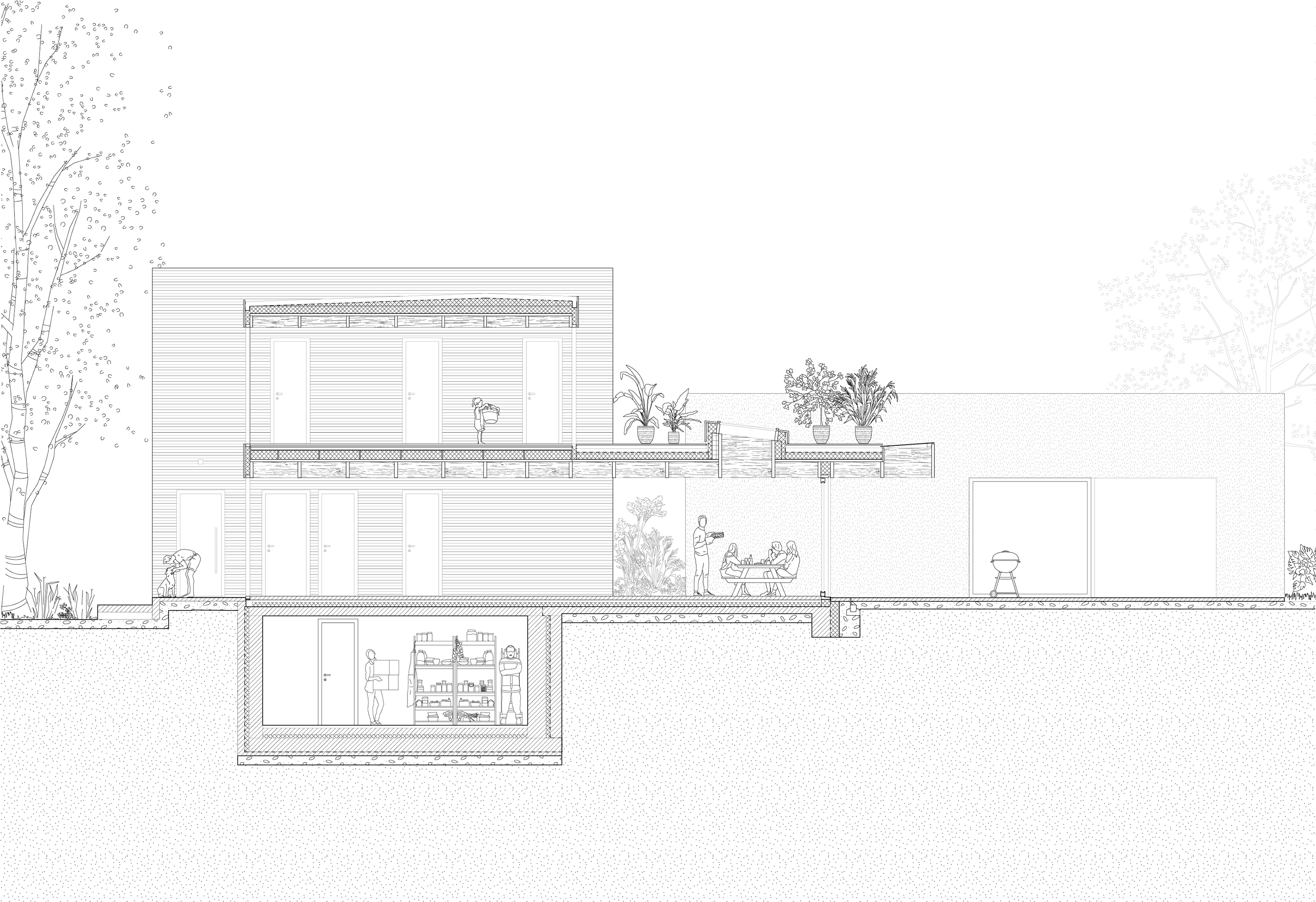 Najväčšiu časť suterénu zaberá spoločenská miestnosť, doplnená ďalšími obslužnými priestormi.