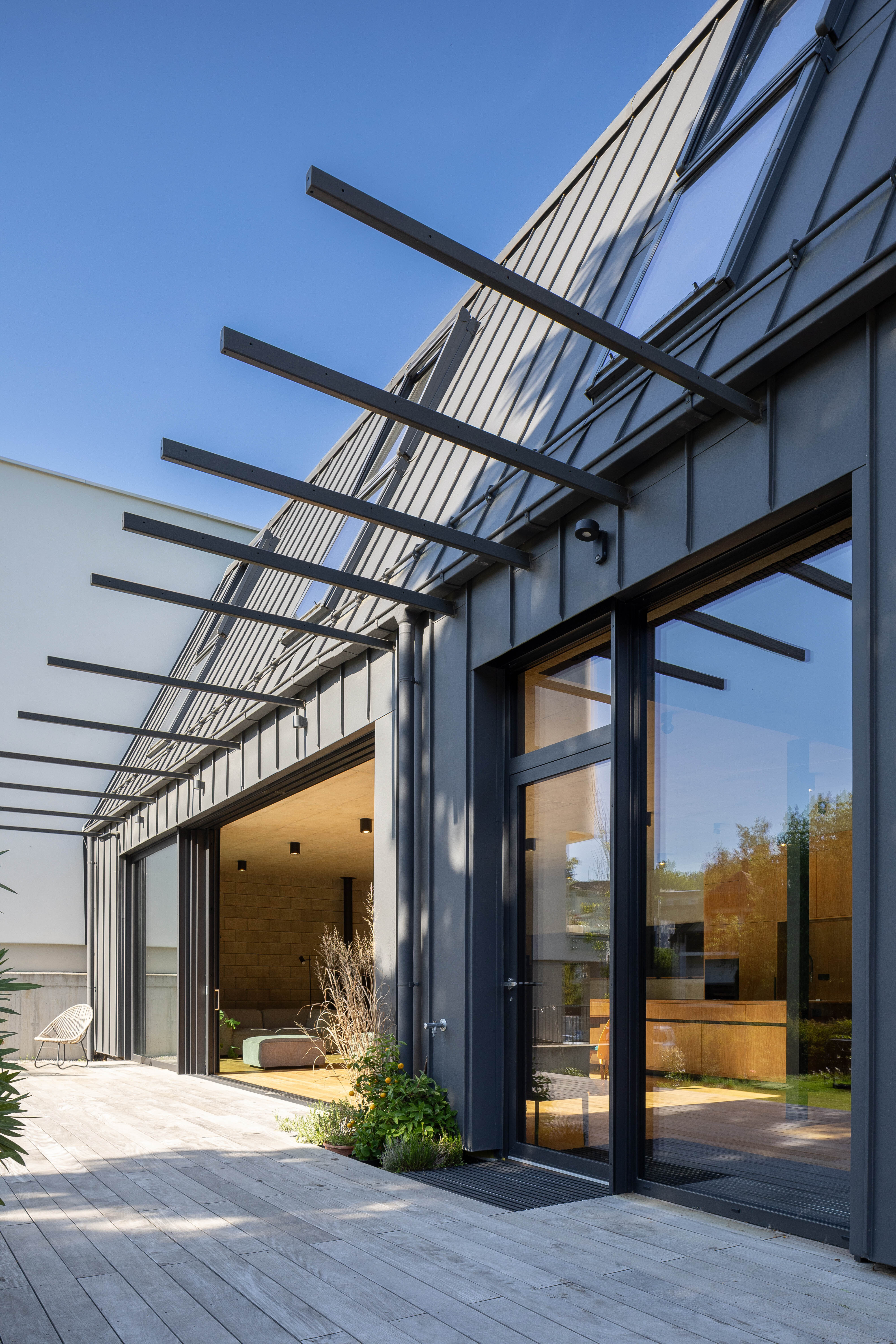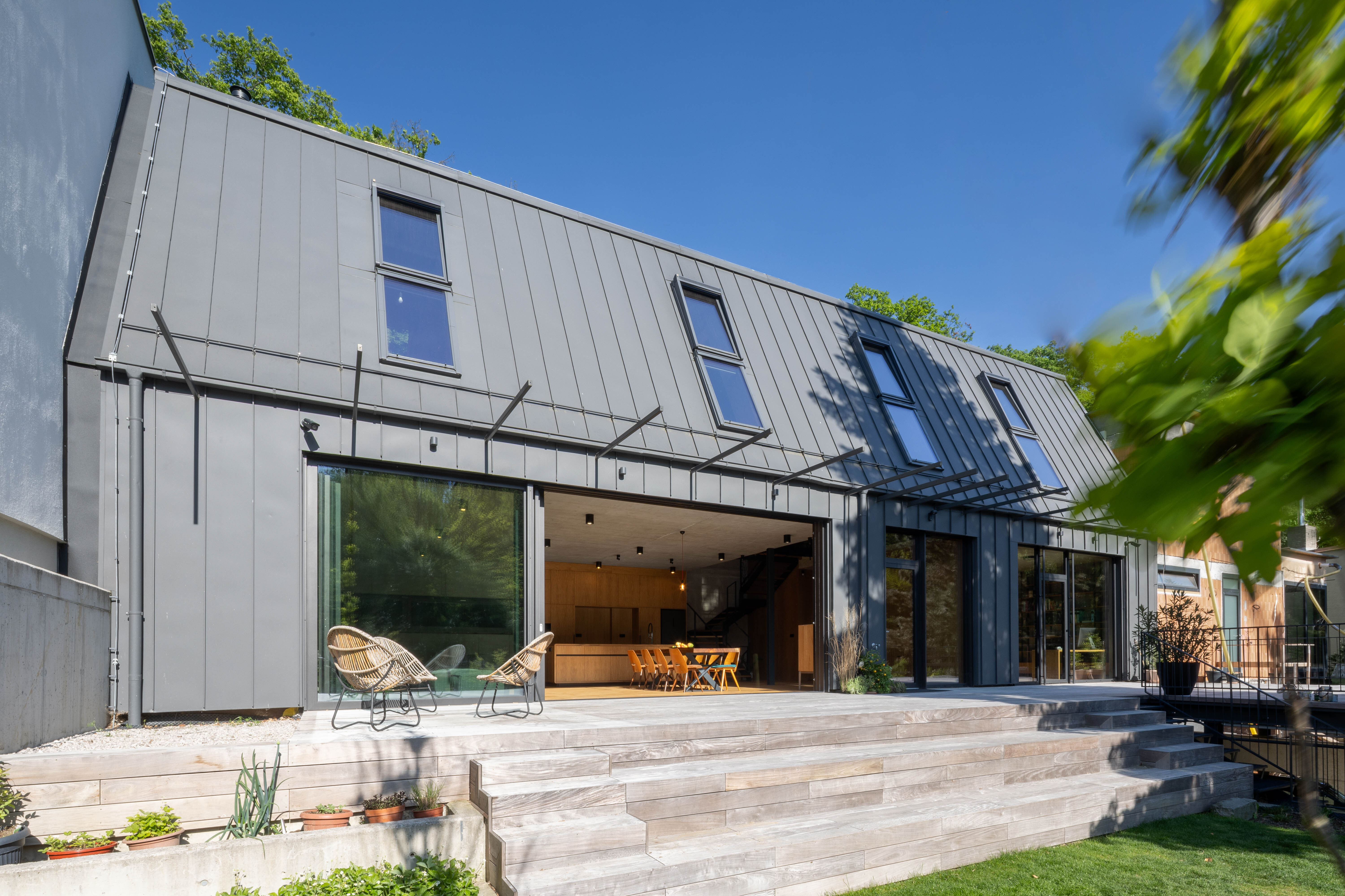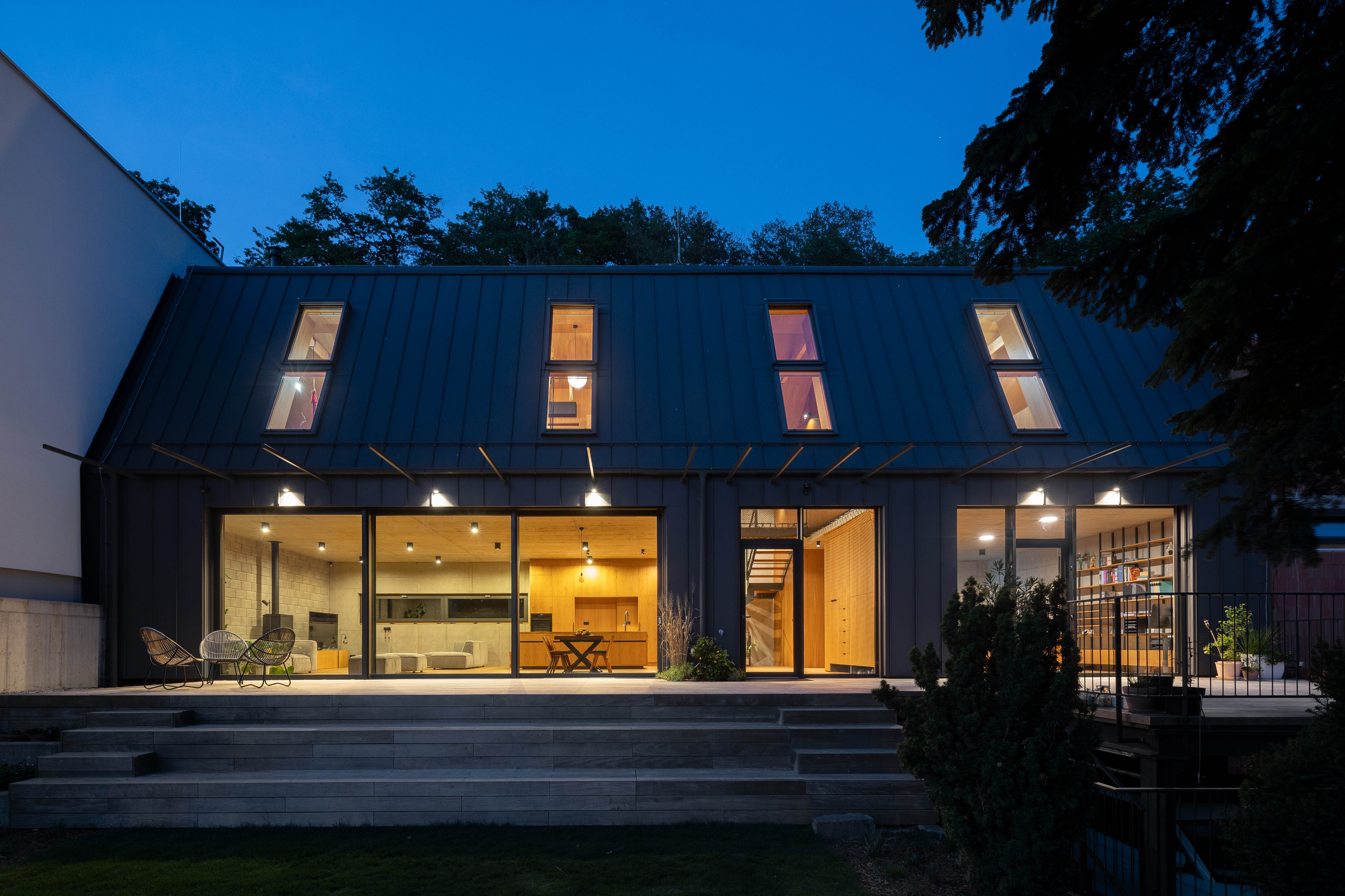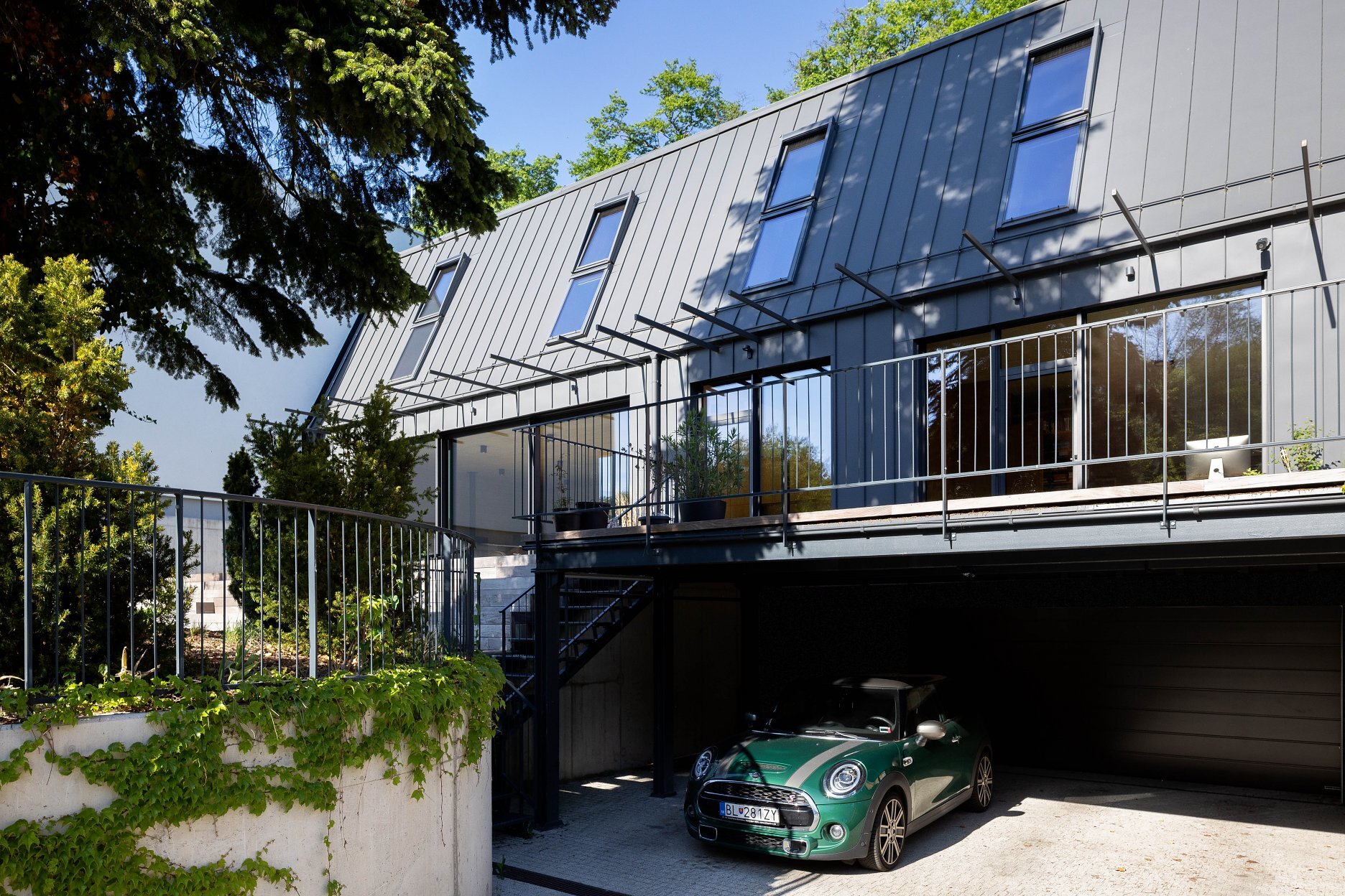 Realizácia kolektívu a3um ateliér využíva svahovitý terén pozemku na rozhraní mesta a zelene, pričom otvára bývanie k výhľadom do záhrady. Autori do interiéru vnášajú vertikalitu a horné osvetlenie prostredníctvom voľnej galérie nad vstupným priestorom. Kompaktný obvodový plášť, zjednotený sivým falcovaným plechom ukrýva vnútorný svet so surovými materiálmi a technickými detailmi.