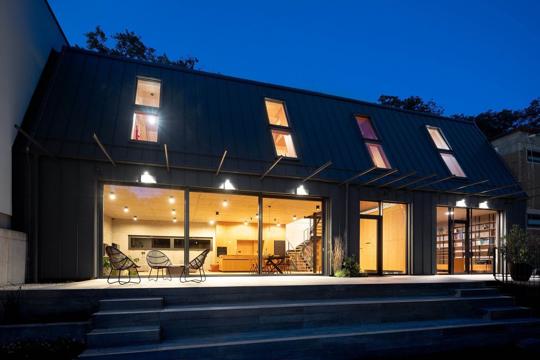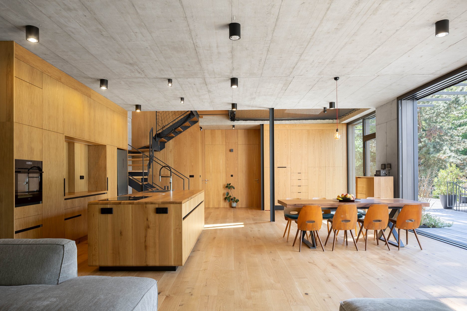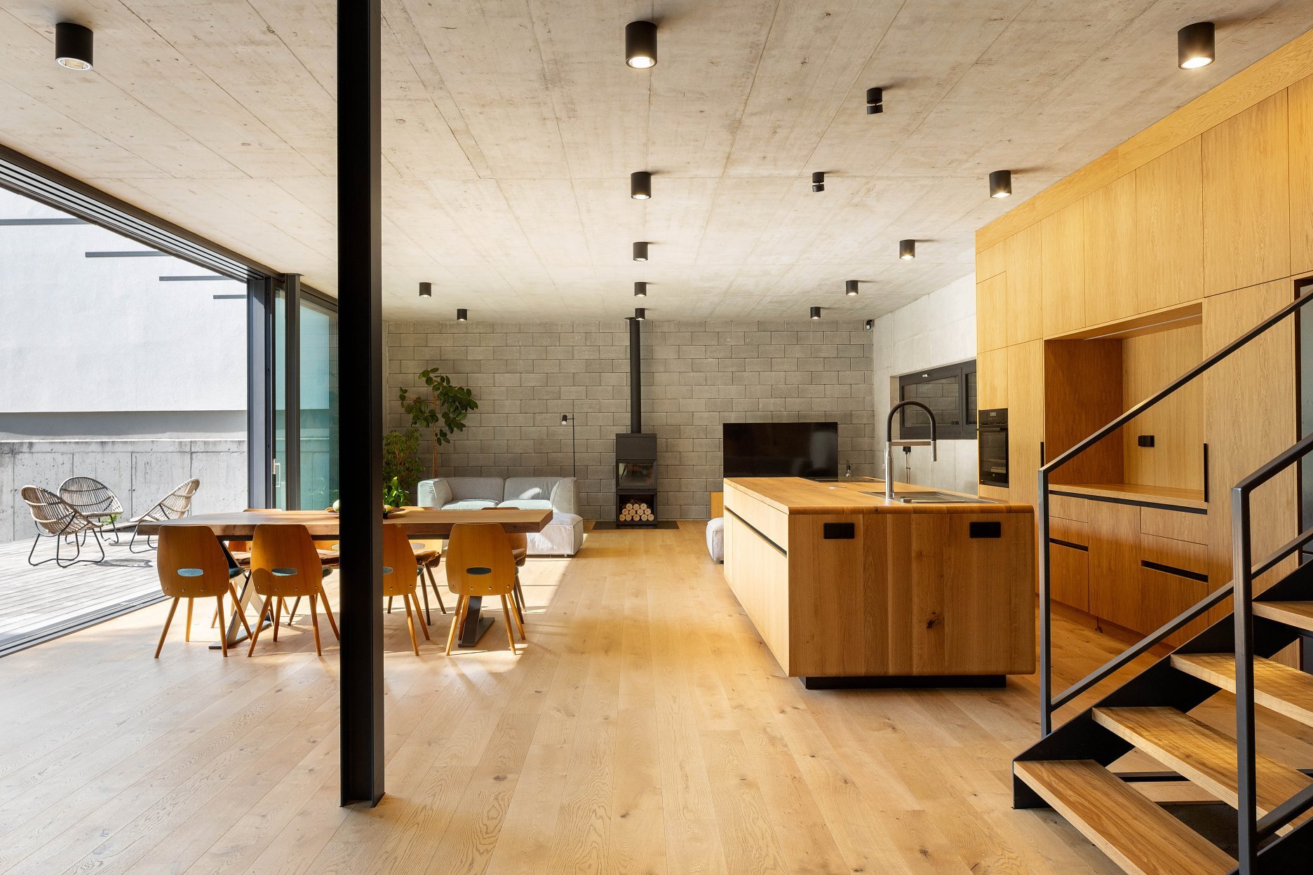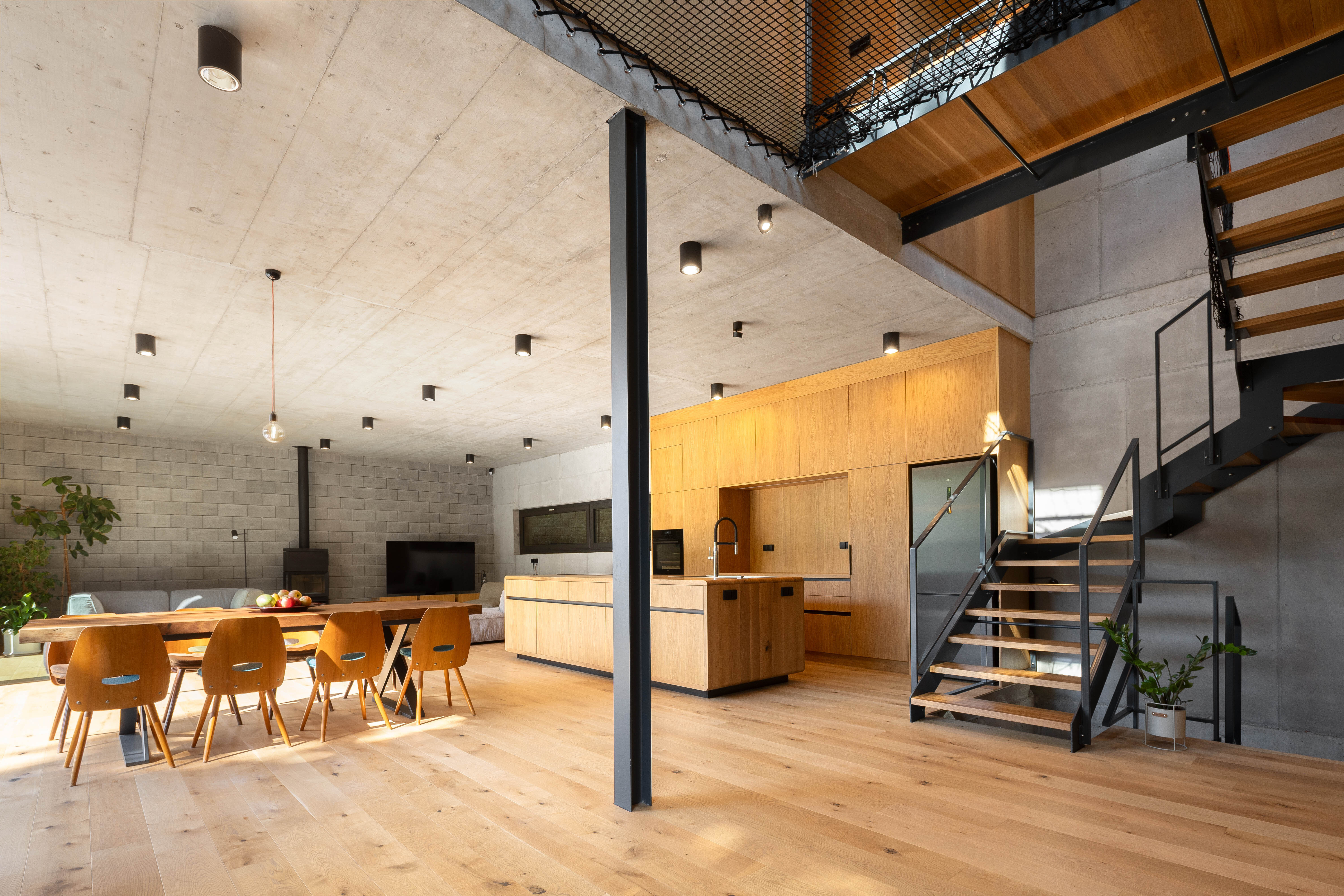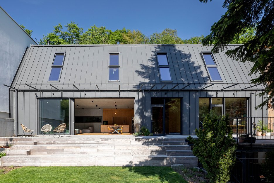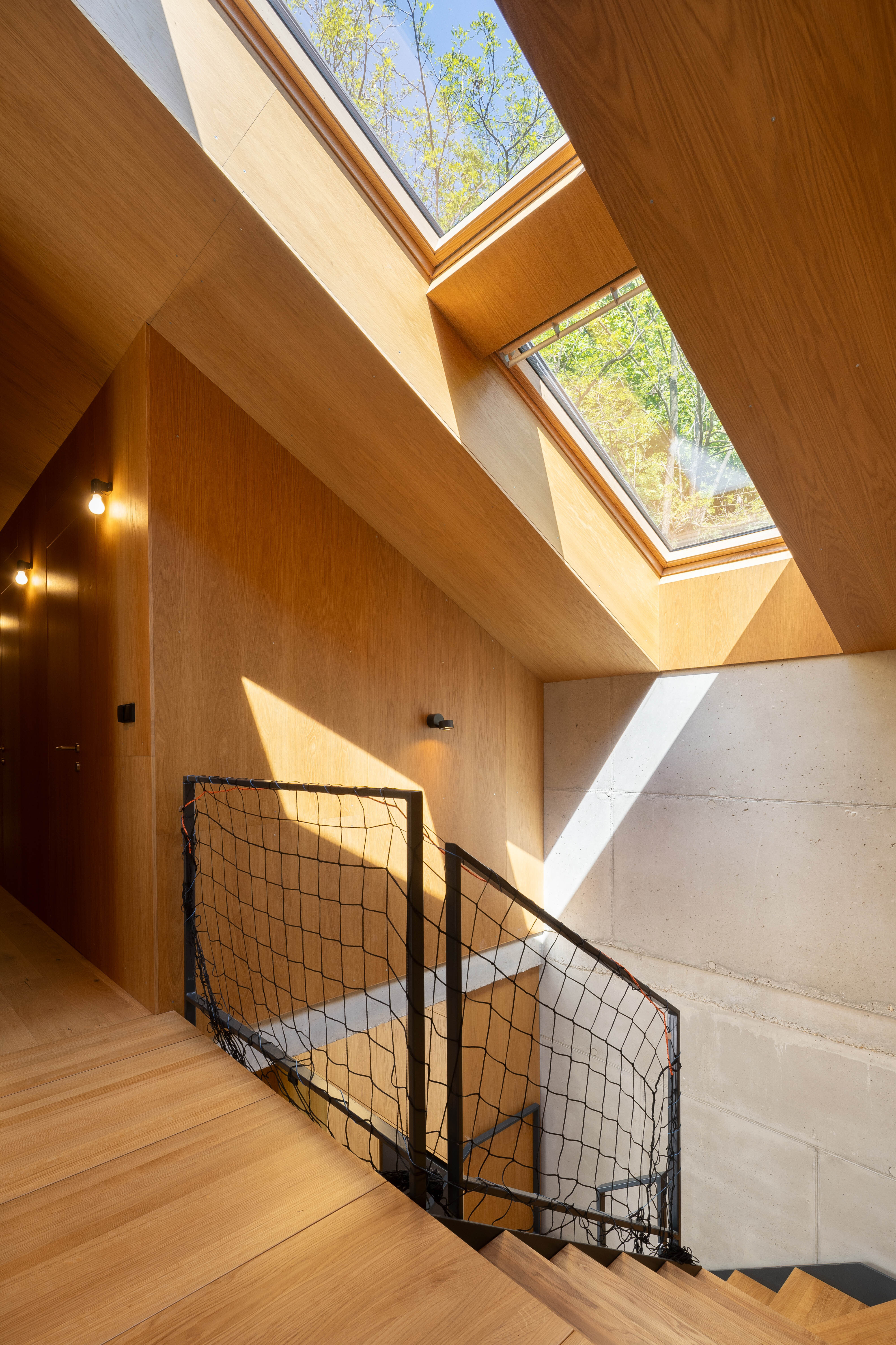 Realizácia kolektívu a3um ateliér využíva svahovitý terén pozemku na rozhraní mesta a zelene, pričom otvára bývanie k výhľadom do záhrady. Autori do interiéru vnášajú vertikalitu a horné osvetlenie prostredníctvom voľnej galérie nad vstupným priestorom. Kompaktný obvodový plášť, zjednotený sivým falcovaným plechom ukrýva vnútorný svet so surovými materiálmi a technickými detailmi.