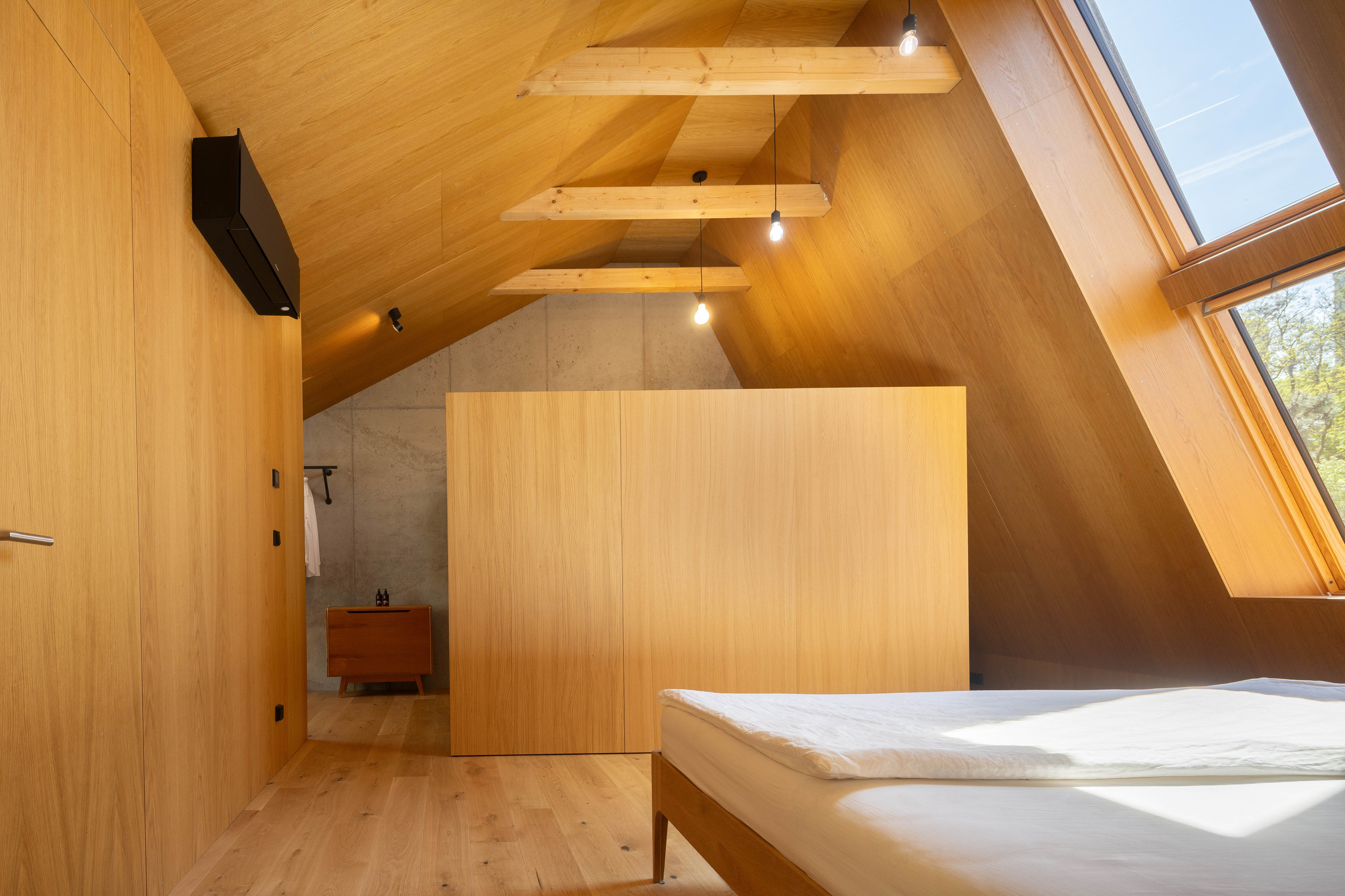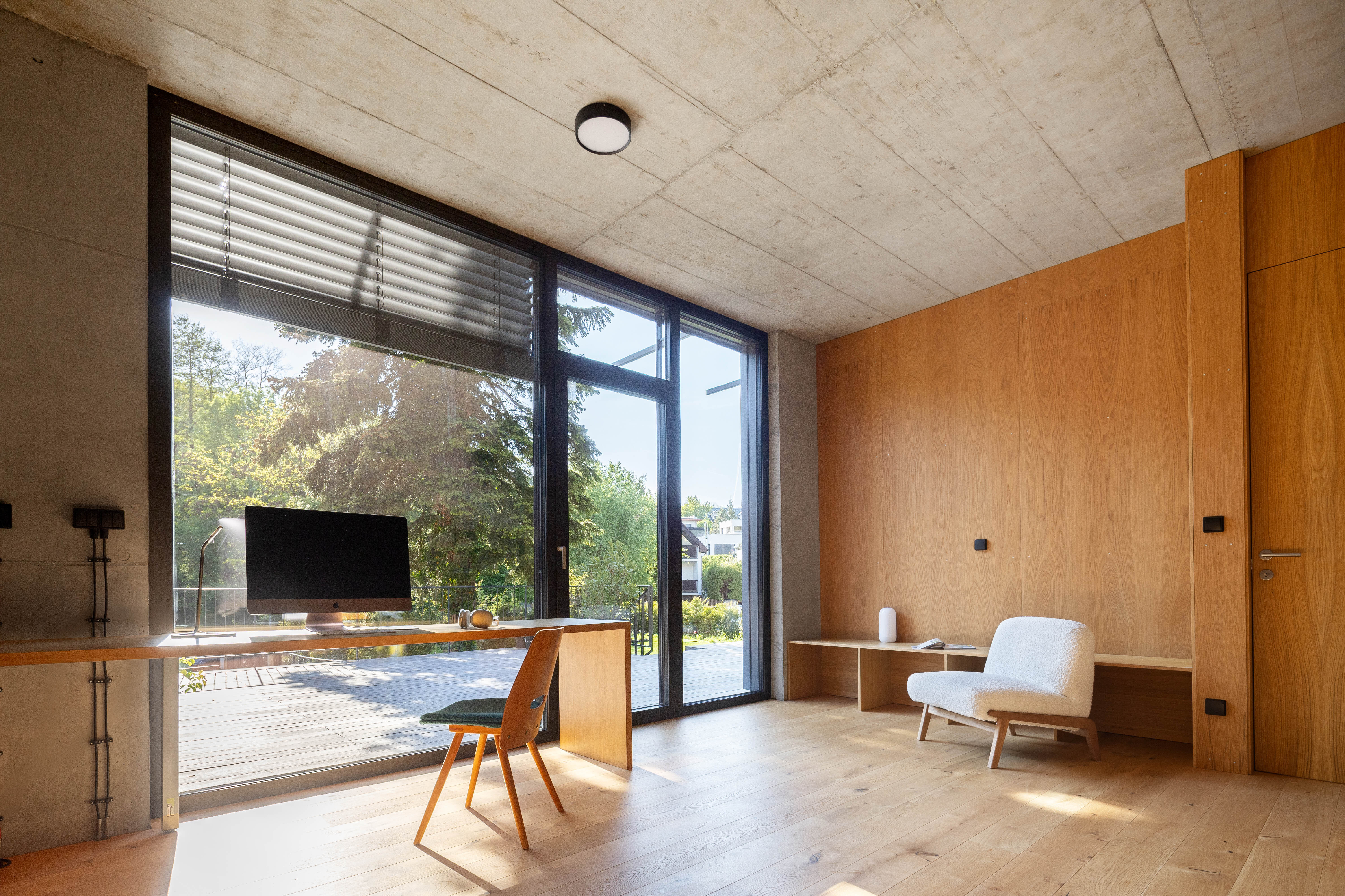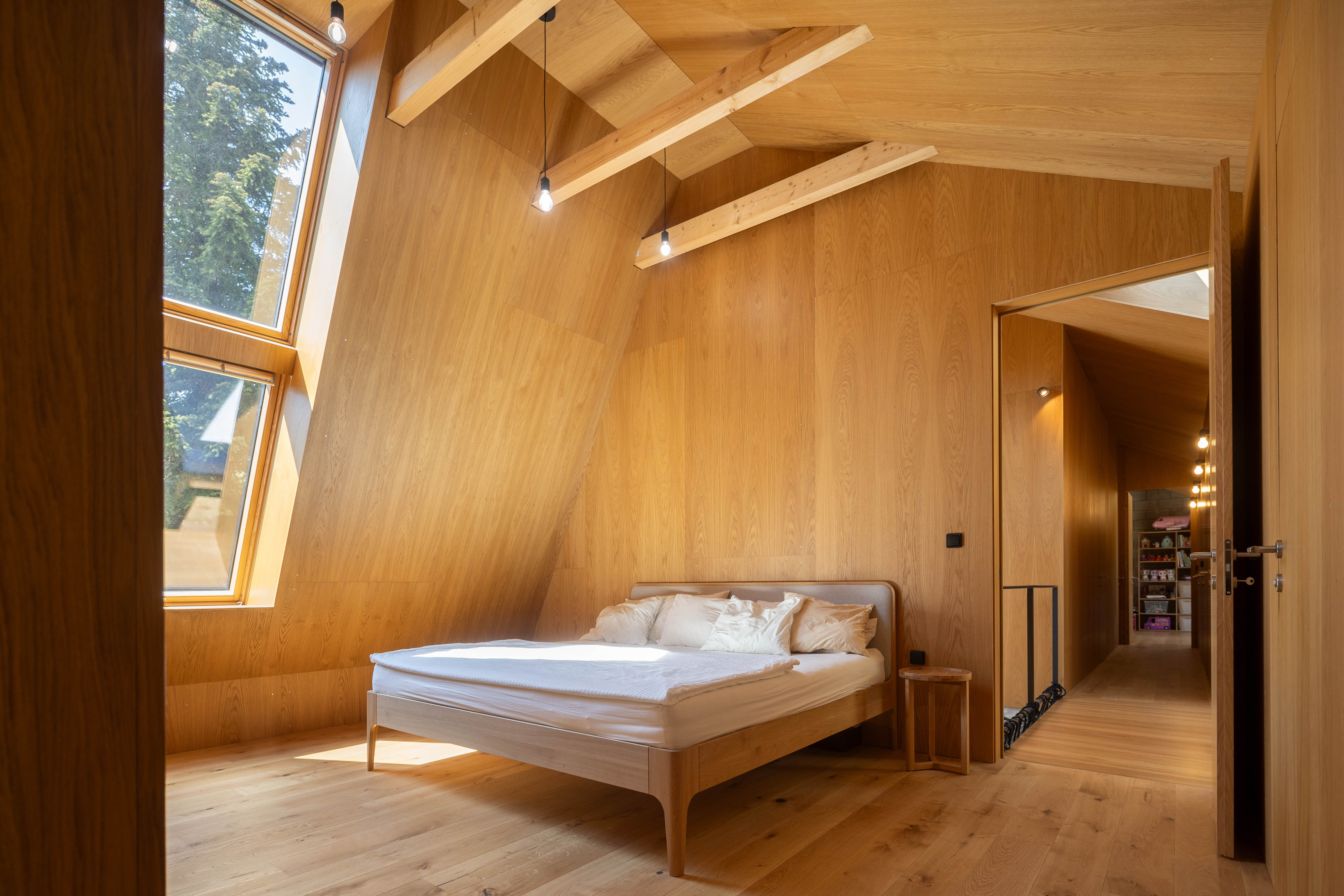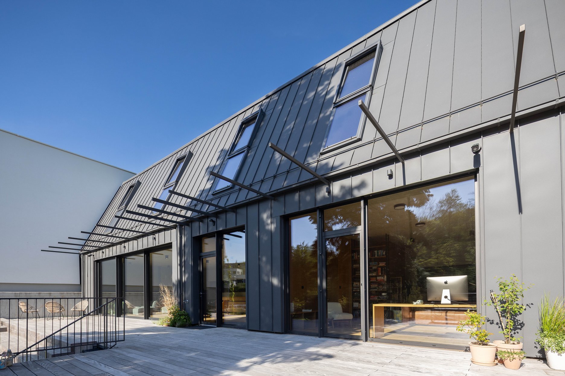 Realizácia kolektívu a3um ateliér využíva svahovitý terén pozemku na rozhraní mesta a zelene, pričom otvára bývanie k výhľadom do záhrady. Autori do interiéru vnášajú vertikalitu a horné osvetlenie prostredníctvom voľnej galérie nad vstupným priestorom. Kompaktný obvodový plášť, zjednotený sivým falcovaným plechom ukrýva vnútorný svet so surovými materiálmi a technickými detailmi.