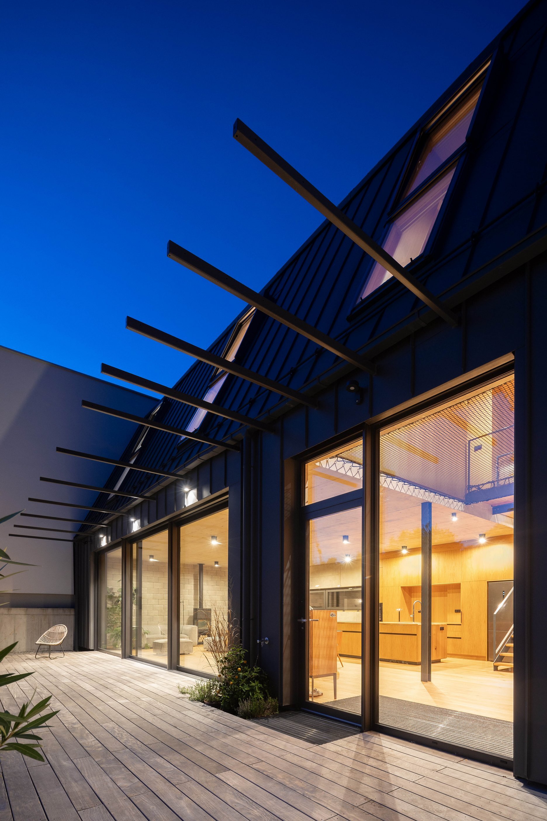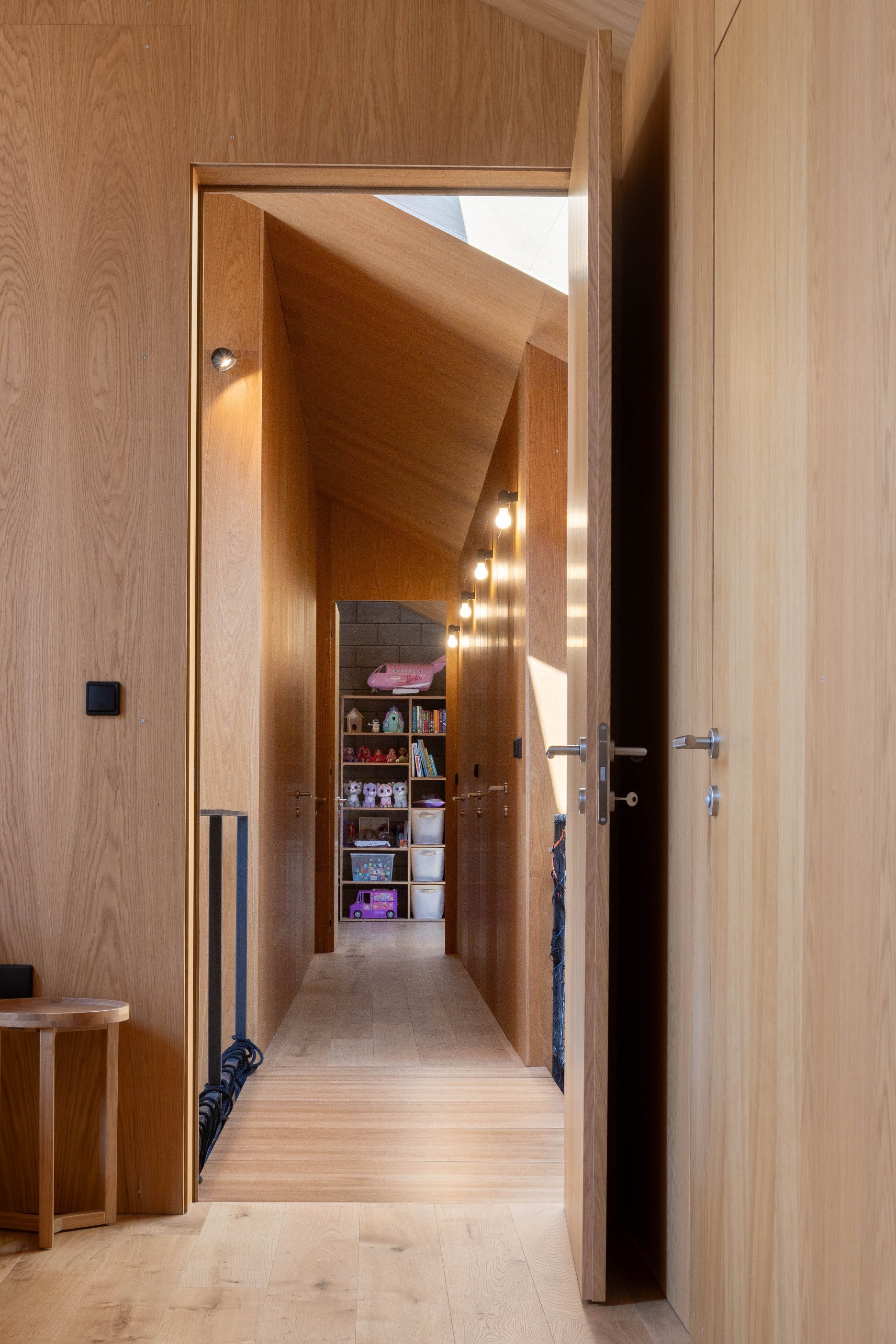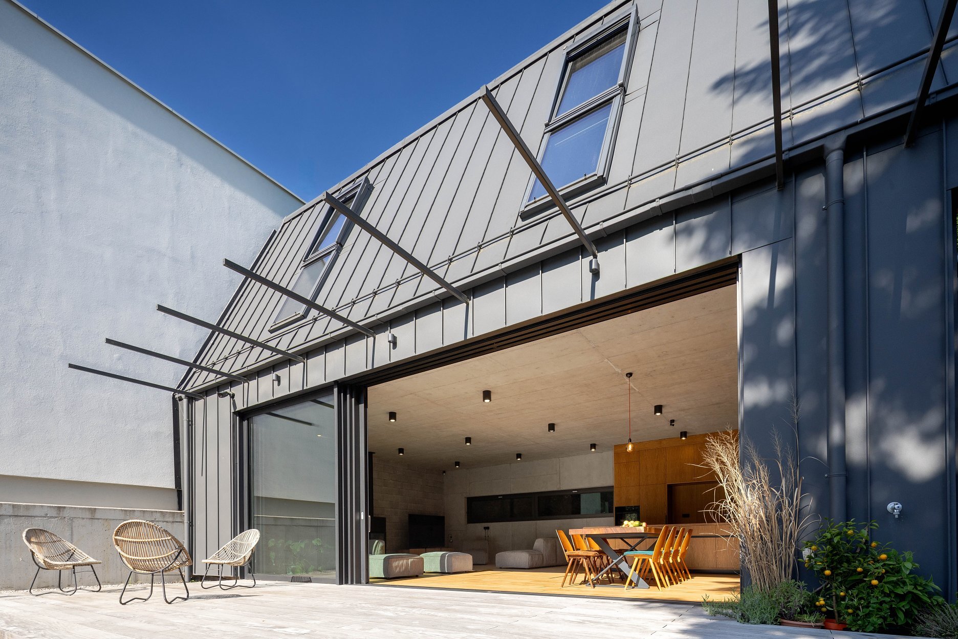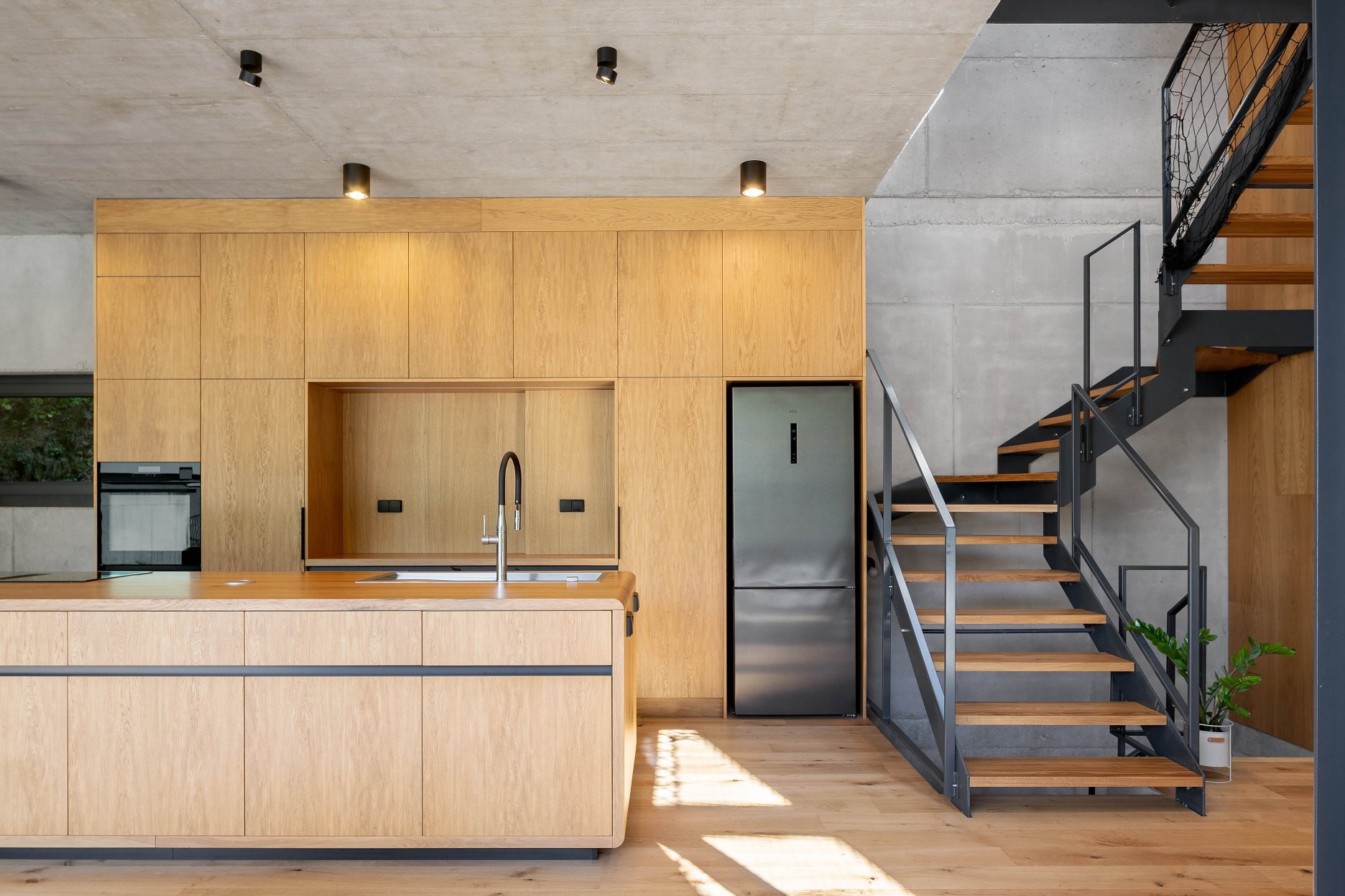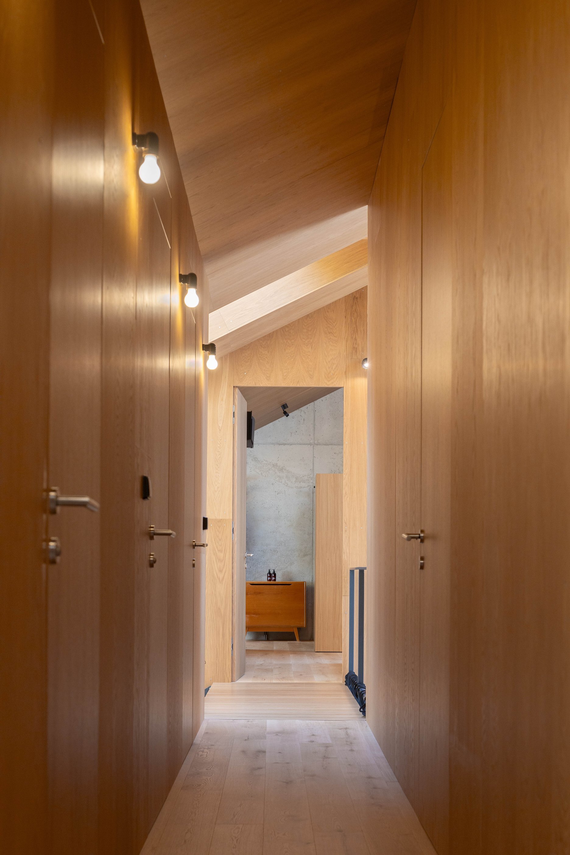 Realizácia kolektívu a3um ateliér využíva svahovitý terén pozemku na rozhraní mesta a zelene, pričom otvára bývanie k výhľadom do záhrady. Autori do interiéru vnášajú vertikalitu a horné osvetlenie prostredníctvom voľnej galérie nad vstupným priestorom. Kompaktný obvodový plášť, zjednotený sivým falcovaným plechom ukrýva vnútorný svet so surovými materiálmi a technickými detailmi.