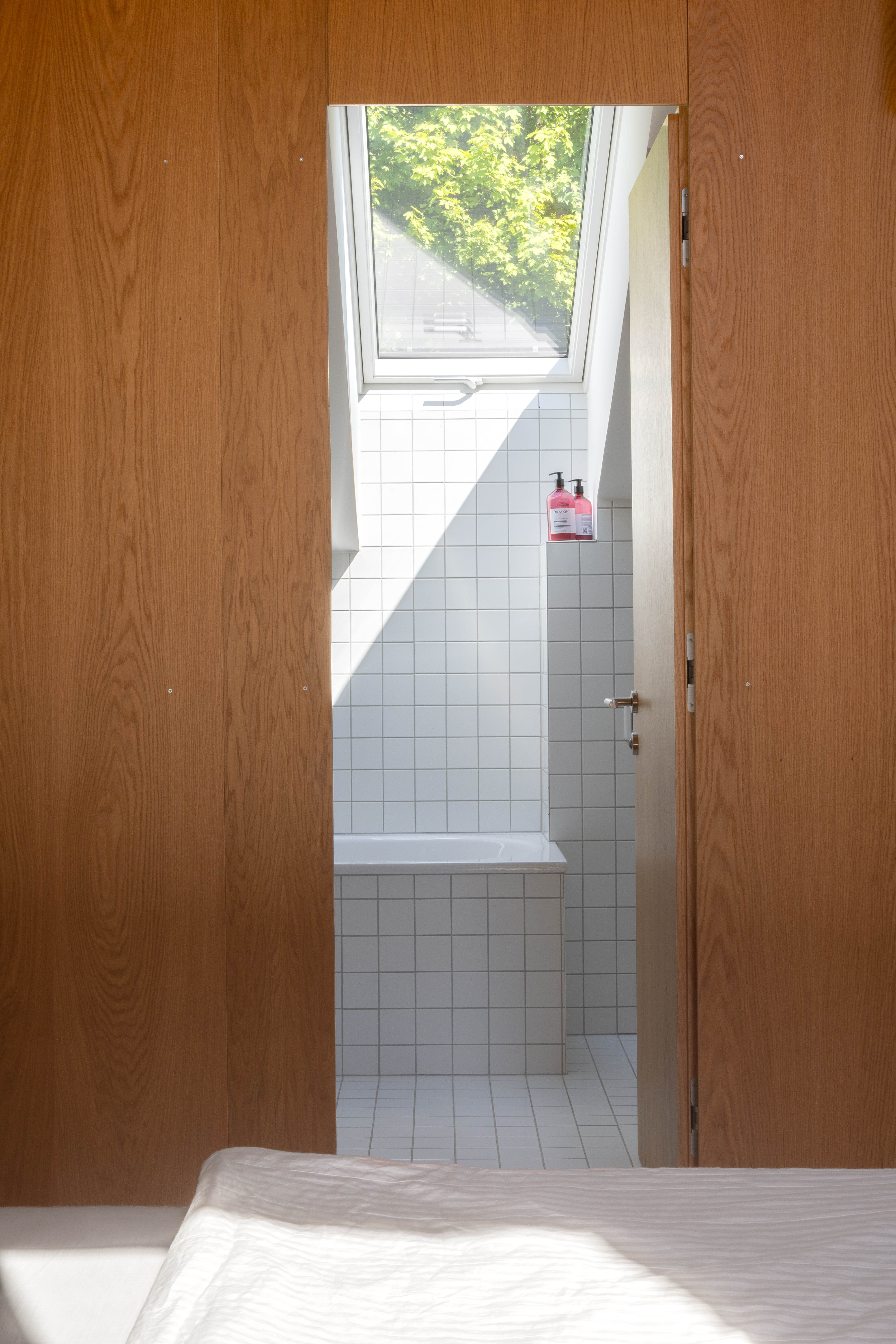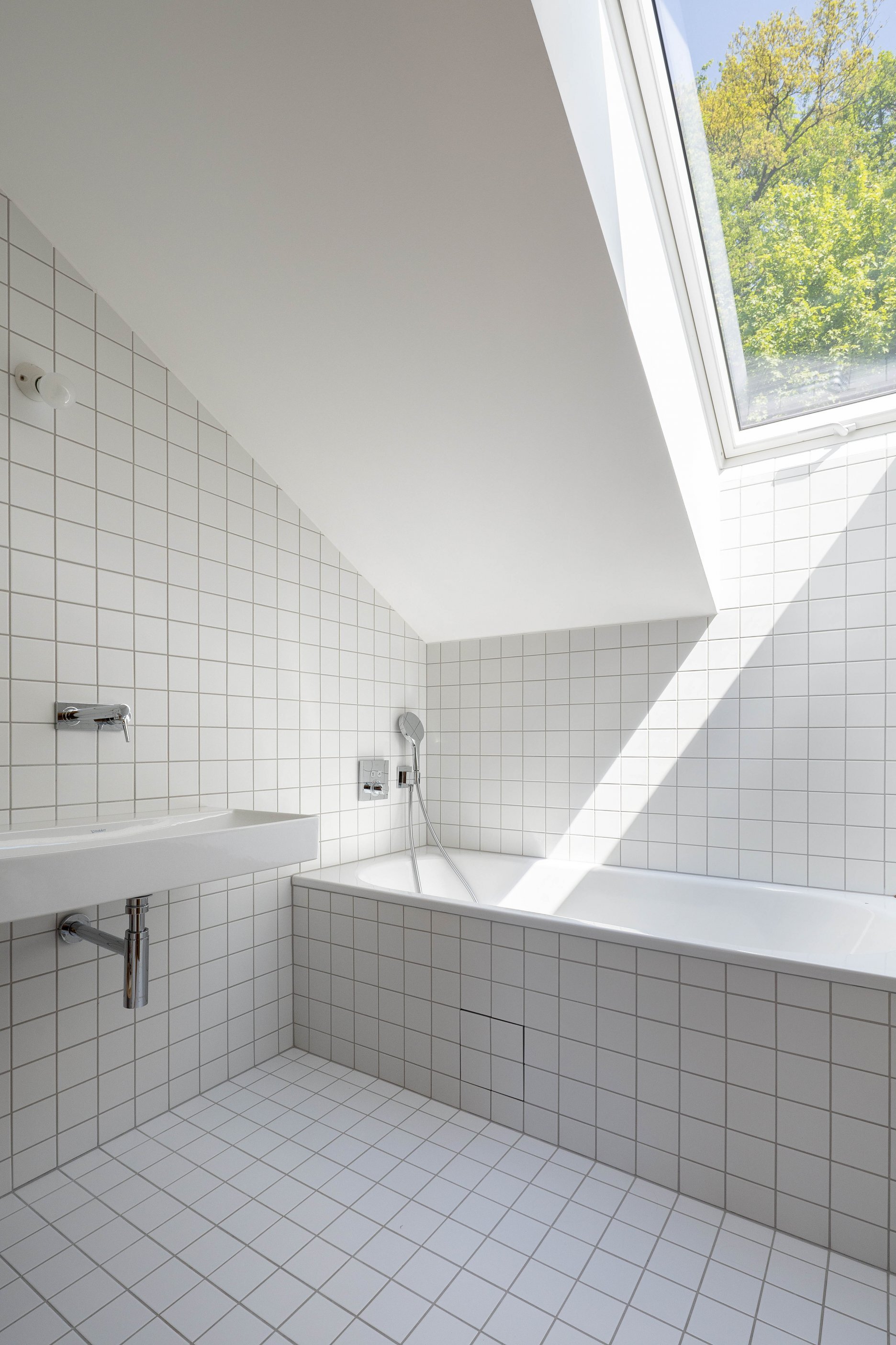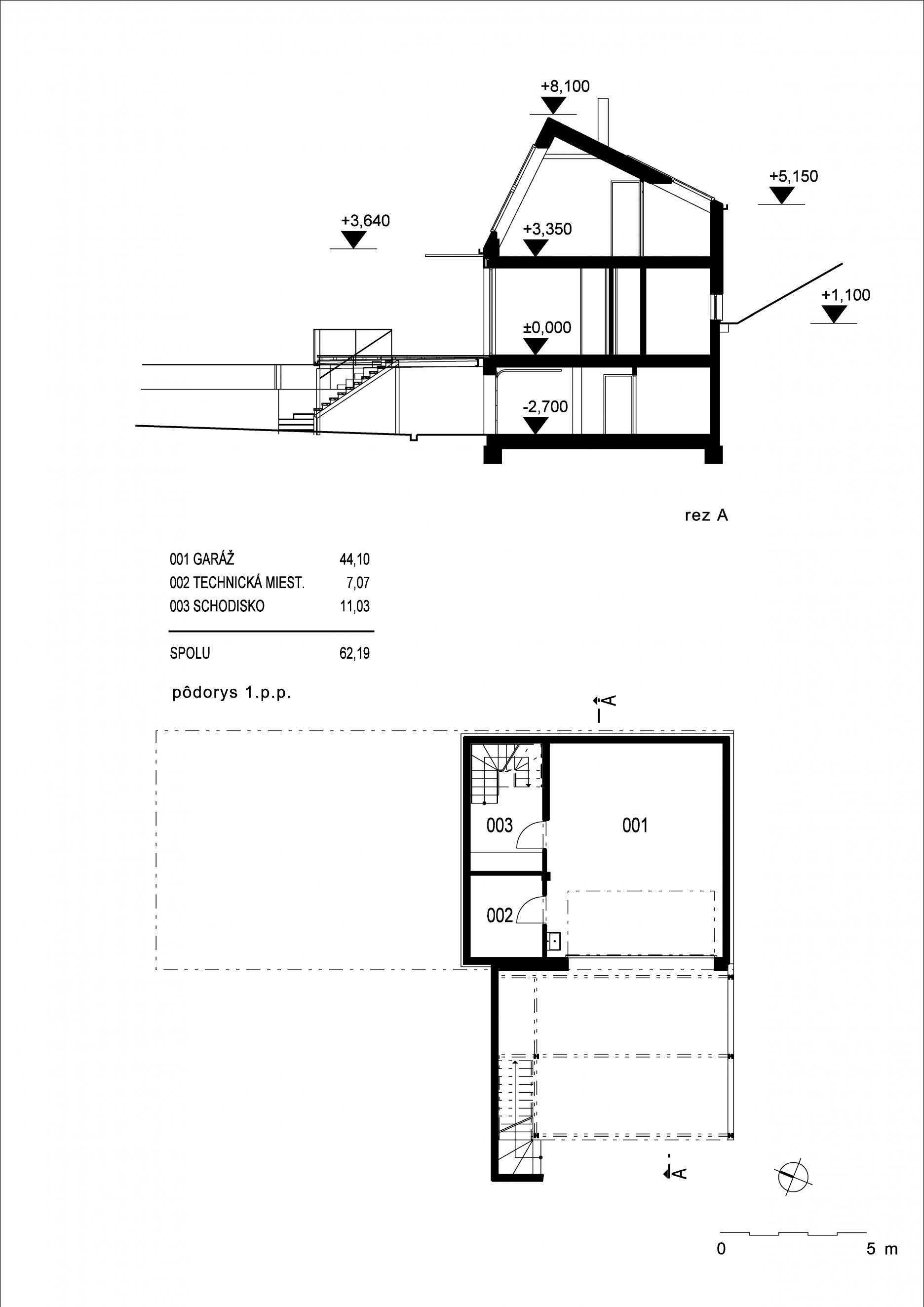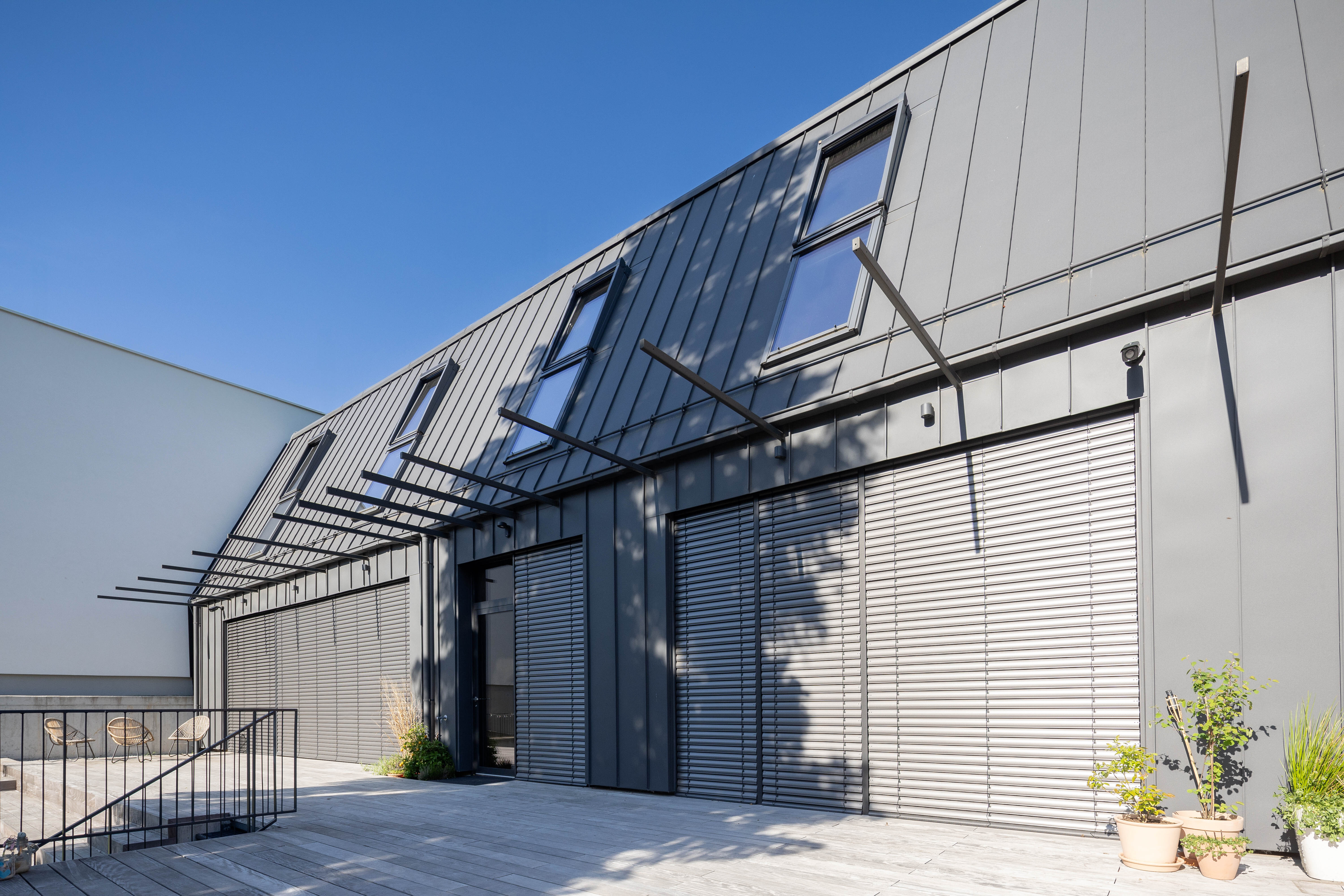 Realizácia kolektívu a3um ateliér využíva svahovitý terén pozemku na rozhraní mesta a zelene, pričom otvára bývanie k výhľadom do záhrady. Autori do interiéru vnášajú vertikalitu a horné osvetlenie prostredníctvom voľnej galérie nad vstupným priestorom. Kompaktný obvodový plášť, zjednotený sivým falcovaným plechom ukrýva vnútorný svet so surovými materiálmi a technickými detailmi.