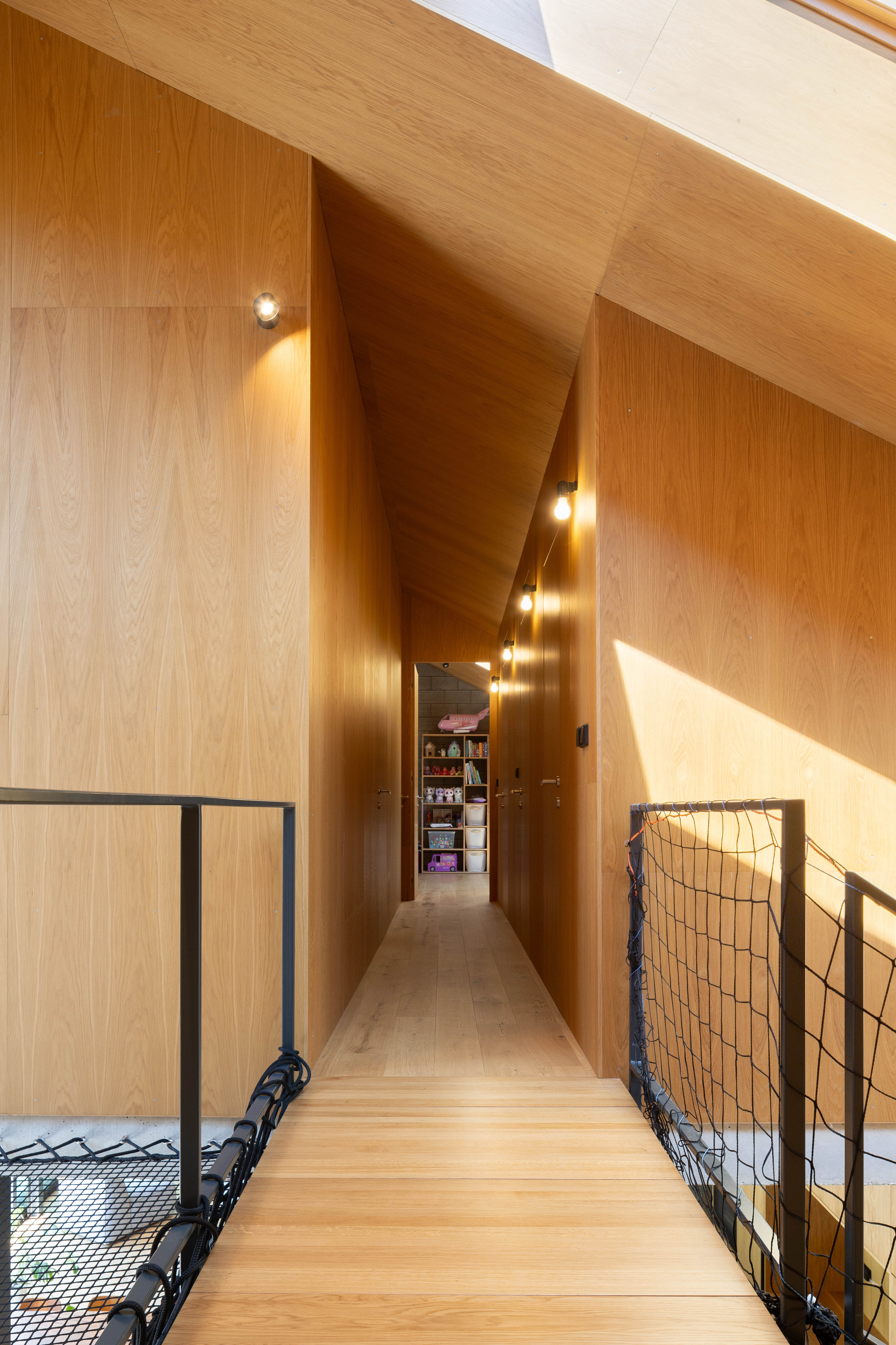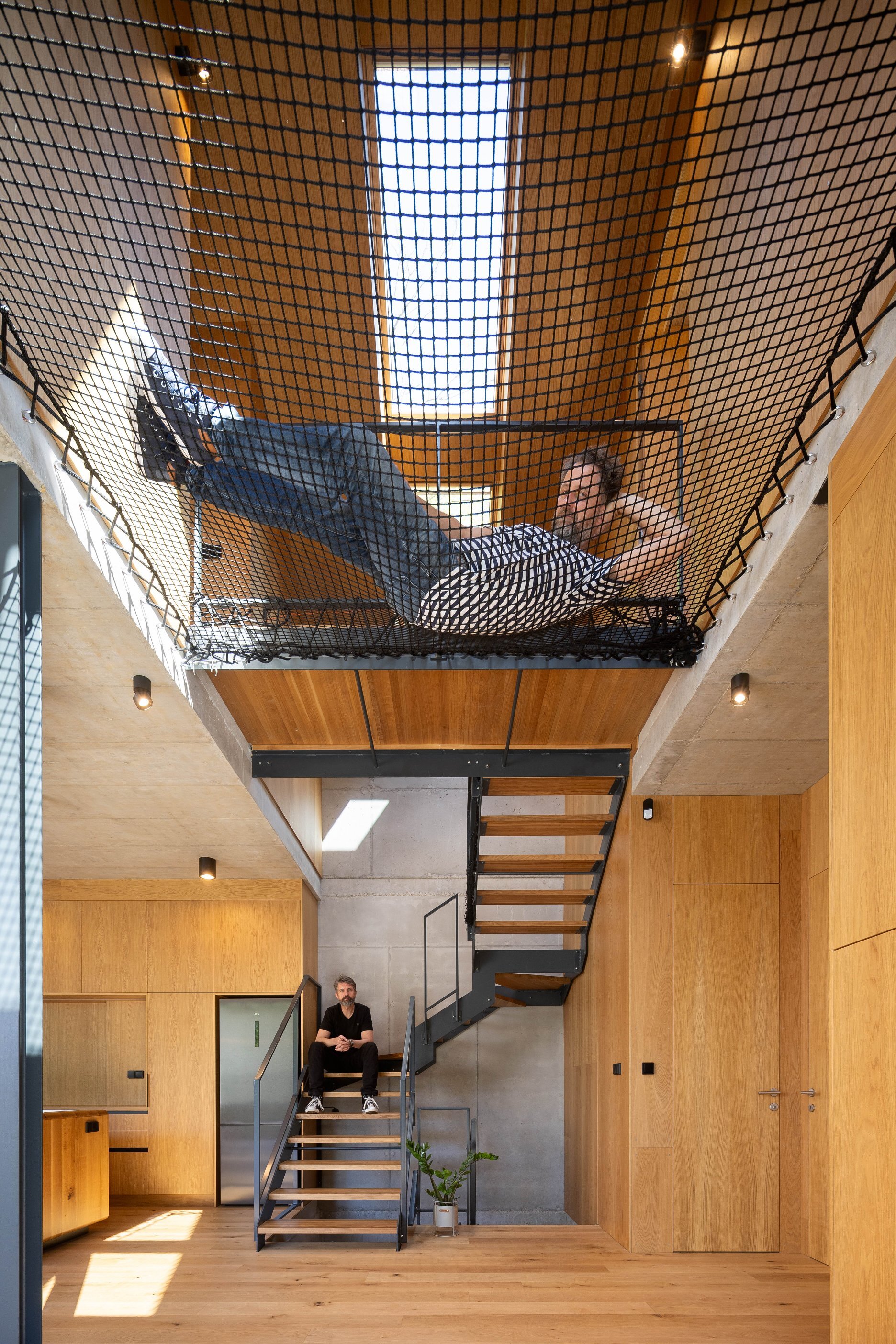 Dom je horizontálne rozdelený do troch funkčných úrovní. V suteréne sa nachádza technická časť a garáž. Denná zóna na prízemi je prepojená s exteriérom presklenými stenami a drevenou terasou, plynúcou naprieč celým pozemkom. Terasa klesá na úroveň záhrady v troch stupňoch, vytvárajúcich priestor na posedenie. Podkrovie – nočnú časť rozdeľuje lávka na priestor pre deti a rodičov. Lávka je zároveň "skokanským mostíkom" do siete napnutej nad voľným vstupným priestorom.