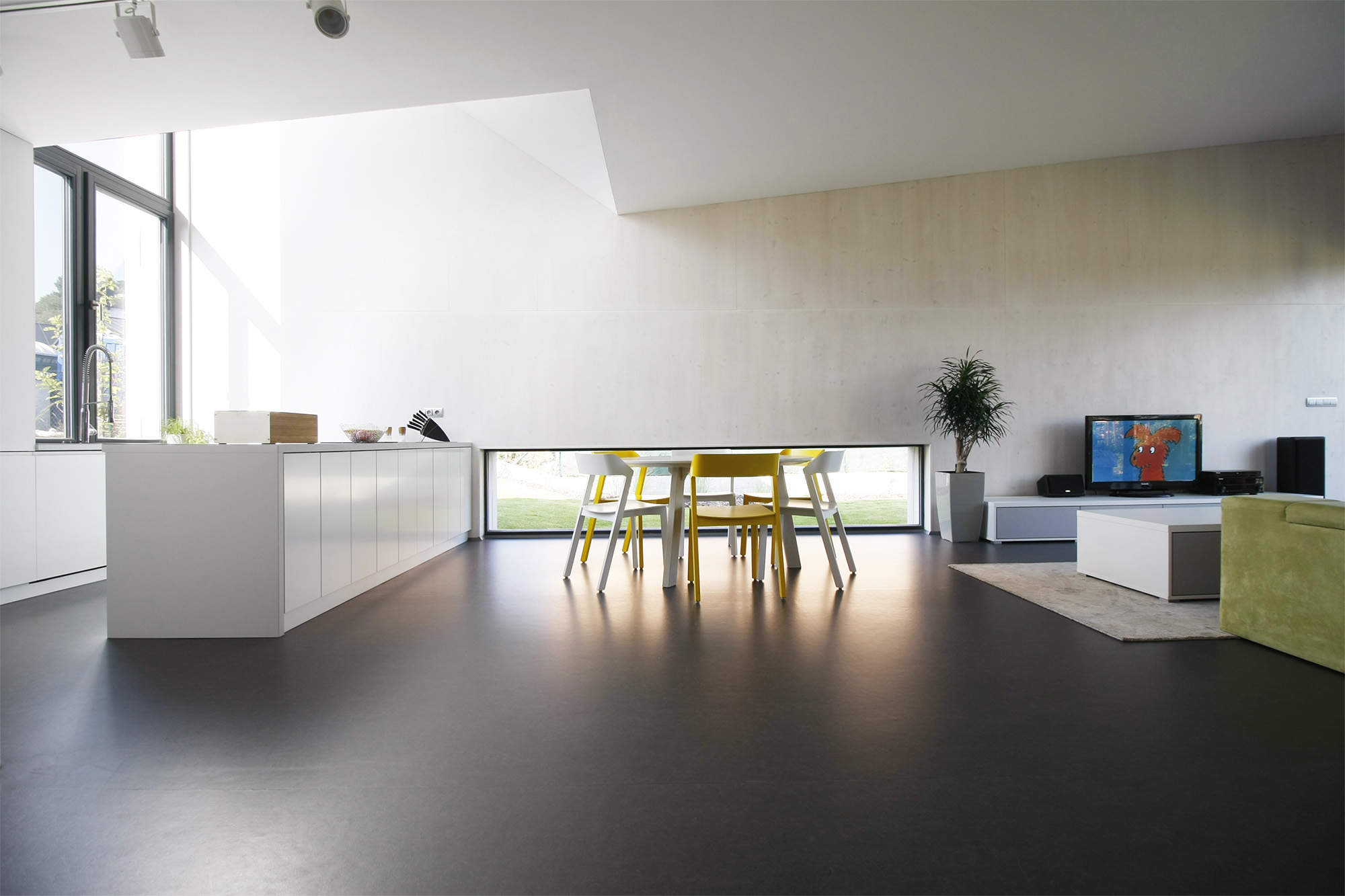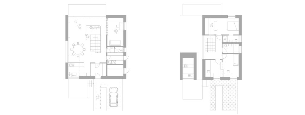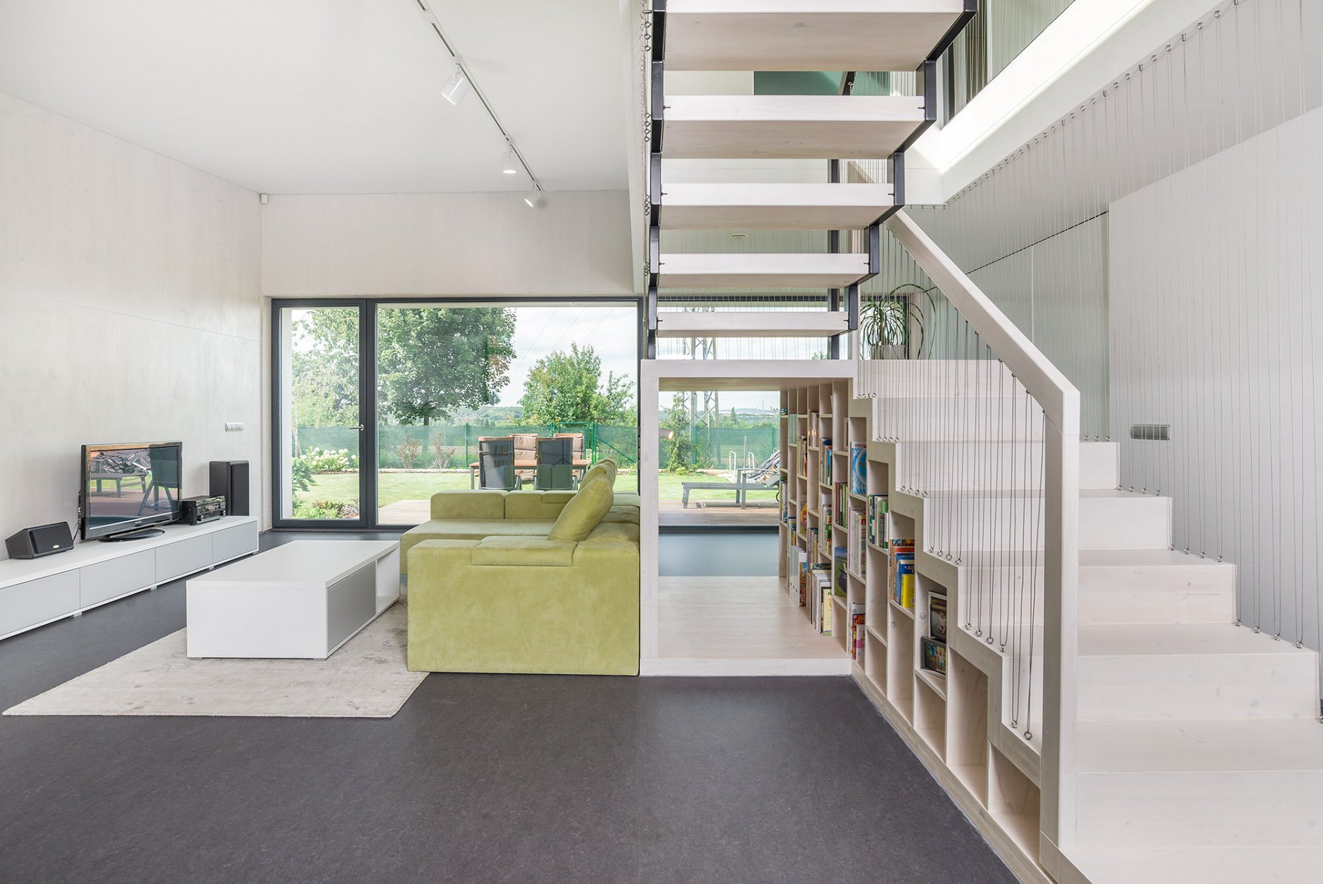Prízemie domu je koncipované ako voľne plynúci obytný priestor. Jeho vnímaniu napomáha veľkoformátové presklenie a nosná konštrukcia z CLT panelov. Tá umožnila uvoľniť dispozíciu od ďalších podporných konštrukcií v interiéri. Technické zázemie je situované do malého priestoru situovaného pozdĺž východnej steny.