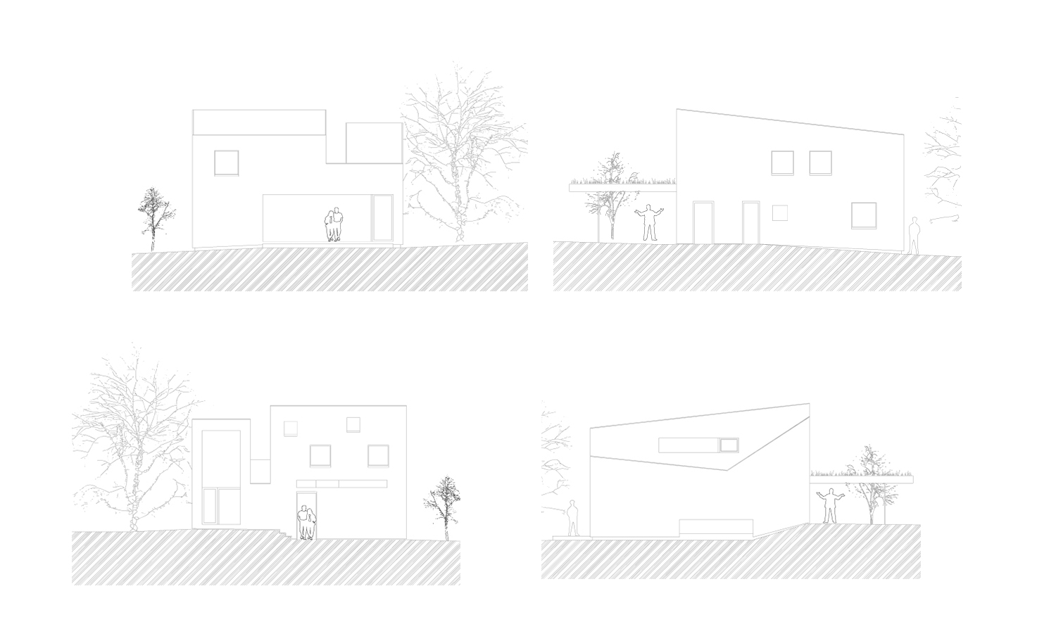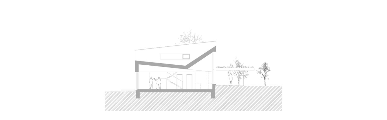 Dom je vzhľadom na prísne regulatívy v území situovaný do ťažiska pozemku, člení ho na dva menšie priestory s rôznou atmosférou a využitím. Smerom do ulice sa otvára južná časť domu s terasou - pozorovateľňou na ploche spevnenej zatrávňovacím roštom. Intímnejšia časť záhrady s tienenou drevenou terasou je orientovaná na sever.