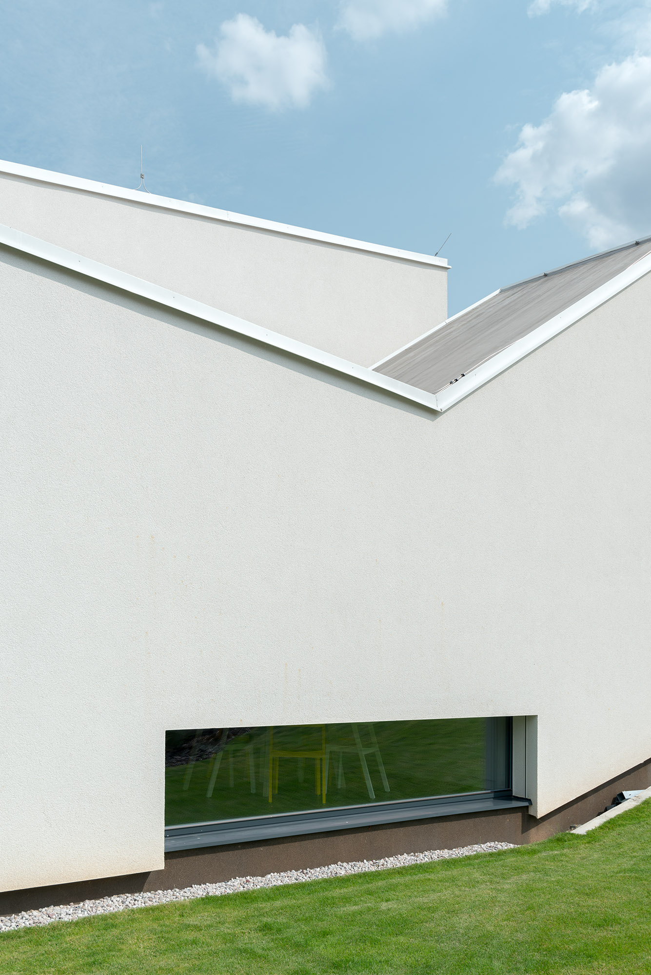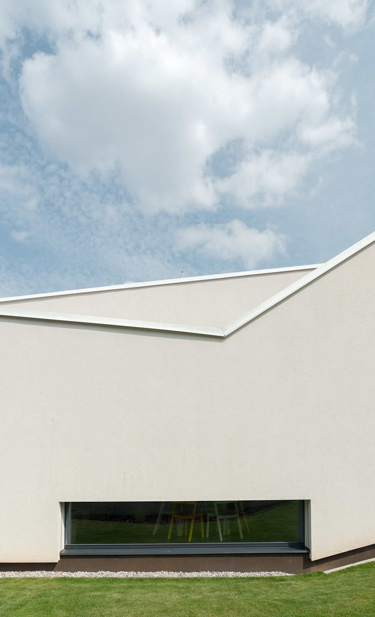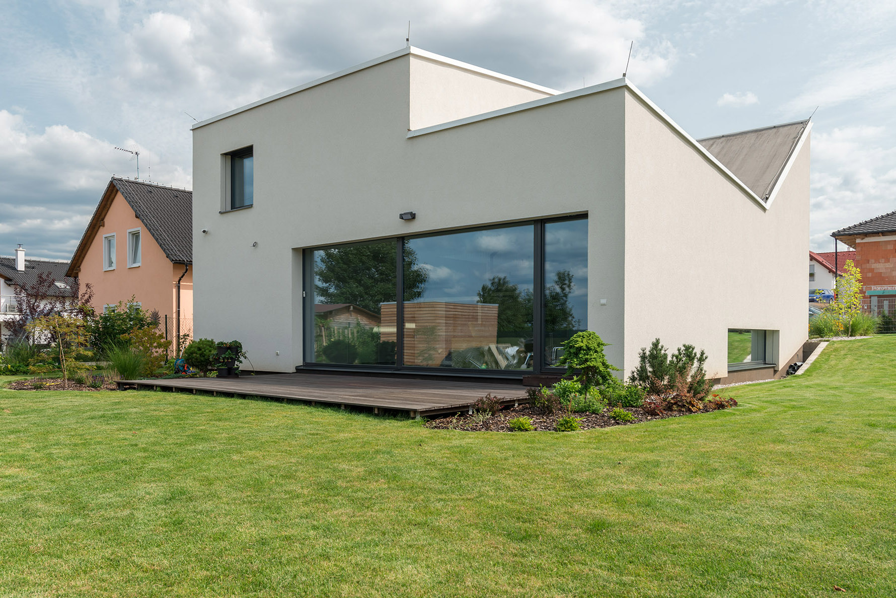 Dynamická strešná krajina “rozbíja” jednoduchý pôdorysný tvar, opticky člení dom na menšie celky.