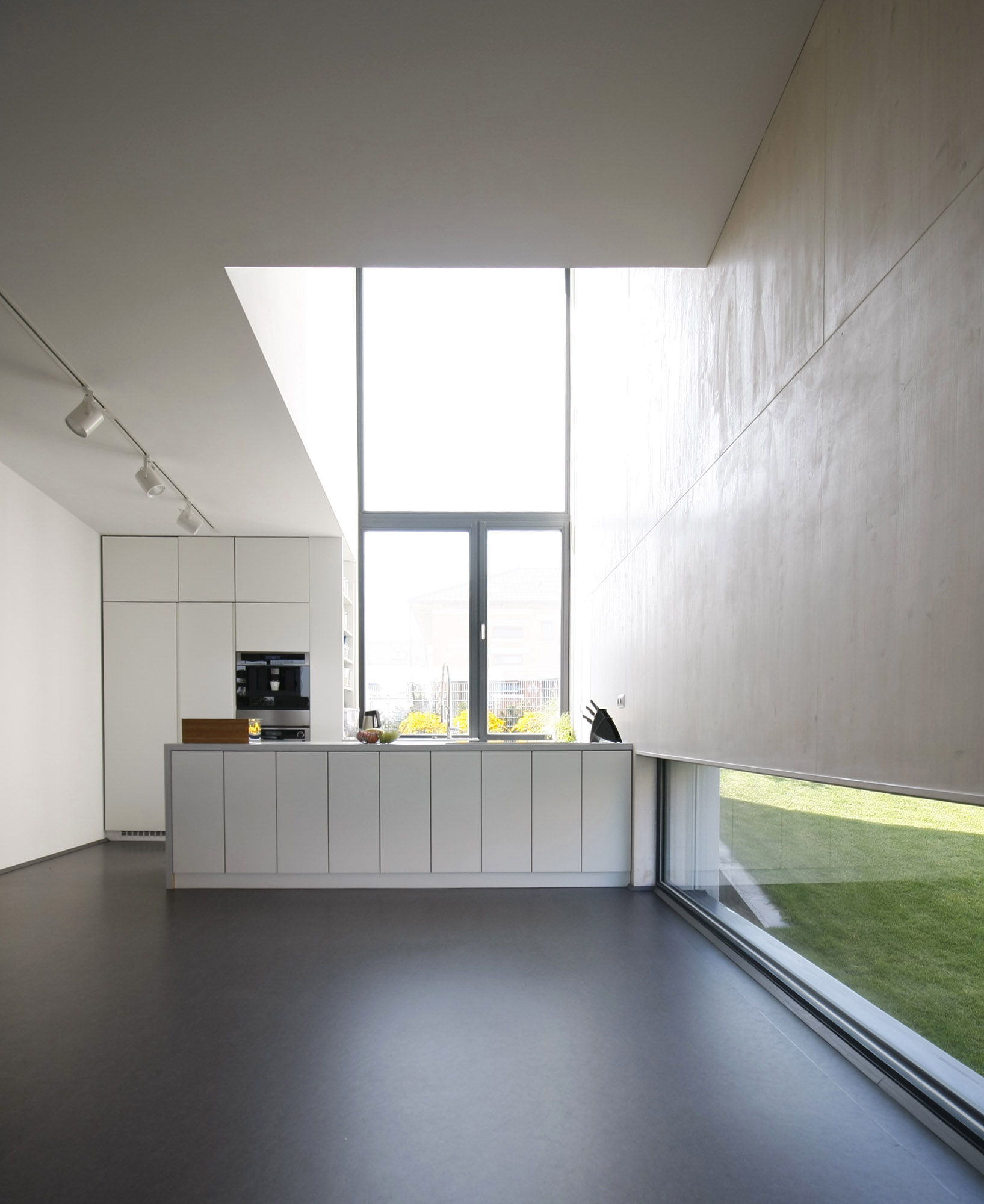 Pri pohľade z ulice si nemožno nevšimnúť vysokú presklenú časť orientovanú na juhozápad. “Sluneční trychtýř' přes velkoformátové jižní okno umožňuje proslunit vnitřní dispozici až na sever do hloubi interieru," vysvetľujú architekti. Prevýšený priestor zabezpečuje priame presvetlenie kuchyne. Zvažujúci sa strop naopak tieni televízny kút situovaný len o kúsok ďalej.