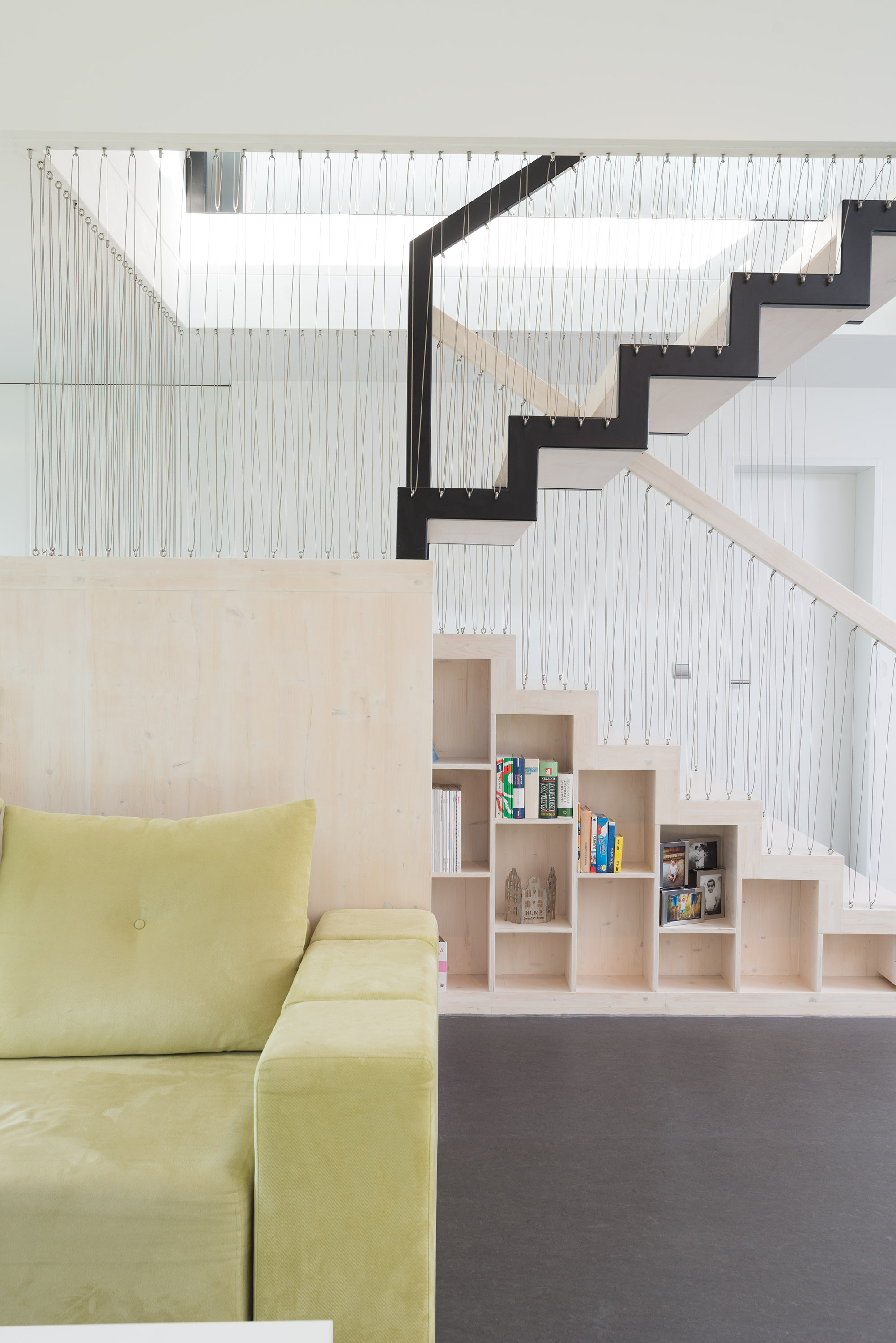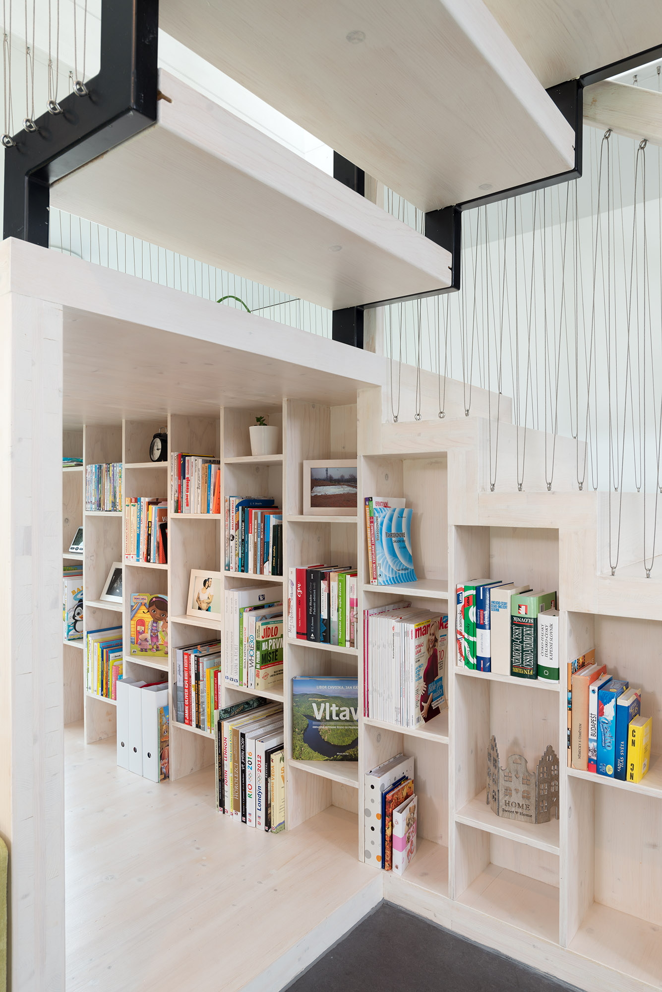 Výrazné tvarovanie sa prejavuje aj v interiéri. Poschodia spája voľne umiestnené schodisko s knižnicou a posedením. Zo schodiskovej haly na poschodí sa vstupuje do detských izieb, kúpeľne a spálne s vlastnou kúpeľňou.