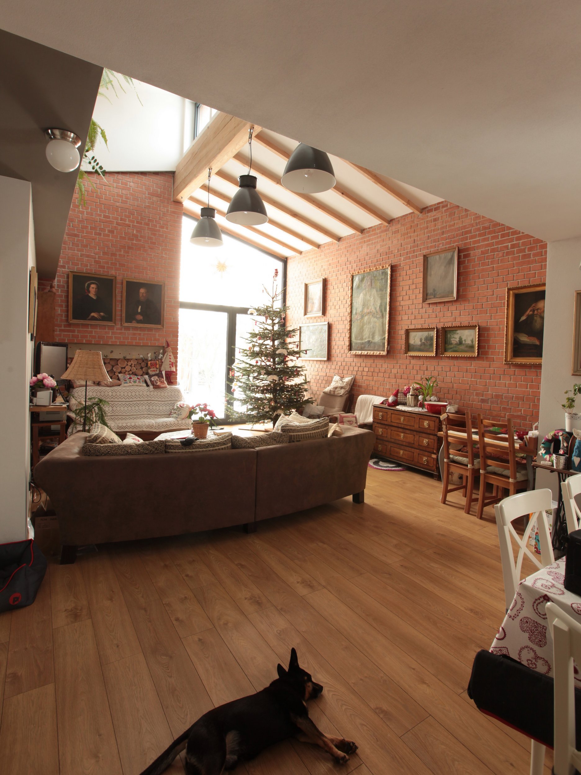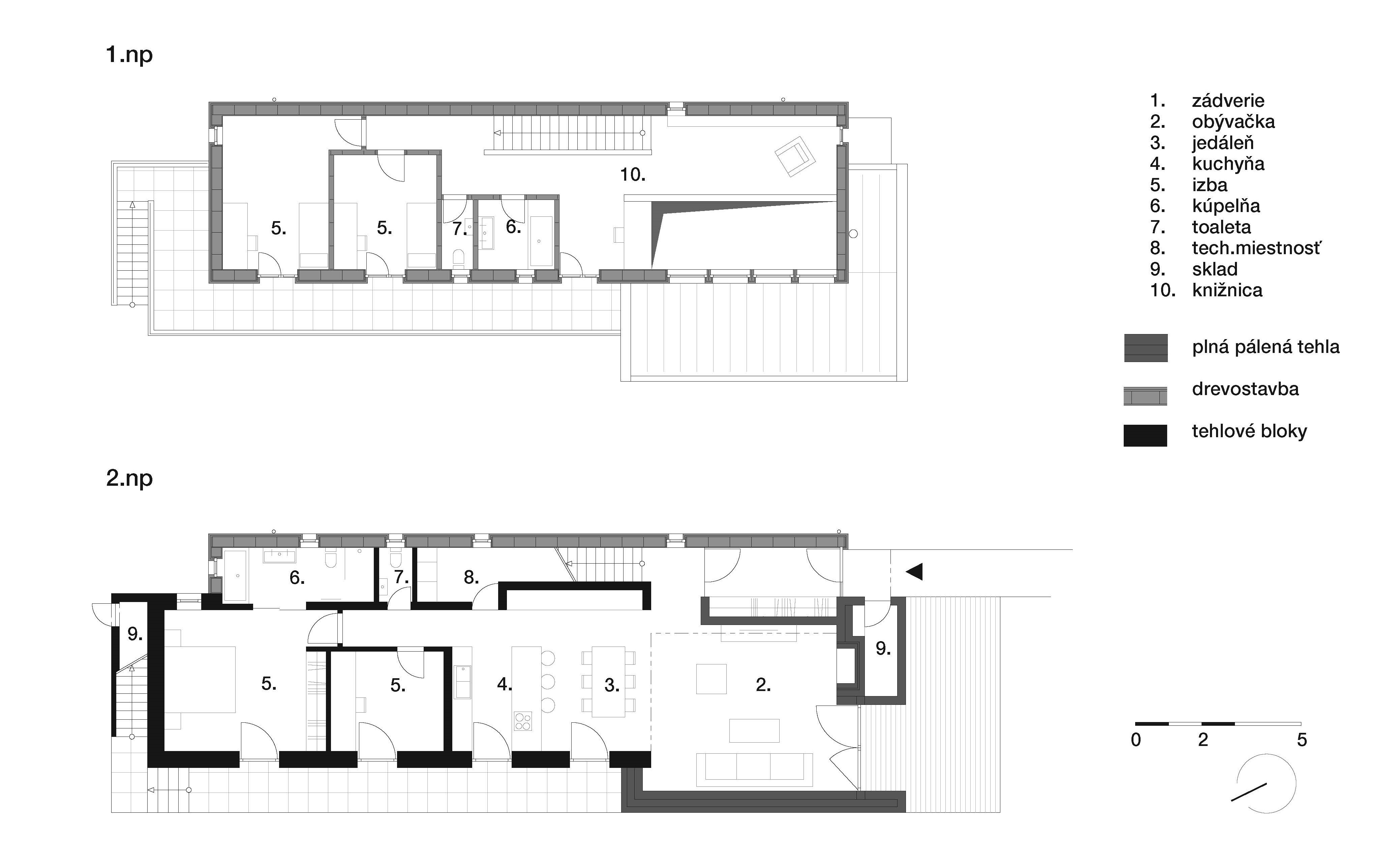 1. obytná hala - sendvičová konštrukcia z plnej pálenej tehly - sedlová strecha - kozub - archetyp domu haly