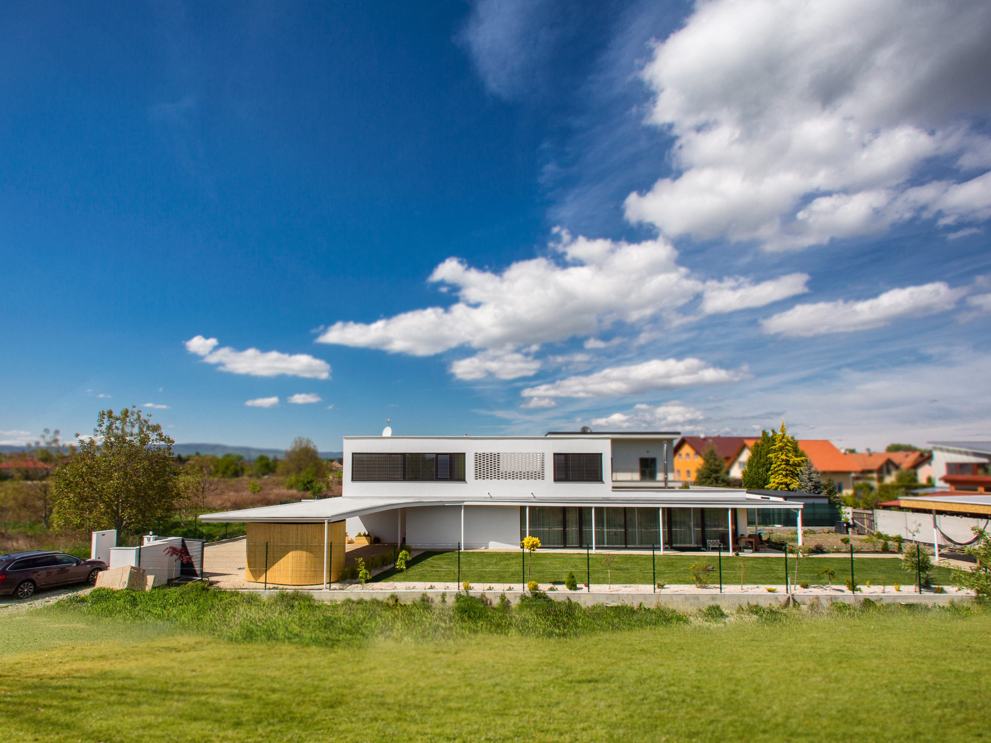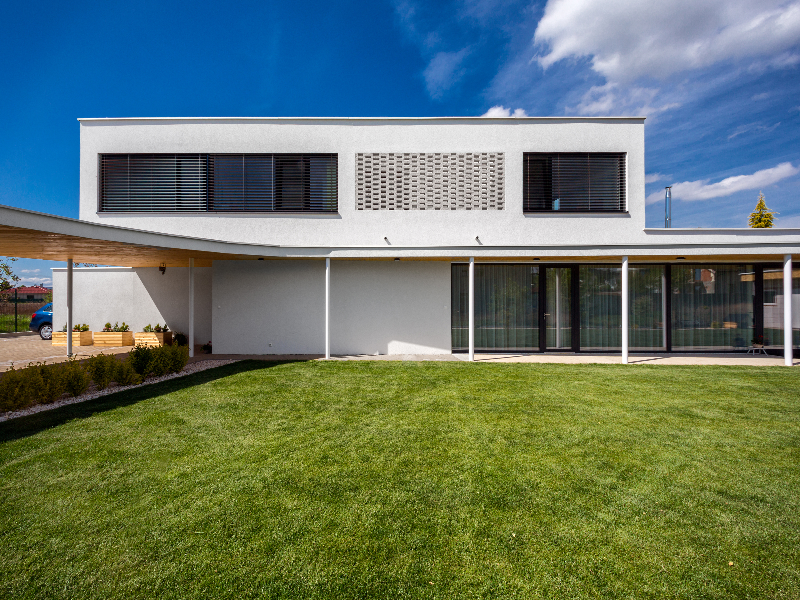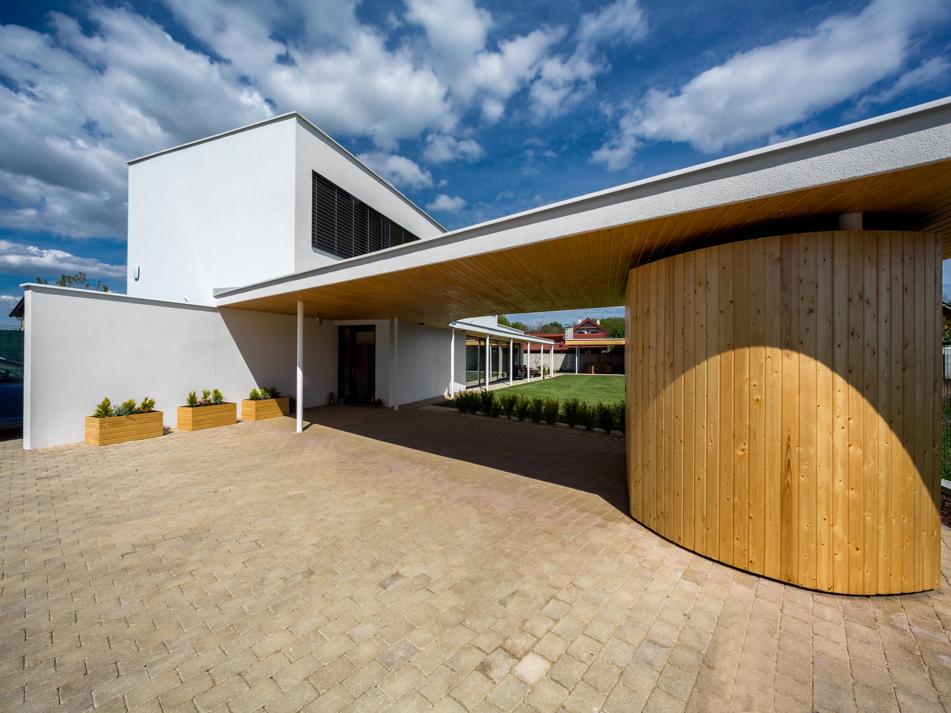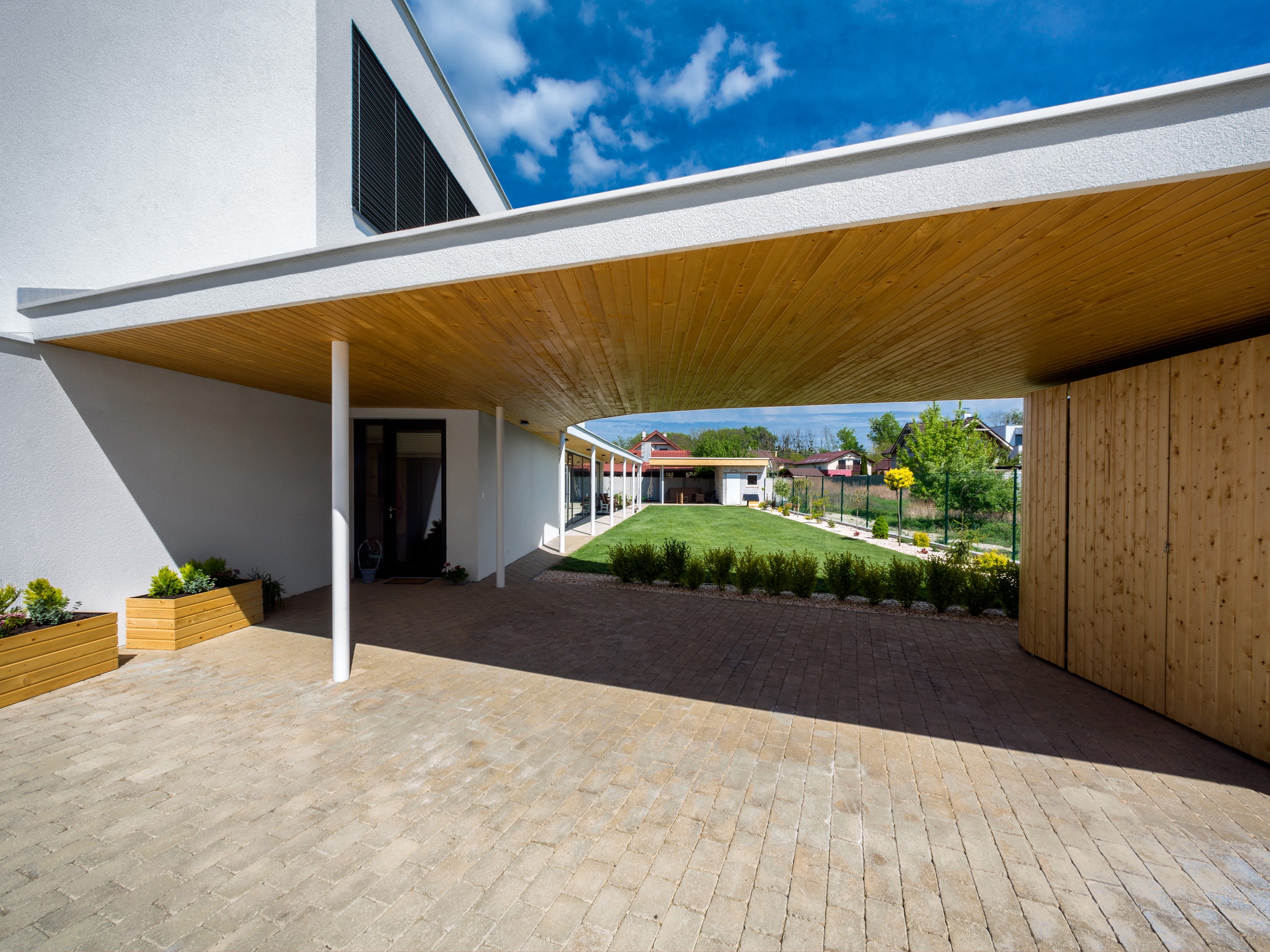 Pravouhlé tvary obytnej časti domu sú v horizontálnej rovine prerušené organicky tvarovanou líniou prestrešenia. Drevený obklad použitý na pohľadovej časti prístrešku a na plášti príručného skladu oživuje vstupnú časť domu a dopĺňa monochromatickú farebnosť. Drevo našlo svoje miesto aj v interiéri - dreveným podlahám sekunduje vstavaný nábytok a masívna drevená stena v obytnej časti.