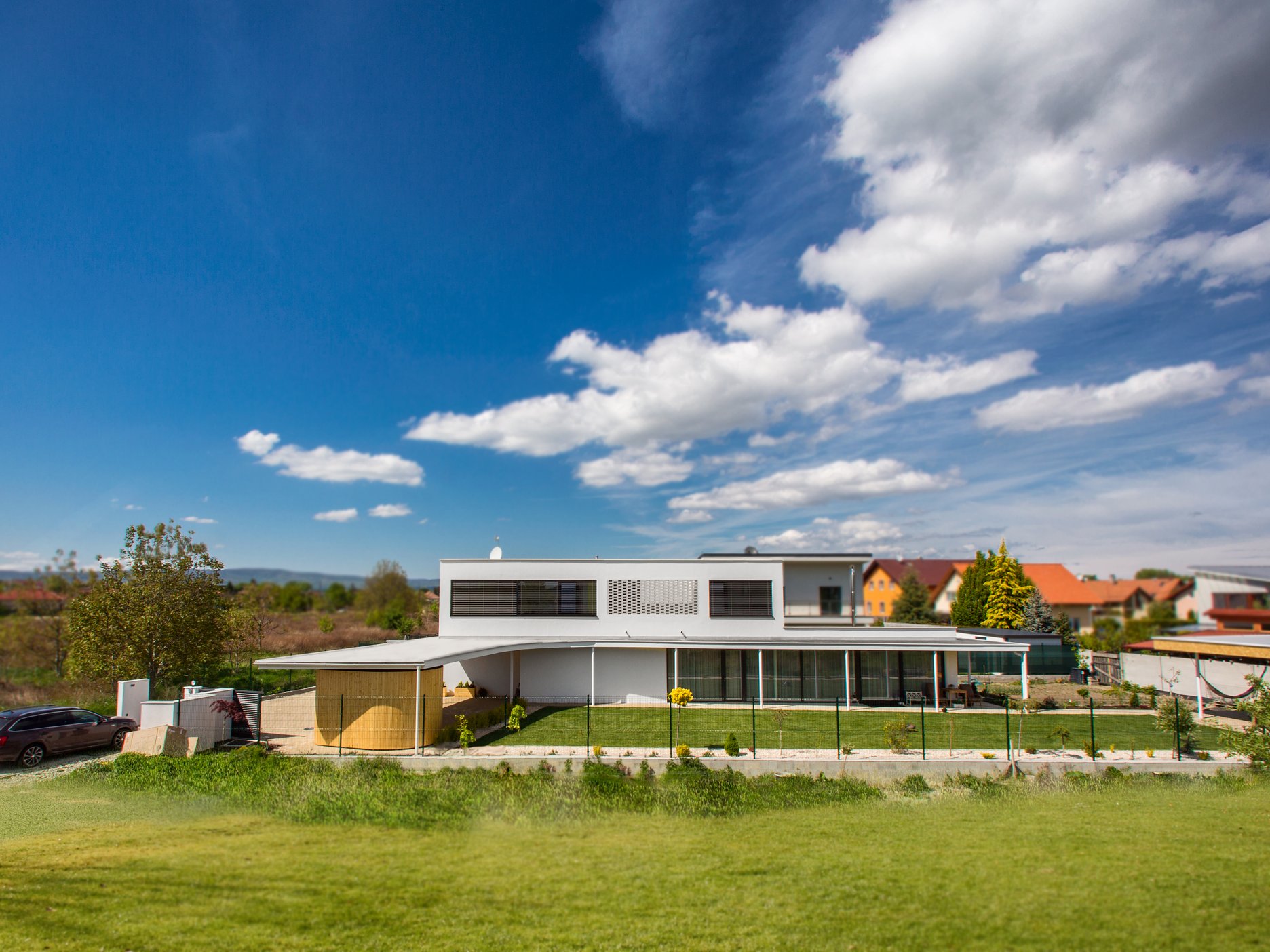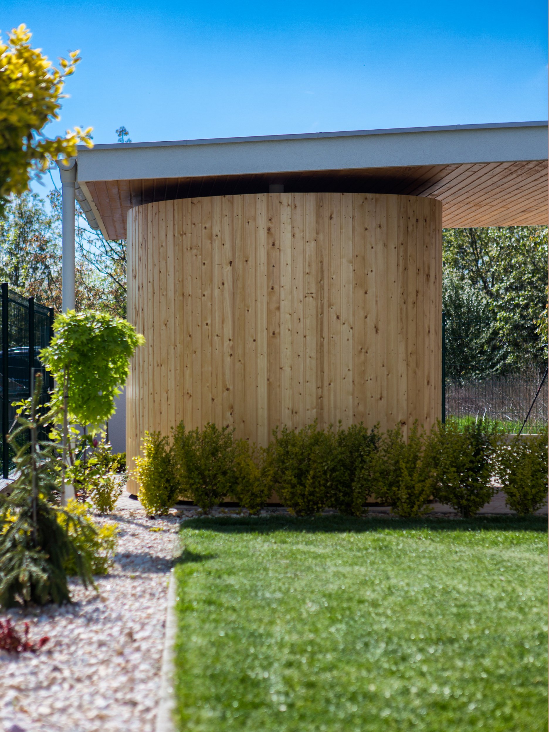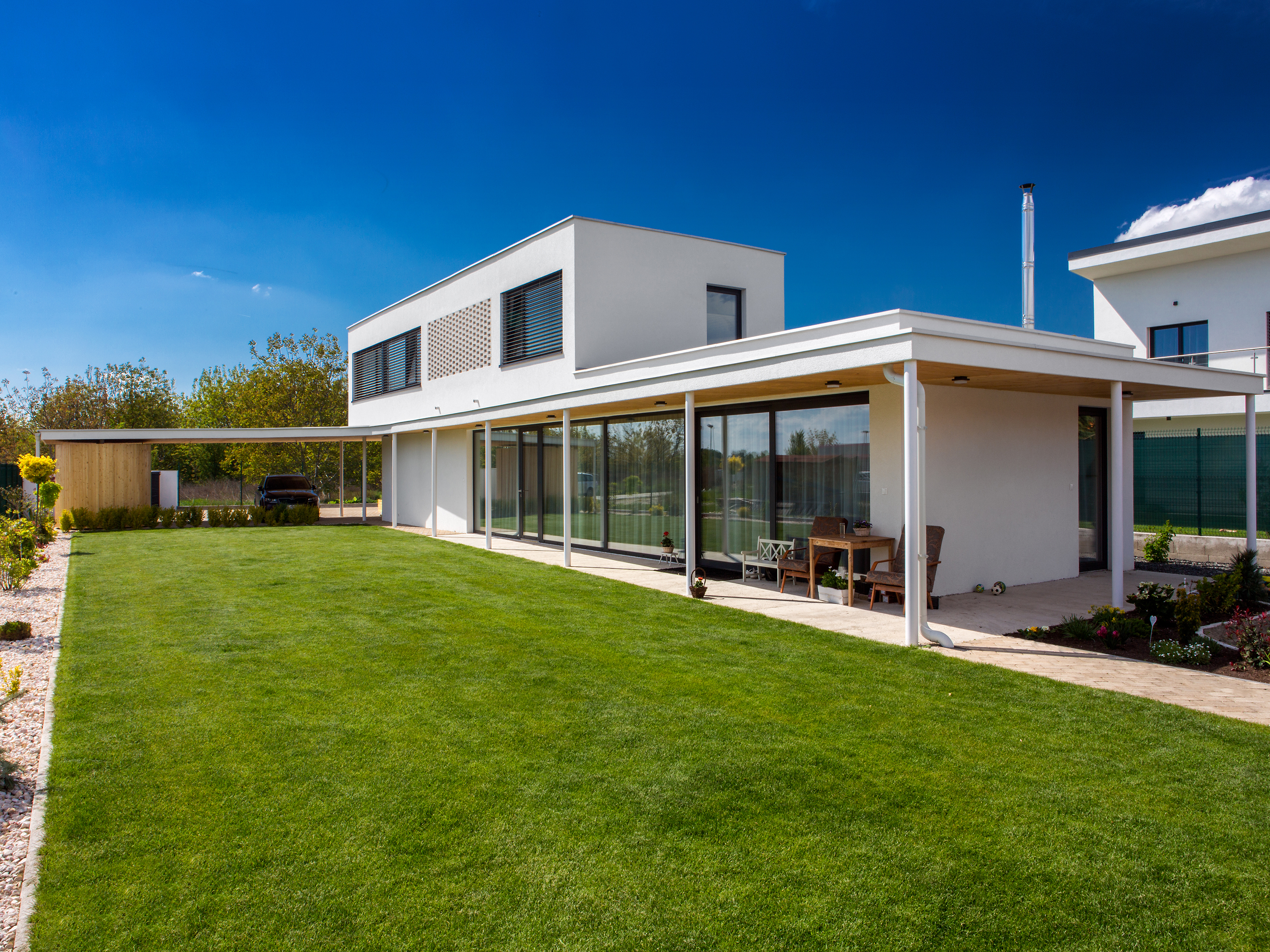 Pravouhlé tvary obytnej časti domu sú v horizontálnej rovine prerušené organicky tvarovanou líniou prestrešenia. Drevený obklad použitý na pohľadovej časti prístrešku a na plášti príručného skladu oživuje vstupnú časť domu a dopĺňa monochromatickú farebnosť. Drevo našlo svoje miesto aj v interiéri - dreveným podlahám sekunduje vstavaný nábytok a masívna drevená stena v obytnej časti.