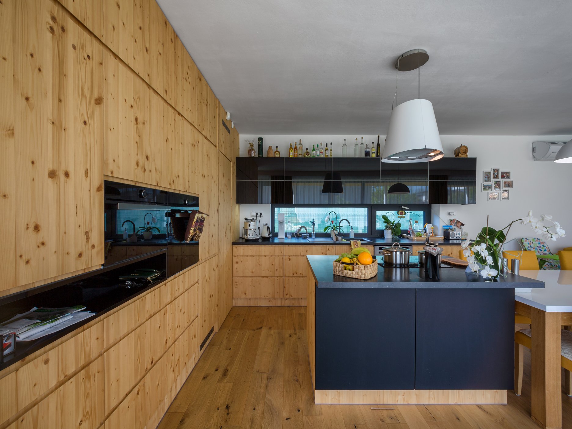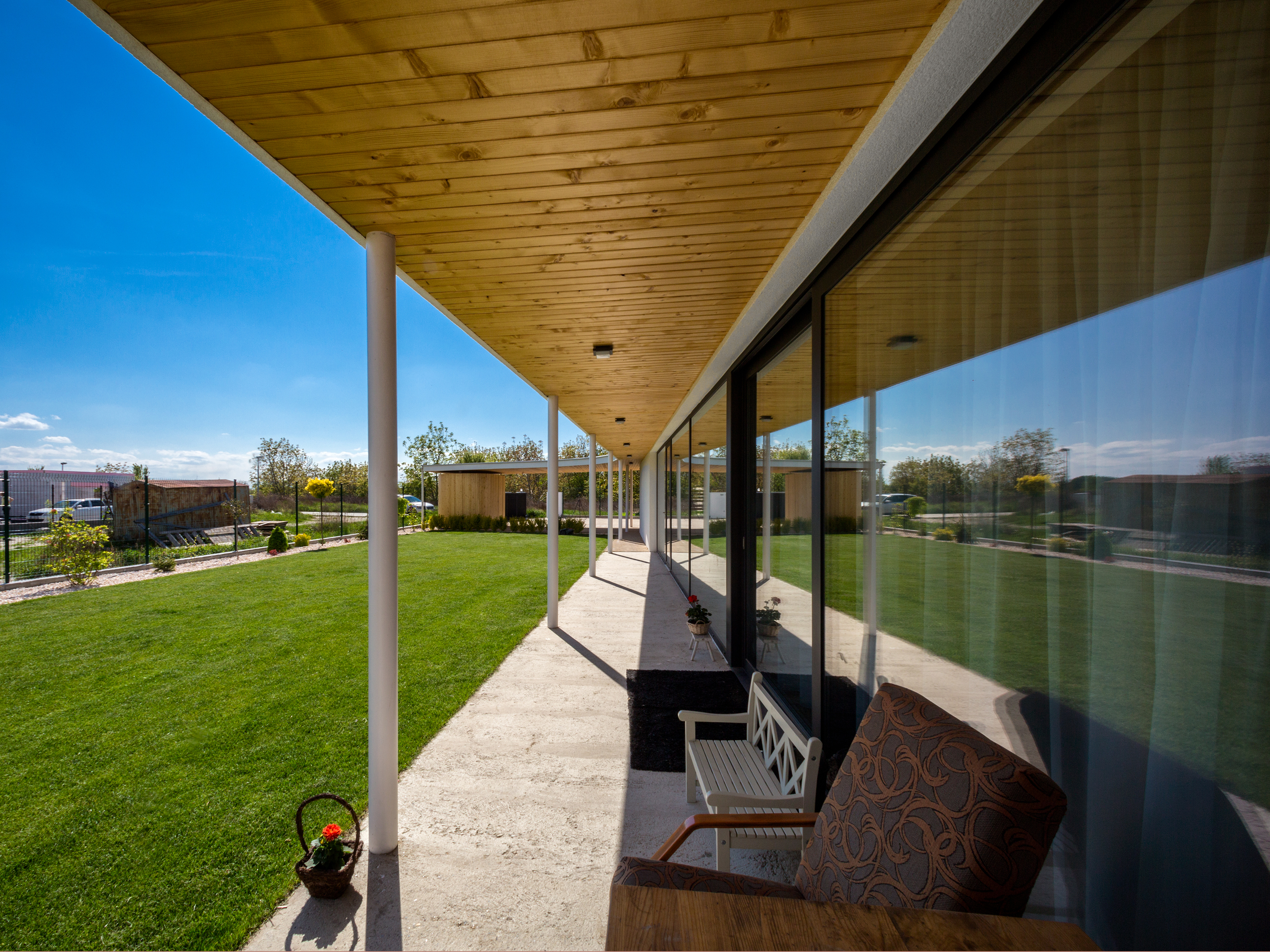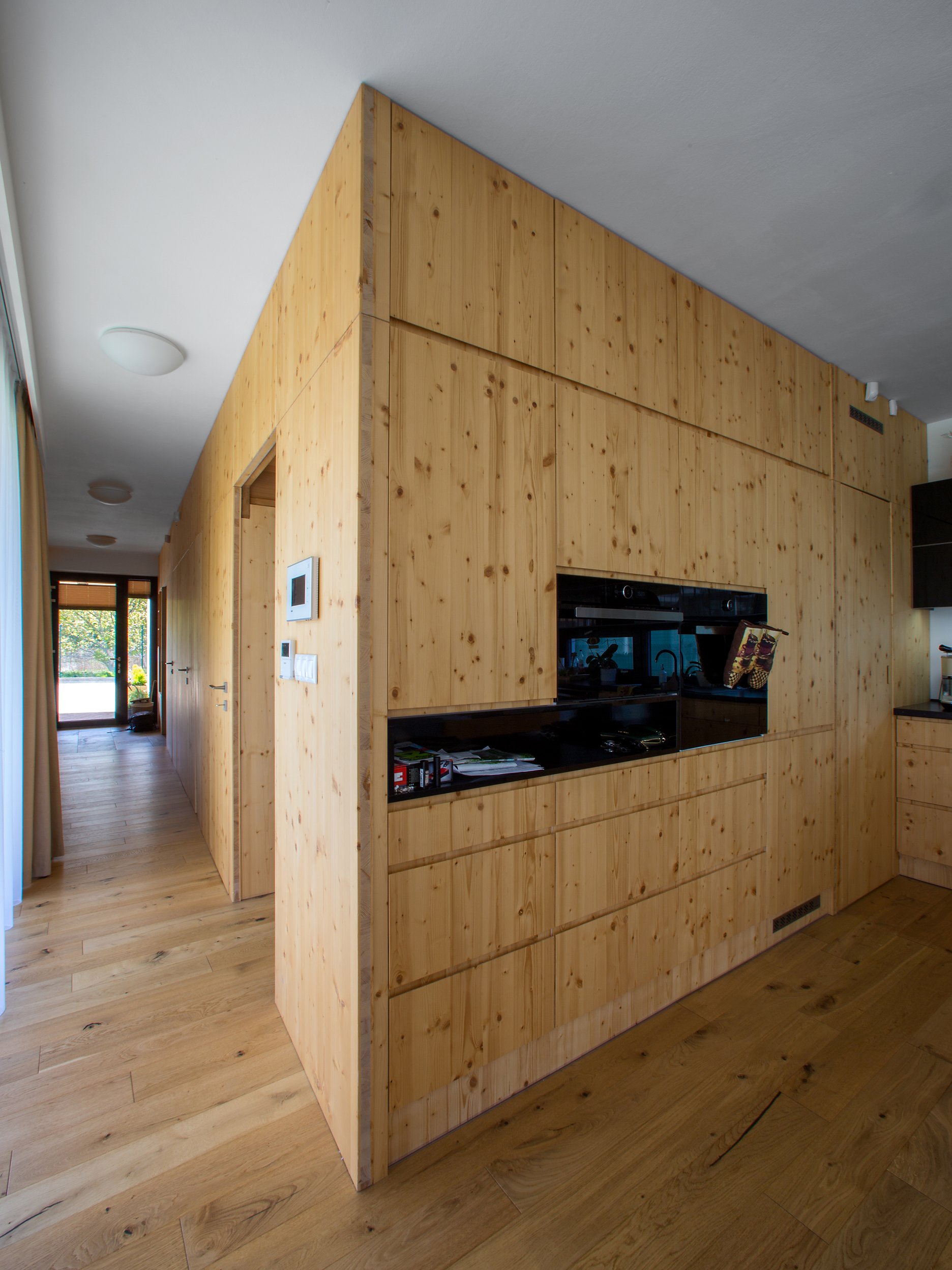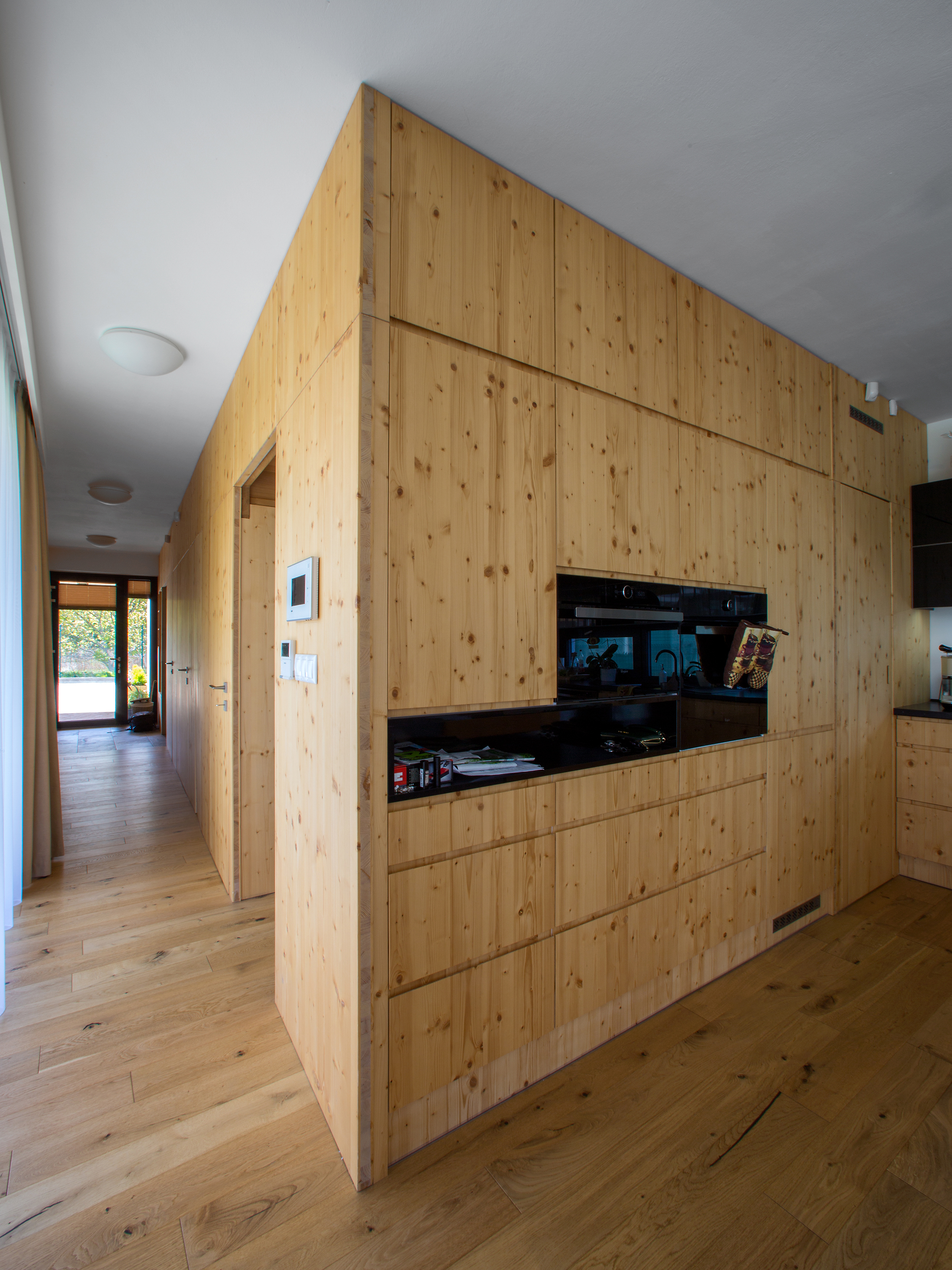Pravouhlé tvary obytnej časti domu sú v horizontálnej rovine prerušené organicky tvarovanou líniou prestrešenia. Drevený obklad použitý na pohľadovej časti prístrešku a na plášti príručného skladu oživuje vstupnú časť domu a dopĺňa monochromatickú farebnosť. Drevo našlo svoje miesto aj v interiéri - dreveným podlahám sekunduje vstavaný nábytok a masívna drevená stena v obytnej časti.