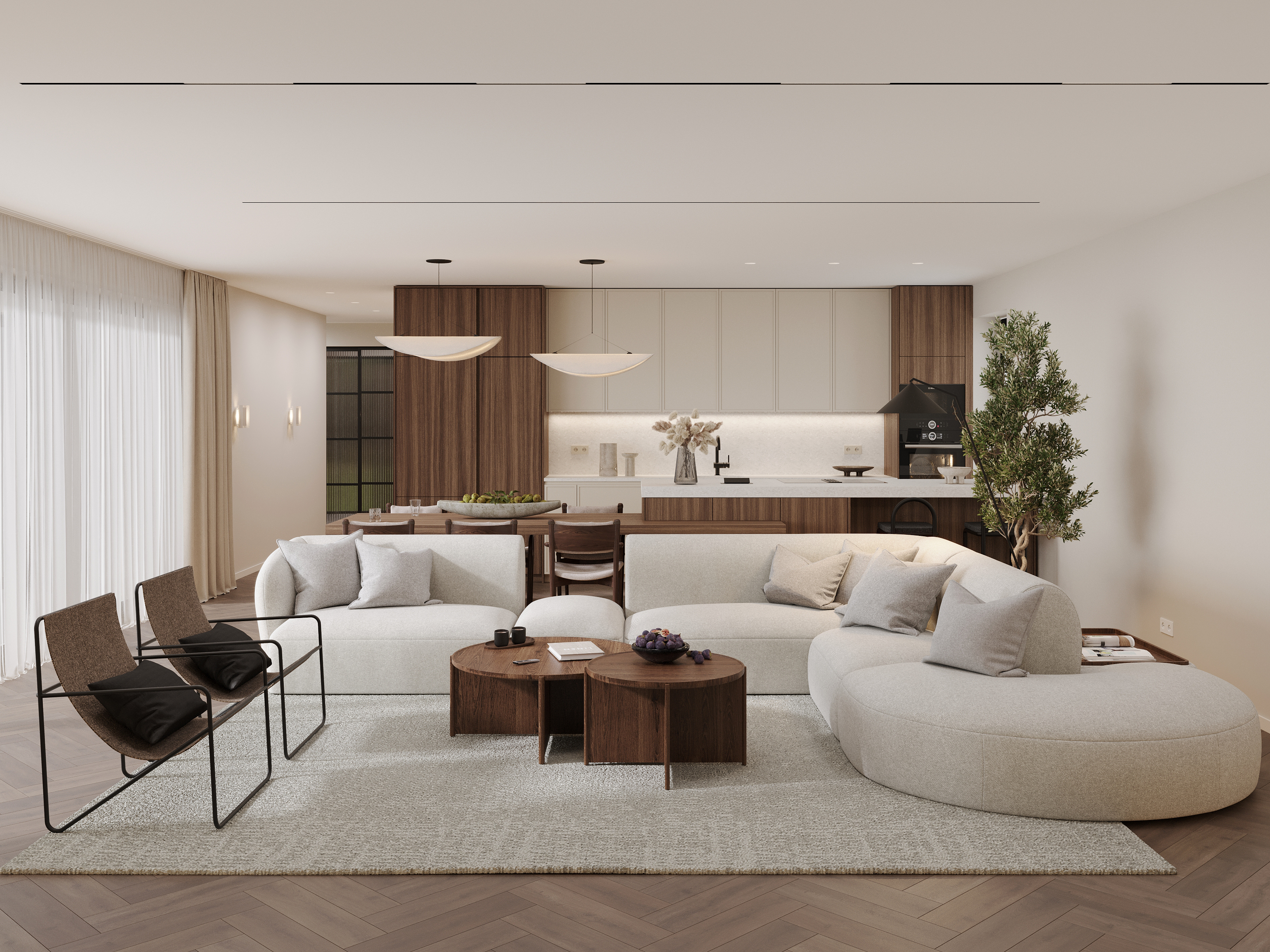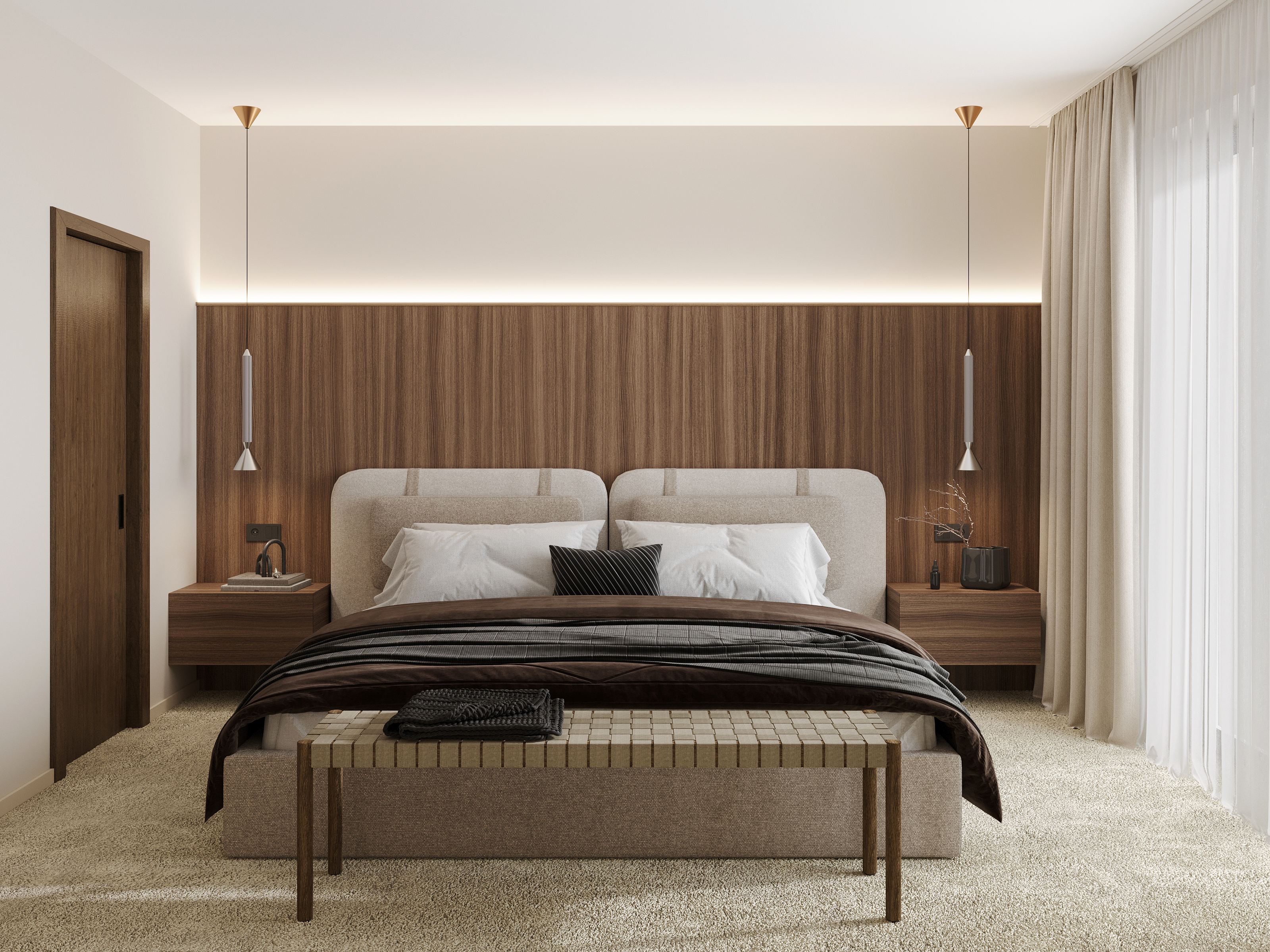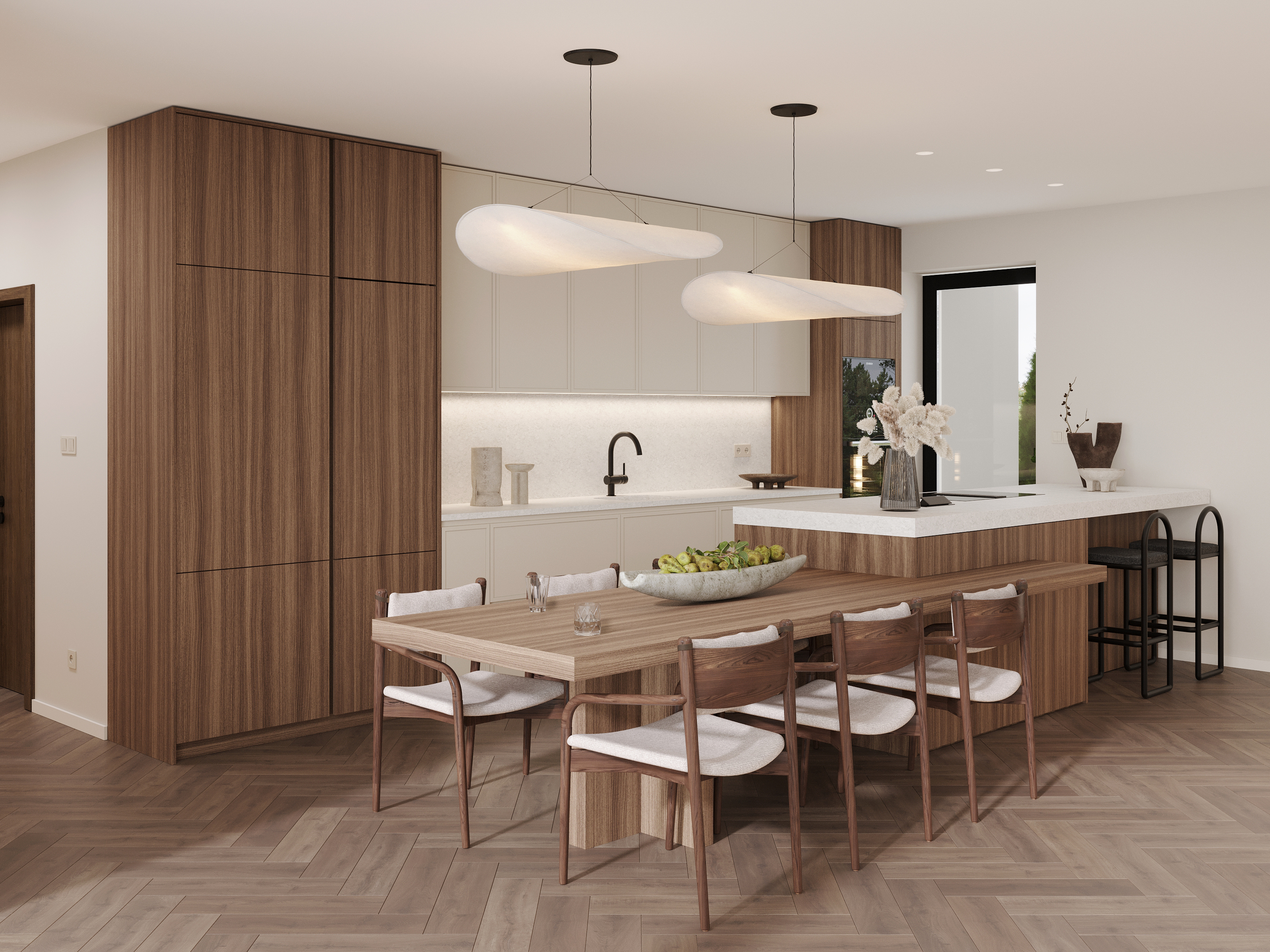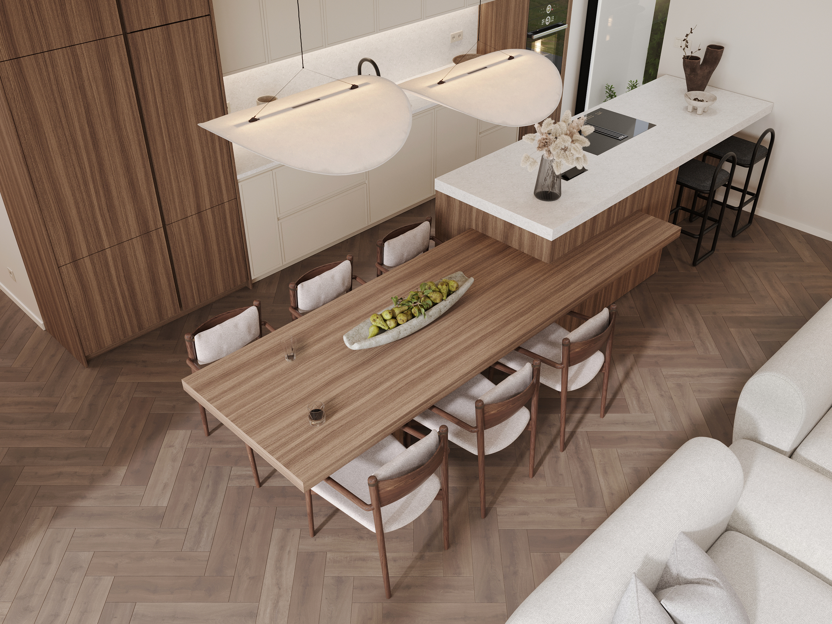 V tomto priestore prevládajú neutrálne tóny – od jemnej béžovej a šedej až po teplé krémové odtiene, ktoré vytvárajú pocit útulnosti a pohody. Hlavným materiálom je drevo vo výraznom odtieni – tmavý orech s bohato textúrovanou kresbou. Drevené prvky sa objavujú na podlahe, obkladoch stien alebo v nábytku, čo dodáva miestnosti prírodný a hrejivý ráz.