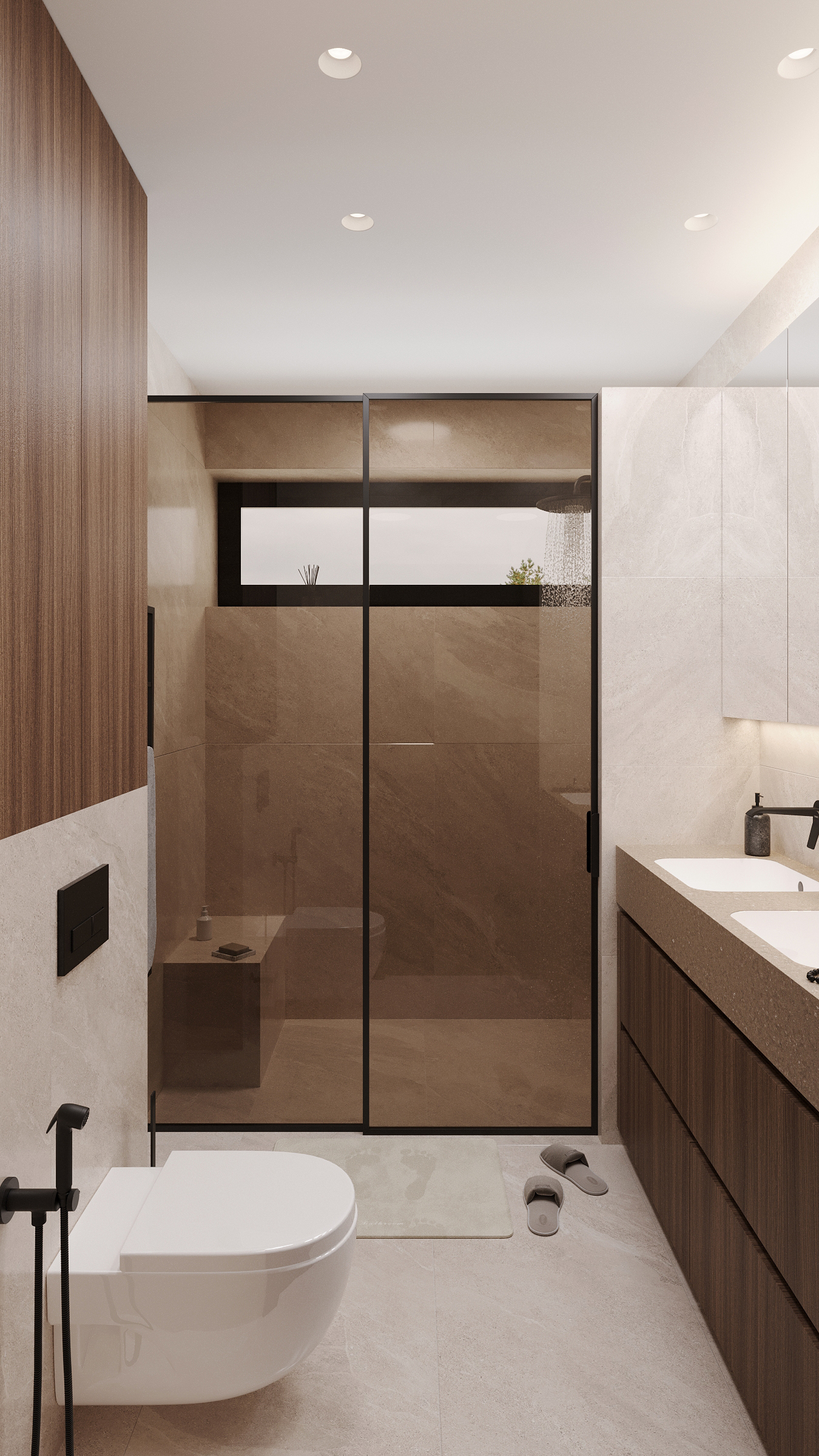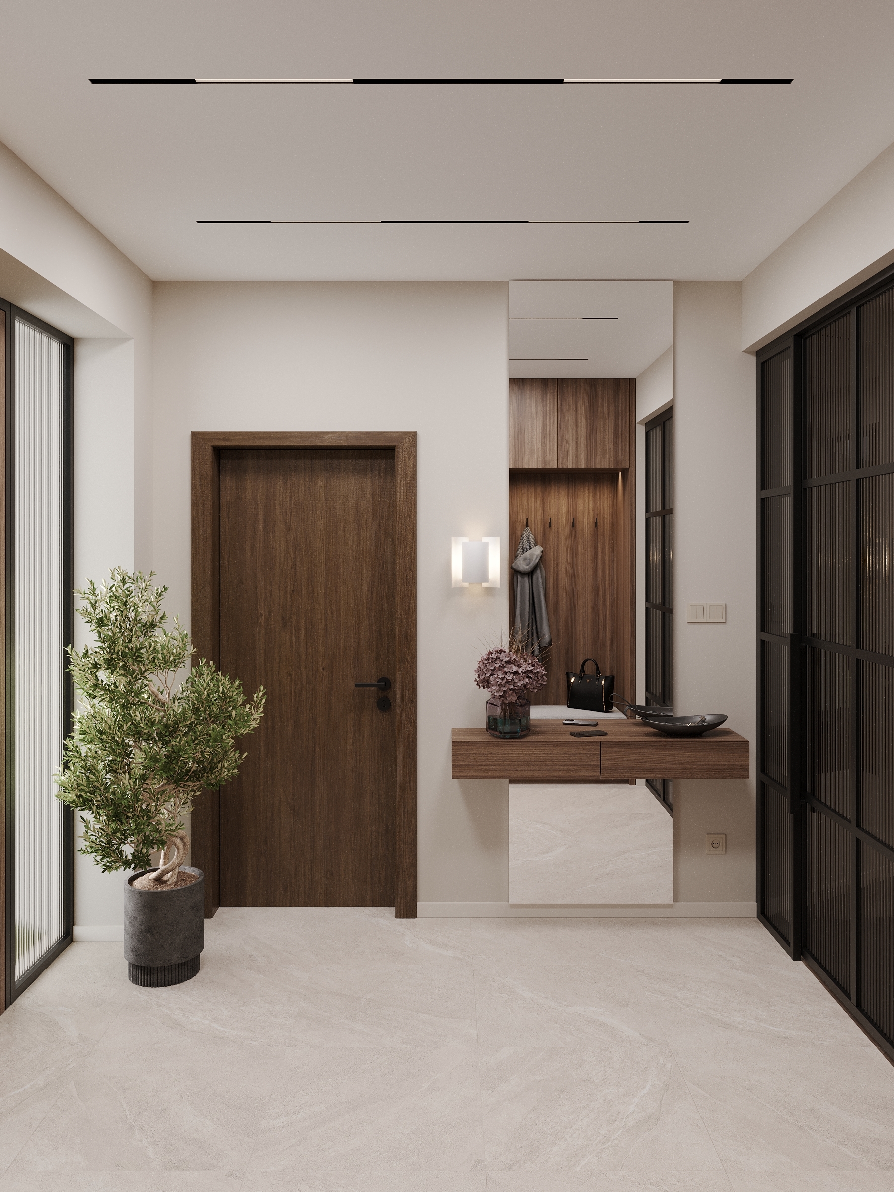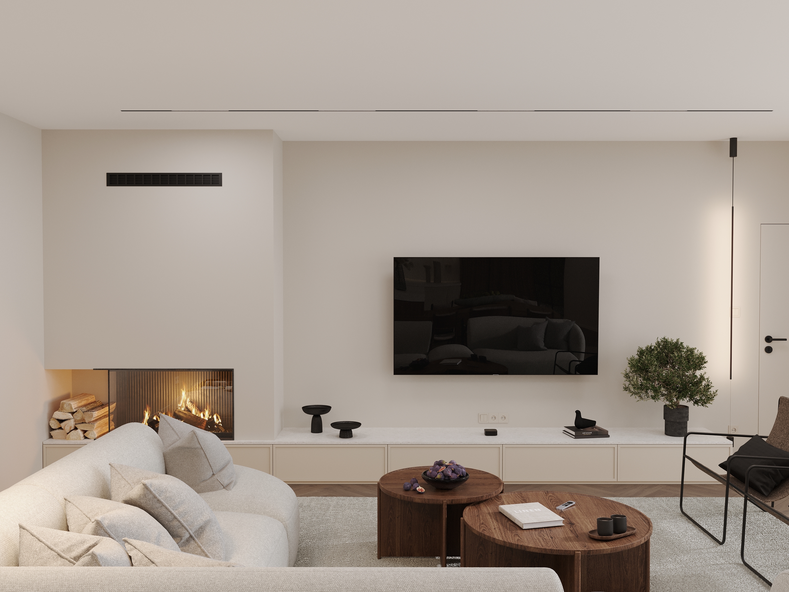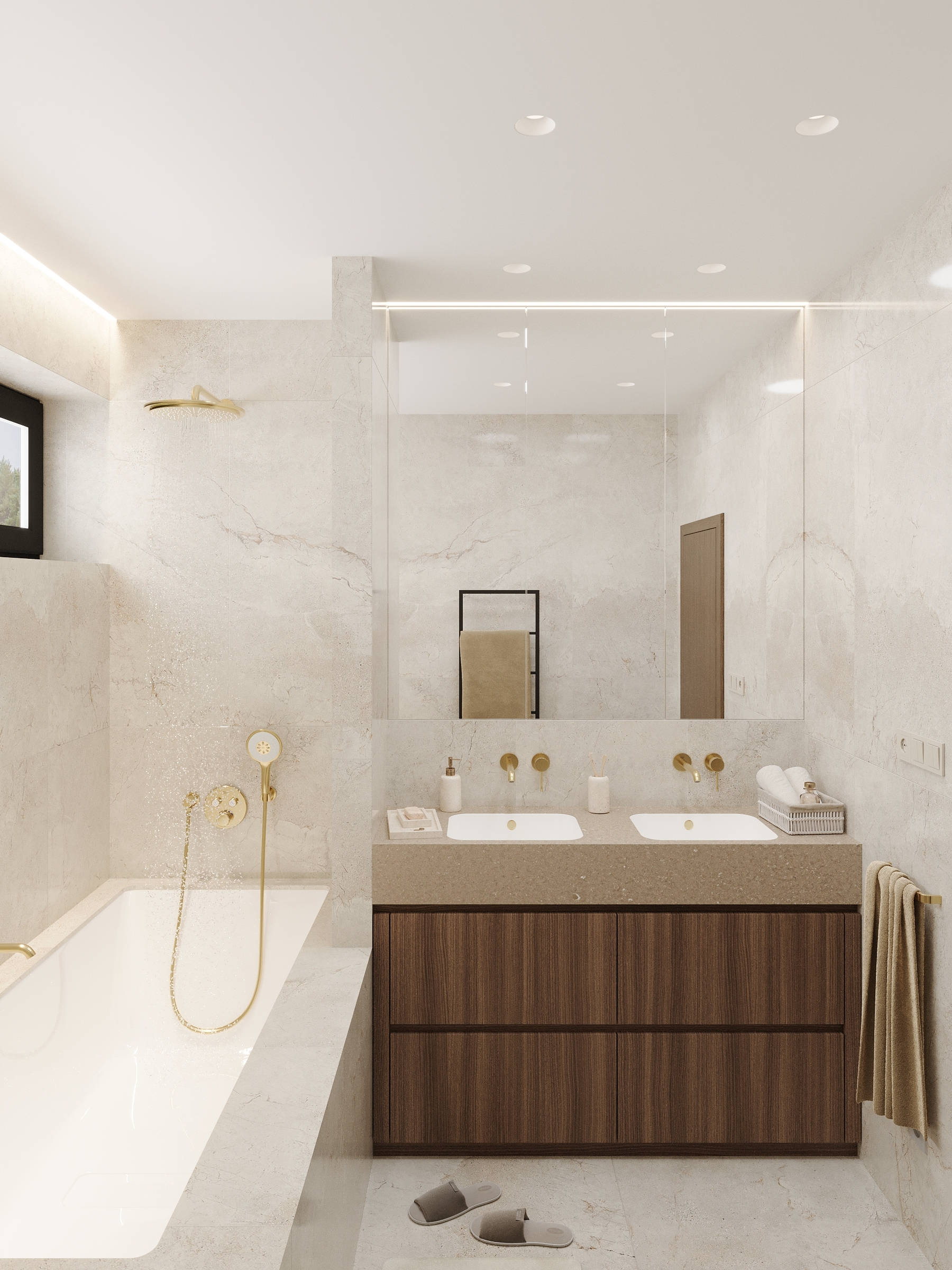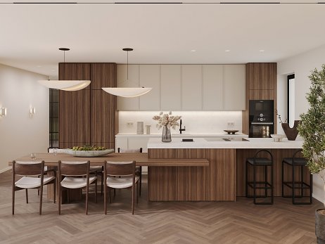 V tomto priestore prevládajú neutrálne tóny – od jemnej béžovej a šedej až po teplé krémové odtiene, ktoré vytvárajú pocit útulnosti a pohody. Hlavným materiálom je drevo vo výraznom odtieni – tmavý orech s bohato textúrovanou kresbou. Drevené prvky sa objavujú na podlahe, obkladoch stien alebo v nábytku, čo dodáva miestnosti prírodný a hrejivý ráz.