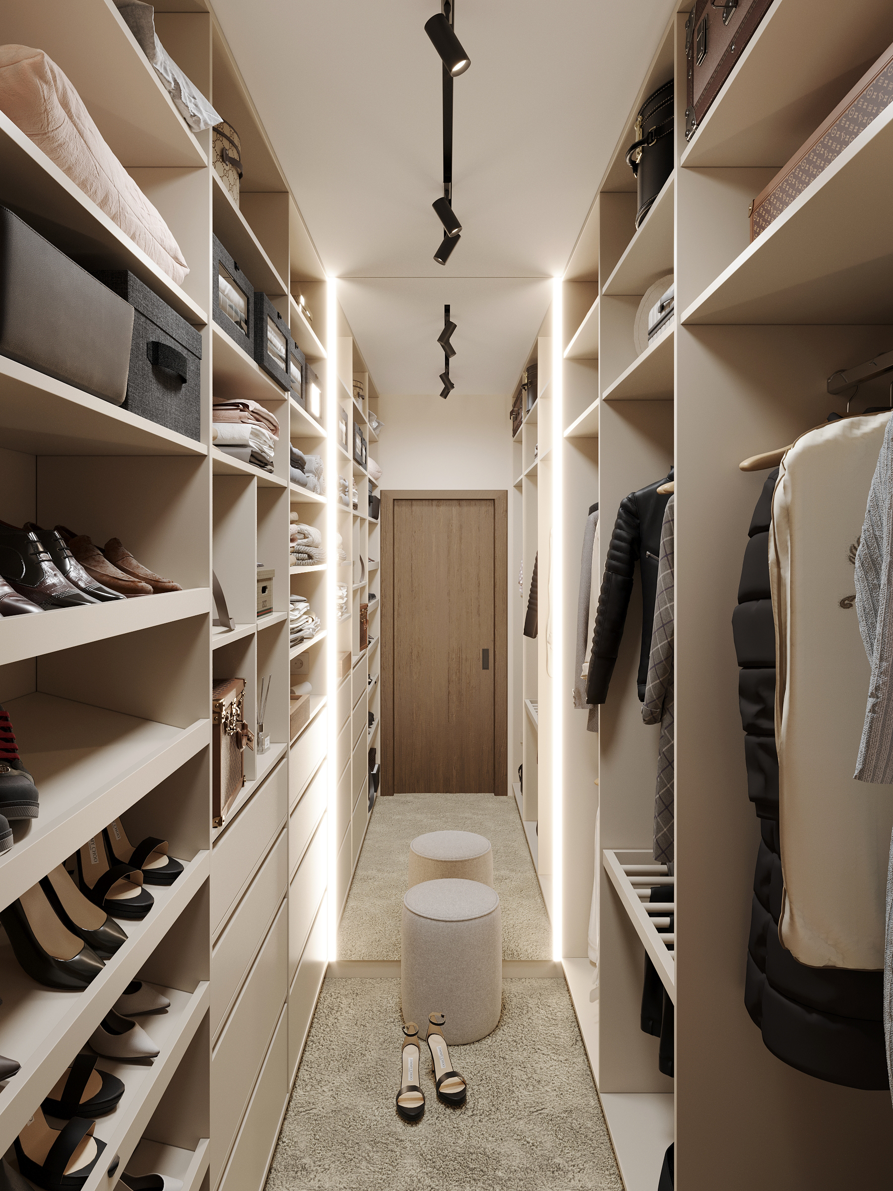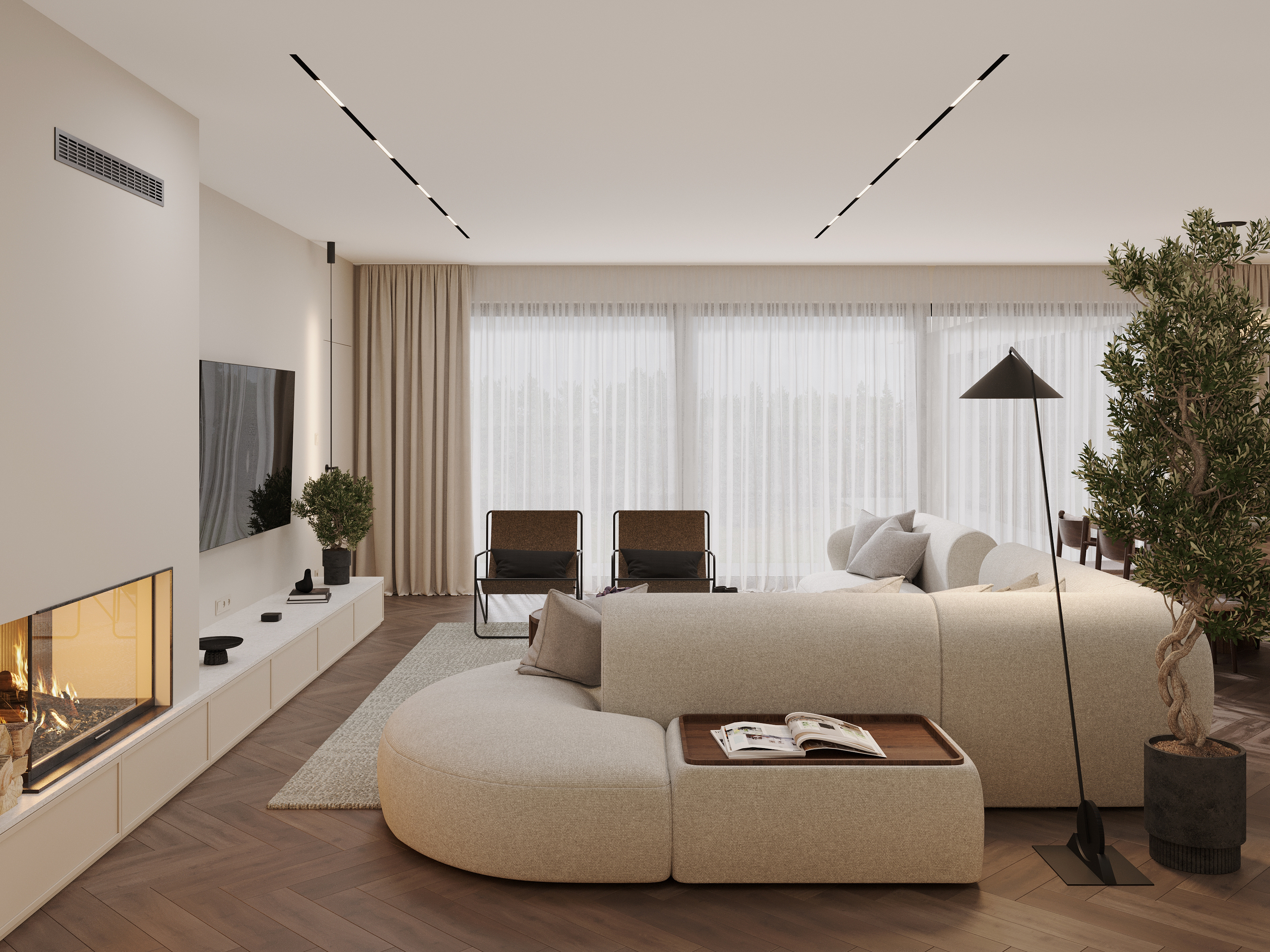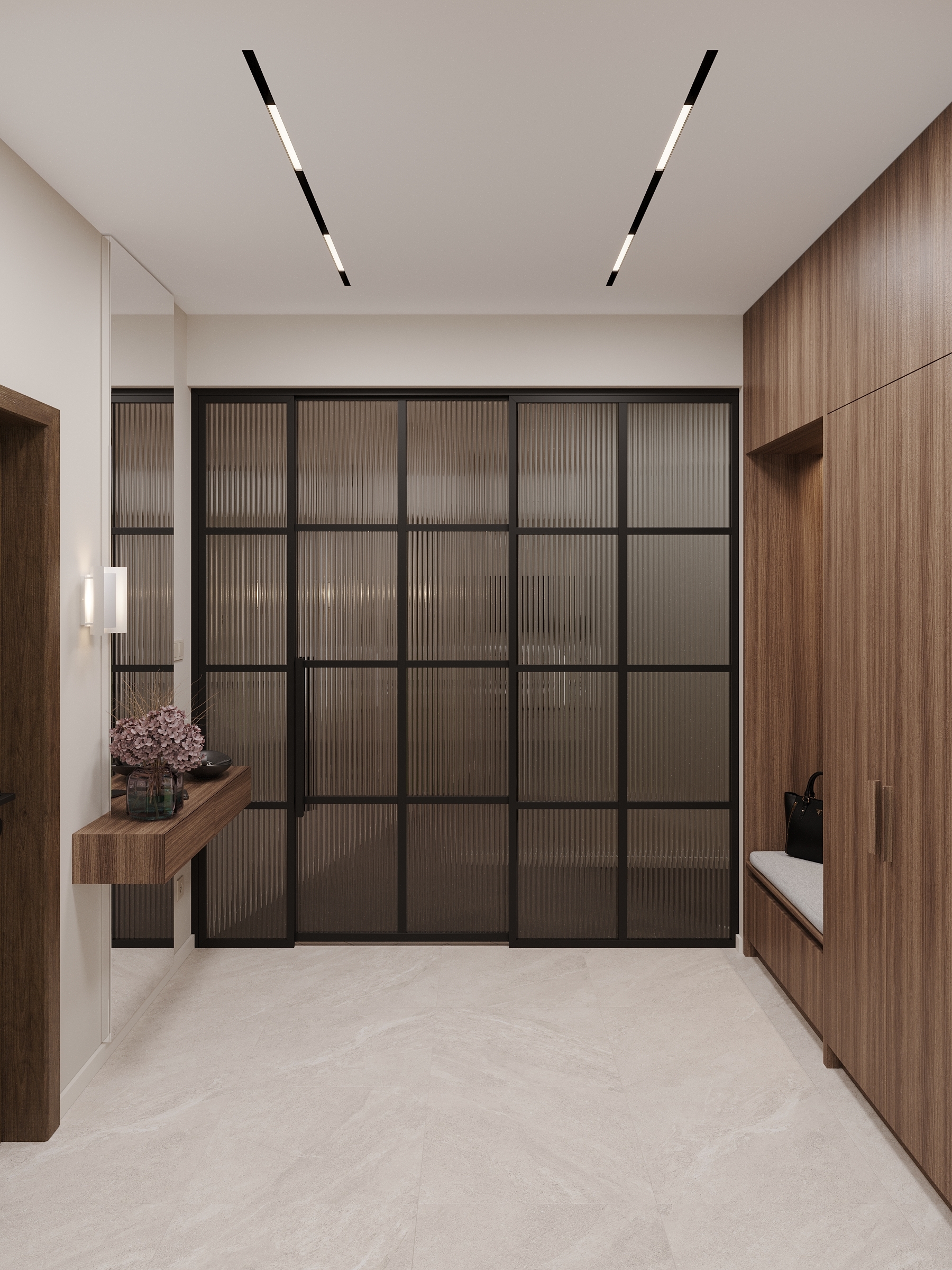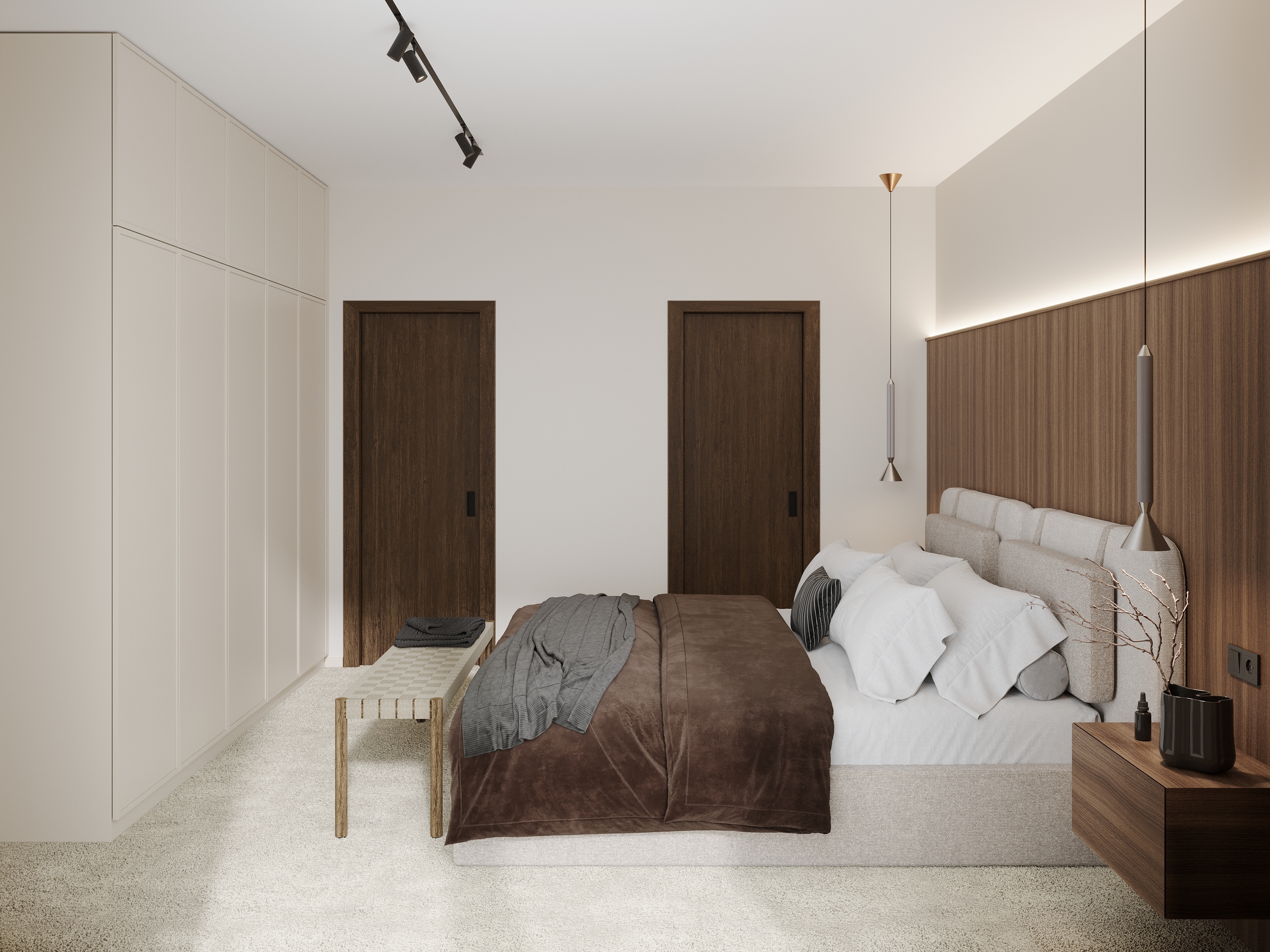 V tomto priestore prevládajú neutrálne tóny – od jemnej béžovej a šedej až po teplé krémové odtiene, ktoré vytvárajú pocit útulnosti a pohody. Hlavným materiálom je drevo vo výraznom odtieni – tmavý orech s bohato textúrovanou kresbou. Drevené prvky sa objavujú na podlahe, obkladoch stien alebo v nábytku, čo dodáva miestnosti prírodný a hrejivý ráz.