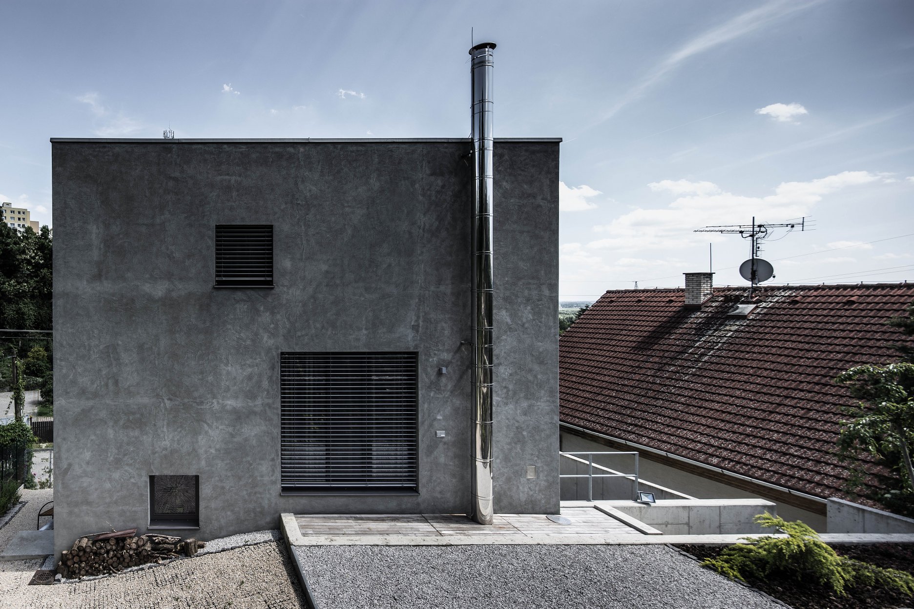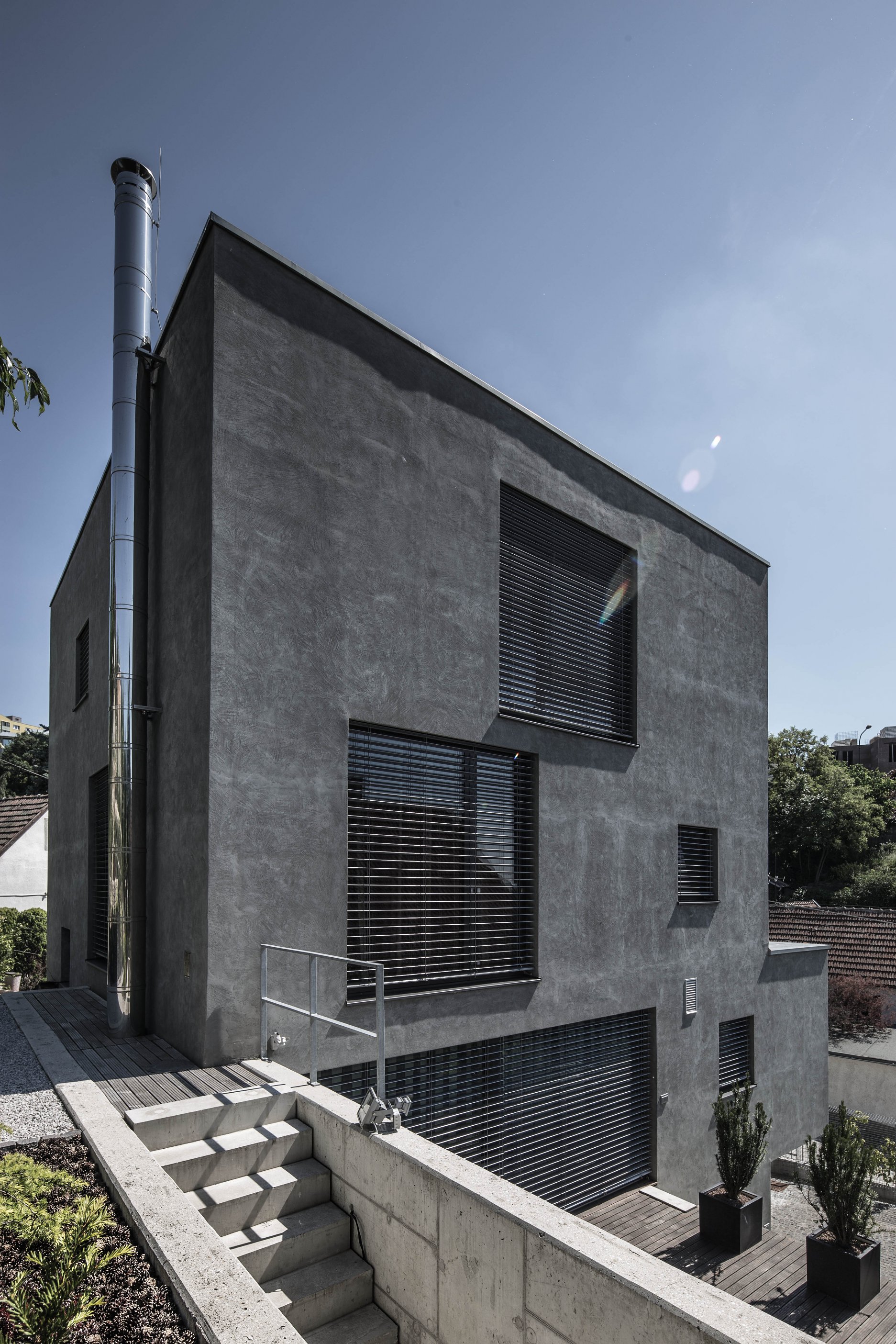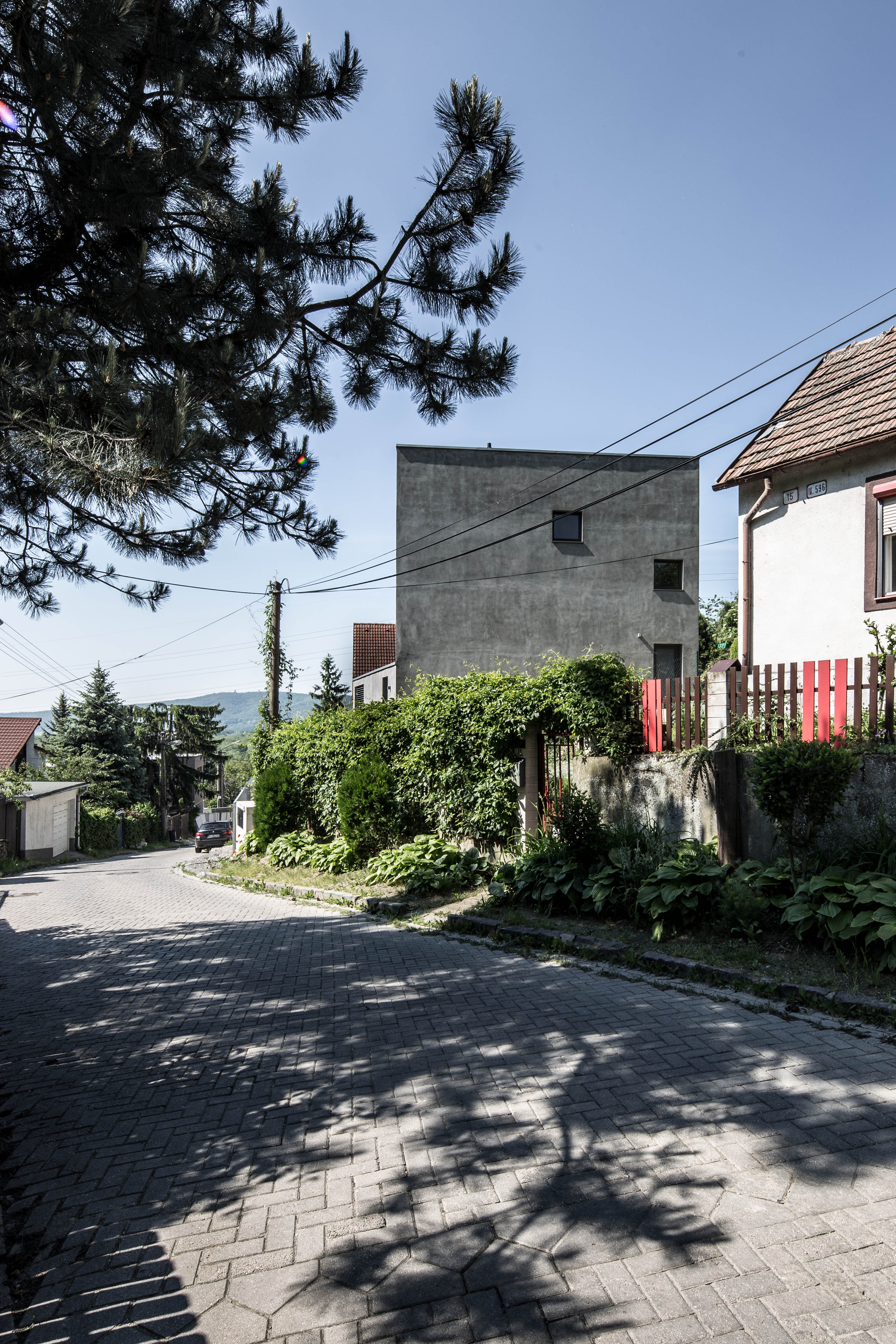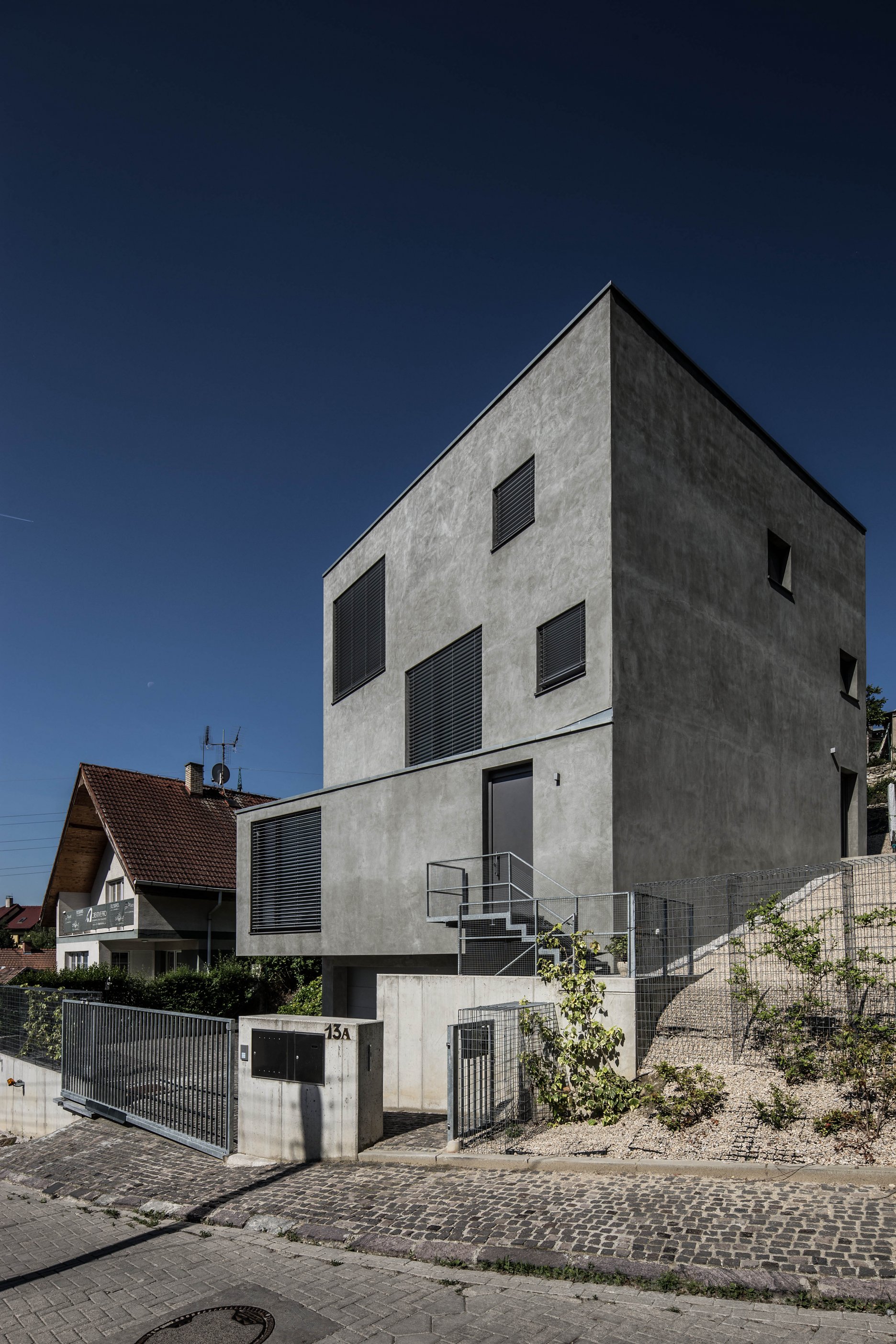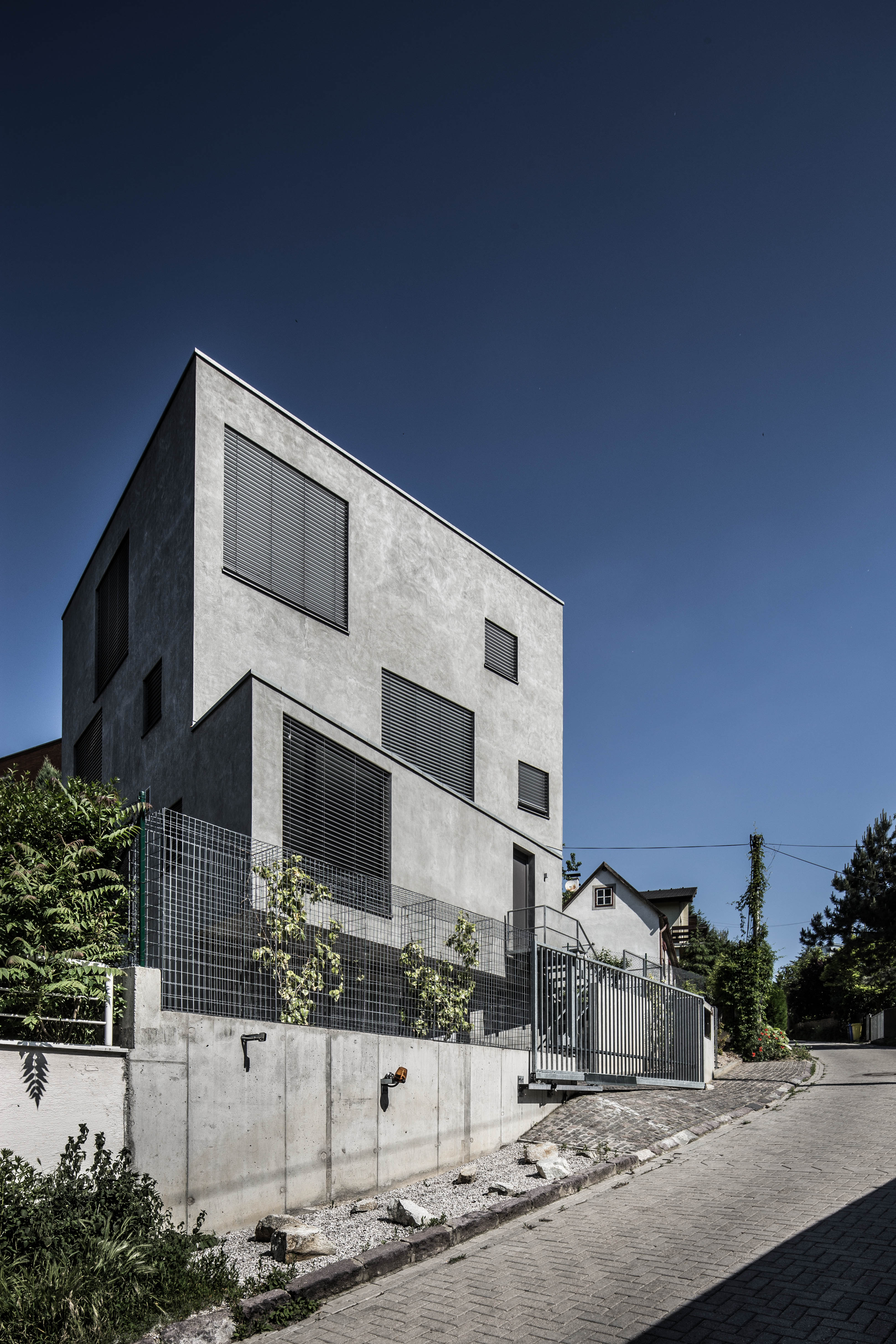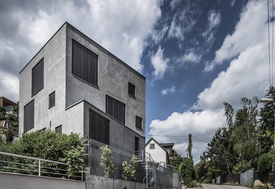 Dom bol realizovaný na strmom, k východu sa zvažujúcom svahu. Stojí v susedstve s rodinnými domami z rôzneho časového obdobia, ktoré spolu tvoria uličnú čiaru. Tu reflektujeme vysunutím podlažia do ulice. Prevažná časť objemu sa potom od uličnej fronty odkláňa smerom na juh s cieľom vytvorenia intímnejších priestorov (západná terasa vrezaná do svahu) bez vizuálneho kontaktu s panelákmi na kopci. Pôdorysný tvar sleduje maximálnu kompaktnosť a minimálnu pôdorysnú stopu. Vzhľadom na svahovitý terén je dom členený do štyroch podlaží tak, aby obytné miestnosti mohli byť orientované na východnú, južnú a západnú stranu. Tri podlažia majú priamy kontakt so záhradou a rozširujú tak intenzívne obytné využívanie záhrady. Osadenie domu eliminuje pohľad na panelové domy na severovýchodnej strane svahu a posilňuje atraktívne juhozápadné výhľady na časť Bratislavy a rakúskeho Hainburgu.