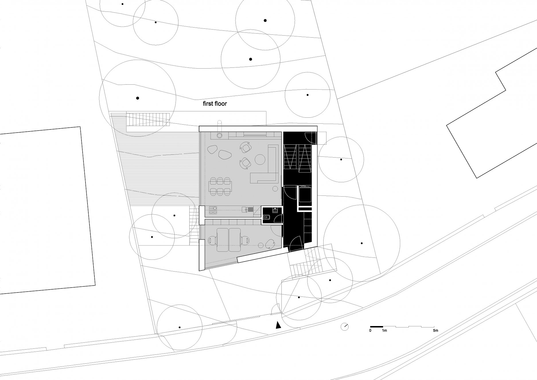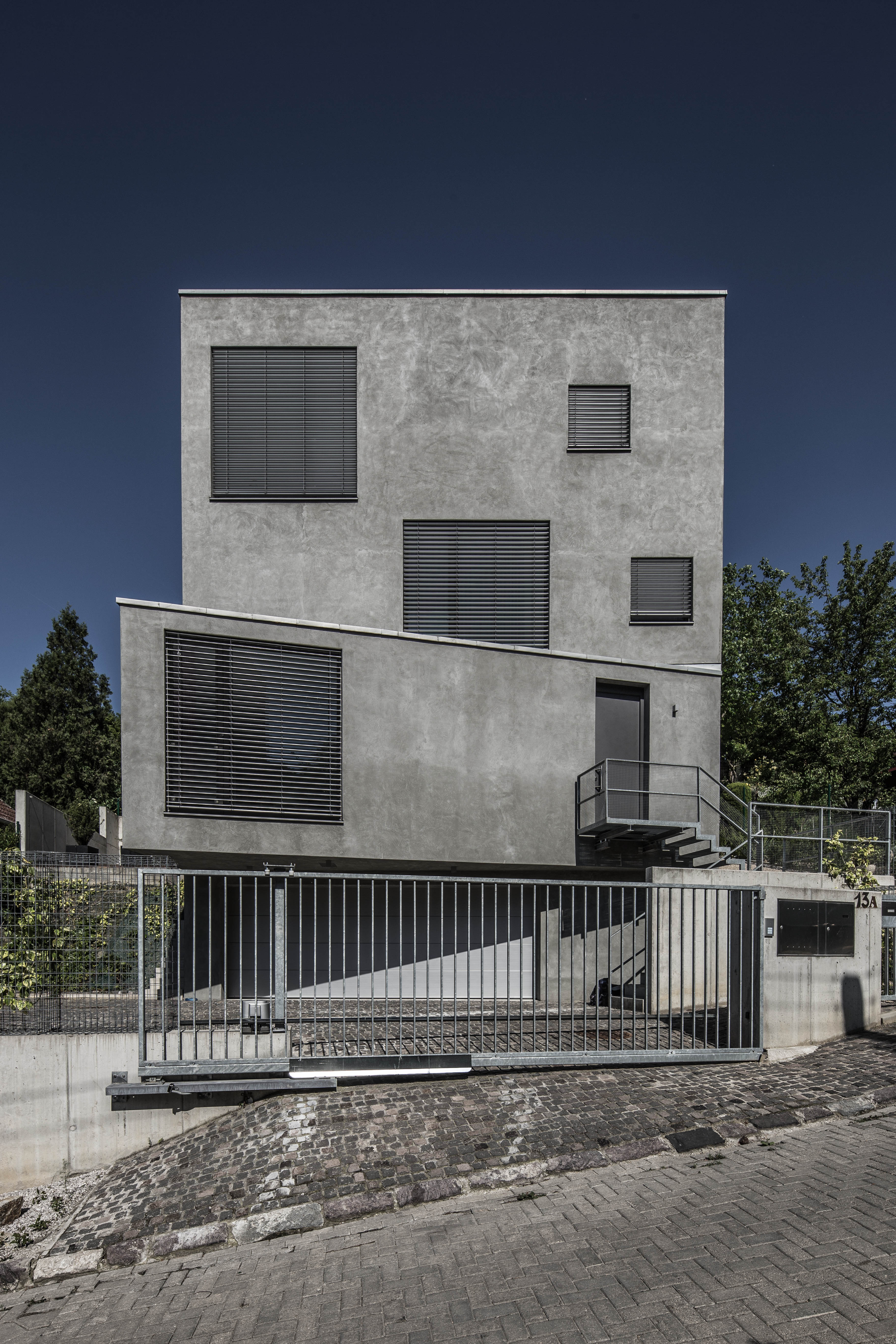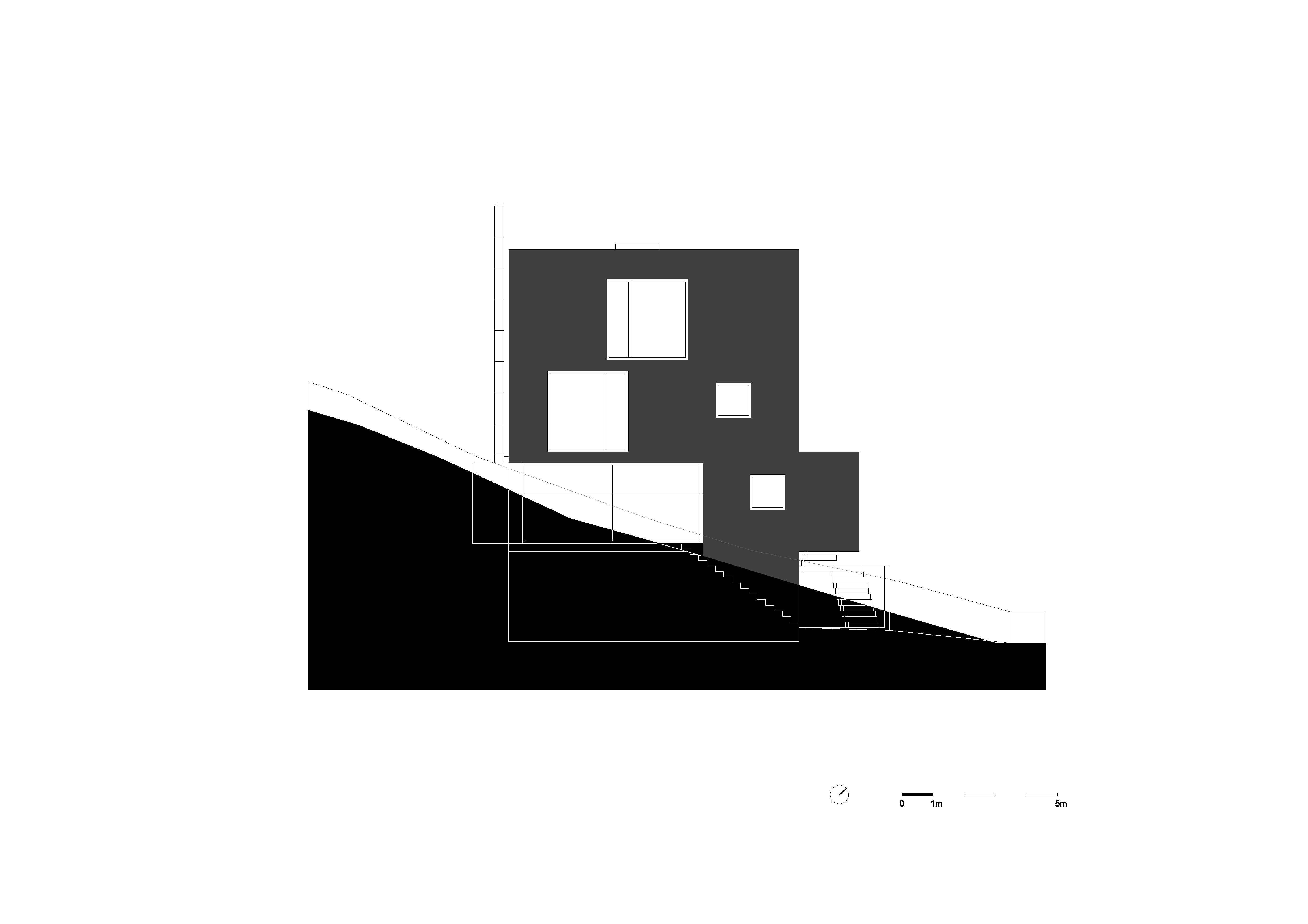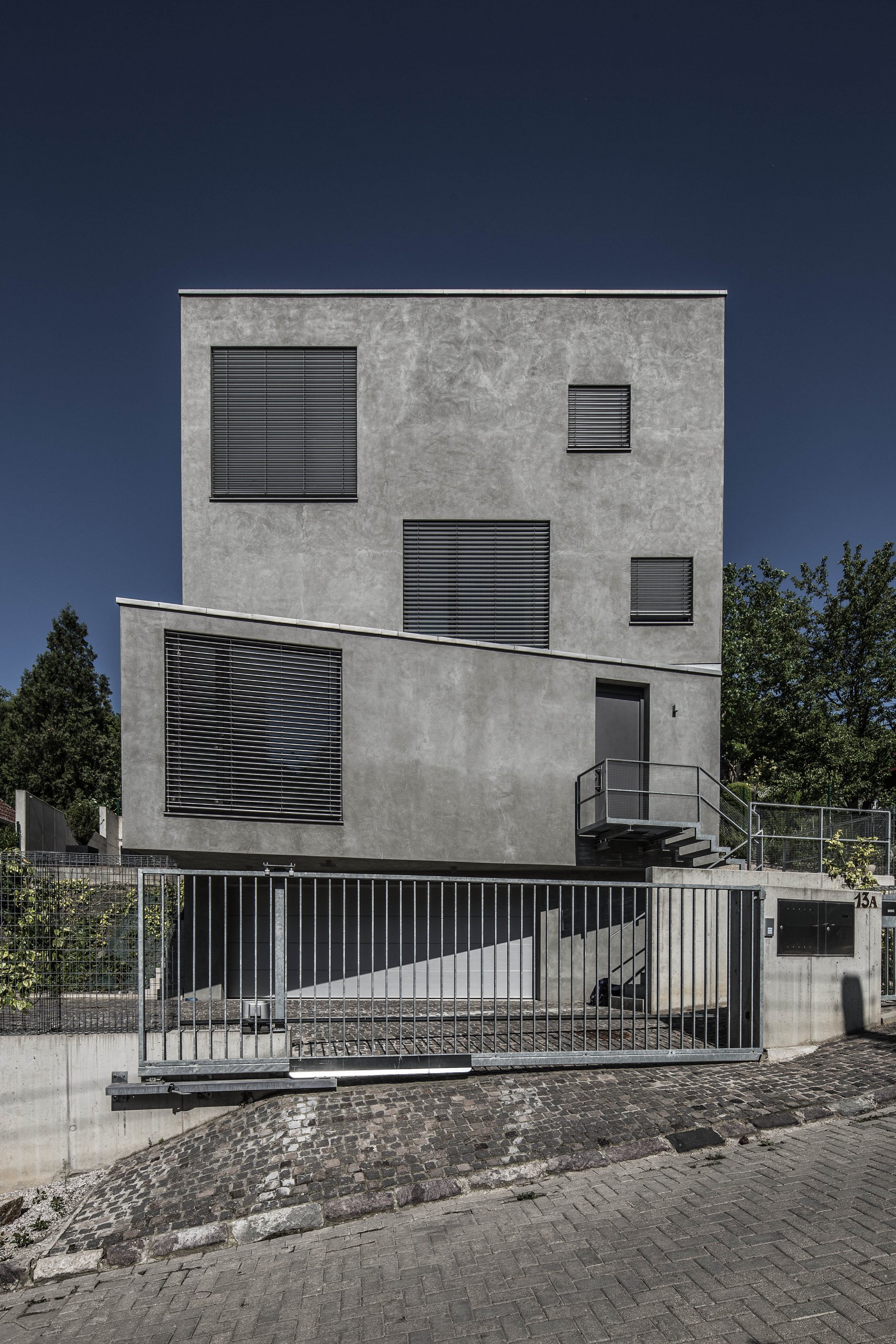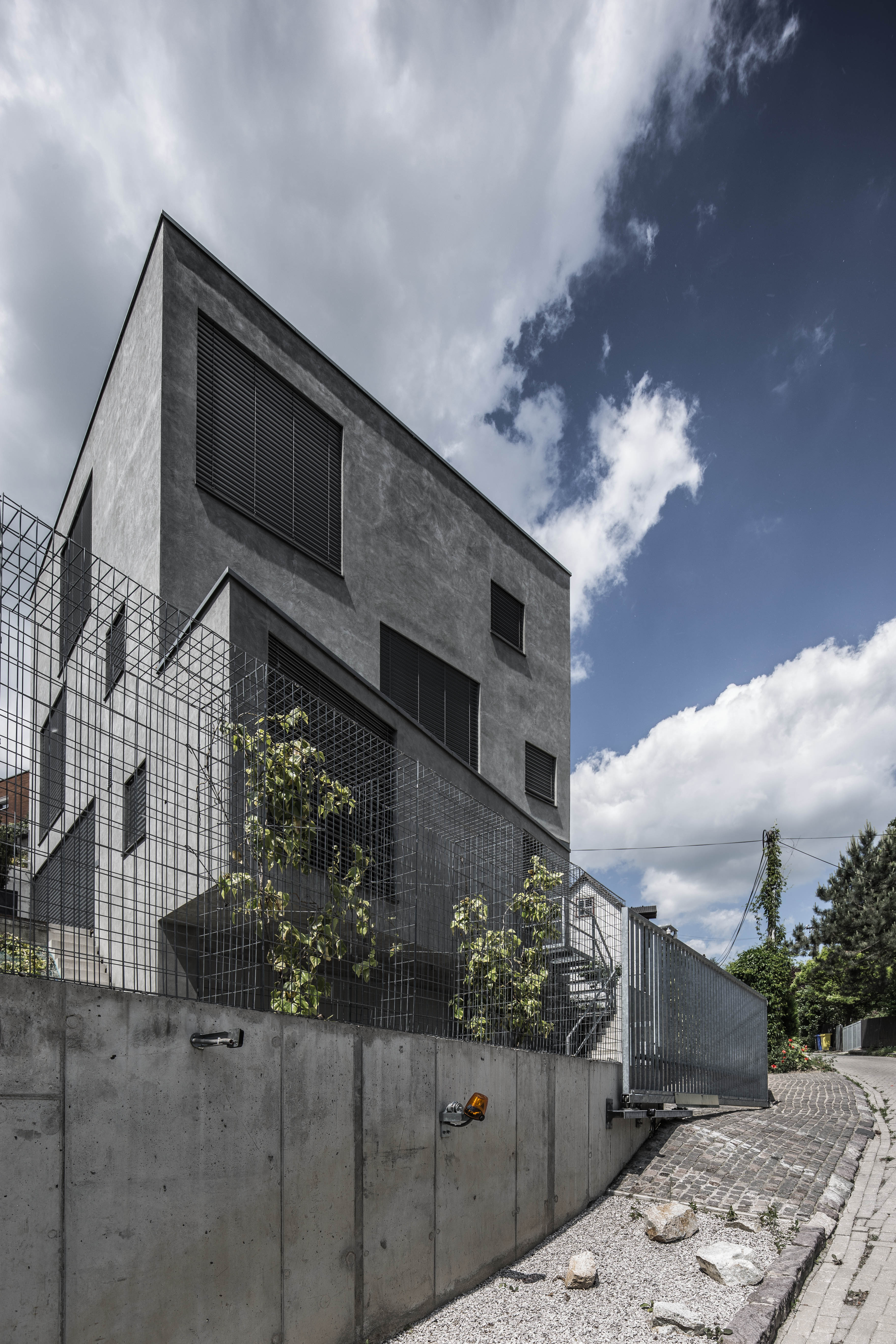 Dom bol realizovaný na strmom, k východu sa zvažujúcom svahu. Stojí v susedstve s rodinnými domami z rôzneho časového obdobia, ktoré spolu tvoria uličnú čiaru. Tu reflektujeme vysunutím podlažia do ulice. Prevažná časť objemu sa potom od uličnej fronty odkláňa smerom na juh s cieľom vytvorenia intímnejších priestorov (západná terasa vrezaná do svahu) bez vizuálneho kontaktu s panelákmi na kopci. Pôdorysný tvar sleduje maximálnu kompaktnosť a minimálnu pôdorysnú stopu. Vzhľadom na svahovitý terén je dom členený do štyroch podlaží tak, aby obytné miestnosti mohli byť orientované na východnú, južnú a západnú stranu. Tri podlažia majú priamy kontakt so záhradou a rozširujú tak intenzívne obytné využívanie záhrady. Osadenie domu eliminuje pohľad na panelové domy na severovýchodnej strane svahu a posilňuje atraktívne juhozápadné výhľady na časť Bratislavy a rakúskeho Hainburgu.