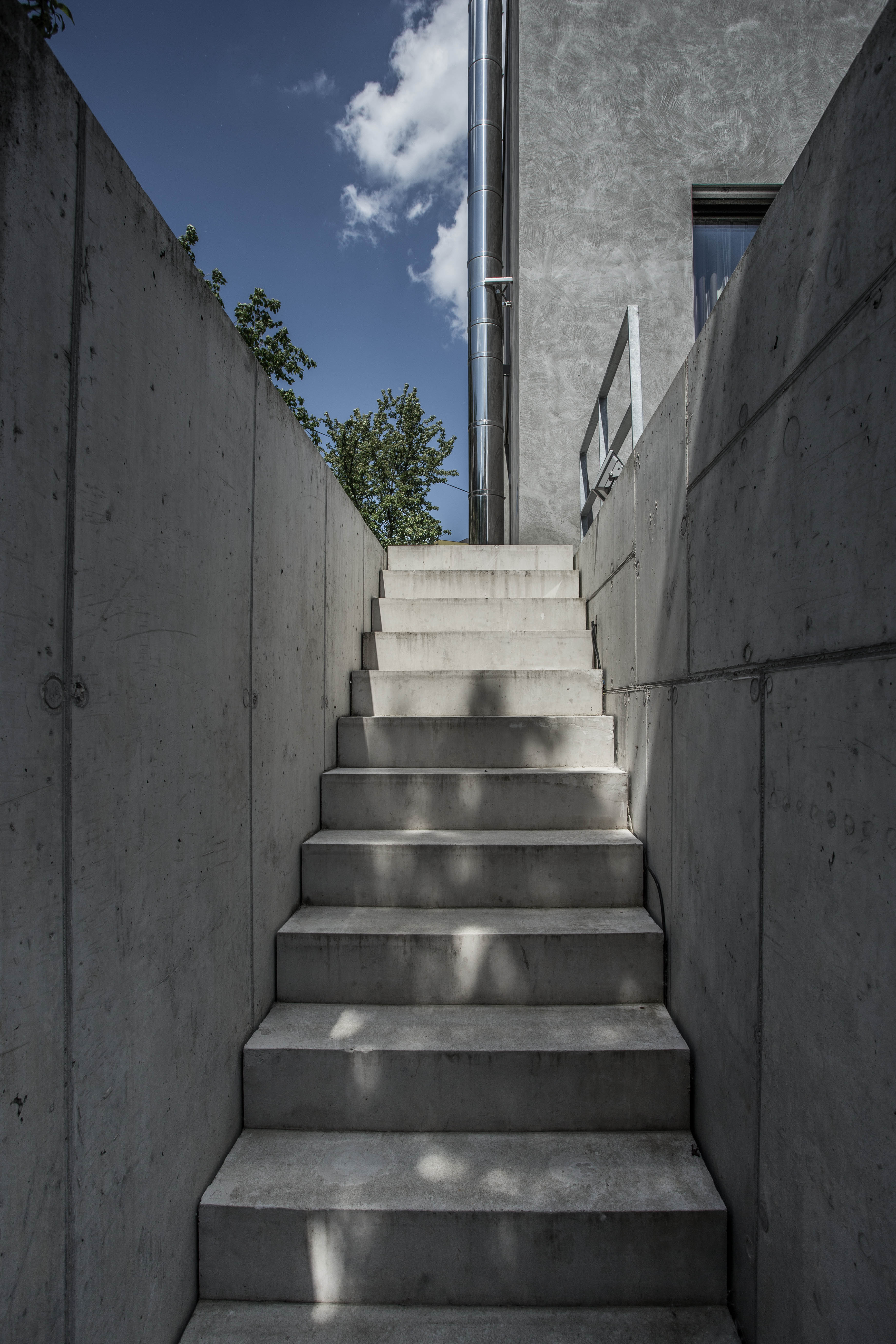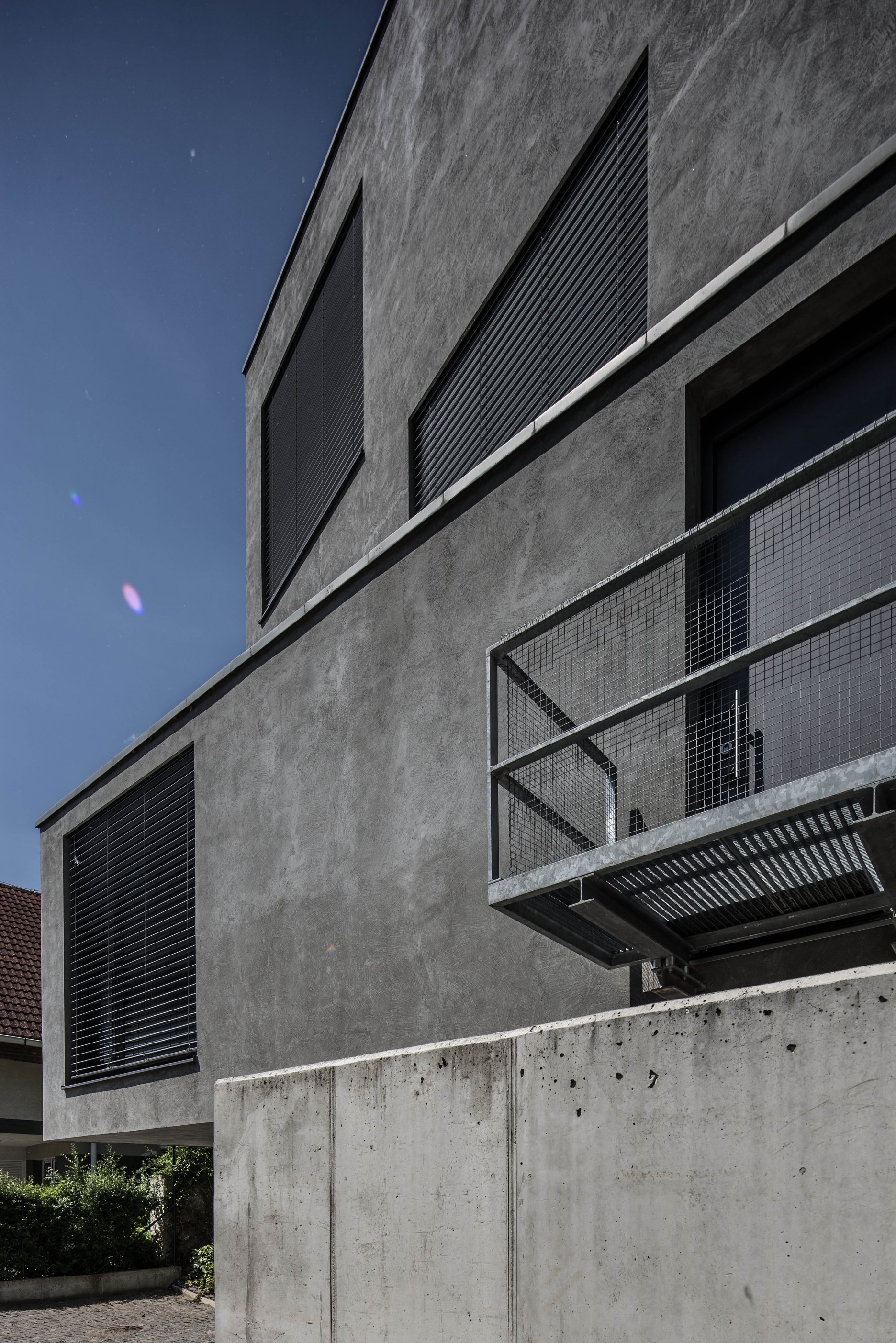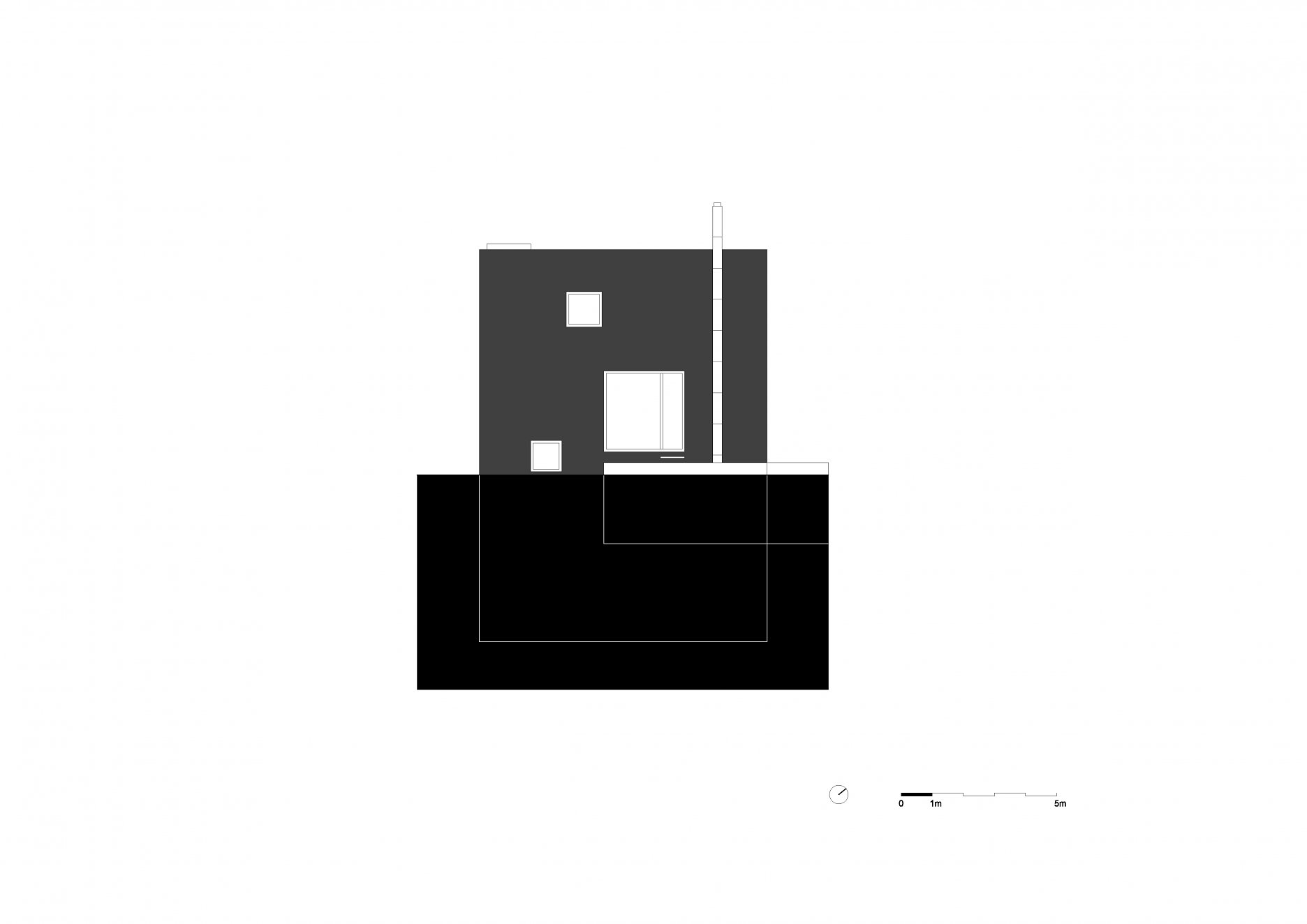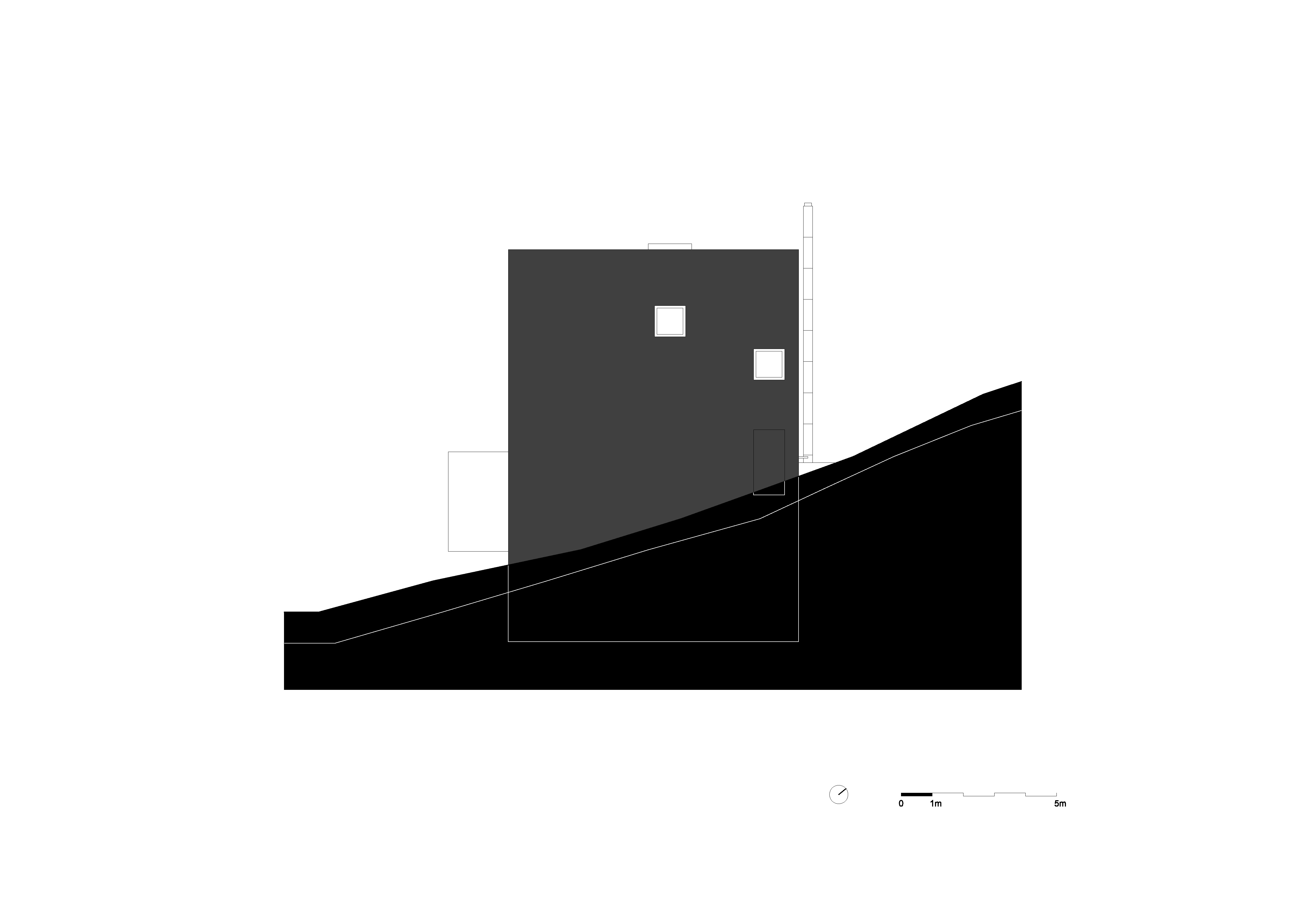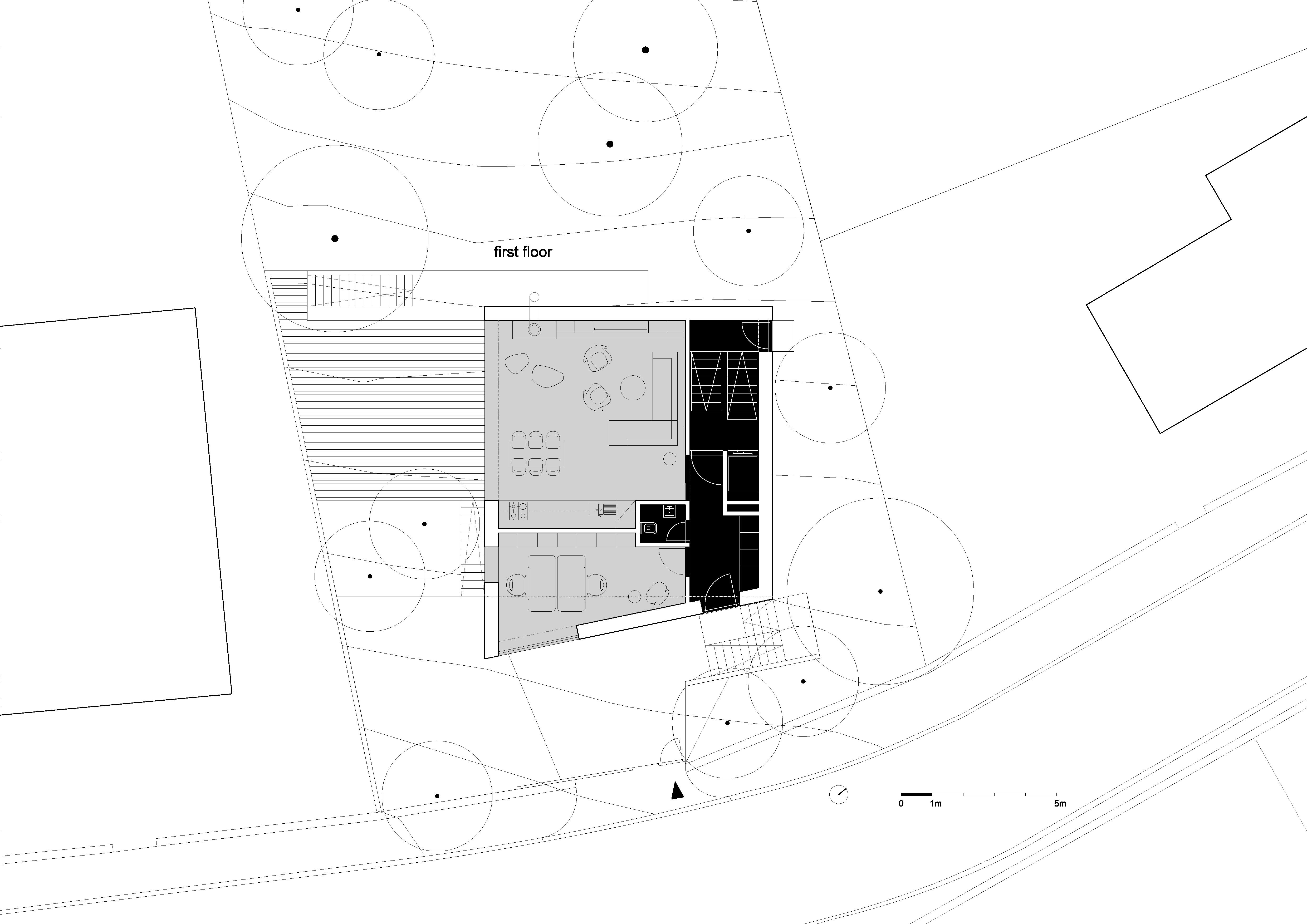 Dom bol realizovaný na strmom, k východu sa zvažujúcom svahu. Stojí v susedstve s rodinnými domami z rôzneho časového obdobia, ktoré spolu tvoria uličnú čiaru. Tu reflektujeme vysunutím podlažia do ulice. Prevažná časť objemu sa potom od uličnej fronty odkláňa smerom na juh s cieľom vytvorenia intímnejších priestorov (západná terasa vrezaná do svahu) bez vizuálneho kontaktu s panelákmi na kopci. Pôdorysný tvar sleduje maximálnu kompaktnosť a minimálnu pôdorysnú stopu. Vzhľadom na svahovitý terén je dom členený do štyroch podlaží tak, aby obytné miestnosti mohli byť orientované na východnú, južnú a západnú stranu. Tri podlažia majú priamy kontakt so záhradou a rozširujú tak intenzívne obytné využívanie záhrady. Osadenie domu eliminuje pohľad na panelové domy na severovýchodnej strane svahu a posilňuje atraktívne juhozápadné výhľady na časť Bratislavy a rakúskeho Hainburgu.