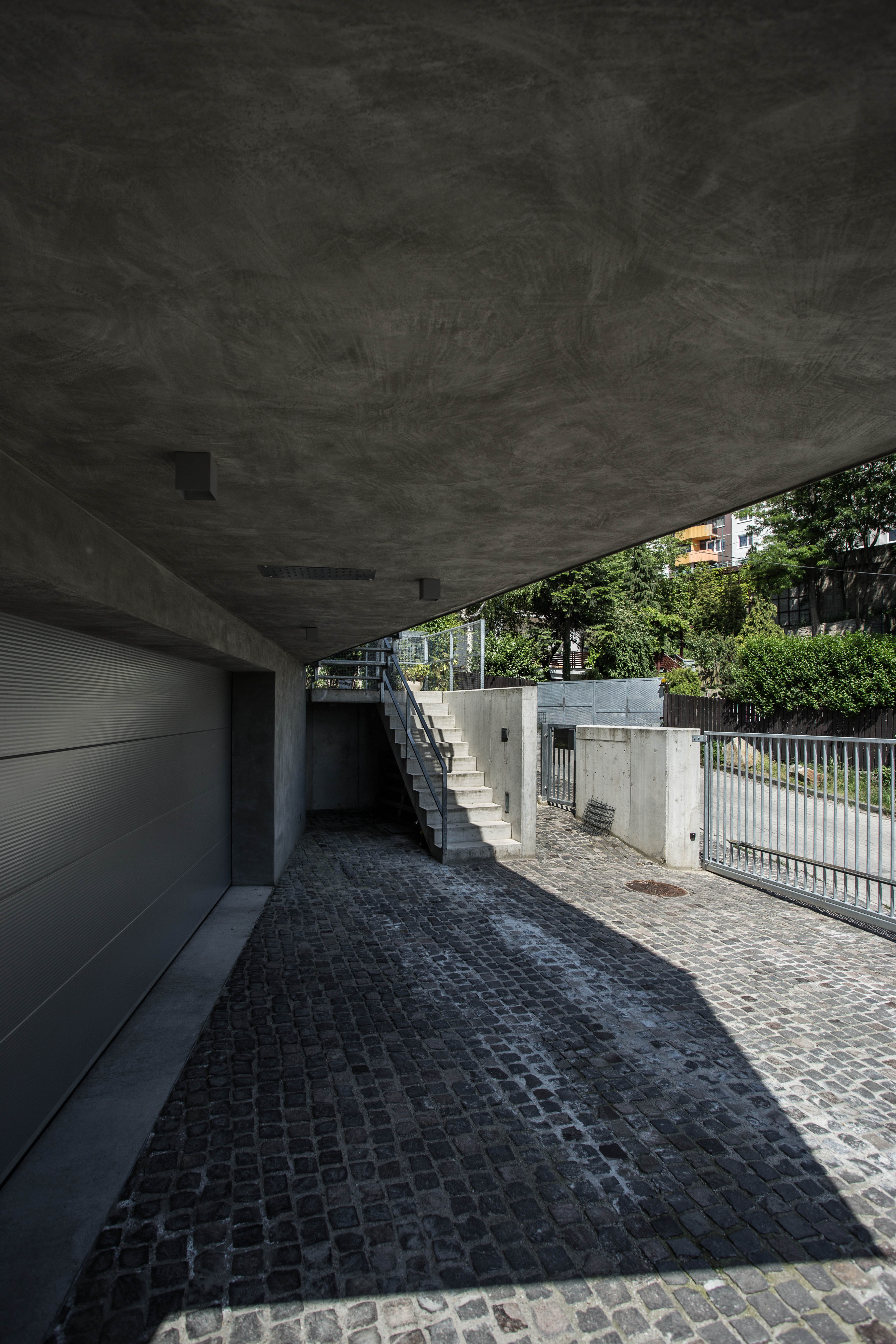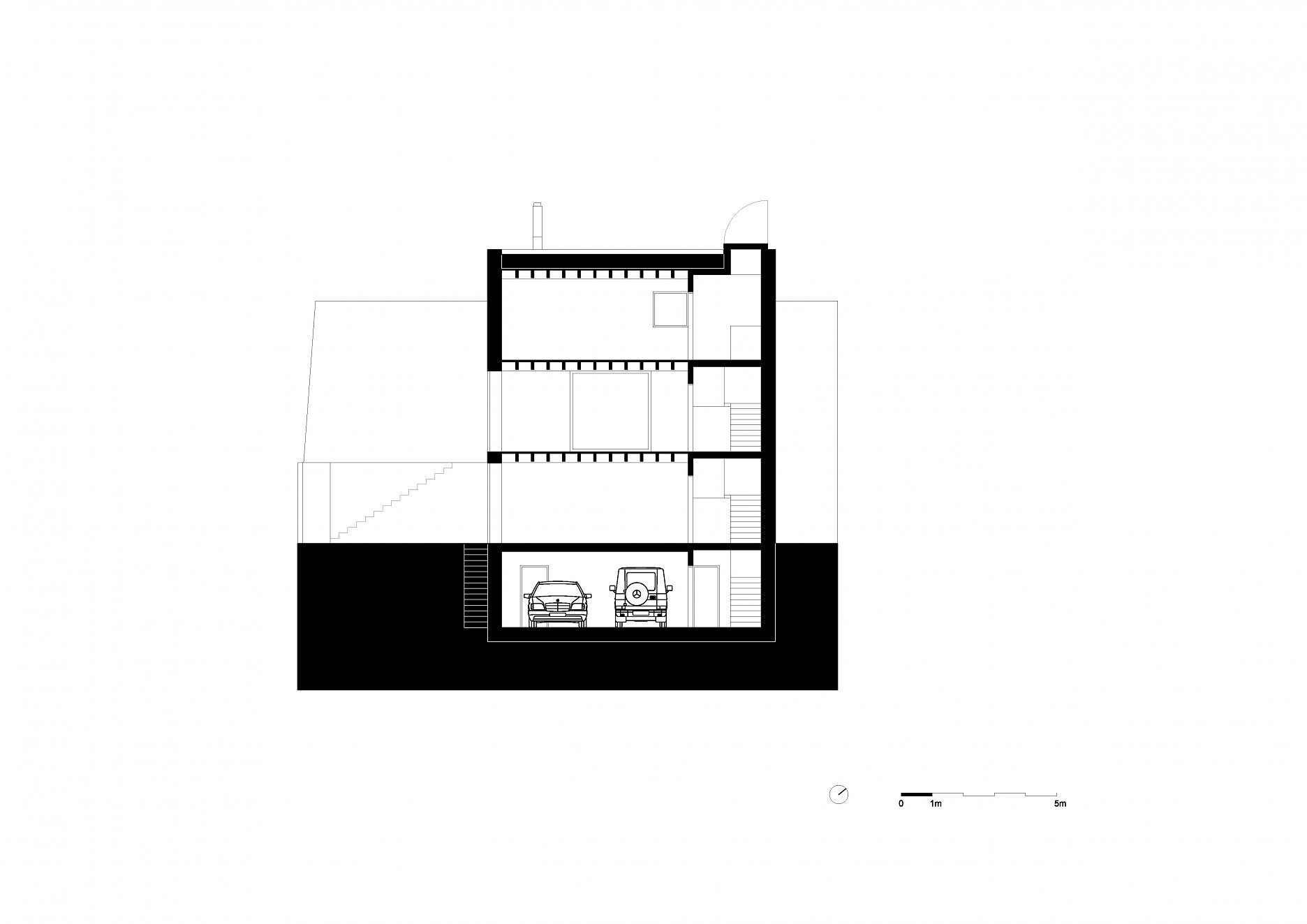 V najnižšom podlaží, priamo prístupnom z ulice, sa nachádza garáž a technicko-skladové zázemie domu.