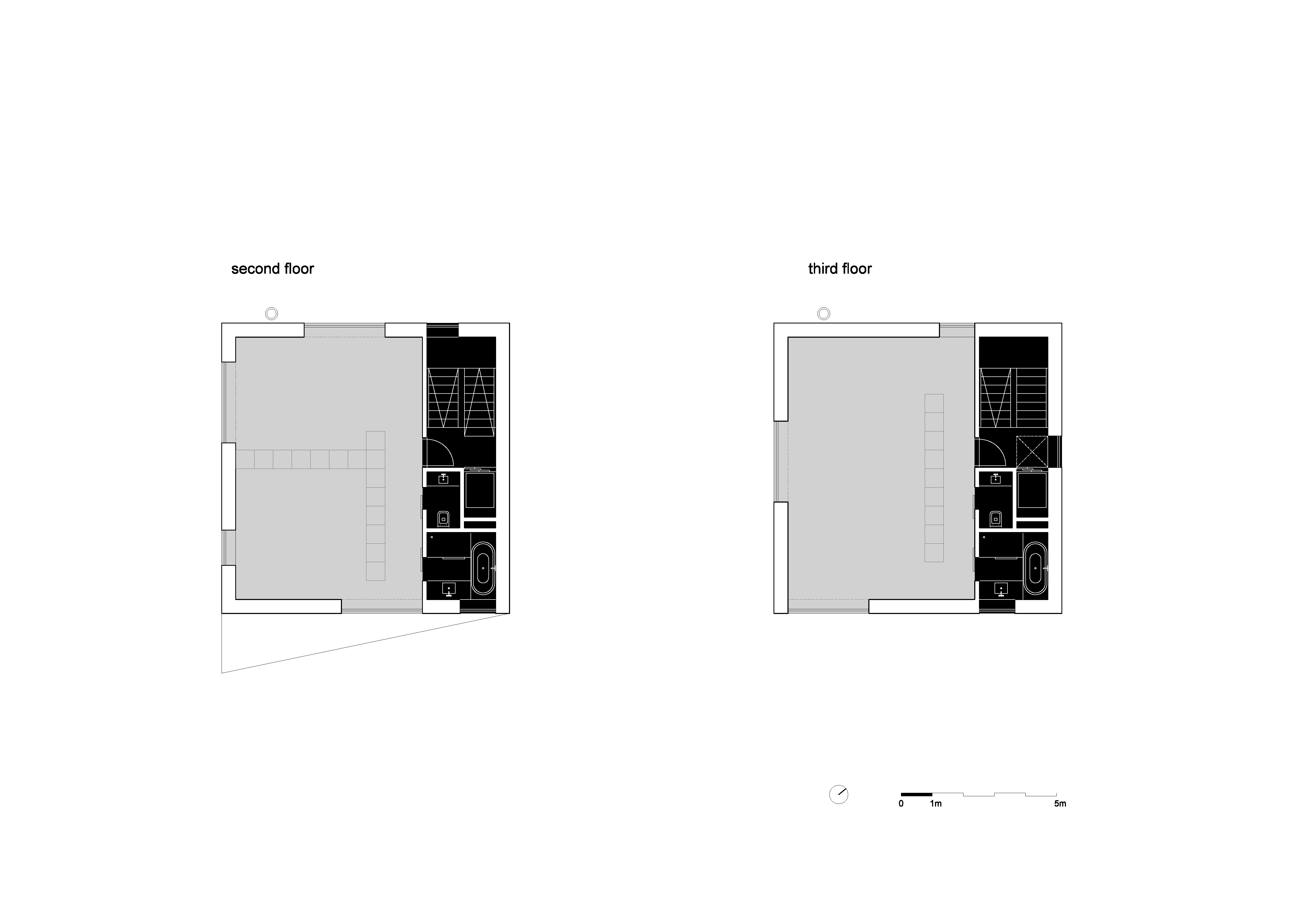 Priestorové usporiadanie nasledujúcich podlaží je kombináciou vloženého komunikačno-hygienického jadra pozdĺž severnej fasády a otvoreného obytného “veľkopriestoru” s možnosťou variabilného členenia skriňopriečkami. Druhé nadzemné podlažie, ktoré je zároveň vstupným podlažím, variuje tento koncept o vysunutú hmotu pracovne. Tá slúži ako kancelária s možnosťou priameho prístupu zákazníkov.