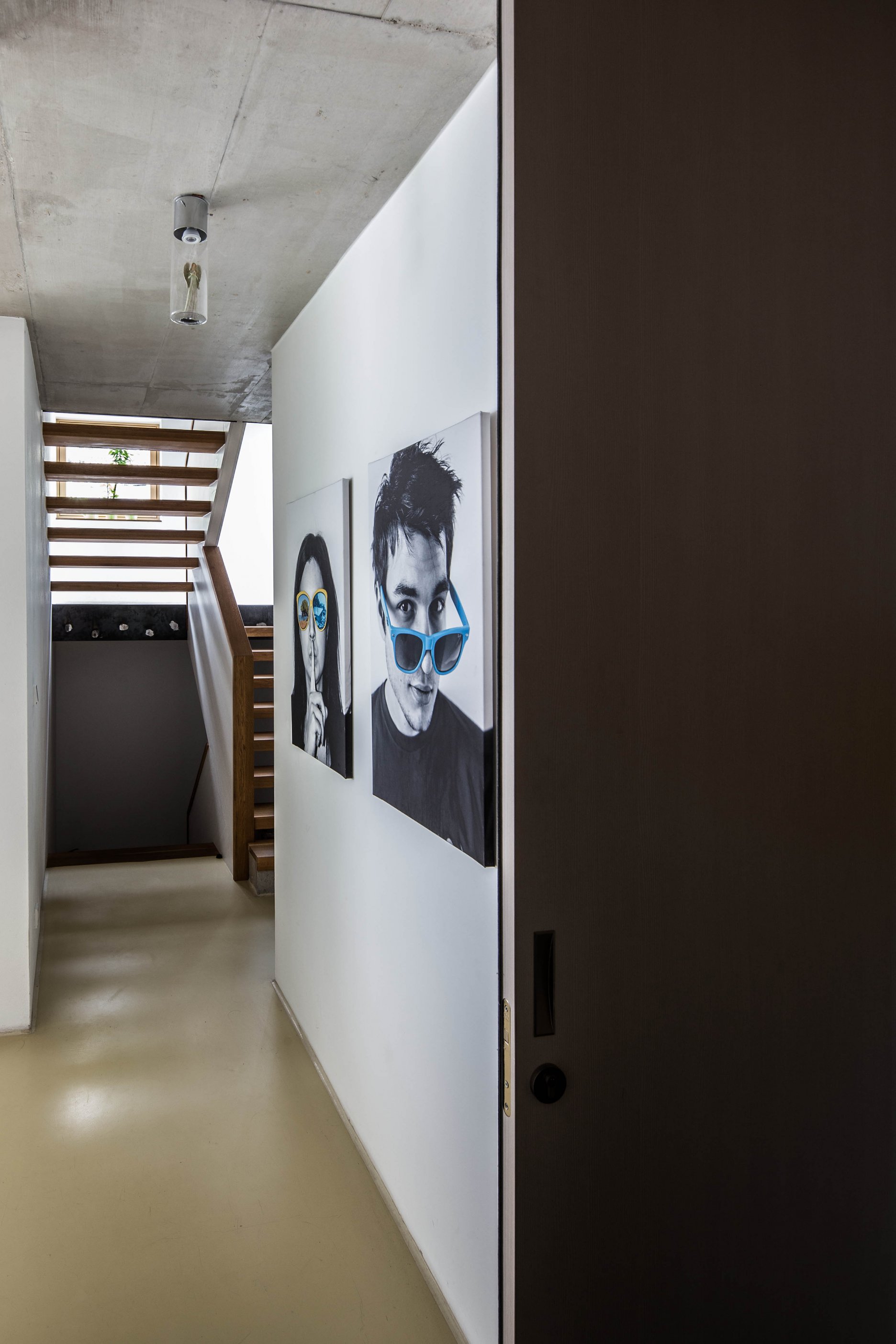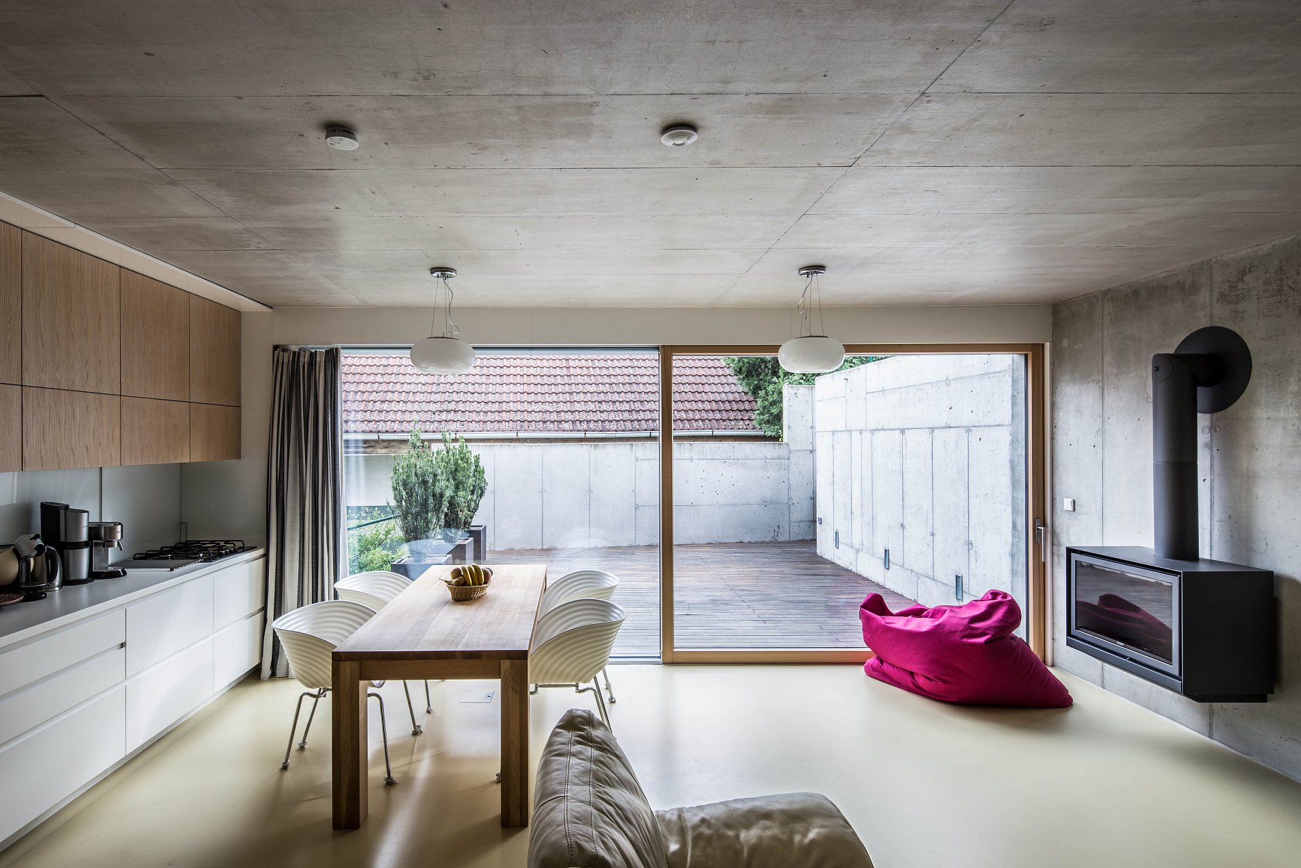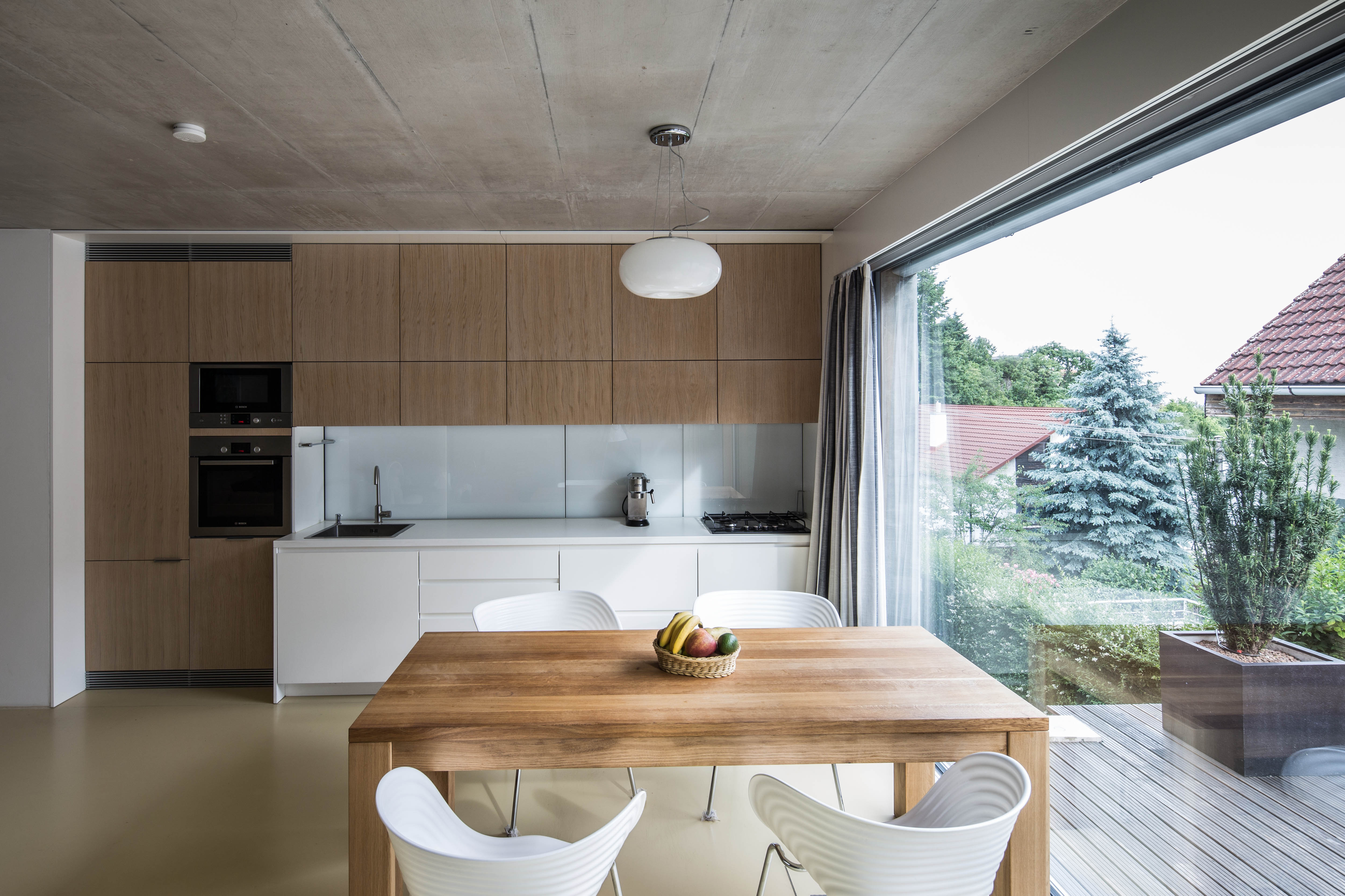 Riešenie dispozície a jej členenie skriňopriečkami umožňuje rôzne proporcie členenia podlaží. Samostatný vstup zo záhrady na severnej strane a komunikačné jadro pripravené na osadenie výťahu, priamo počíta s viacgeneračným využívaním v blízkej budúcnosti. Dom je realizovaný ako kombinácia oceľobetónu a murovaných tehlových častí. Všetky stropy a niektoré steny sú v interiéri ponechané ako pohľadové betónové. Podlahy v celom dome sú liate živicové v svetložltej farbe. Časť nábytku a zariadenia je vyrobená na mieru, časť pochádza z predchádzajúceho bývania majiteľov a počíta s obmenou v budúcnosti.