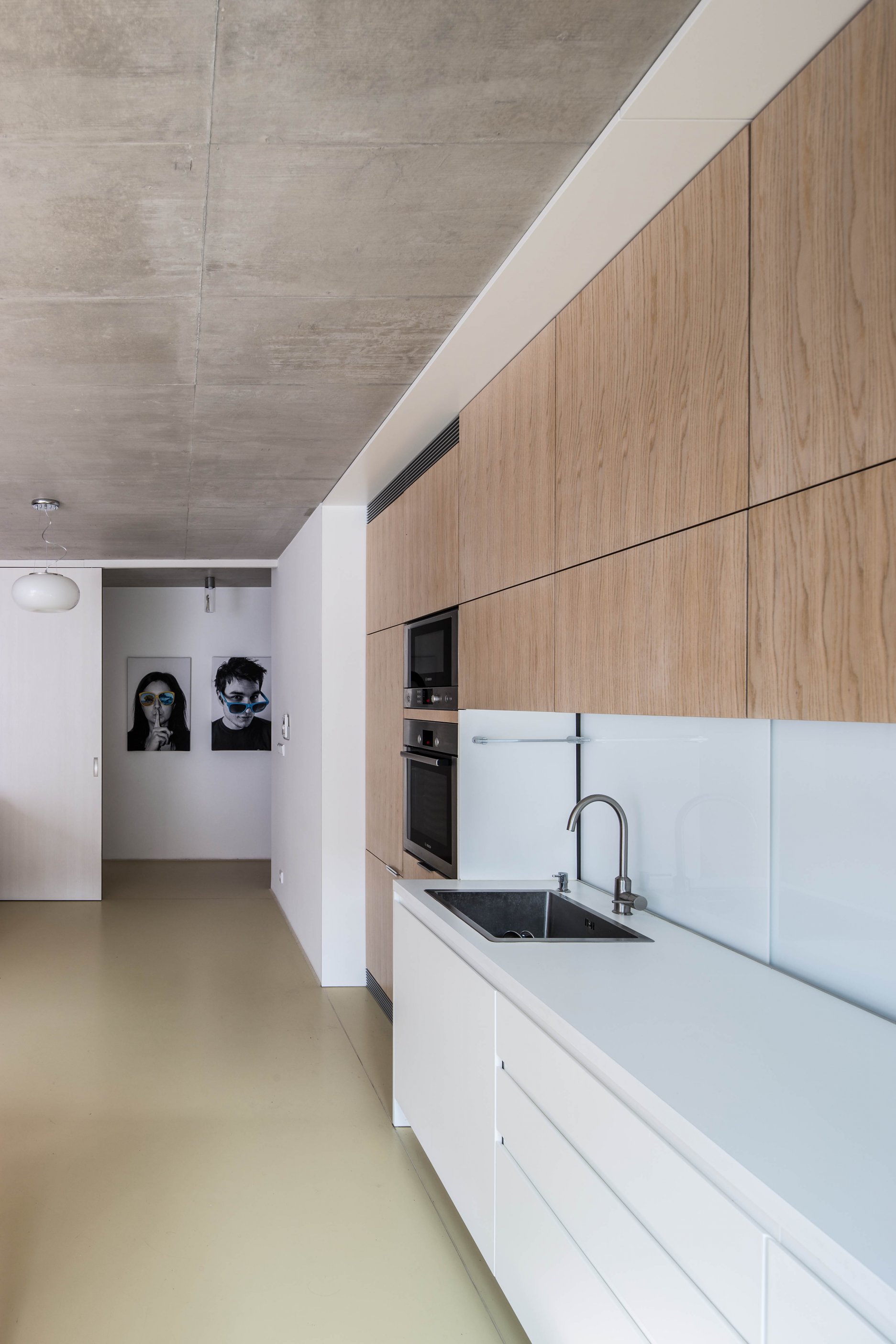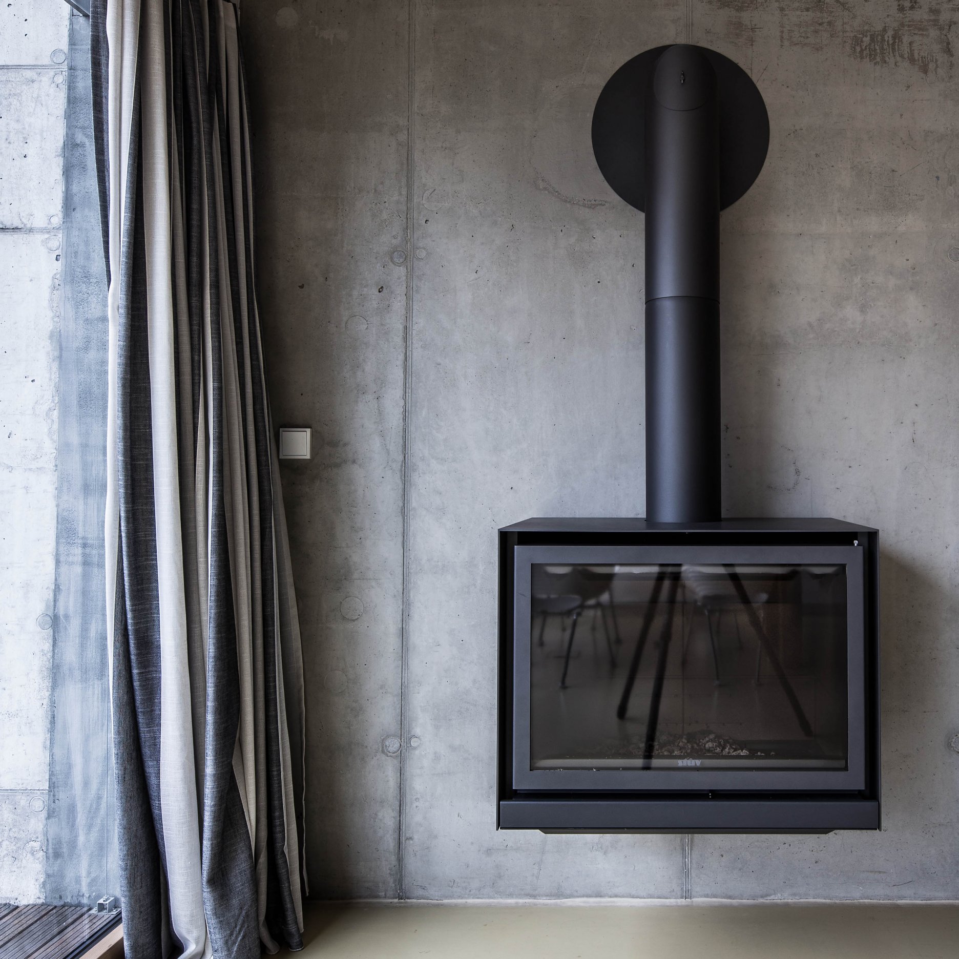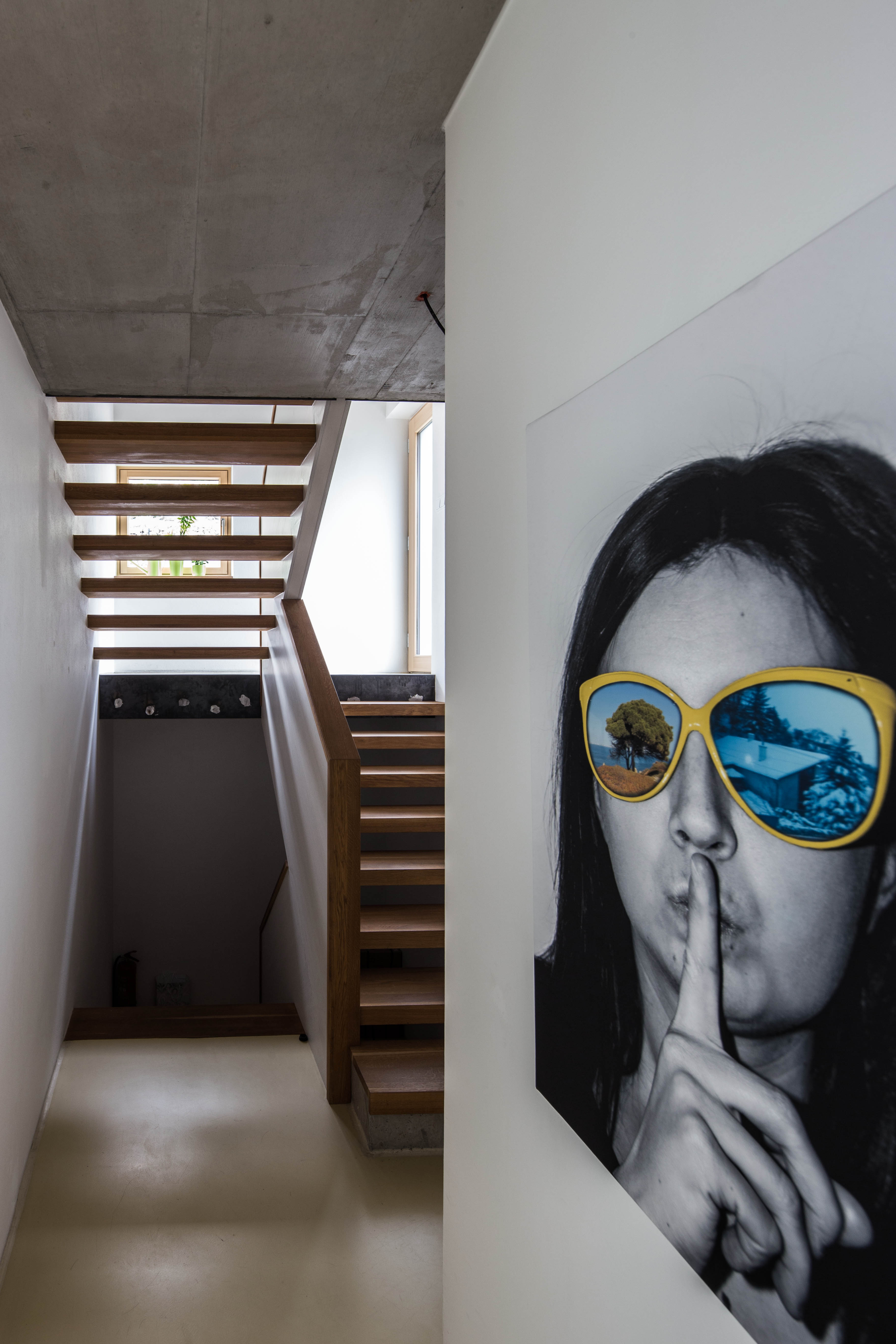 Riešenie dispozície a jej členenie skriňopriečkami umožňuje rôzne proporcie členenia podlaží. Samostatný vstup zo záhrady na severnej strane a komunikačné jadro pripravené na osadenie výťahu, priamo počíta s viacgeneračným využívaním v blízkej budúcnosti. Dom je realizovaný ako kombinácia oceľobetónu a murovaných tehlových častí. Všetky stropy a niektoré steny sú v interiéri ponechané ako pohľadové betónové. Podlahy v celom dome sú liate živicové v svetložltej farbe. Časť nábytku a zariadenia je vyrobená na mieru, časť pochádza z predchádzajúceho bývania majiteľov a počíta s obmenou v budúcnosti.