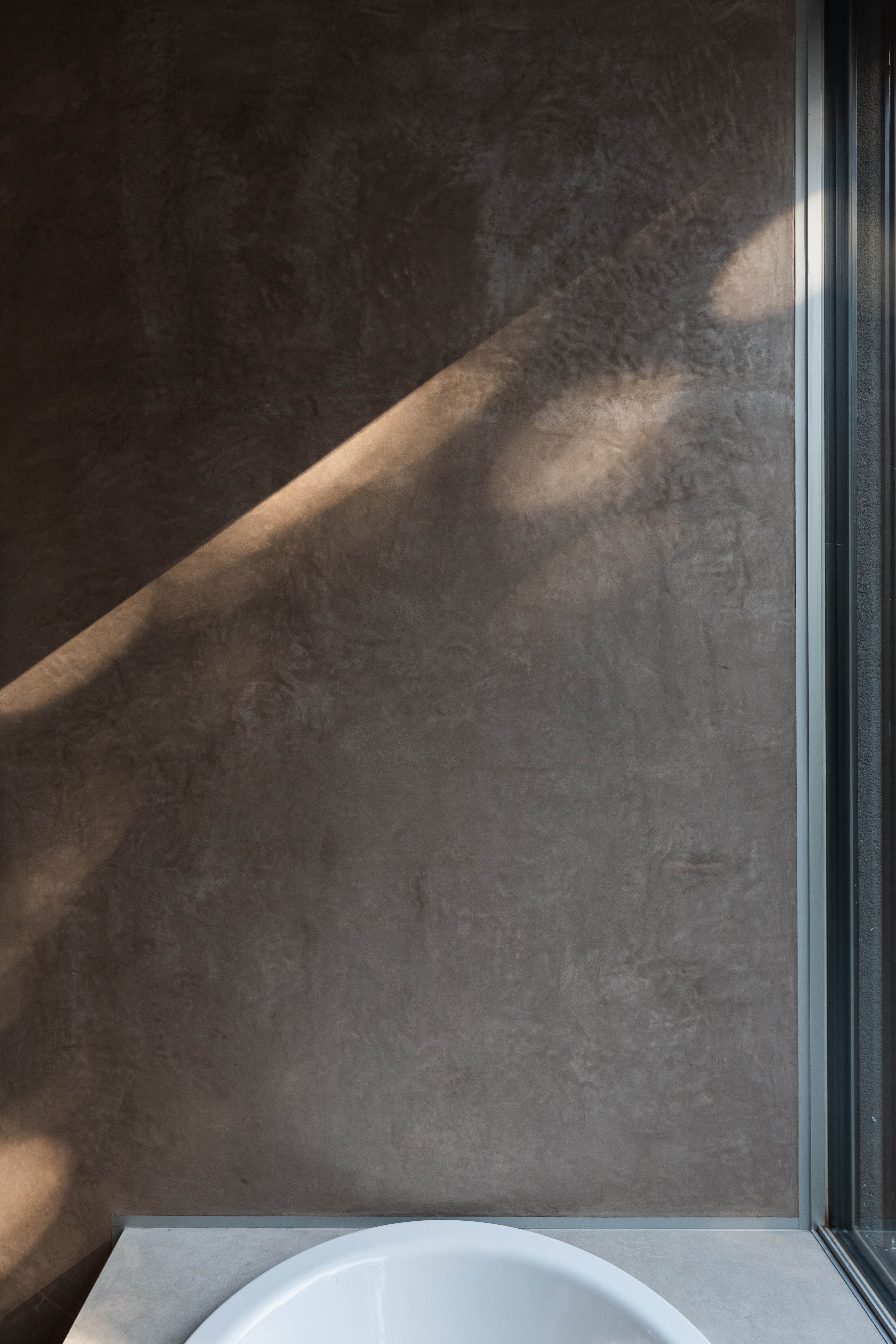 Minimalizovaná materiálová skladba - kov, betón, drevo, sklo a čierna omietka - kladie dôraz na jednoduchosť a trvácnosť a najmä ľahkú údržbu.