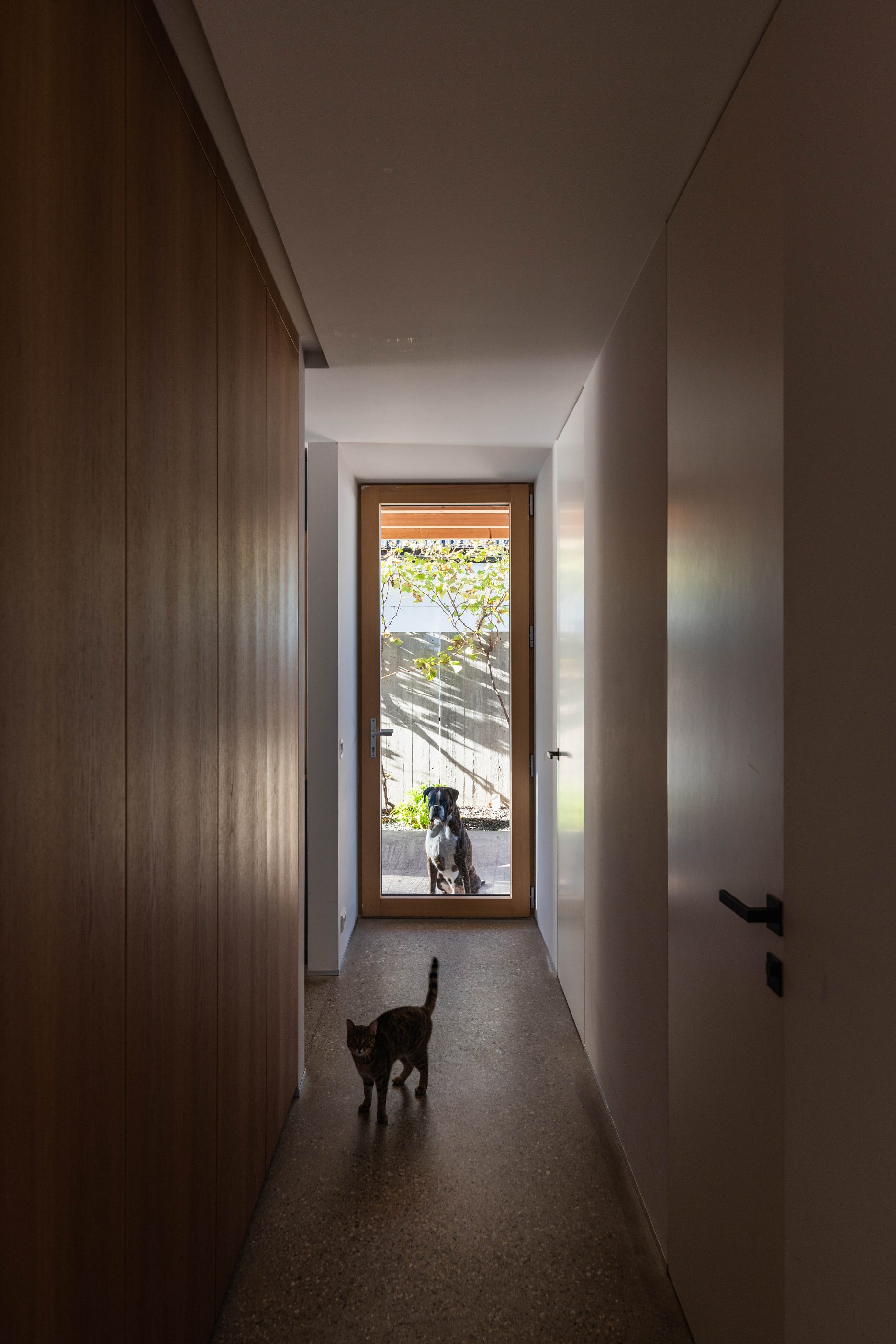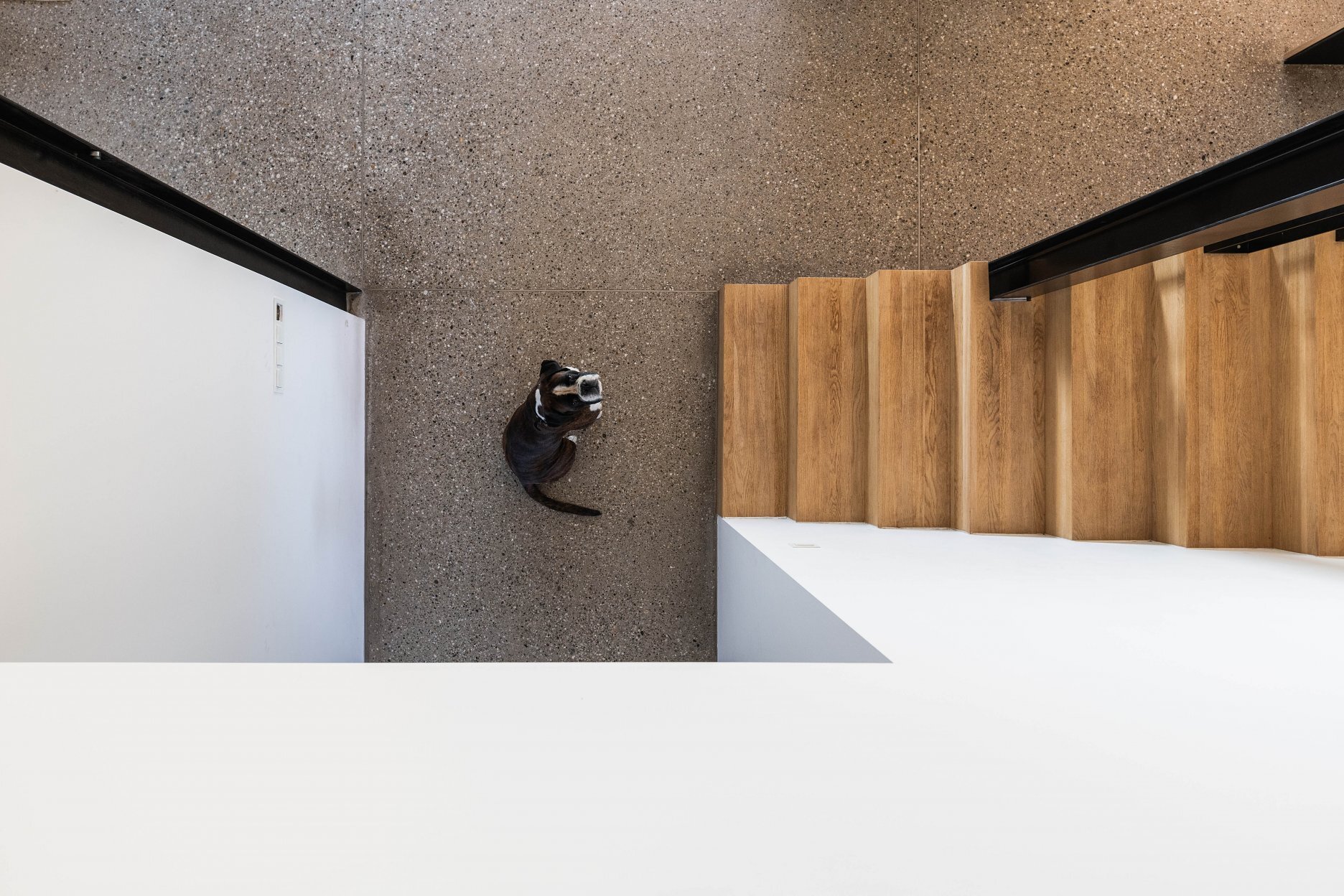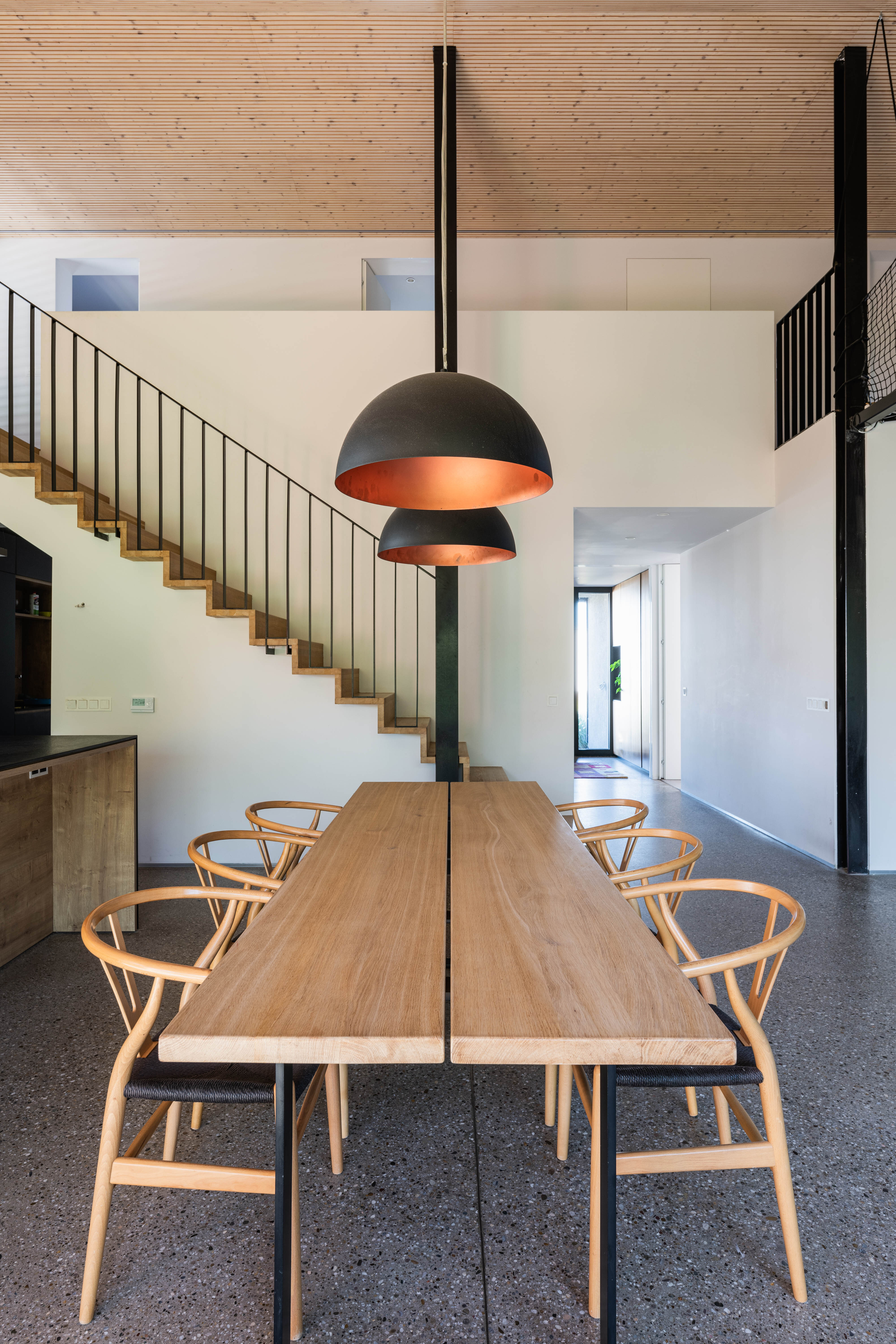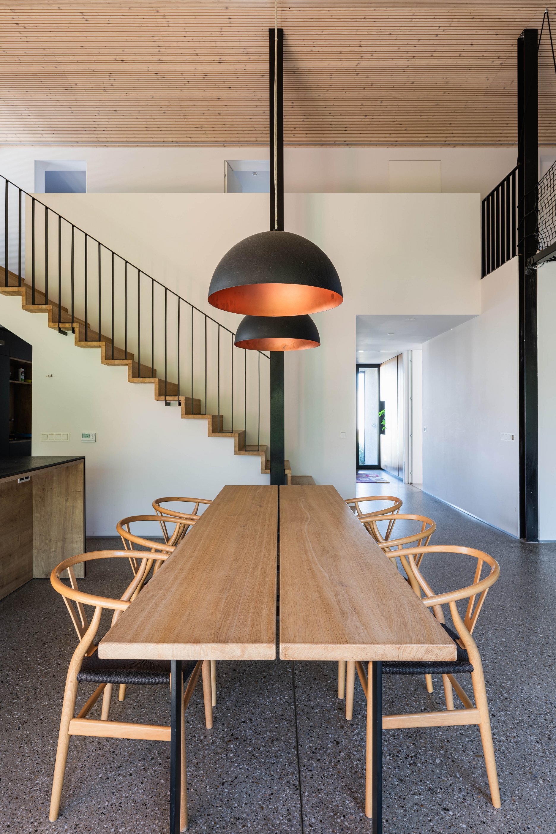 Homogénna podlaha z brúseného betónu na celom prízemí bola prirodzená voľba, keďže dvere domu sú stále otvorené pre častý pohyb detí a zvierat. Potreba naozaj trvácneho povrchu s jednoduchou údržbou patrila medzi priority.