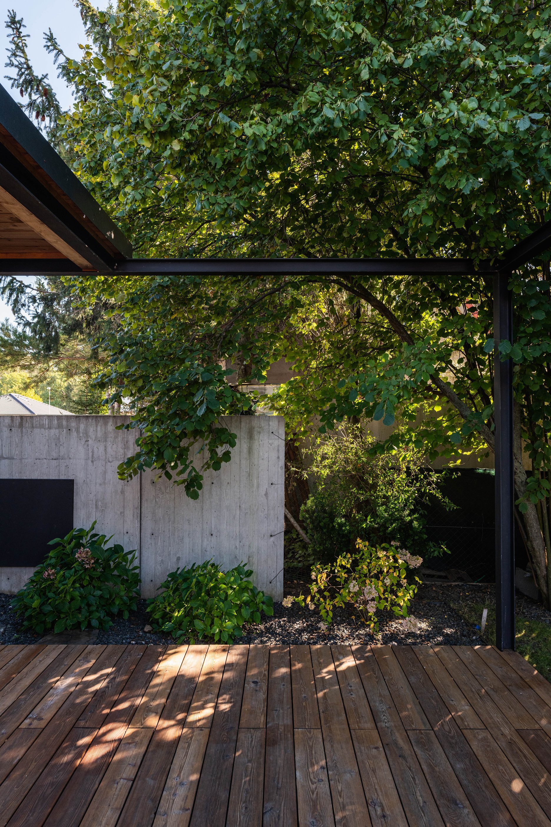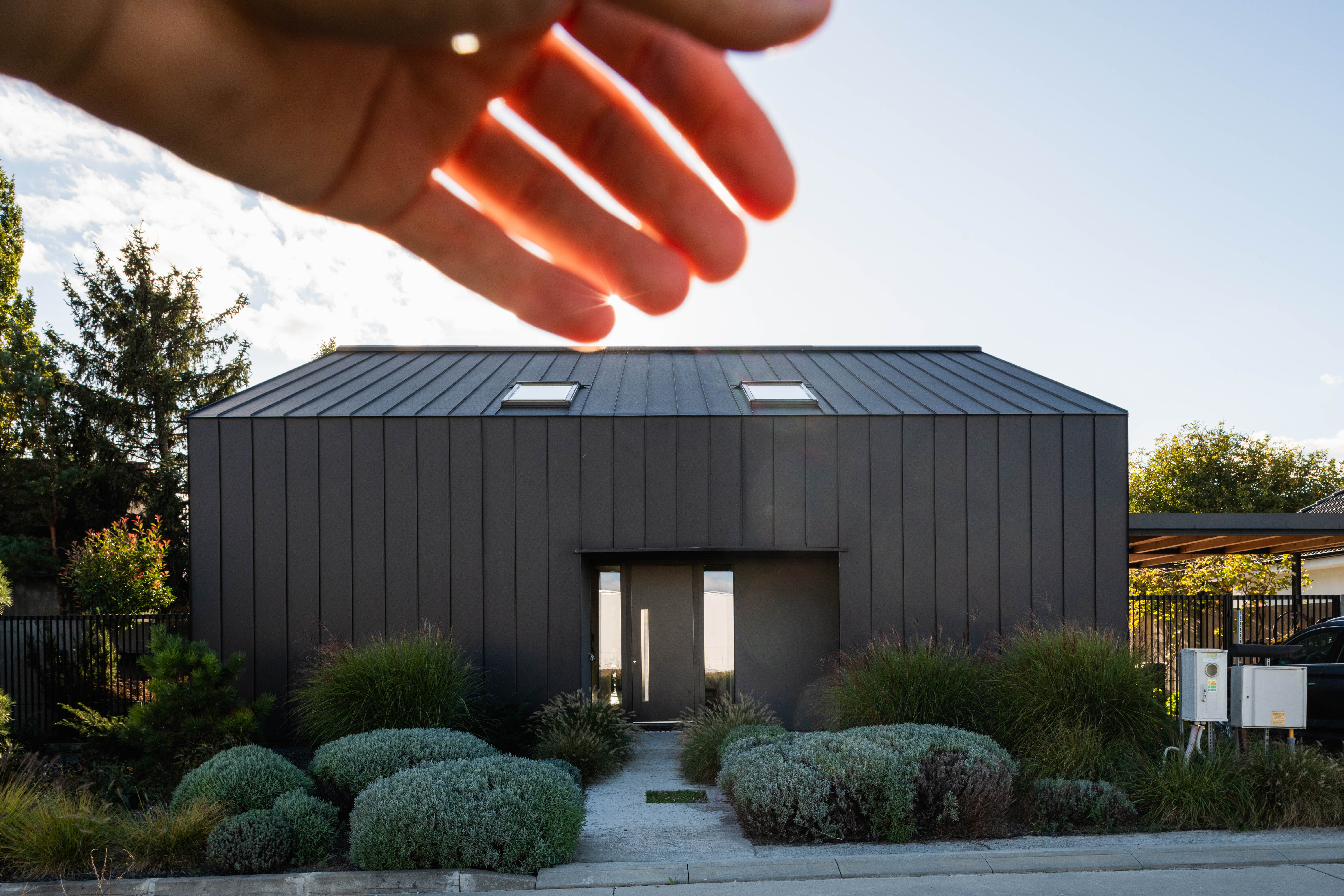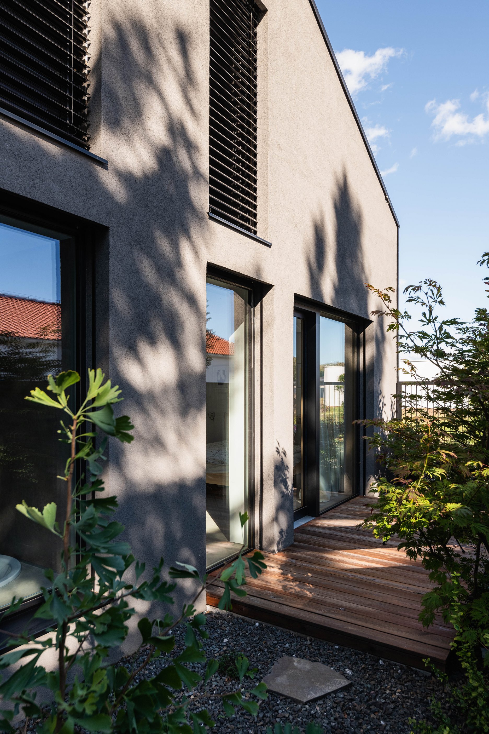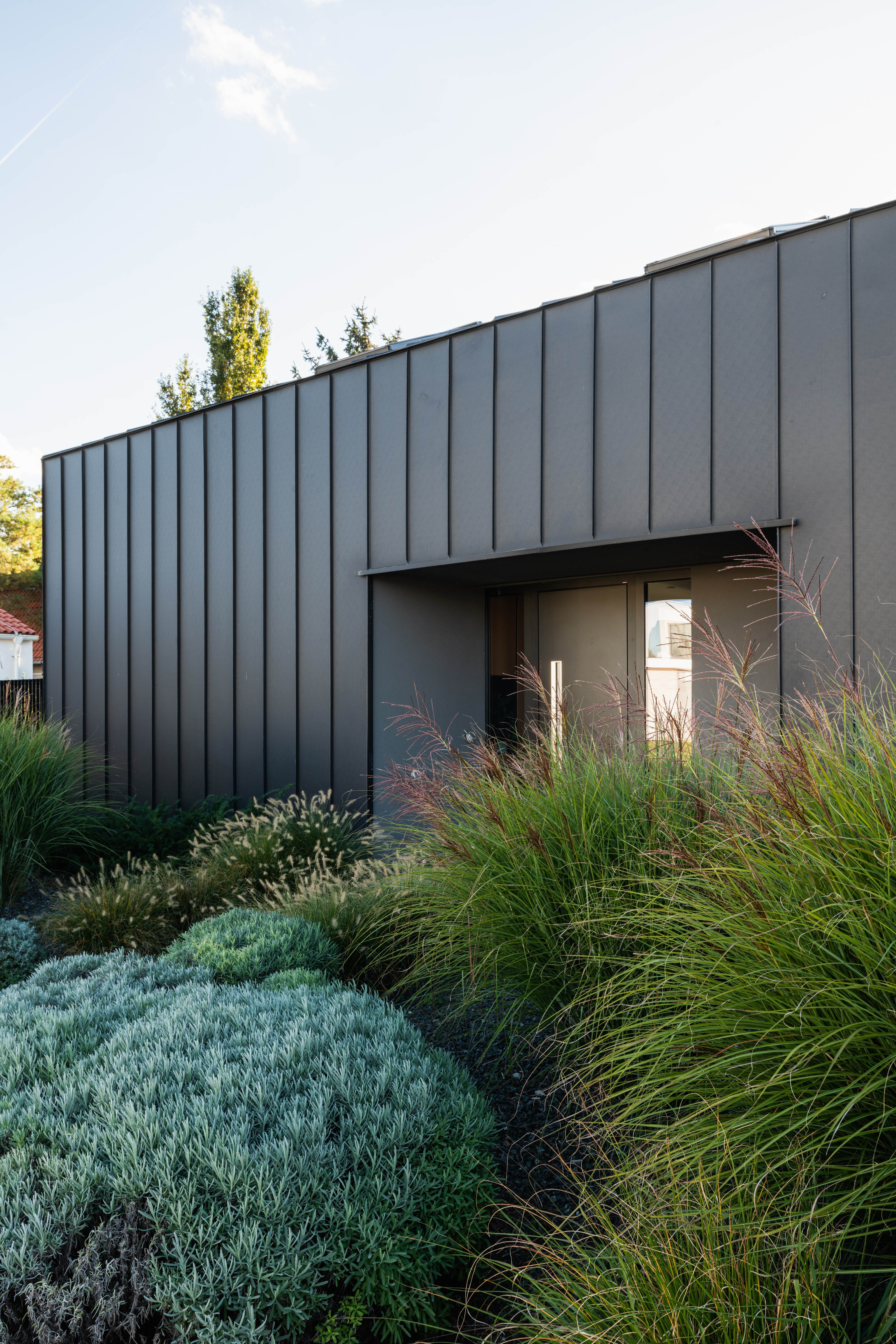 Dom je opláštený čiernou hliníkovou fasádou. Uličná fasáda bez okien zachováva súkromie obyvateľov.