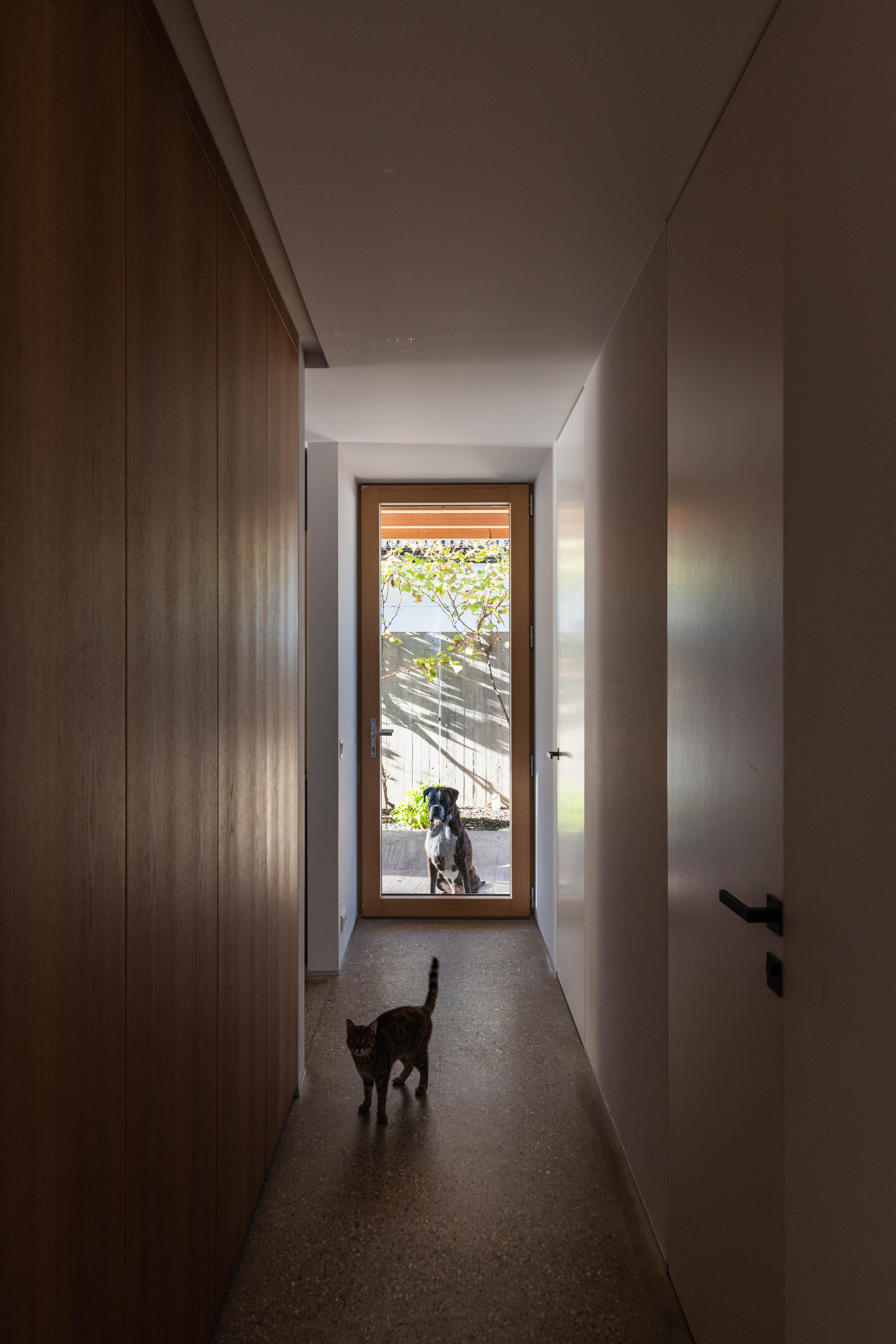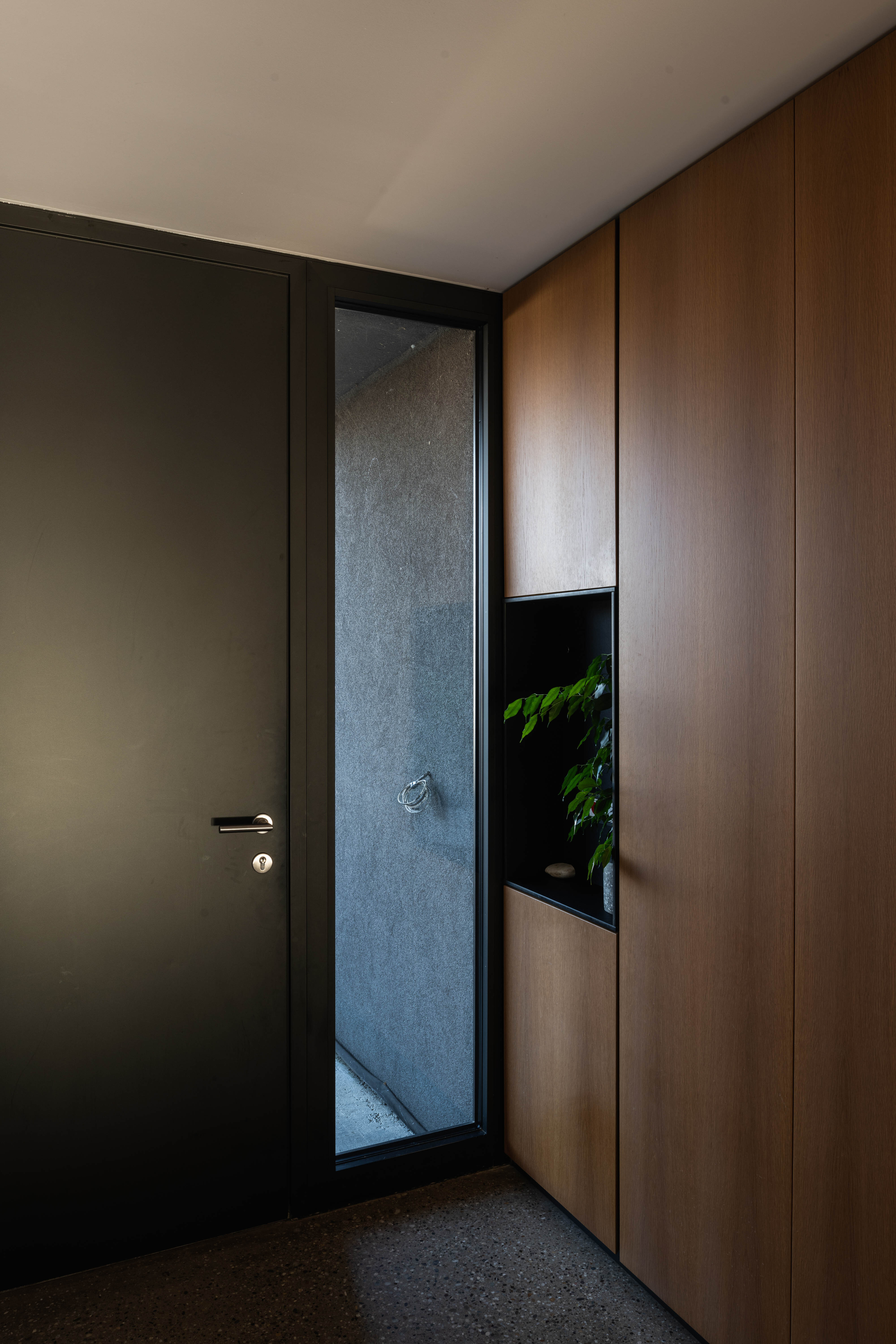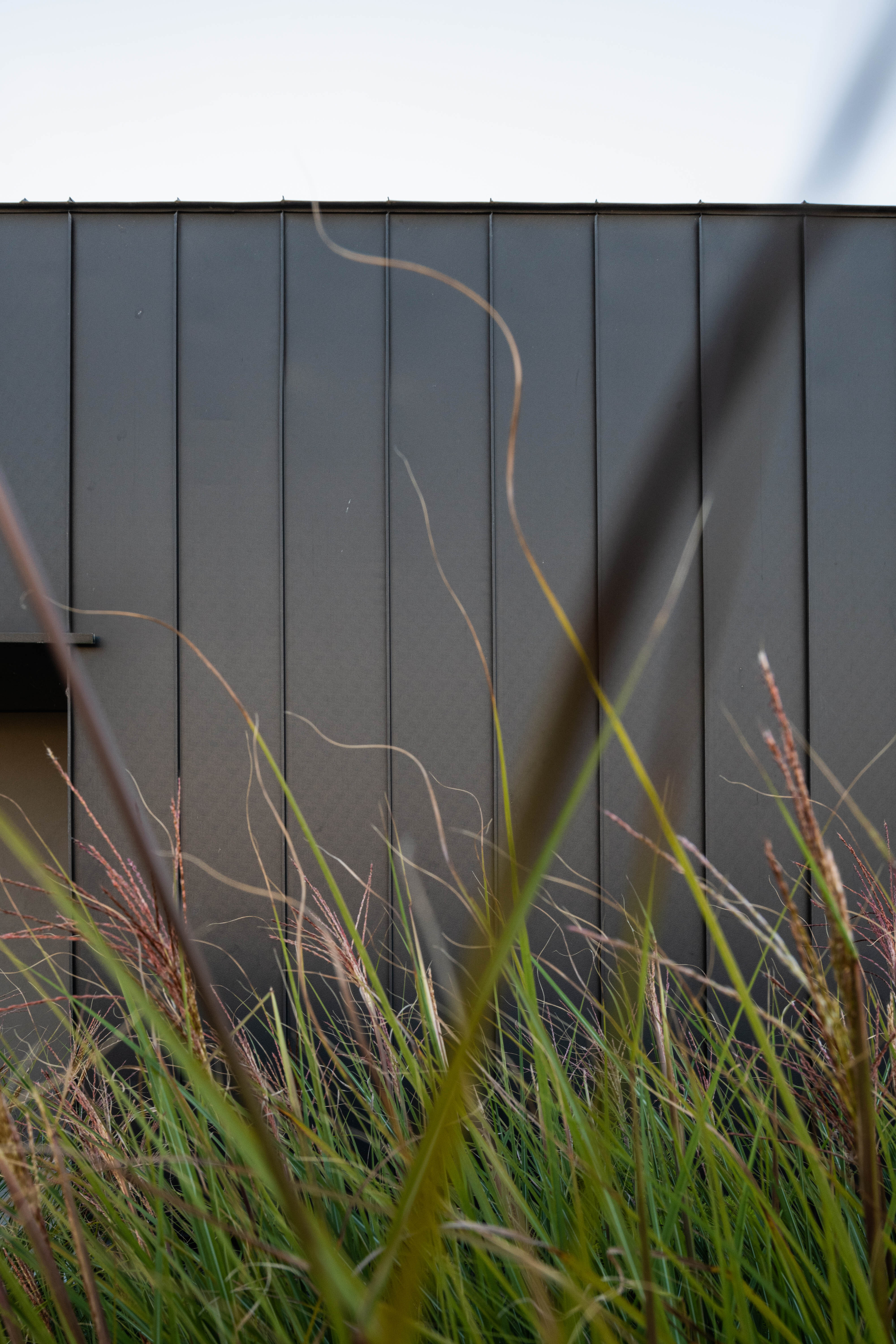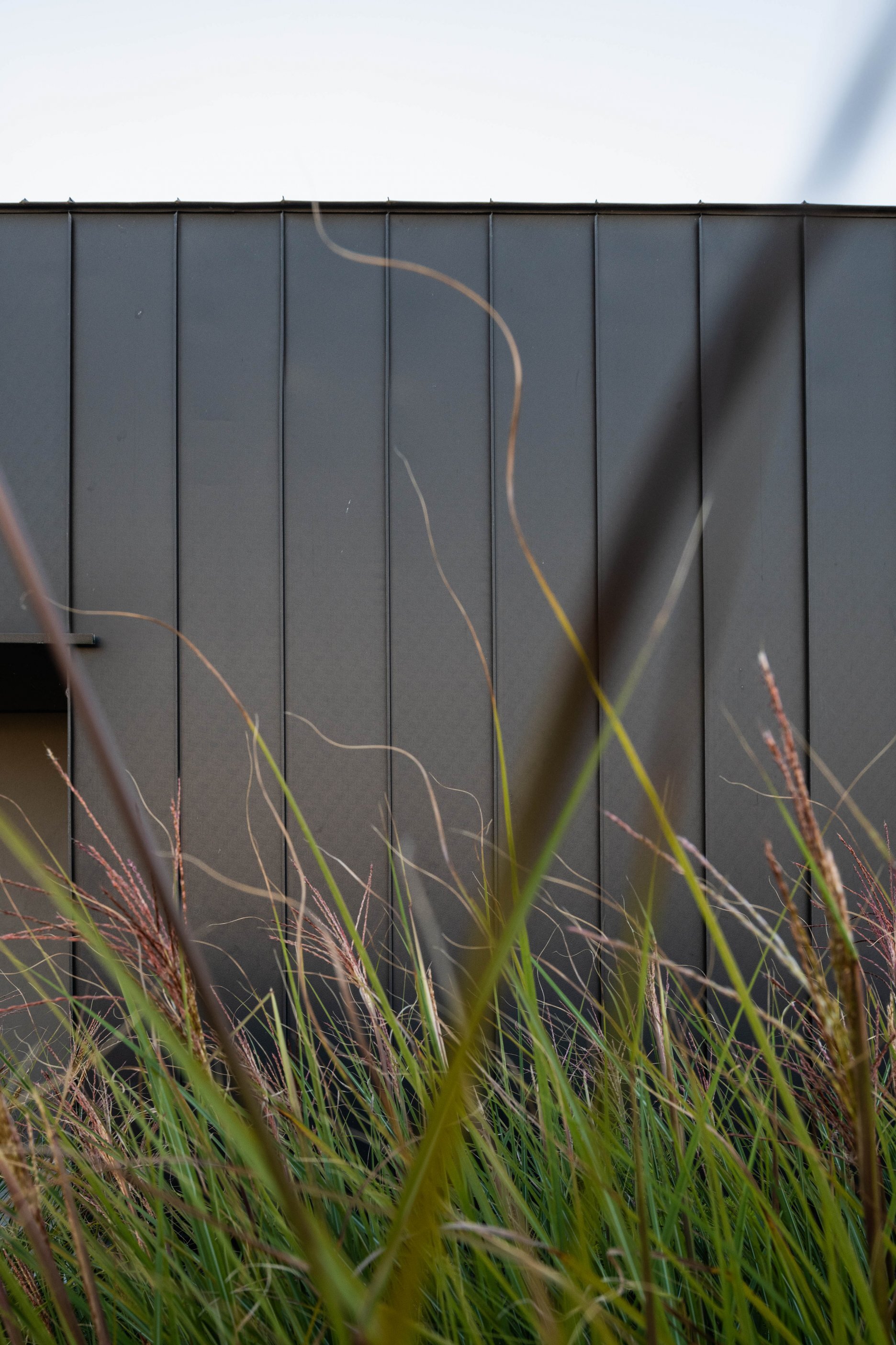 Dom je opláštený čiernou hliníkovou fasádou. Uličná fasáda bez okien zachováva súkromie obyvateľov.