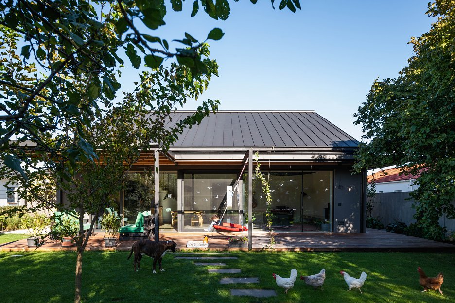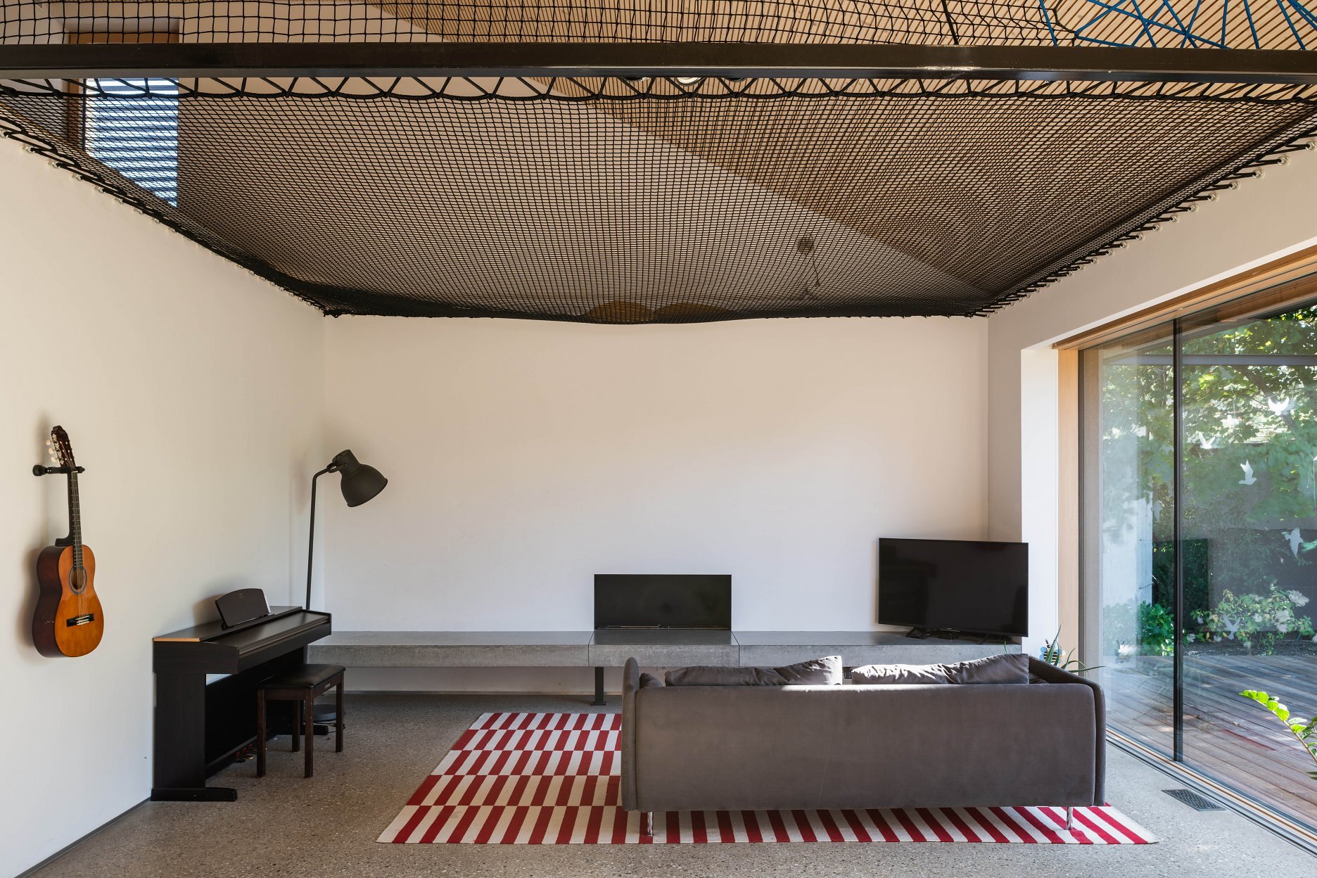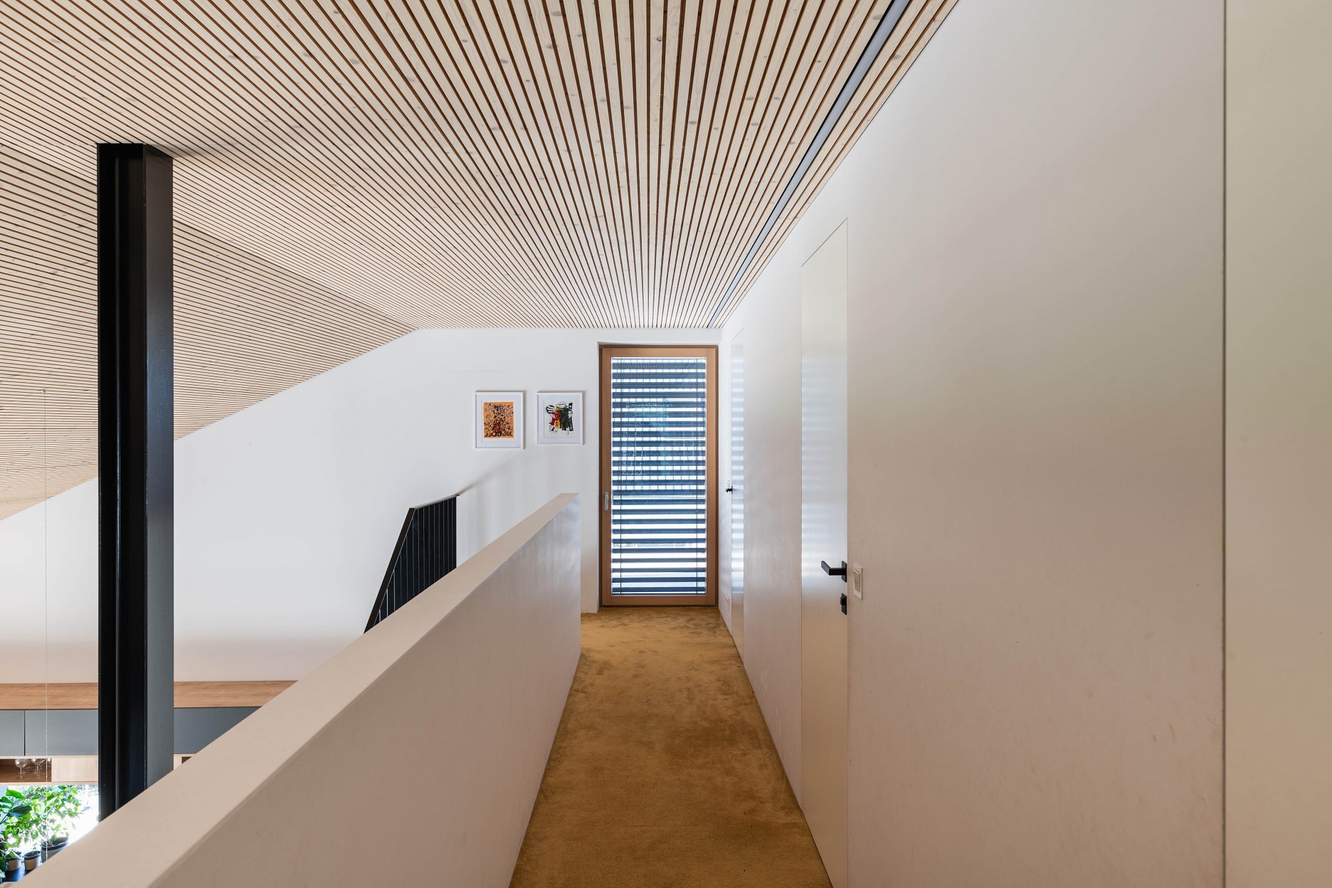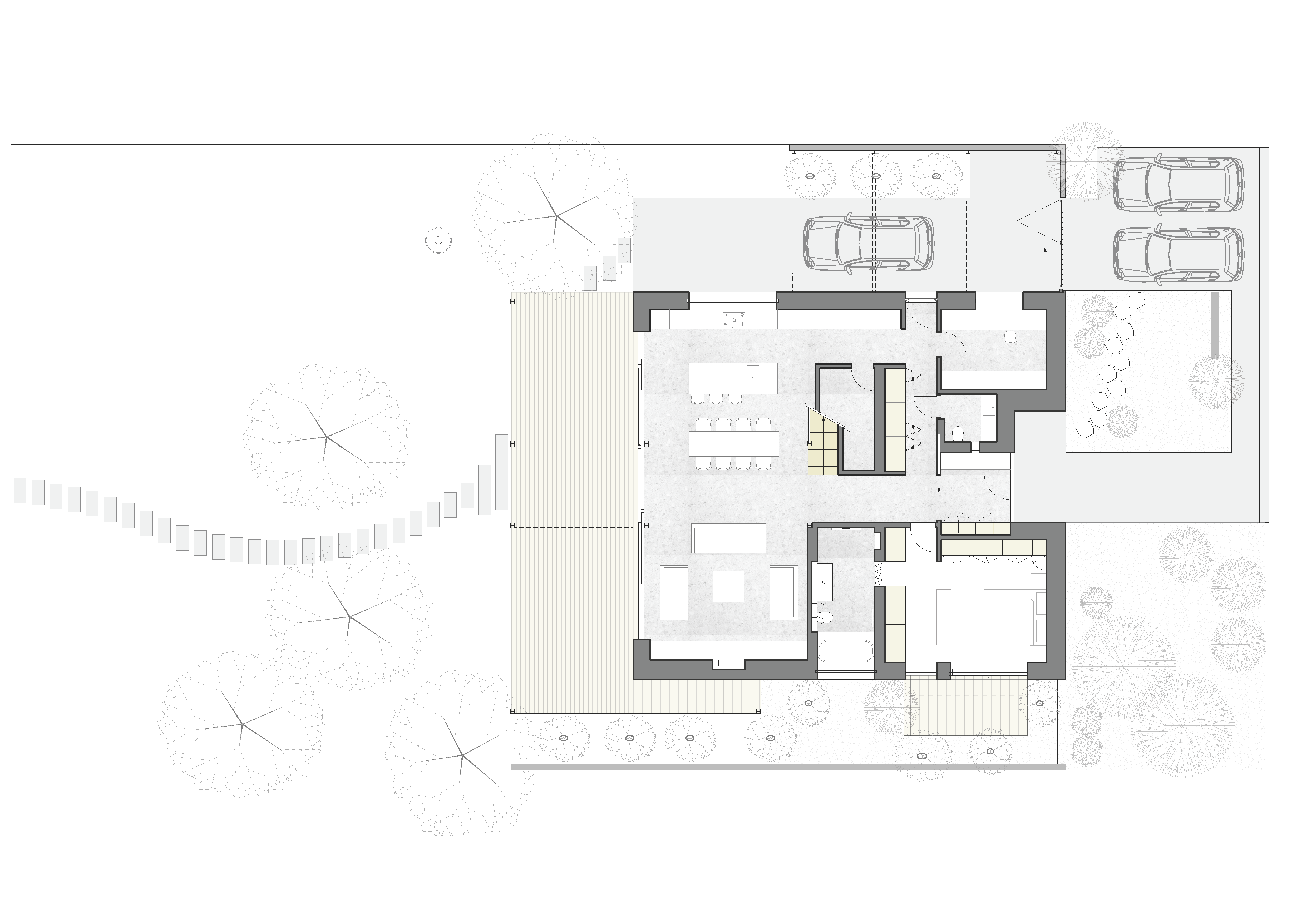 Dispozícia tohto domu podporuje rodinnú súdržnosť a zároveň vytvára súkromné útočisko pre každého z jej členov. Prevýšený obývací priestor, v spojení so záhradou, je miestom všetkých rodinných stretnutí.