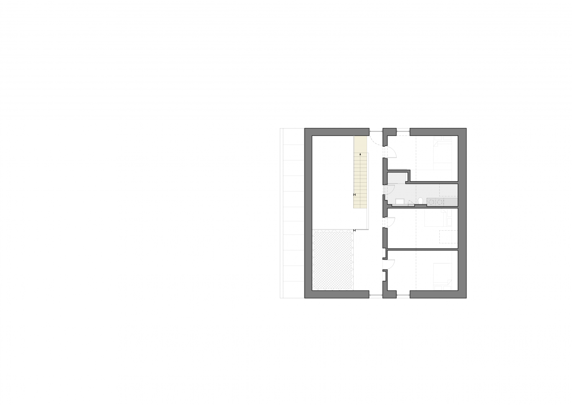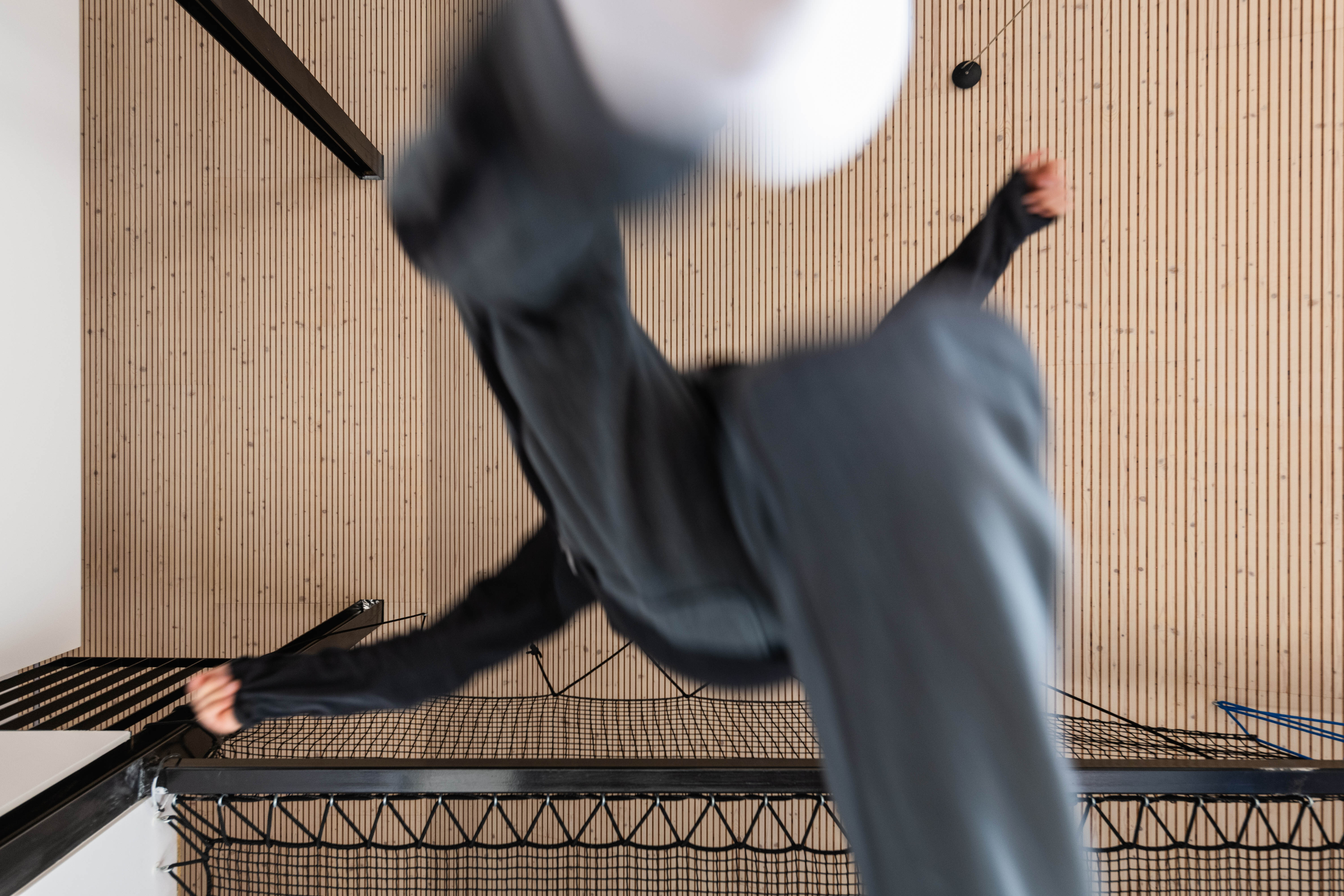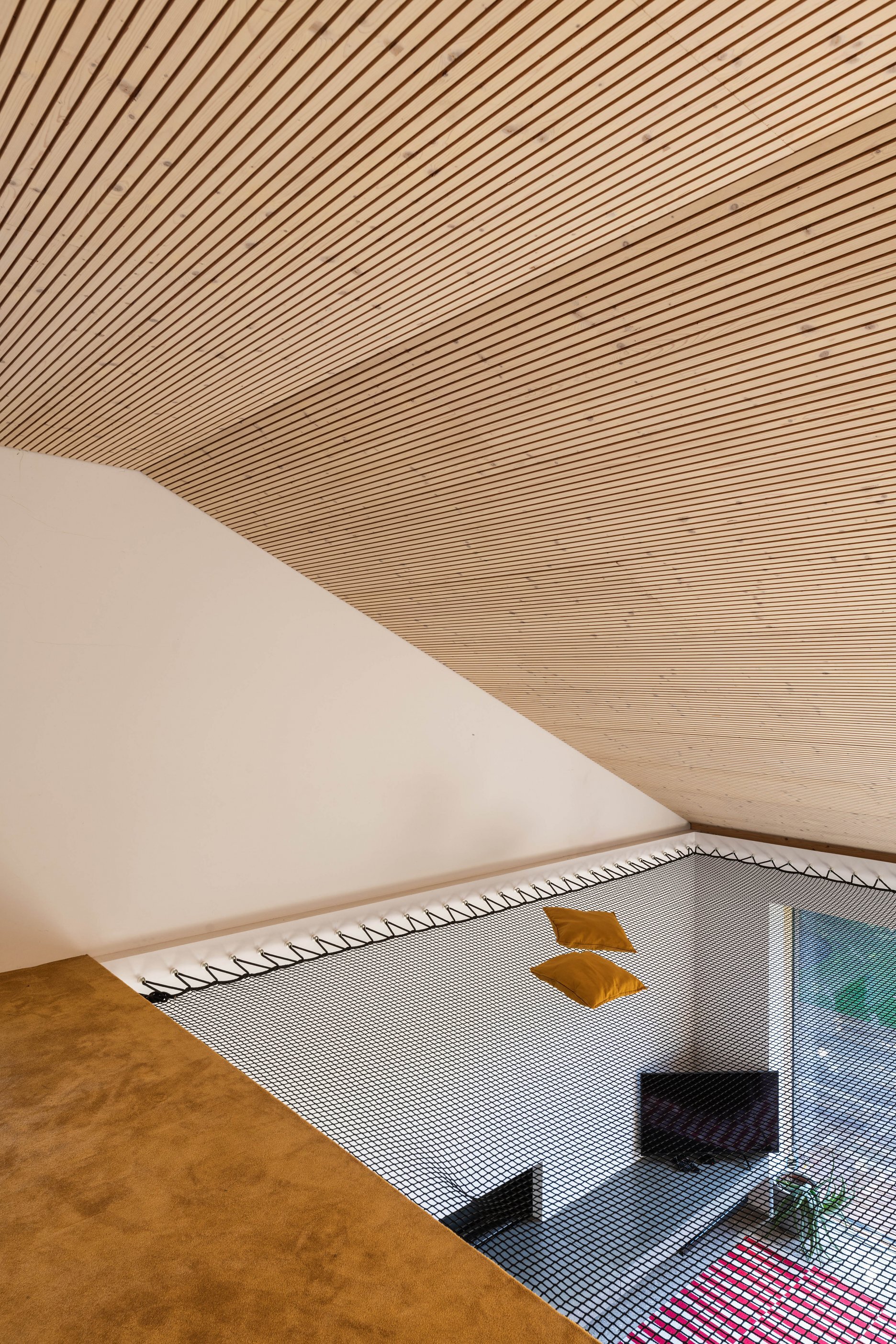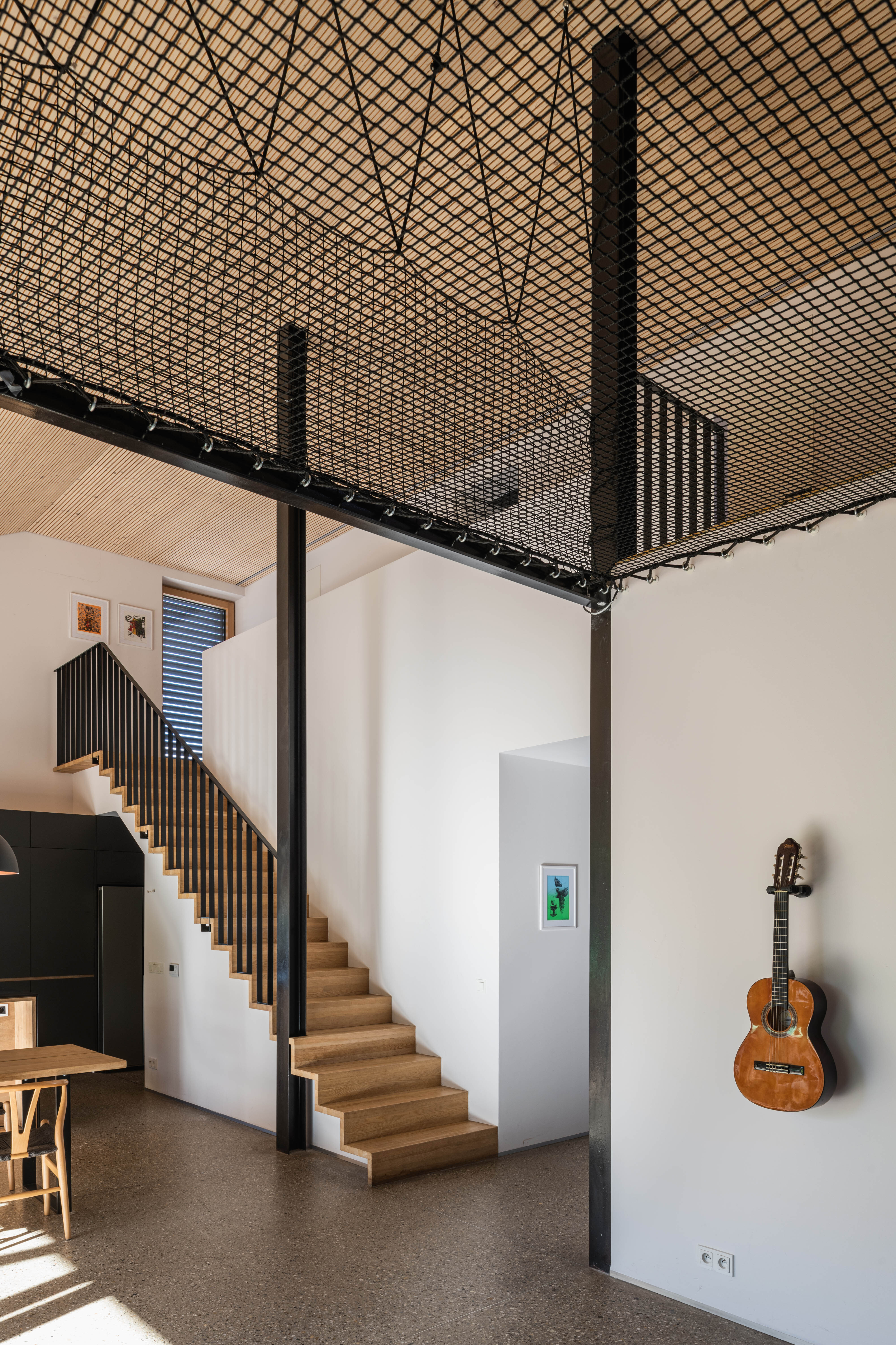 Horné poschodie je vyhradené pre deti. Tri detské izby dopĺňa spoločná kúpeľňa a herná zóna, prepojená s prízemím. Hravý prvok v podobe rozsiahlej pobytovej siete umožňuje deťom sledovať dianie v dome a hladko prepája poschodie so životom na prízemí.