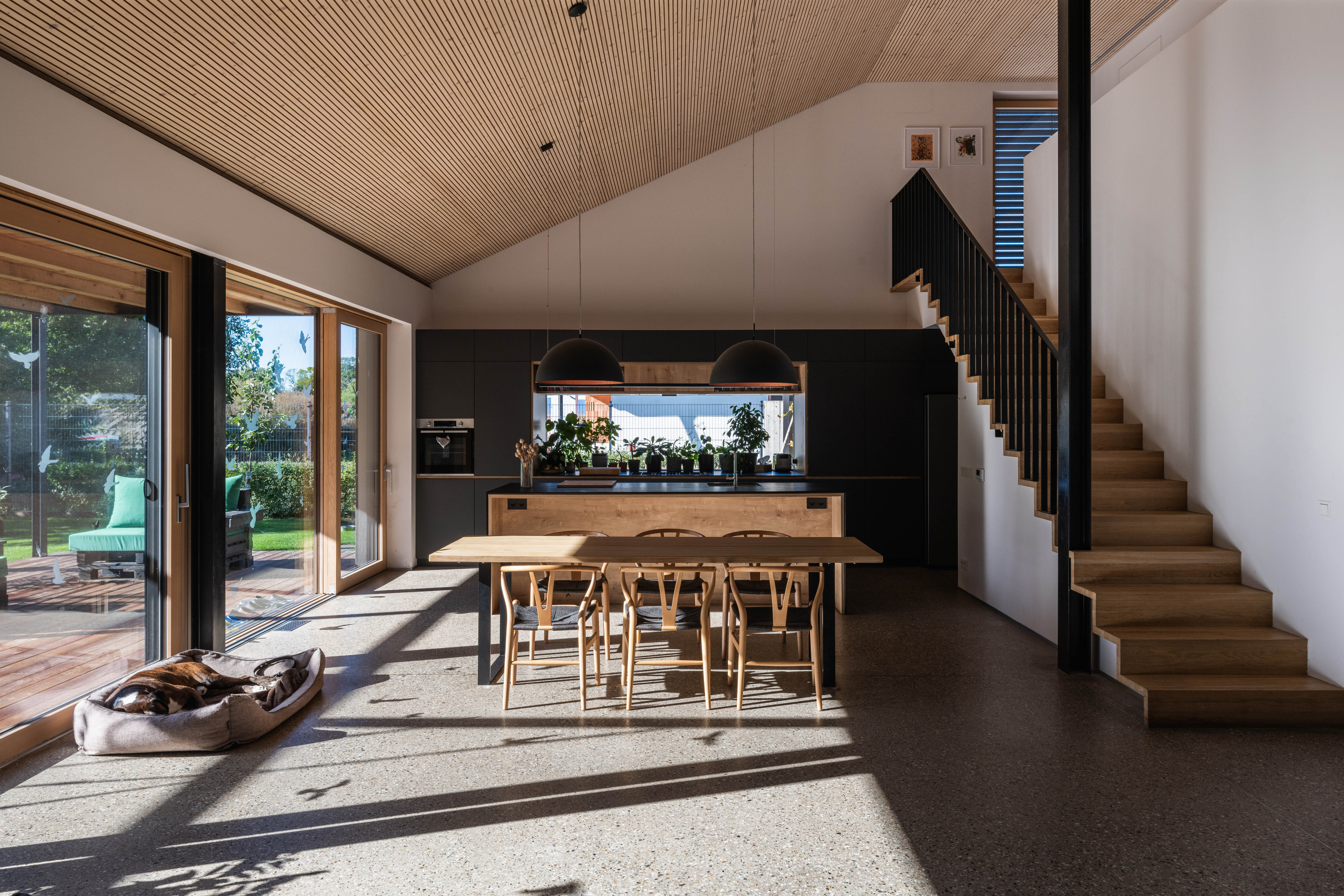 Denná časť domu funguje ako otvorené “zhromaždisko” rodiny. Kuchyňa, herňa, obývacia izba a pracovňa vytvárajú spojitý priestor pre spoločné chvíle. Drevený obklad šikmého stropu zlepšuje akustické vlastnosti prevýšenej zóny.